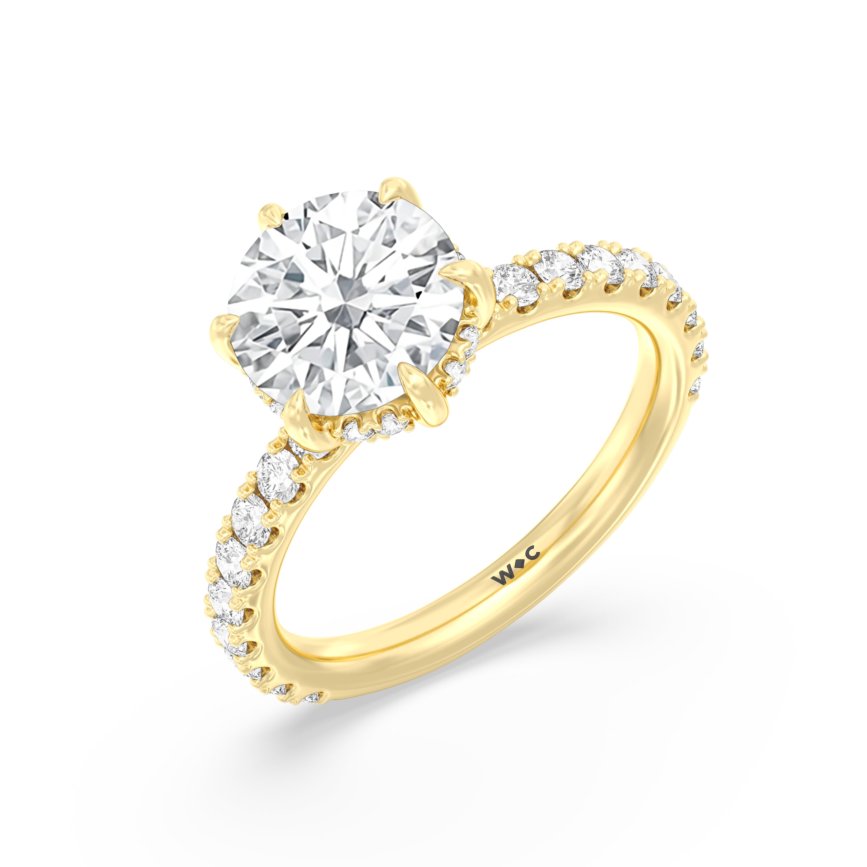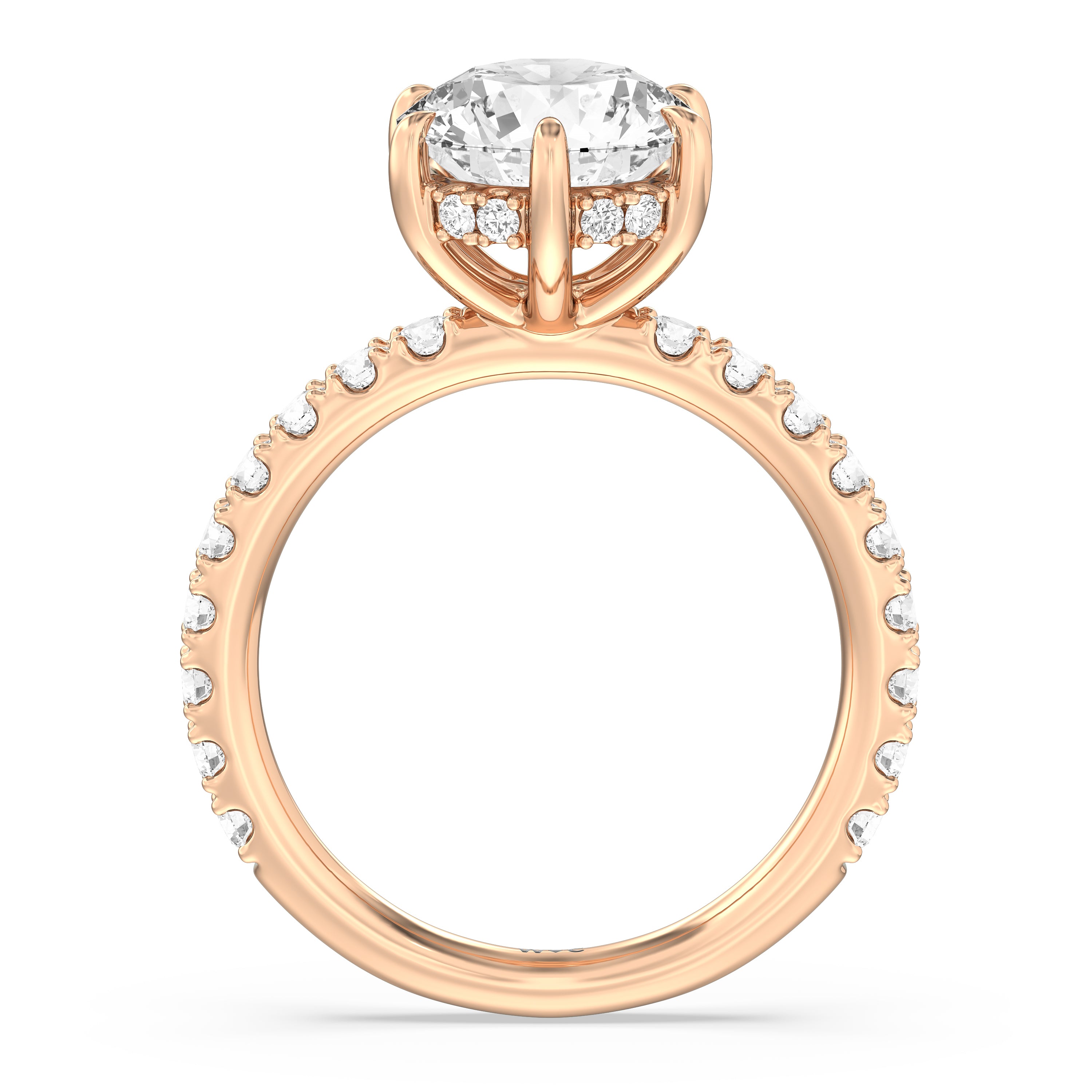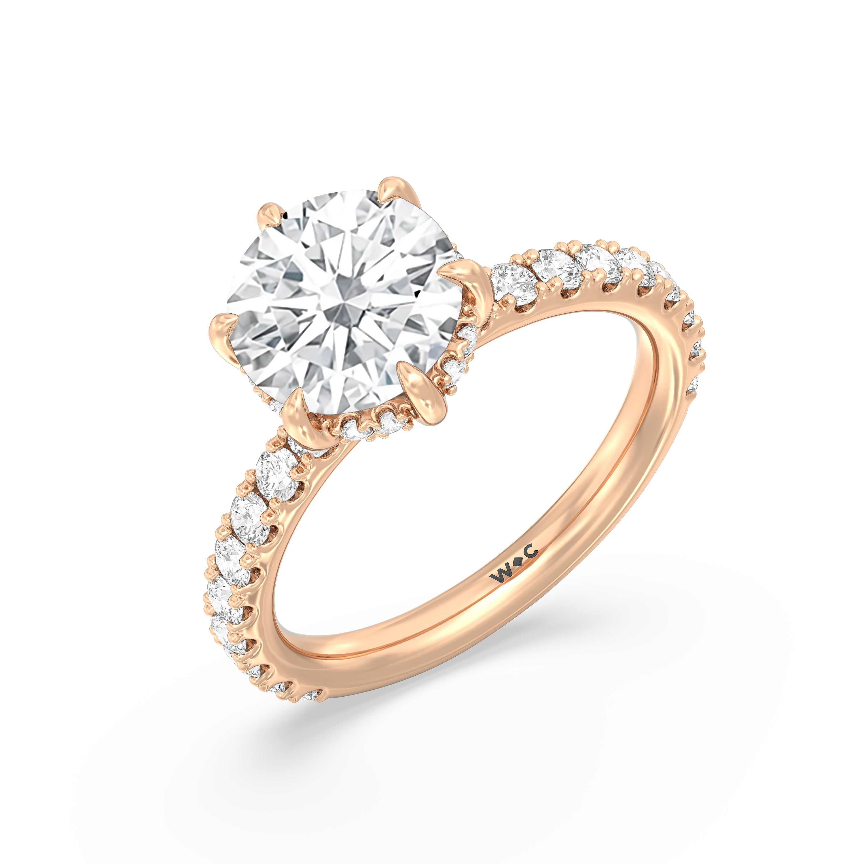 This ring is an elevated solitaire perfect for the lady who desires a bit more opulence in her ring. This piece features a glorious 3-carat round diamond center stone securely held in place by a six-prong setting. At the base of the central gem is a halo of petite round diamonds, shining brightly and harmoniously with the pavé diamond band.