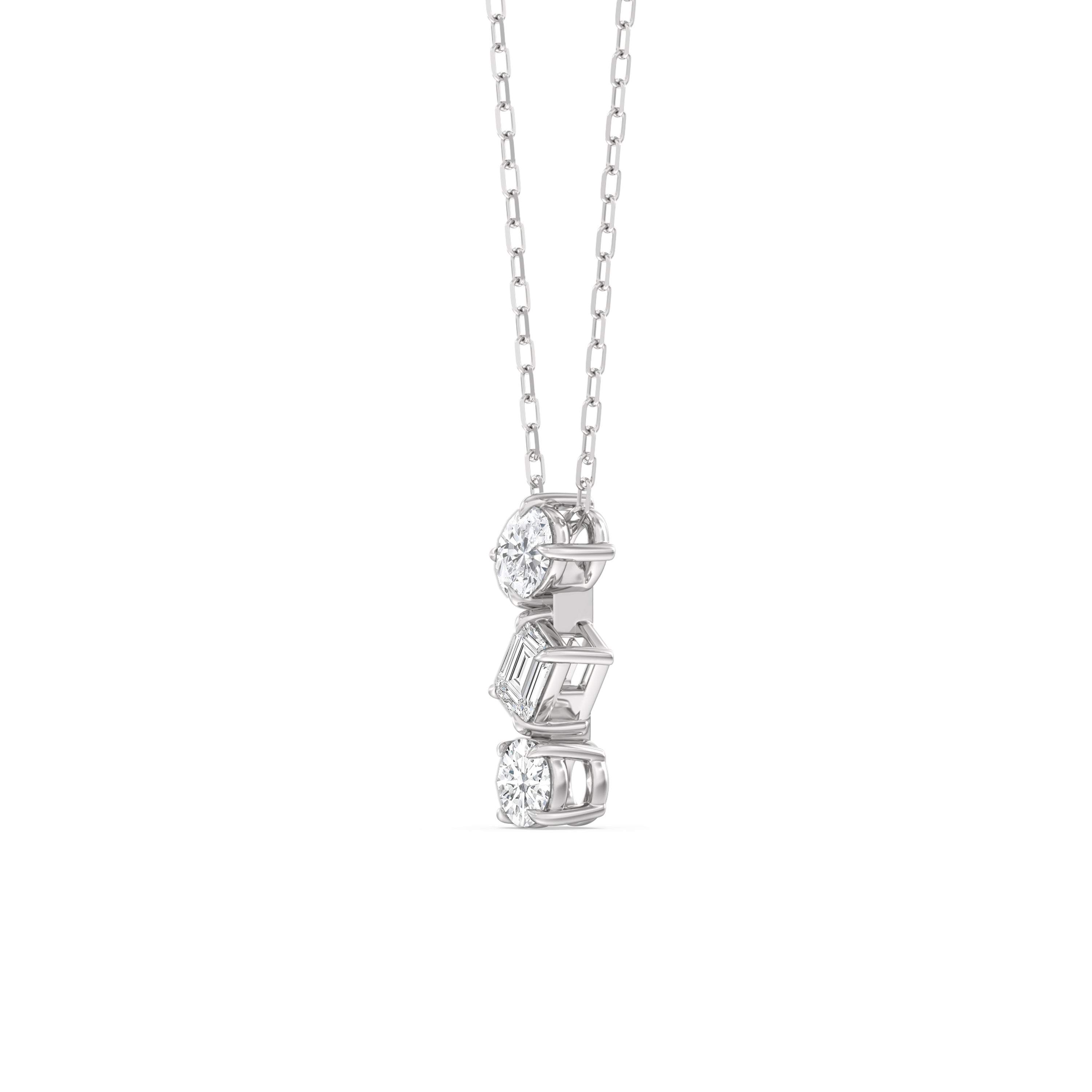 This diamond trilogy necklace embraces modern elegance with its minimalist aesthetic. It features a vertical row of oval, pear, and round diamonds, each weighing 0.25 carats. Designed with no distracting embellishments, this necklace's pure beauty shines.