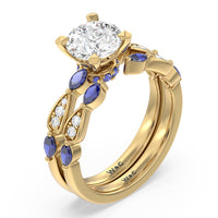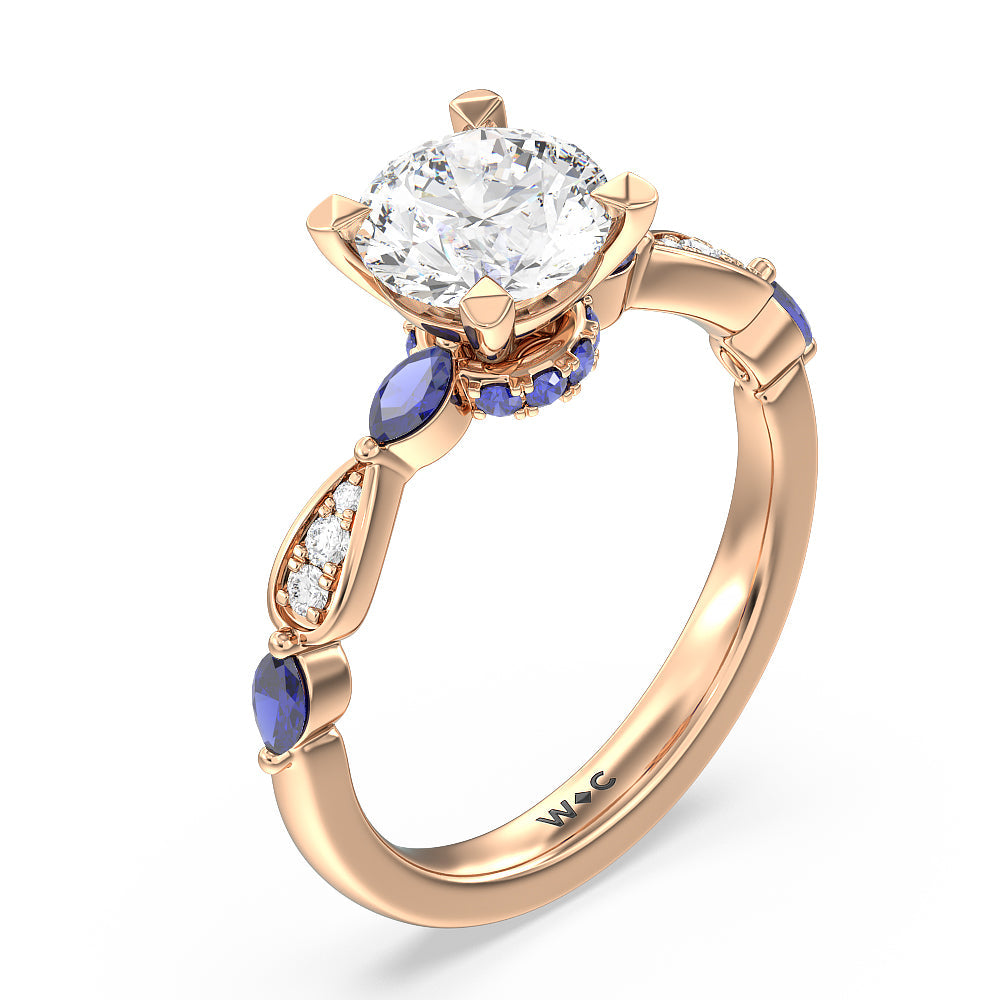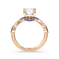 This engagement ring is inspired by the Gerbera flower petals with its striking marquise created blue sapphire. The created blue sapphire under-halo adds that little extra to make this your must-have engagement ring.