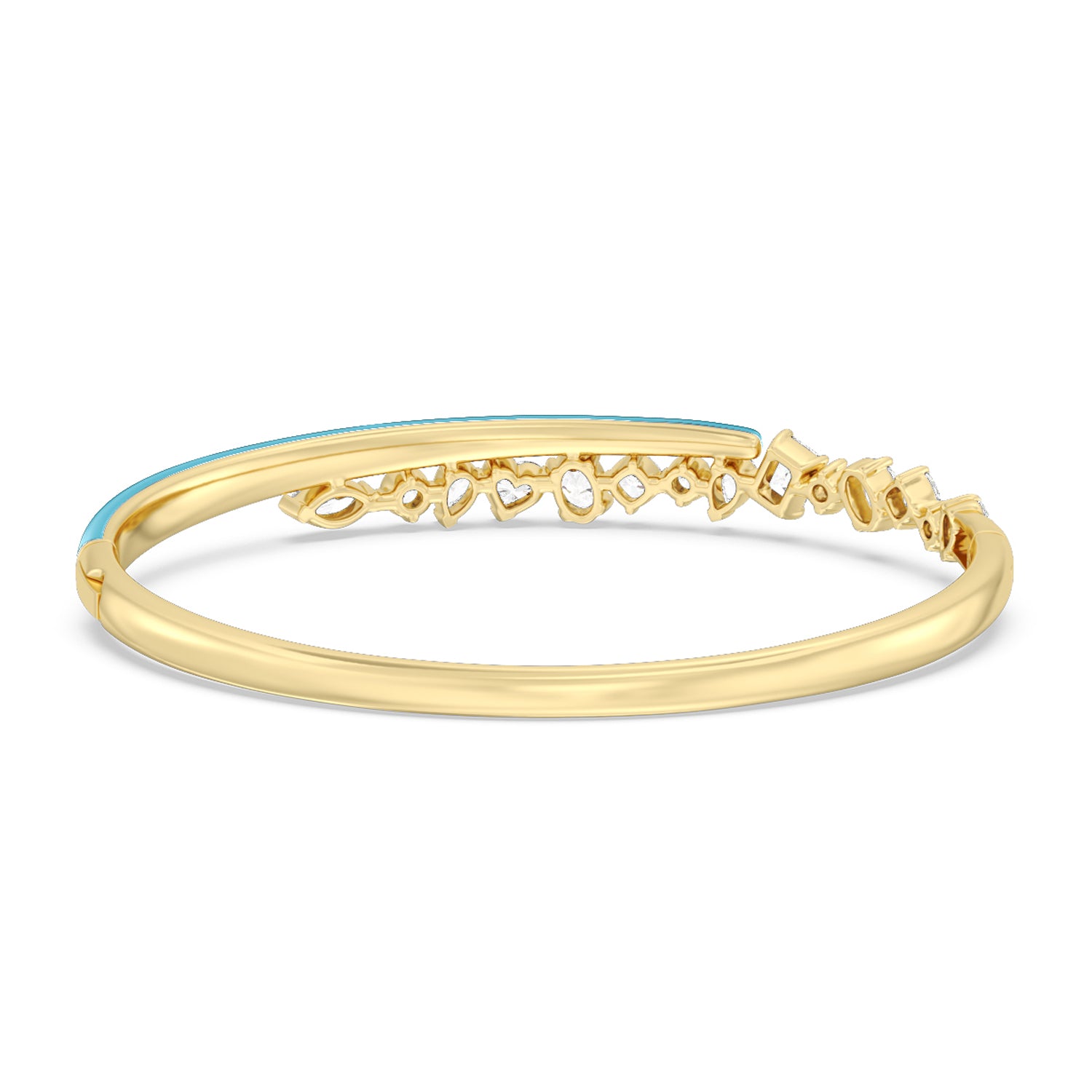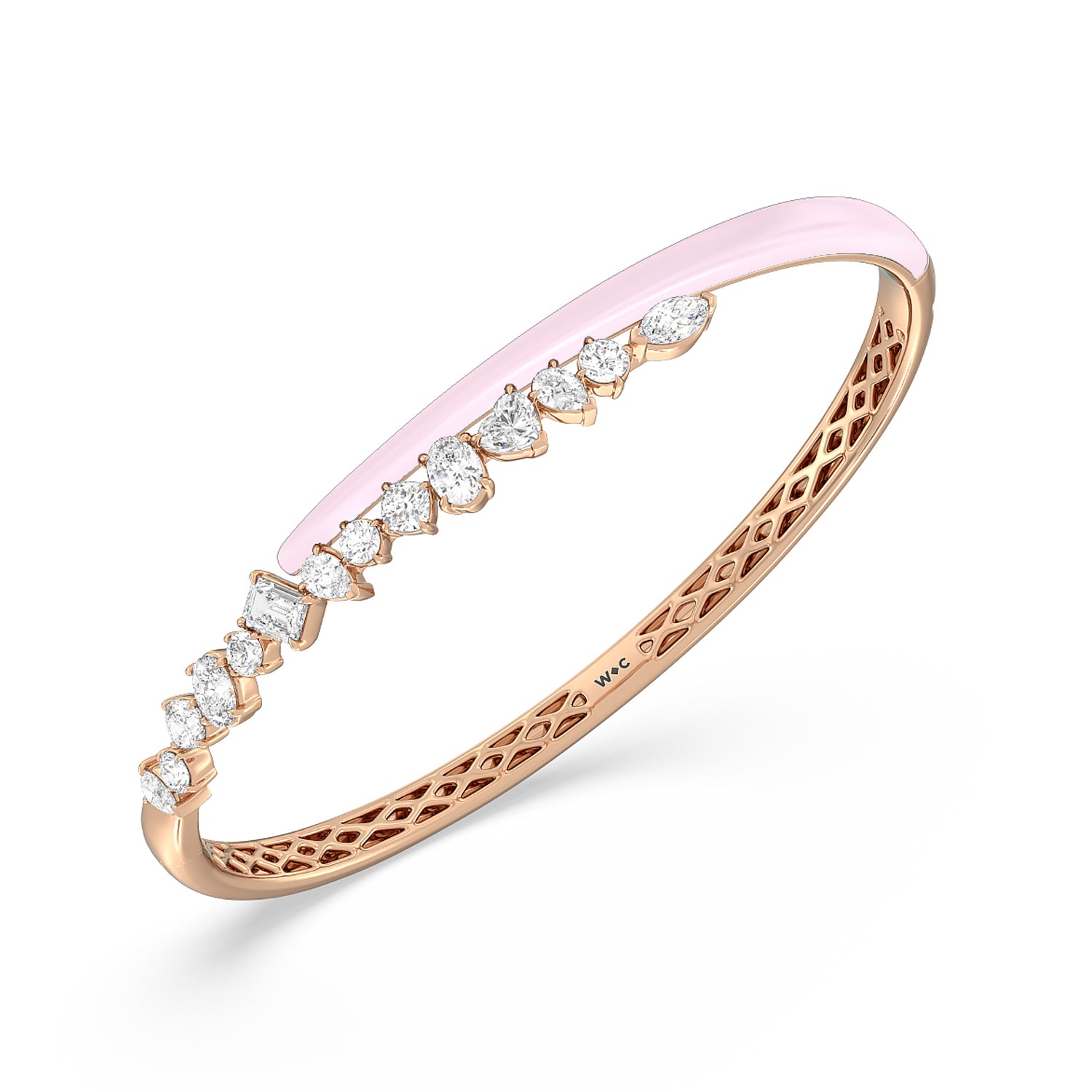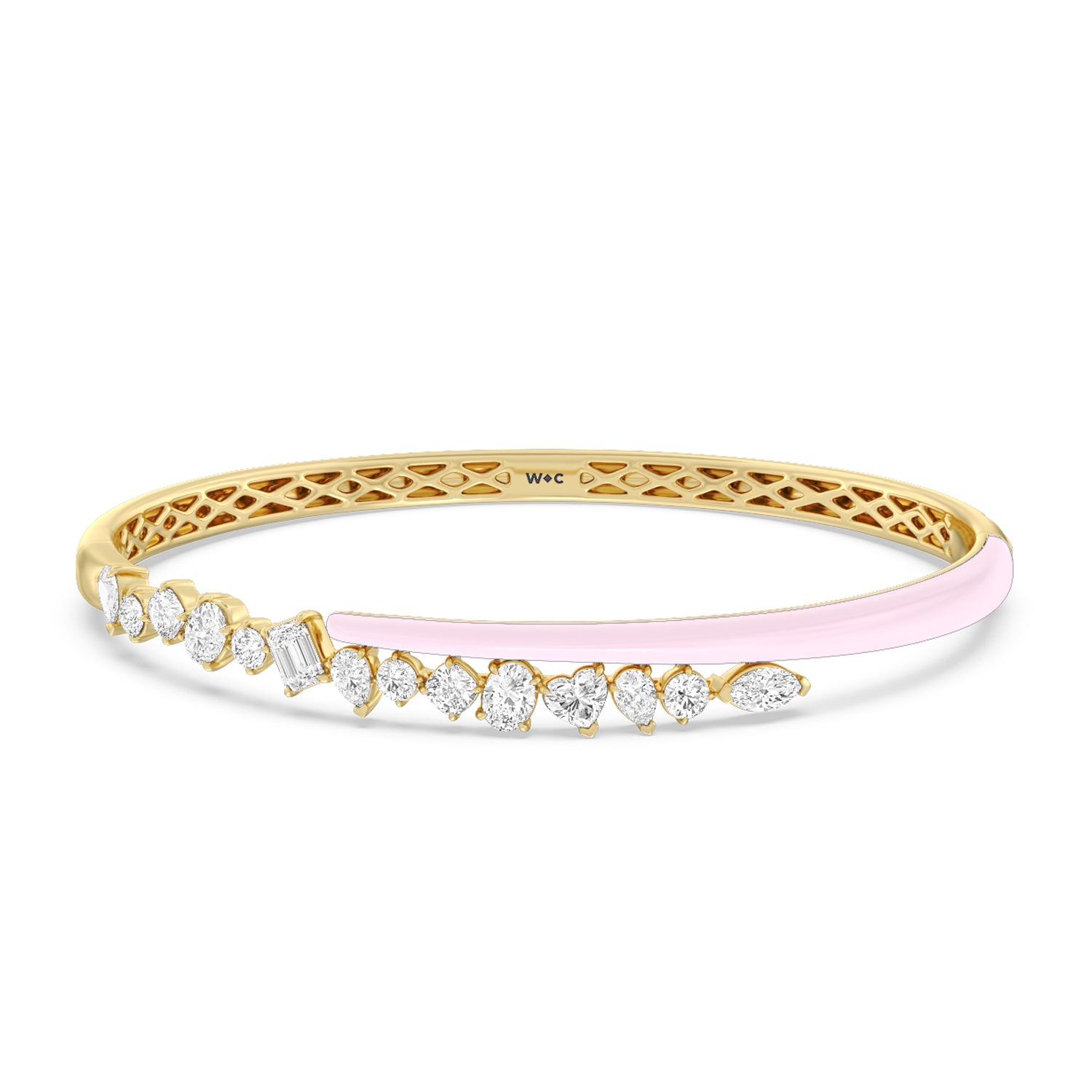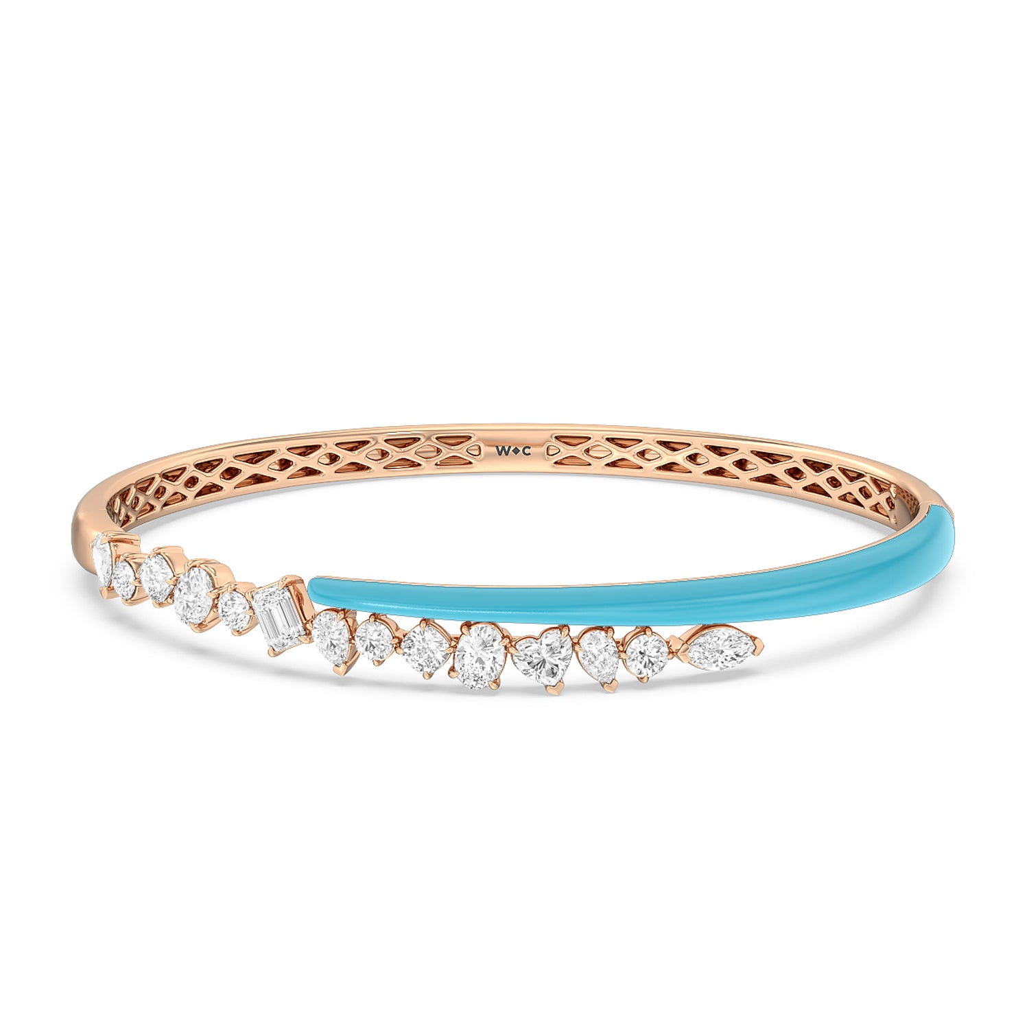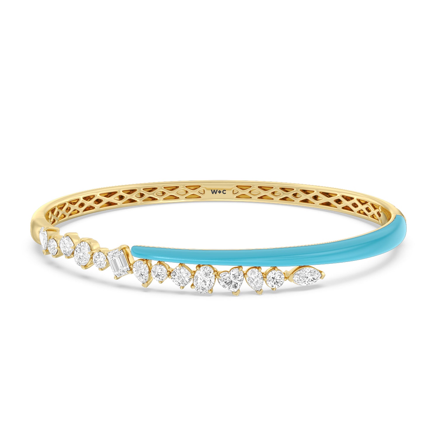 The perfect addition to your daily ensemble. This wrist accessory features a sparkly side and a colorful side, impressively fusing whimsy and luxury. The bangle's striking ceramic portion is complemented by a pattern of round, marquise, cushion, pear, heart, oval, and emerald-cut diamonds that are elegantly lined on shared prongs. This ceramic bangle features a hinged closure.