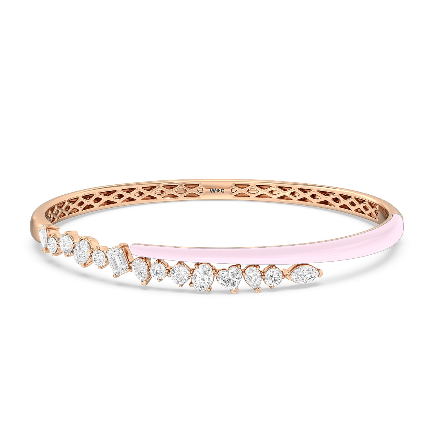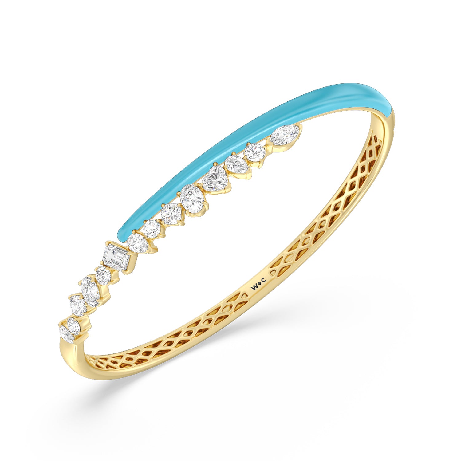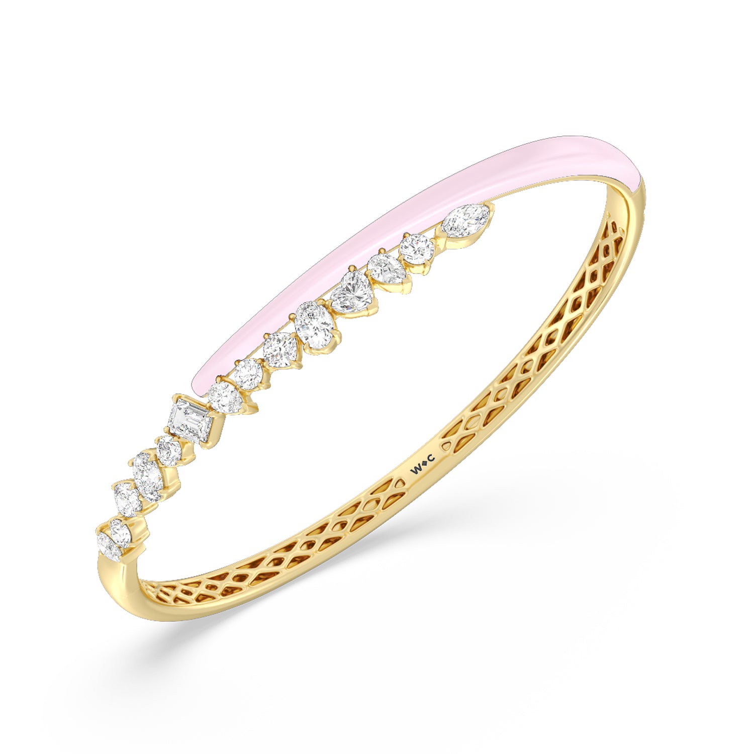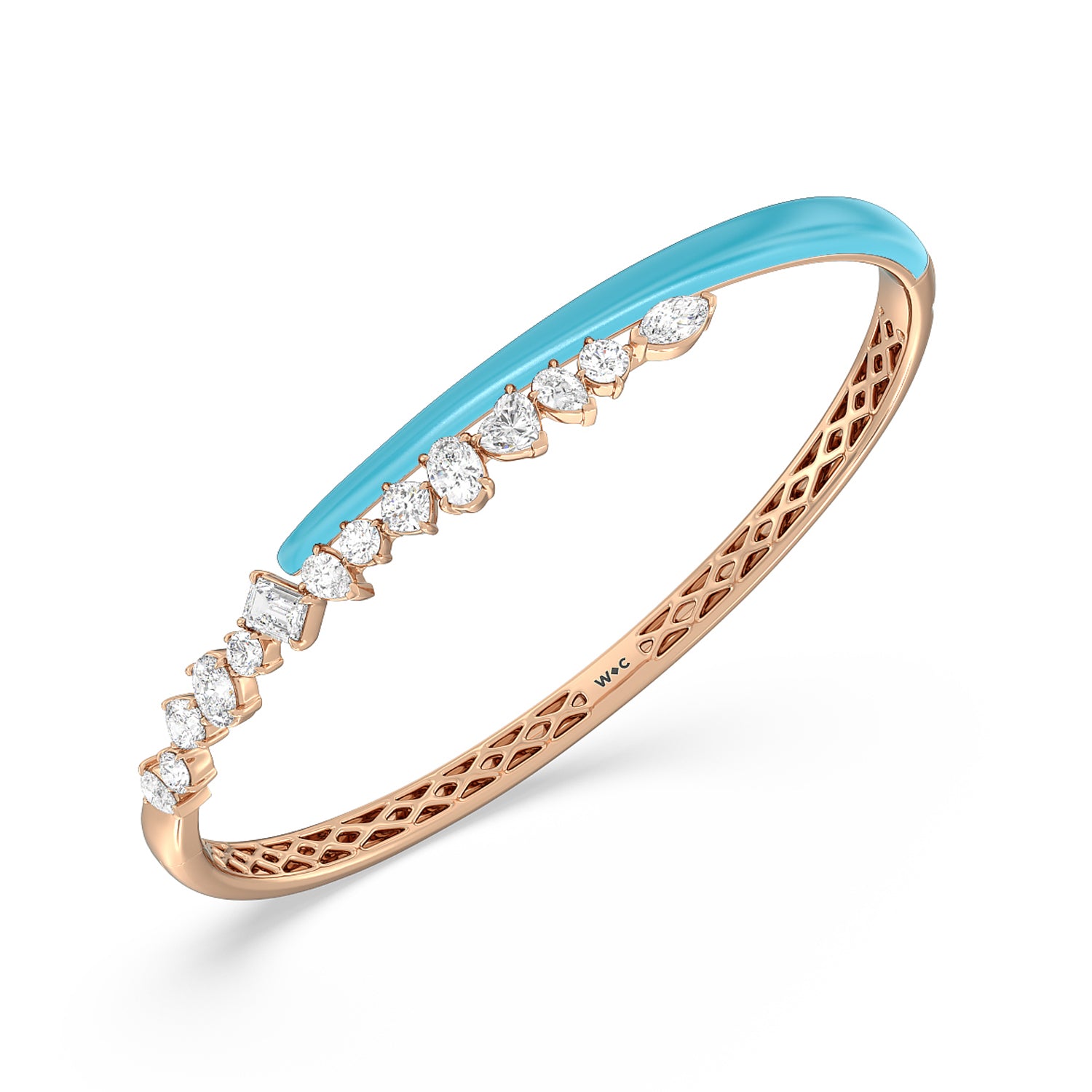 The perfect addition to your daily ensemble. This wrist accessory features a sparkly side and a colorful side, impressively fusing whimsy and luxury. The bangle's striking ceramic portion is complemented by a pattern of round, marquise, cushion, pear, heart, oval, and emerald-cut diamonds that are elegantly lined on shared prongs. This ceramic bangle features a hinged closure.
