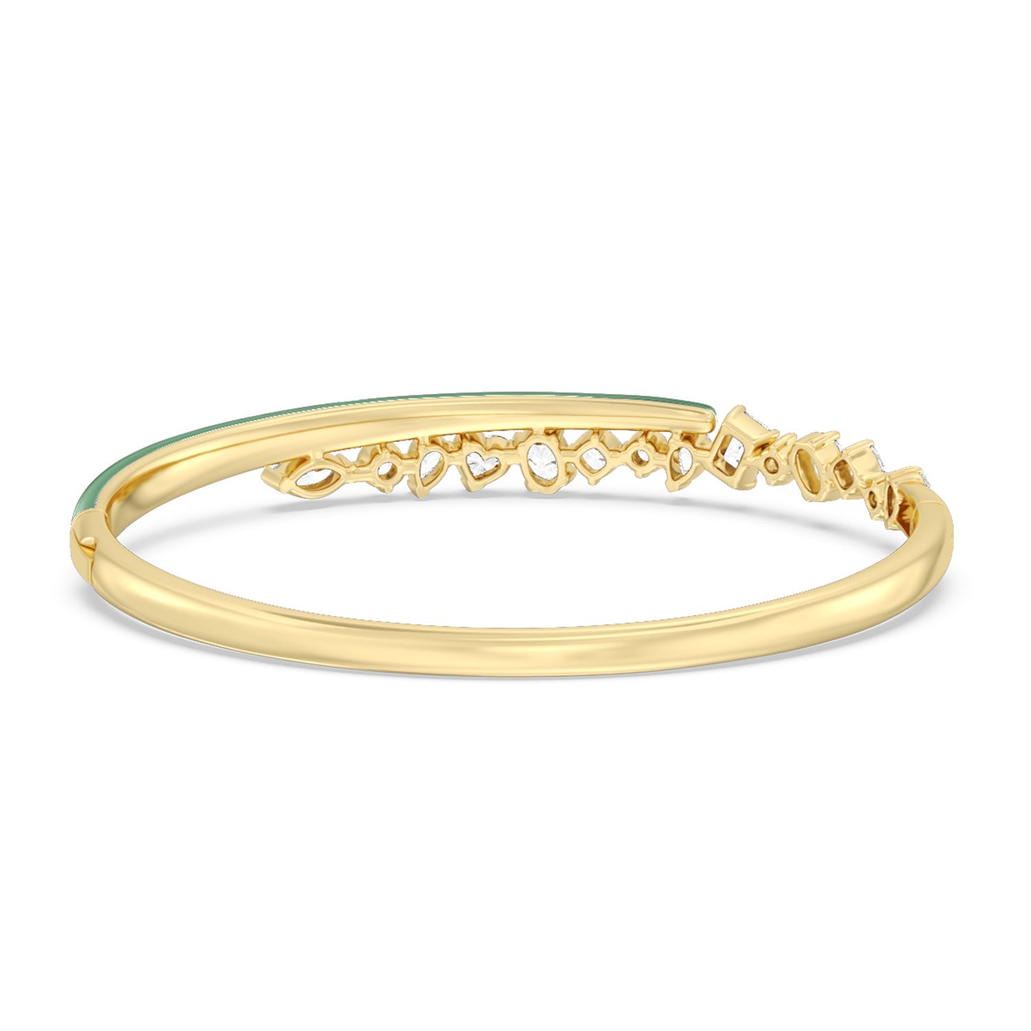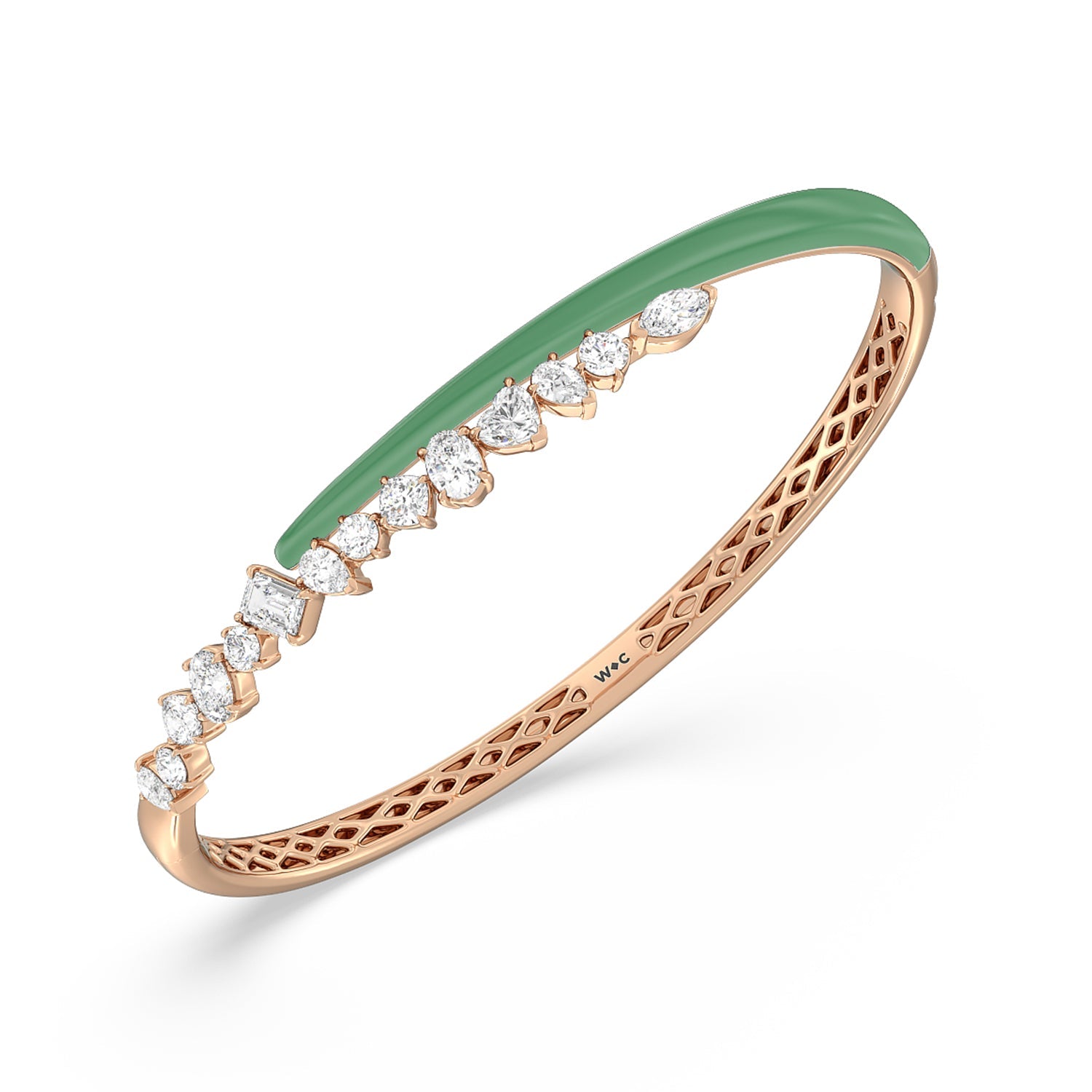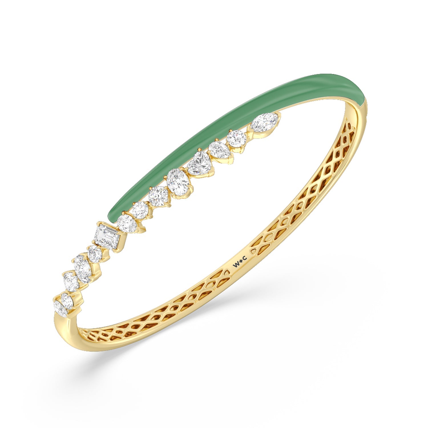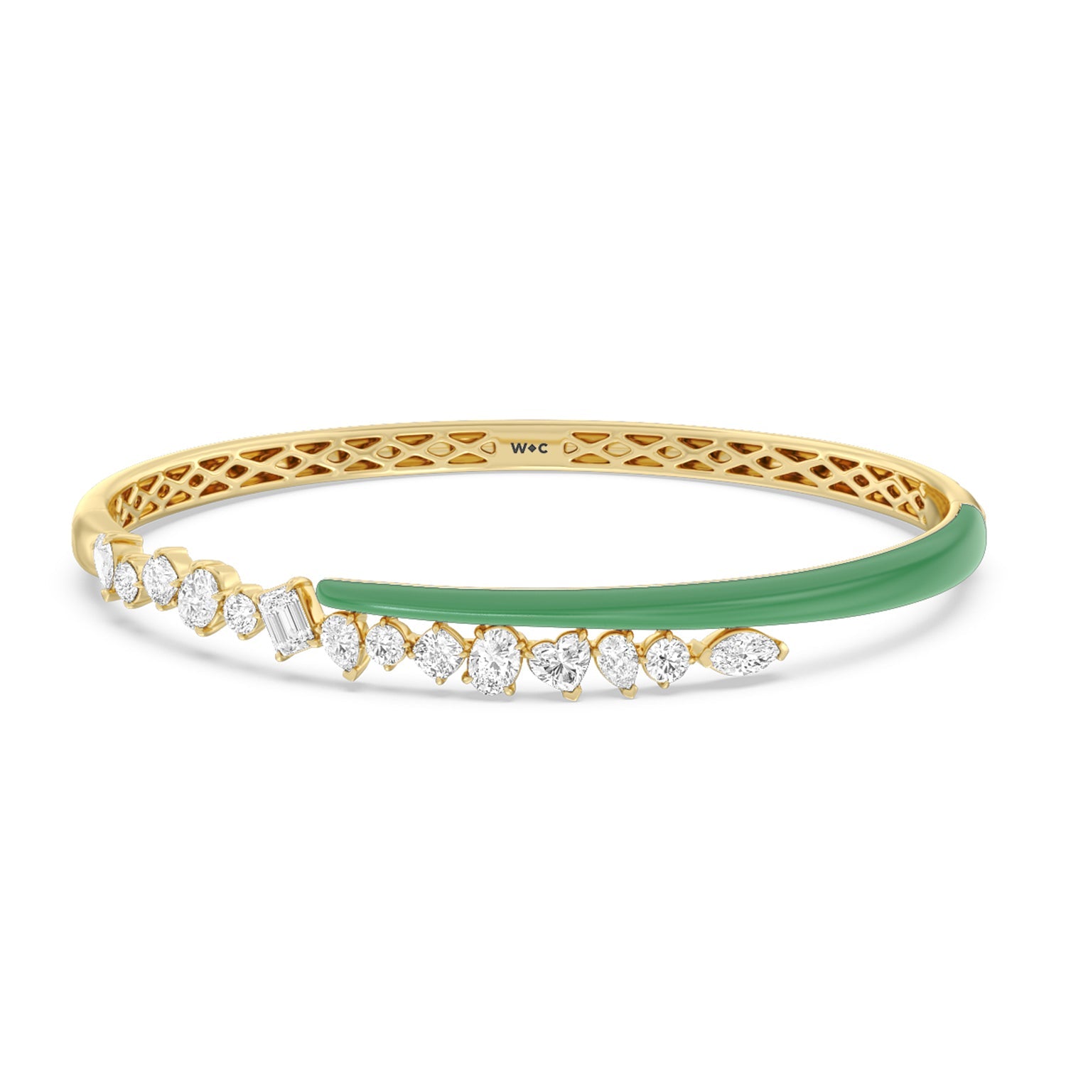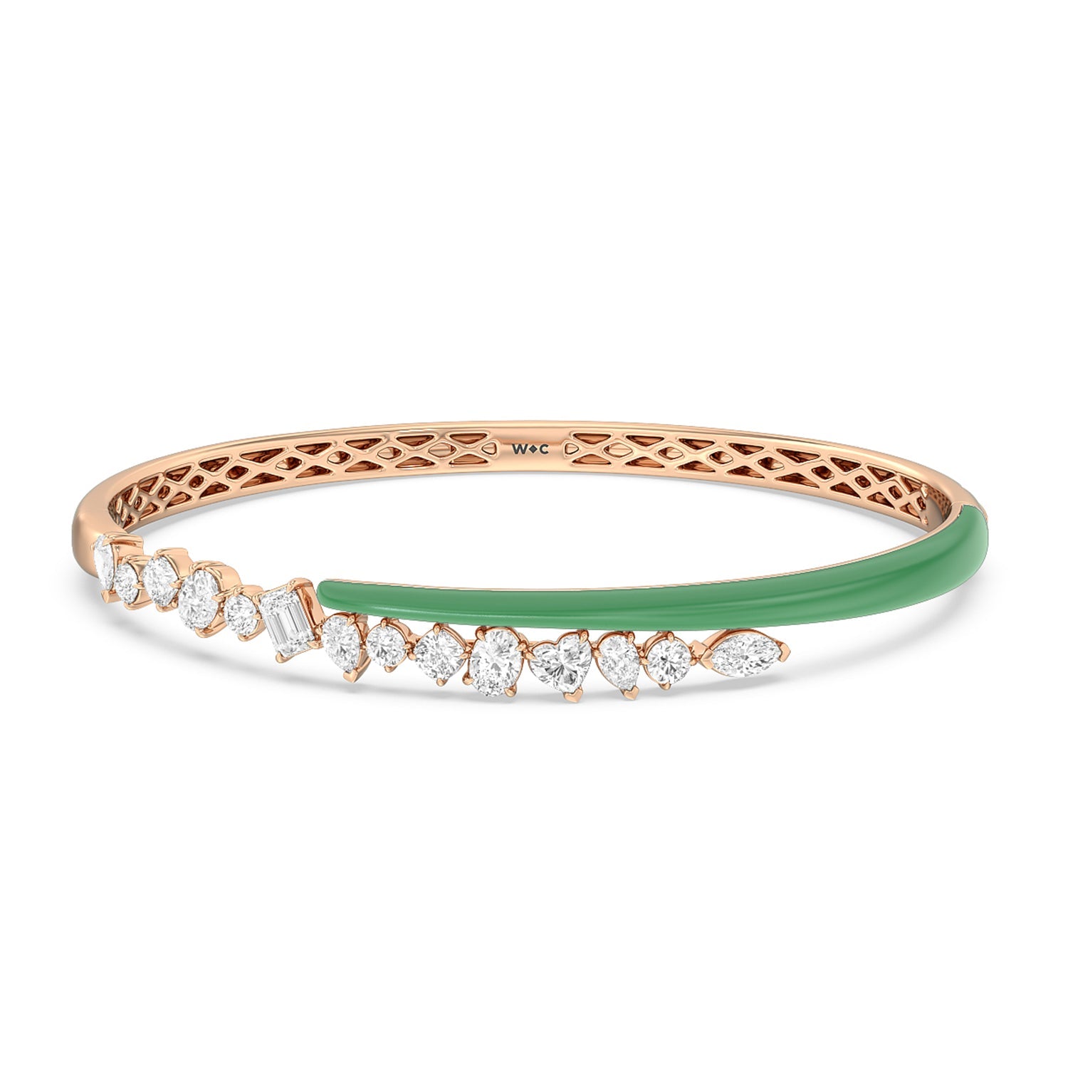 The perfect addition to your daily ensemble. This wrist accessory features a sparkly side and a colorful side, impressively fusing whimsy and luxury. The bangle's striking ceramic portion is complemented by a pattern of round, marquise, cushion, pear, heart, oval, and emerald-cut diamonds that are elegantly lined on shared prongs. This ceramic bangle features a hinged closure.