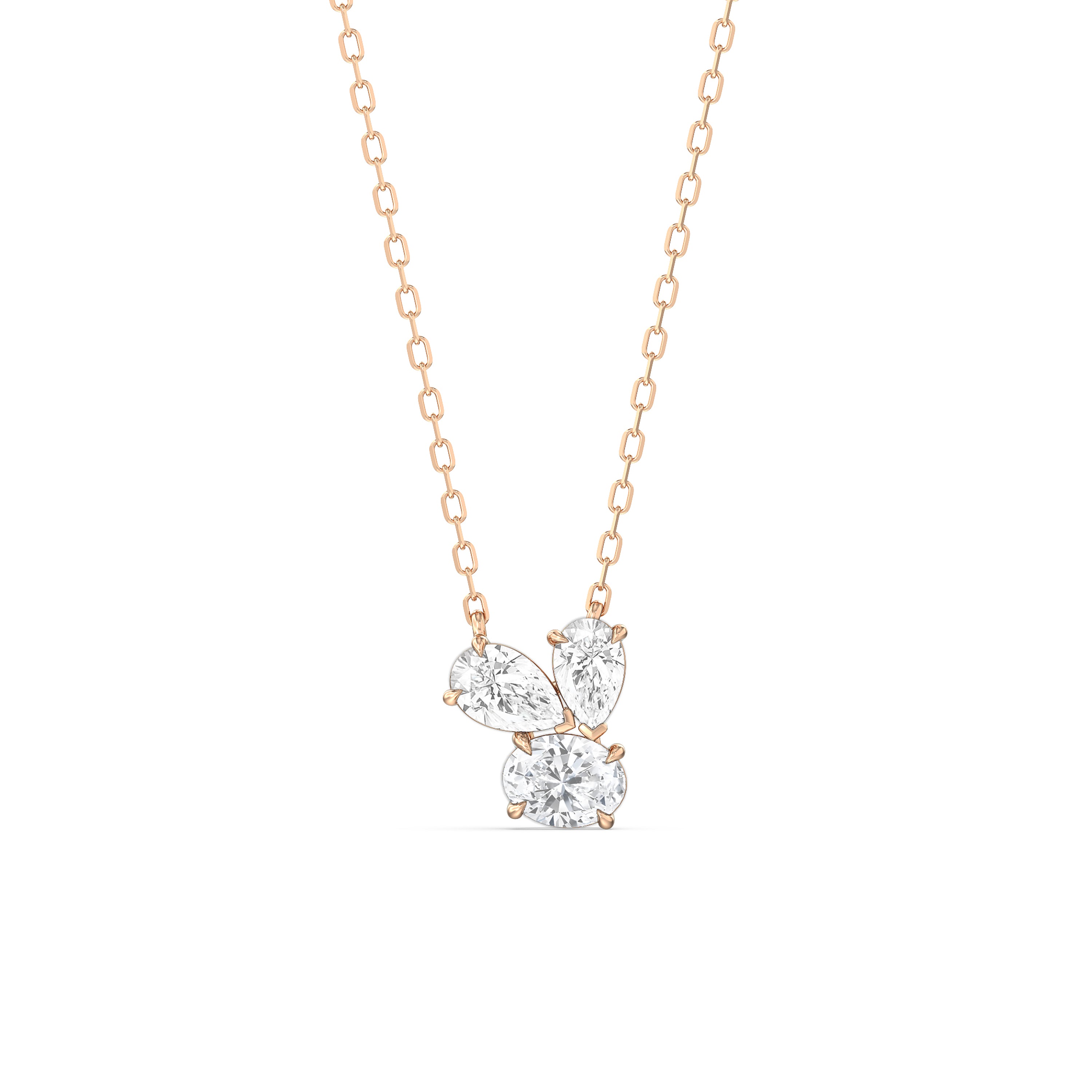 This diamond necklace is a gorgeous option for day or night wear. It carries two pear-cut diamonds of different sizes and a 0.4 ct oval diamond. All three diamonds are positioned in a slanted manner, clustered to form a single pendant that radiates a beautiful and brilliant shine.