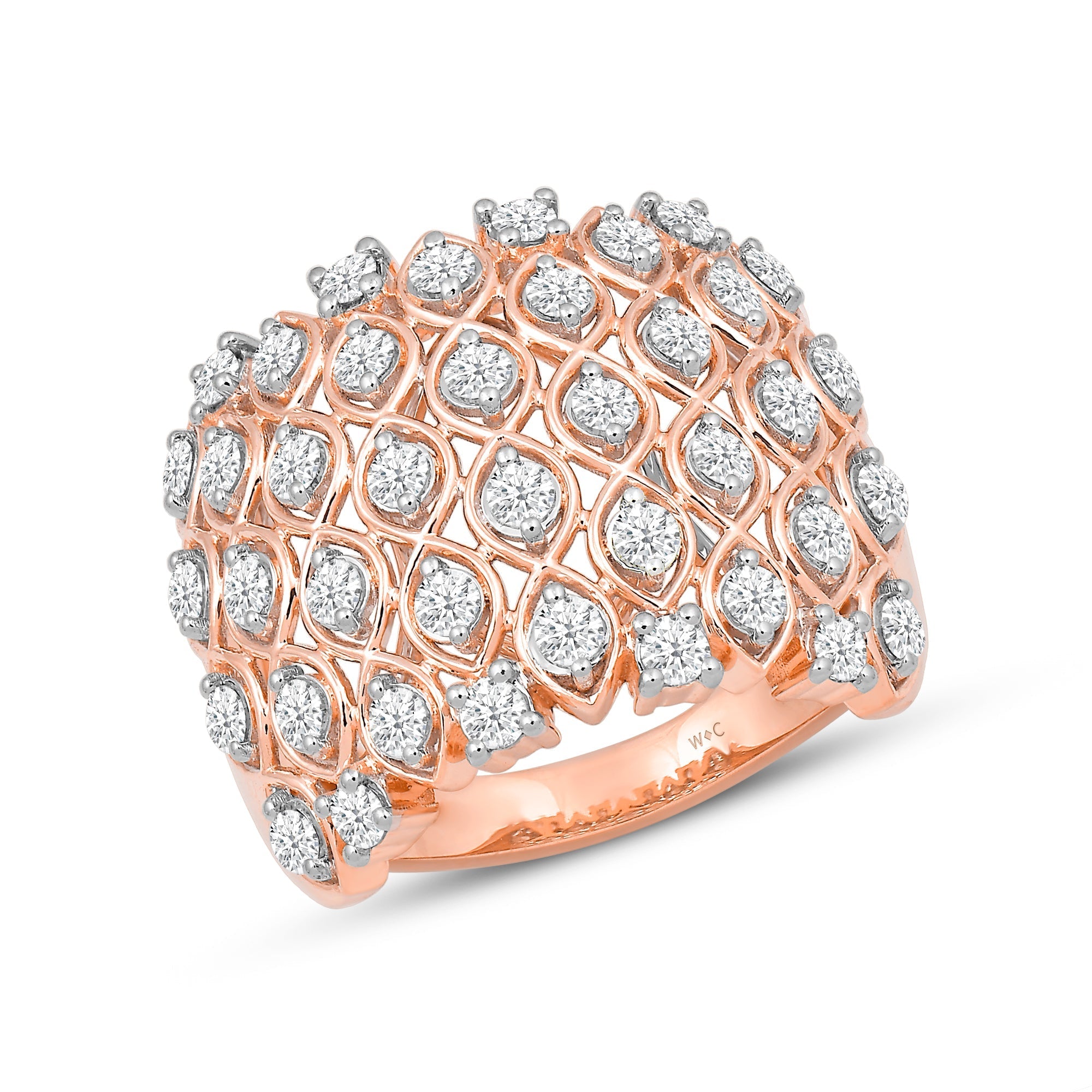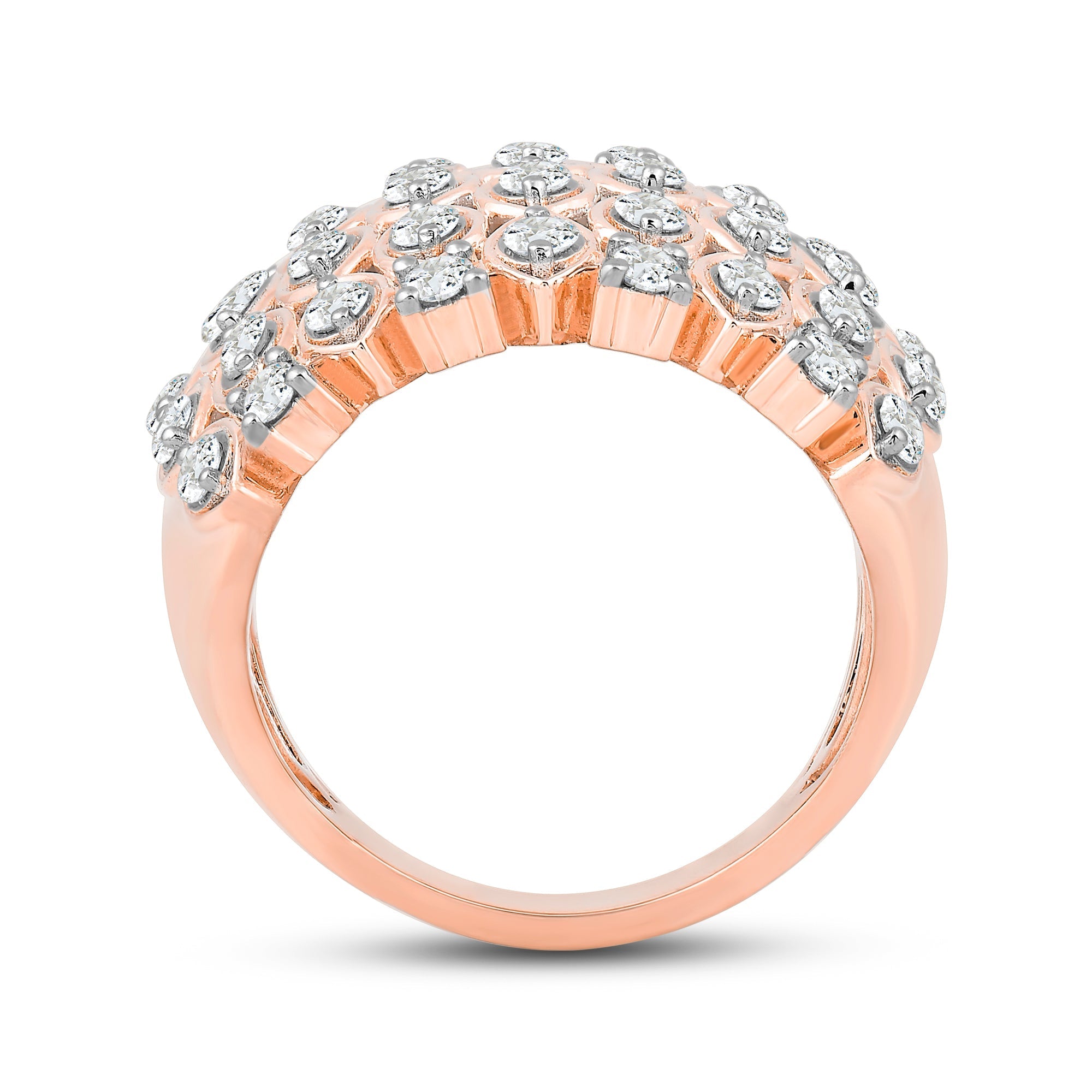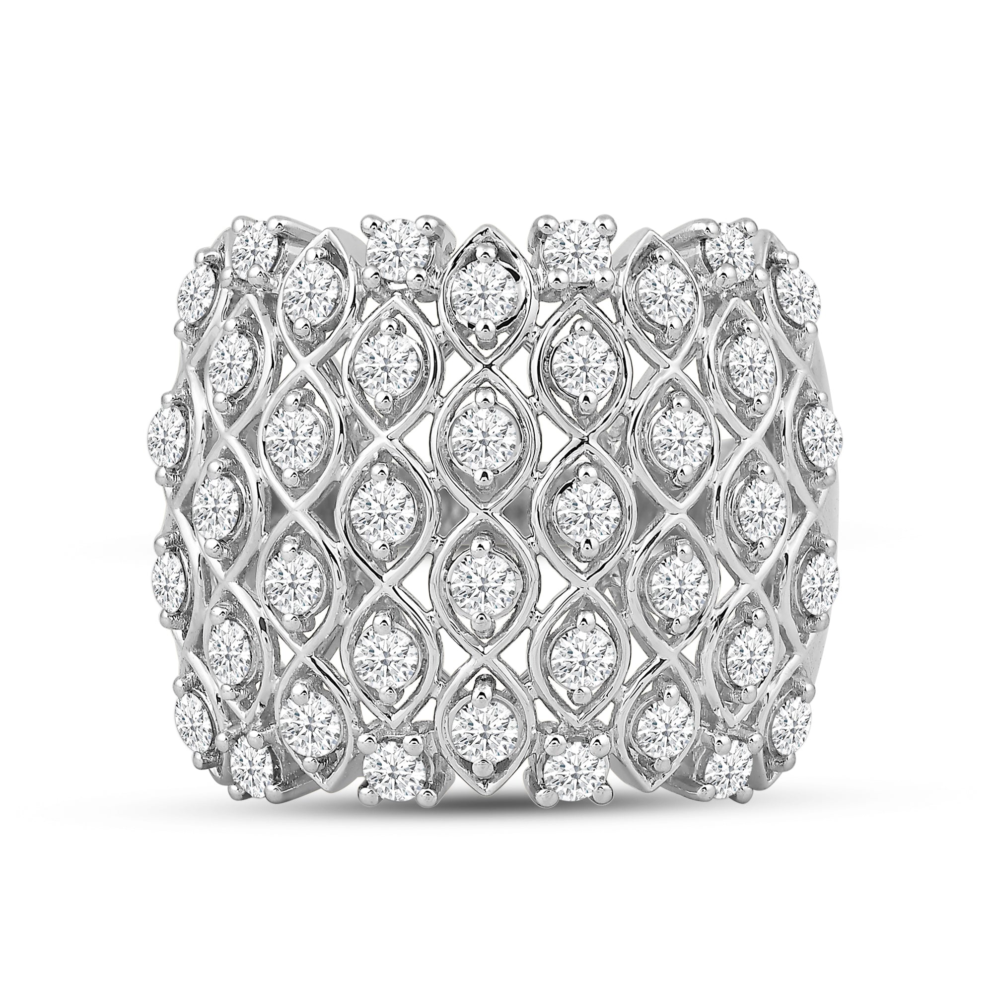 It's hard to miss this piece which stands out for its broad profile and non-stop shimmer. This statement ring with a broad top features a cluster of round diamonds that deliver enough sparkle to make an impact. A ring as sparkly as this can instantly add drama and allure to a monochromatic outfit.