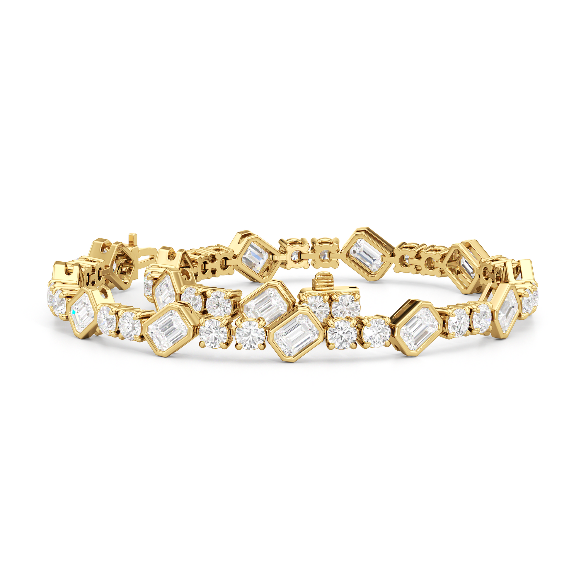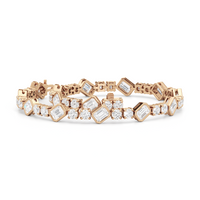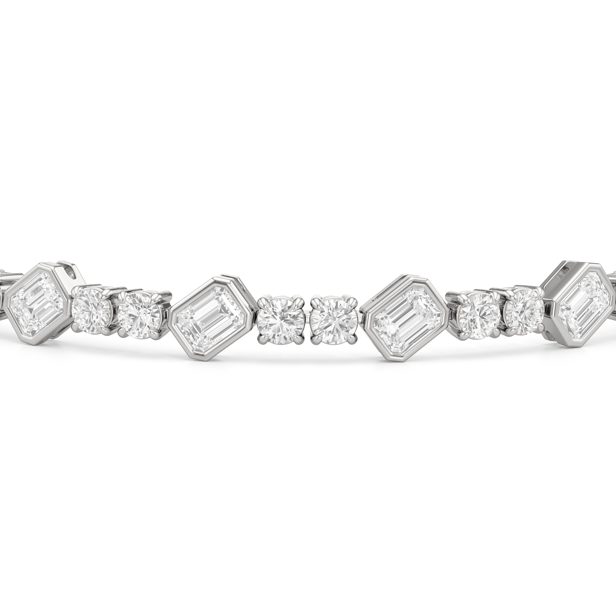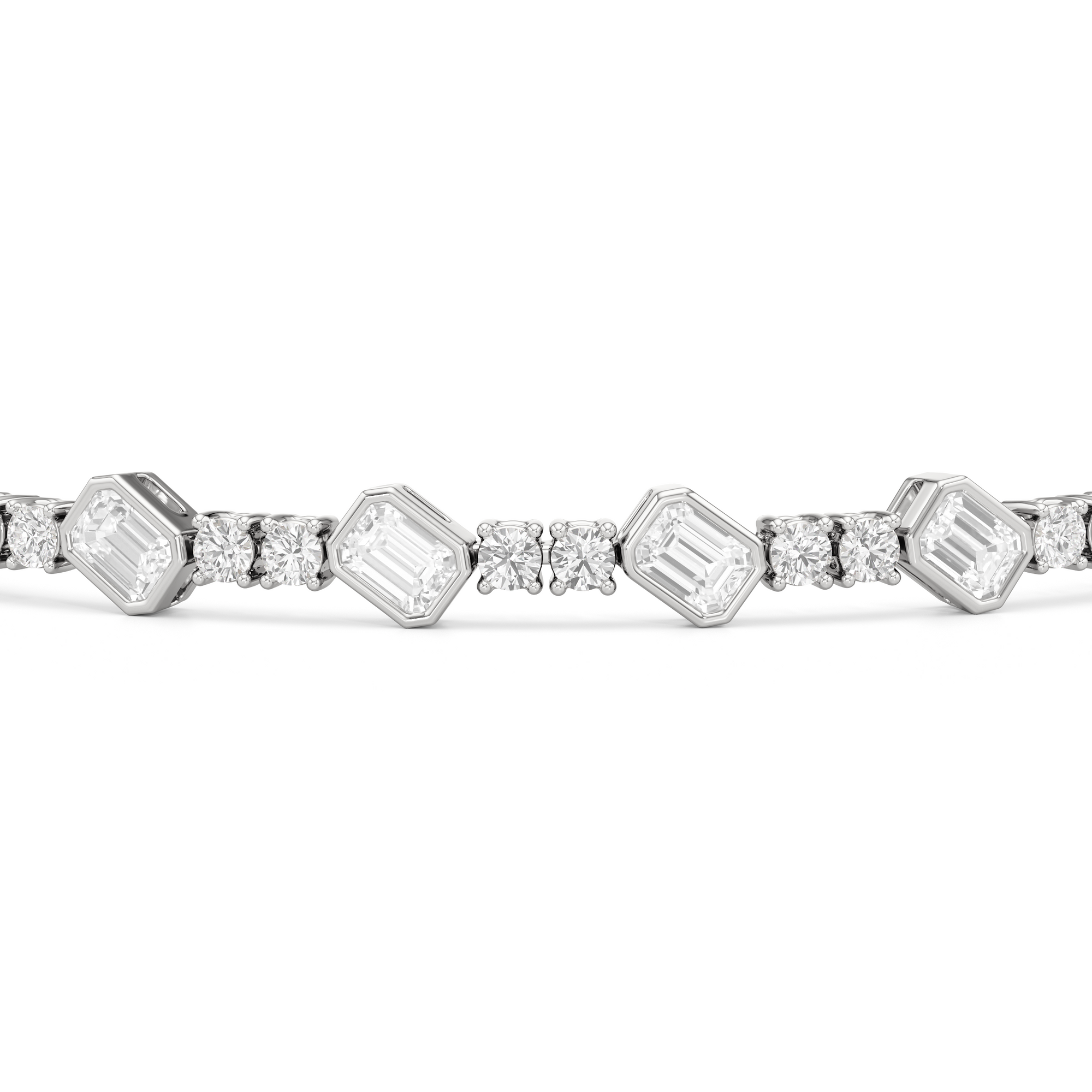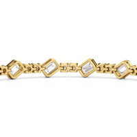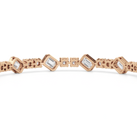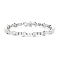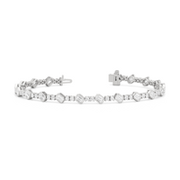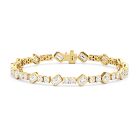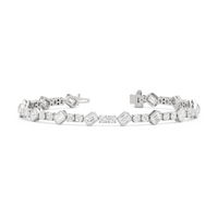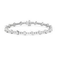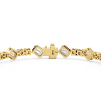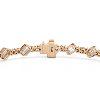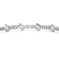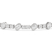 Designed with transitional appeal, this tennis bracelet elegantly combines rounded edges with crisp and clean lines. It features bezel-set emerald-cut diamonds set on stations along a series of claw-prong-set round diamonds. The two diamond cuts brilliantly work together, sparkling simultaneously.