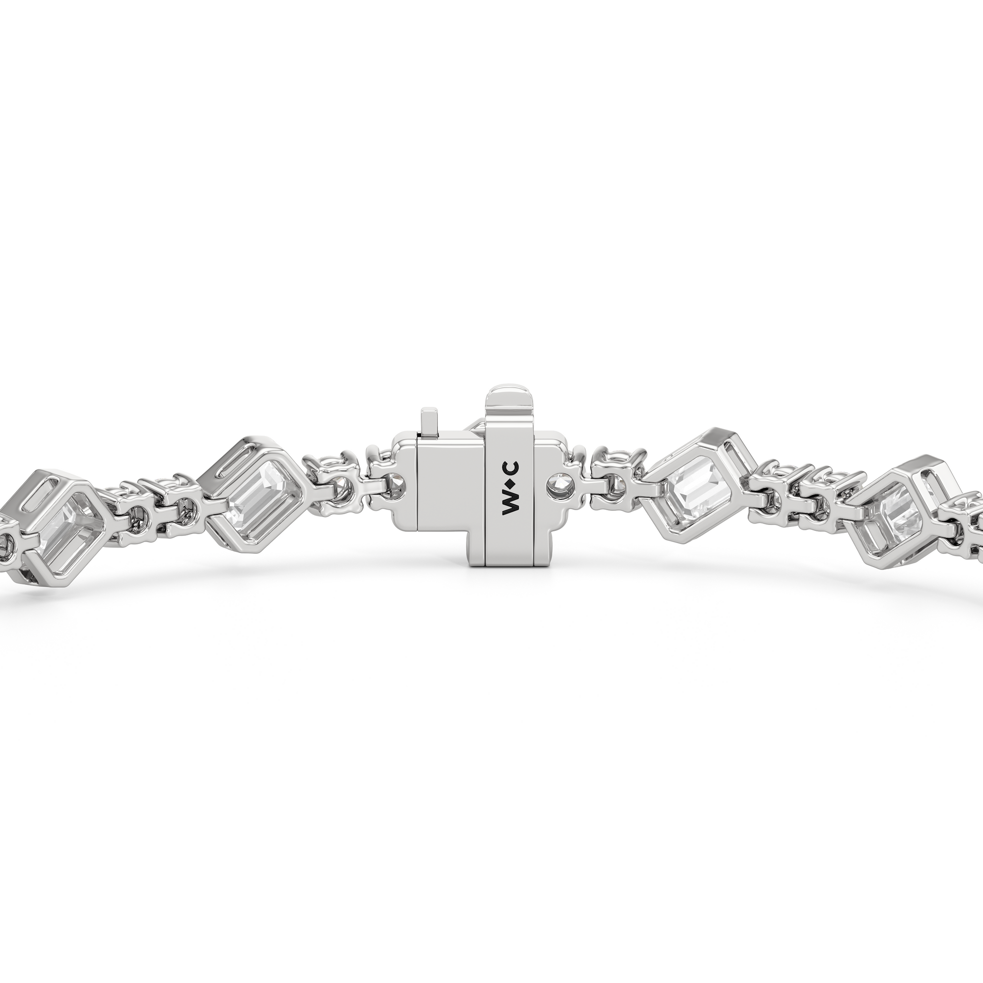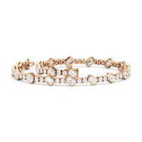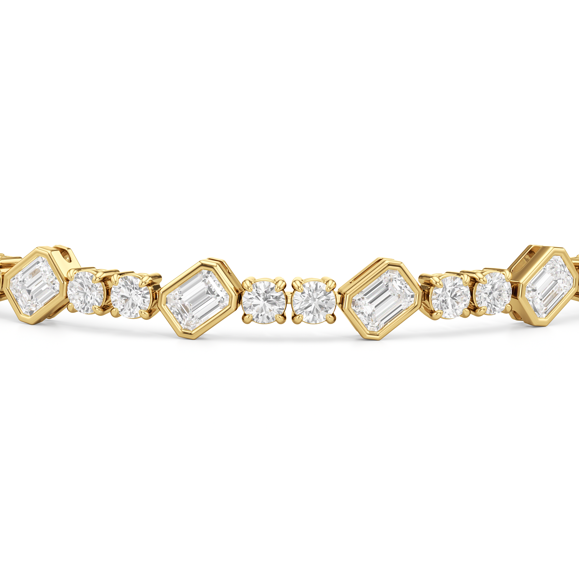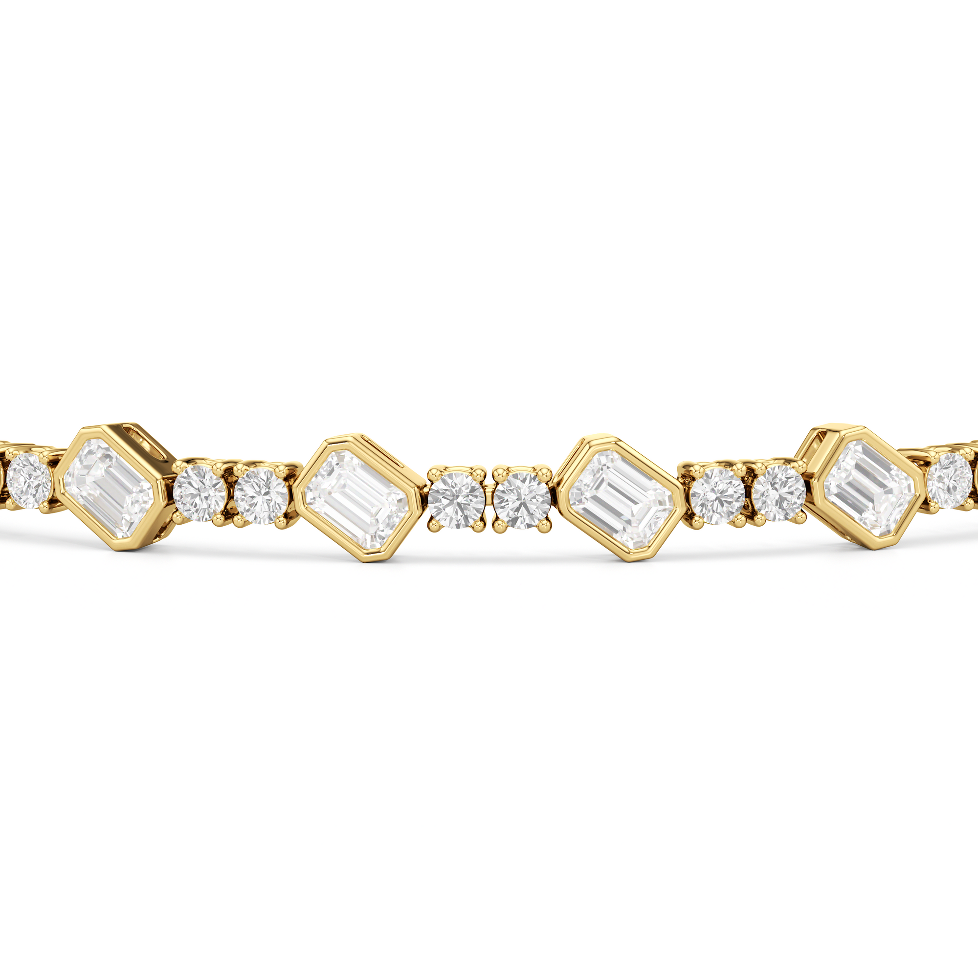 Designed with transitional appeal, this tennis bracelet elegantly combines rounded edges with crisp and clean lines. It features bezel-set emerald-cut diamonds set on stations along a series of claw-prong-set round diamonds. The two diamond cuts brilliantly work together, sparkling simultaneously.