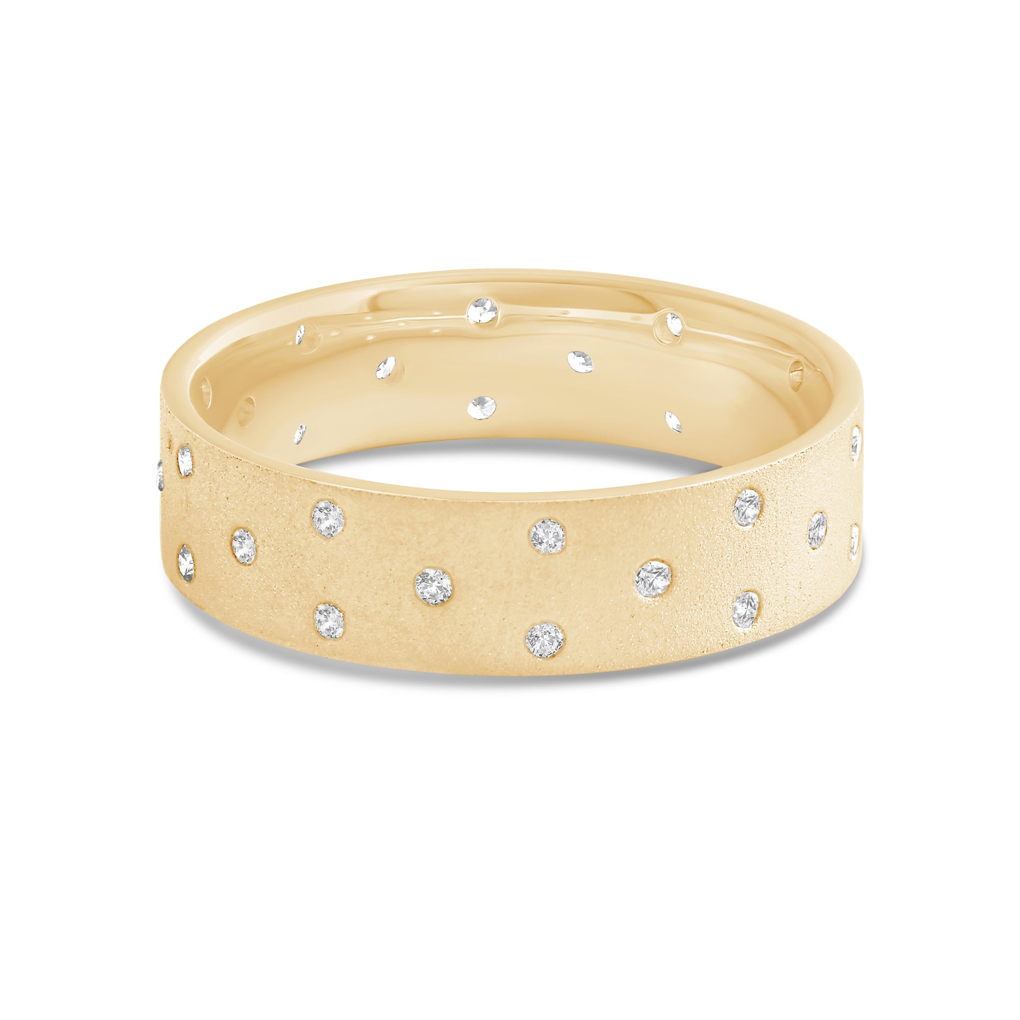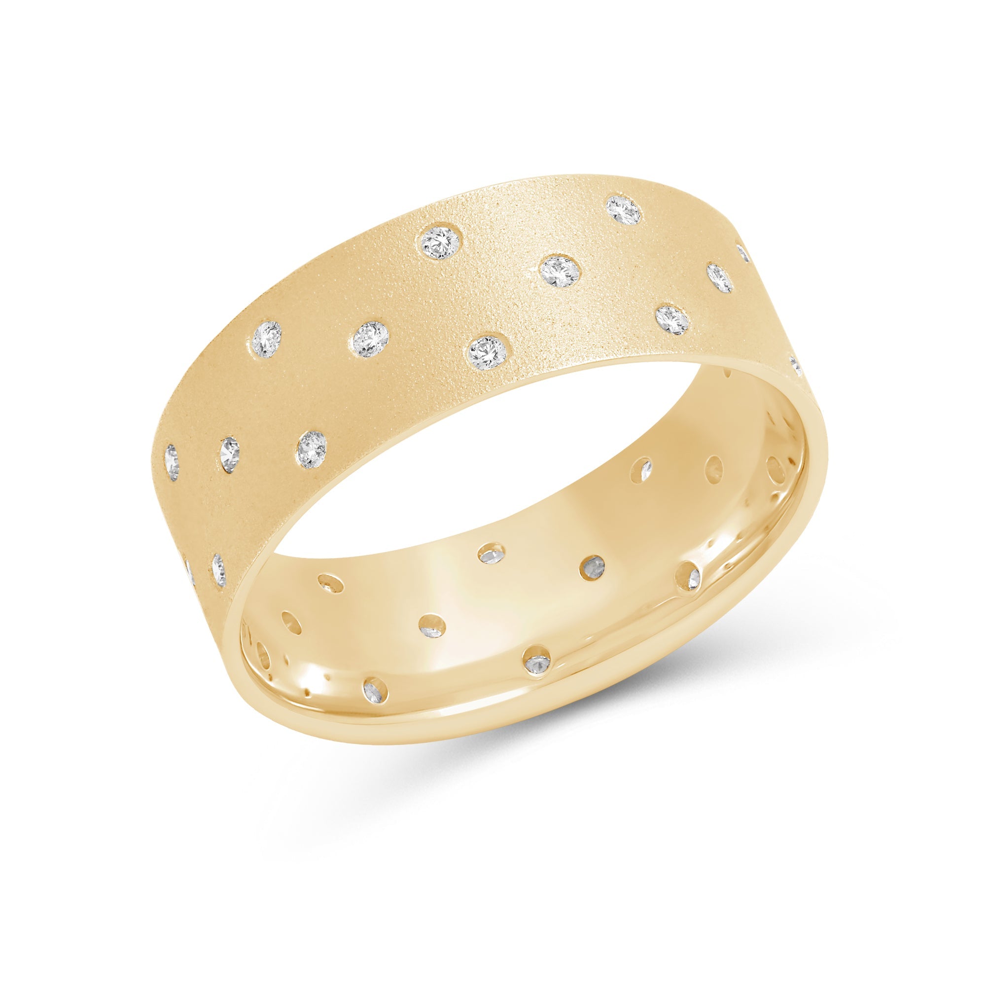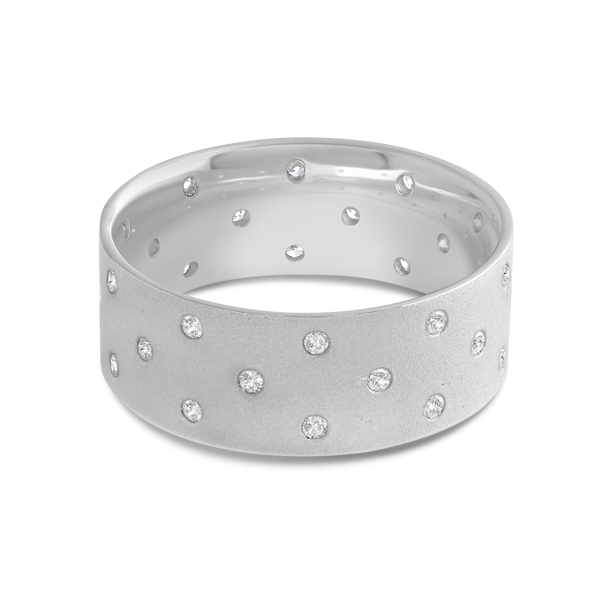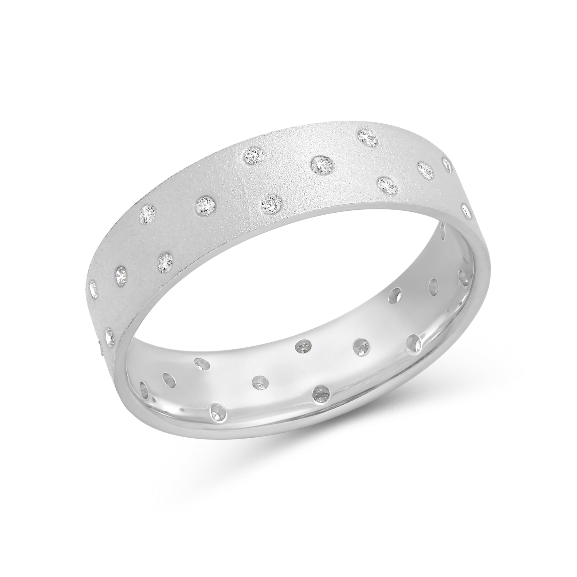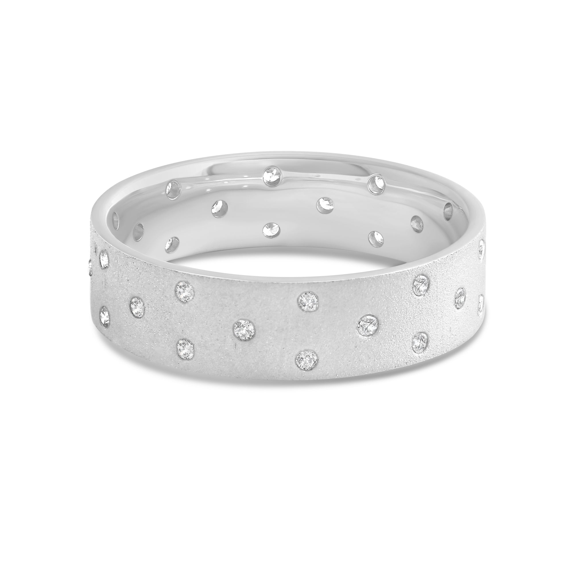 This diamond ring is perfect for the one who favors discreet yet distinct accessories. It features a flat and sandblast-finished band embedded with diamonds in a gypsy setting. The securely set stones sit flush with the metal, presenting a neat look and a flat surface that's less likely to snag on clothing.