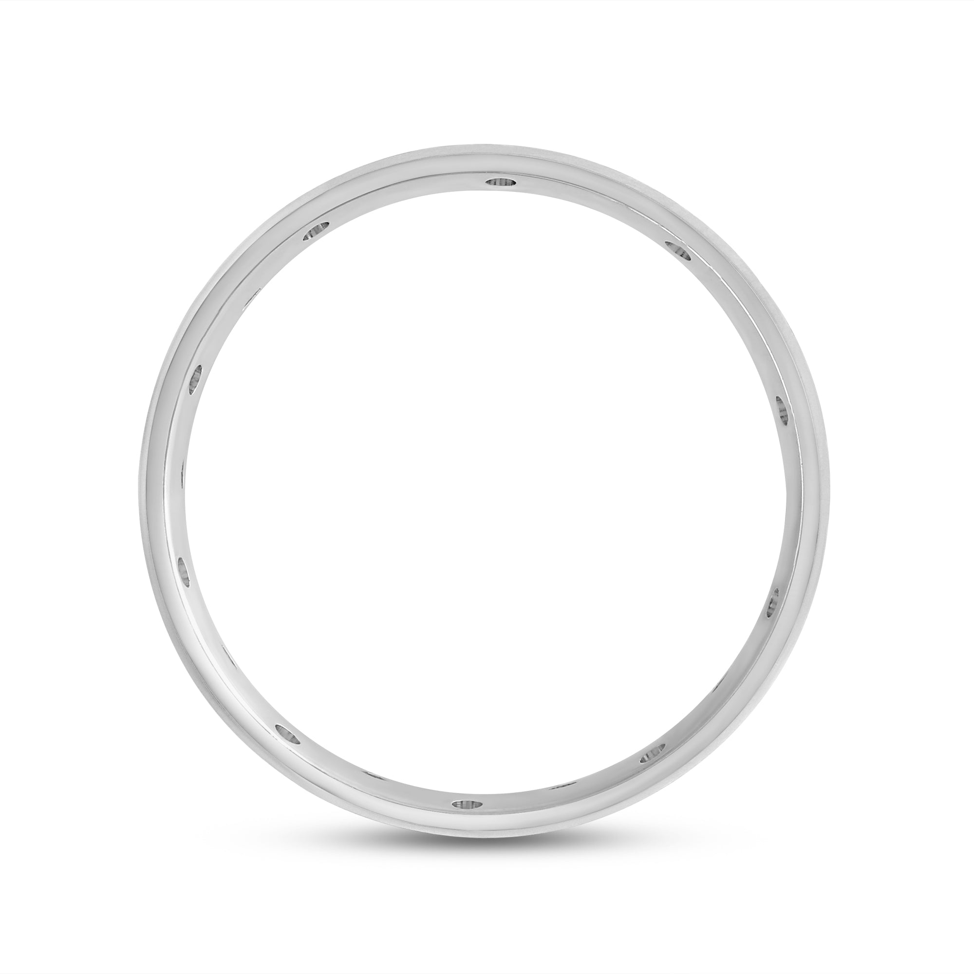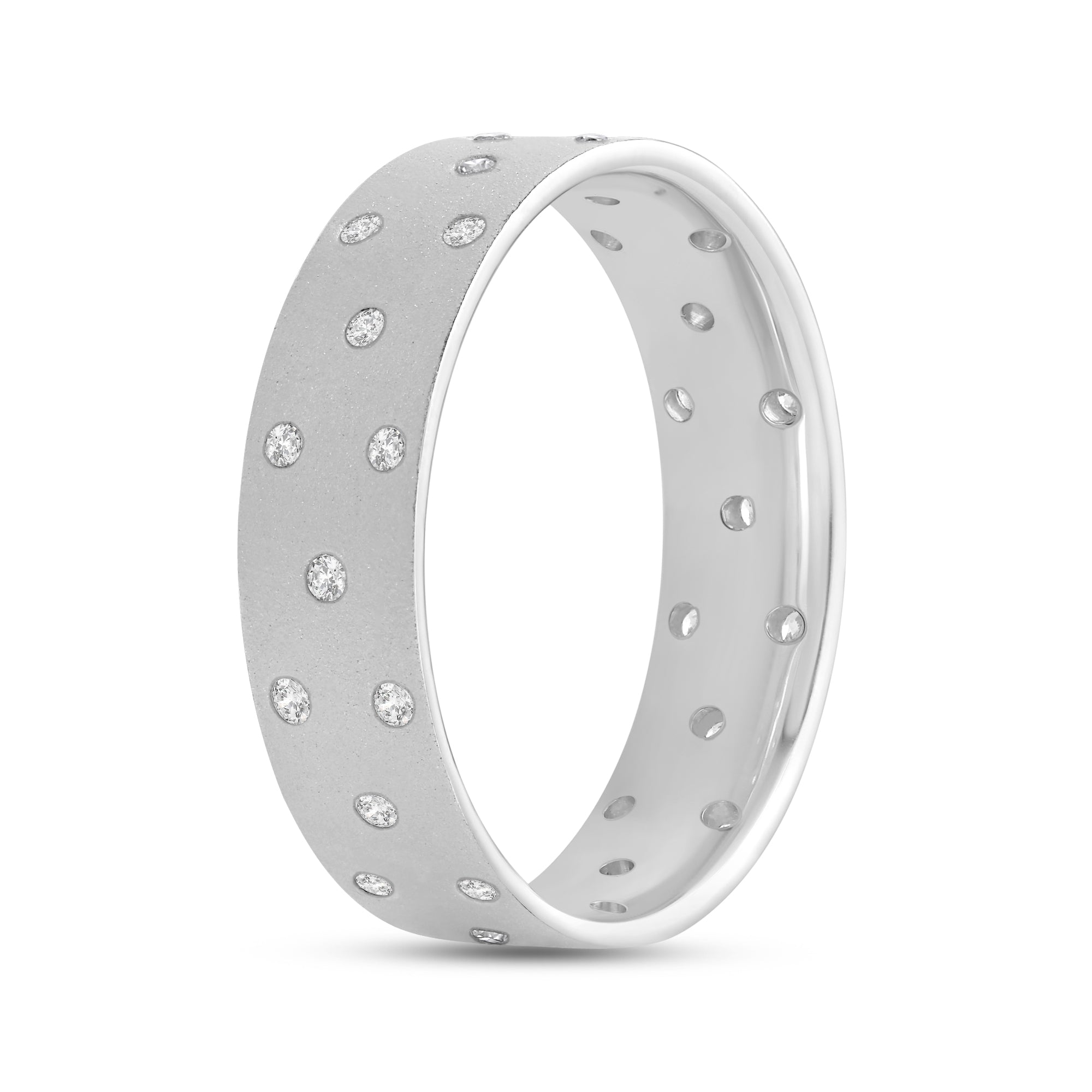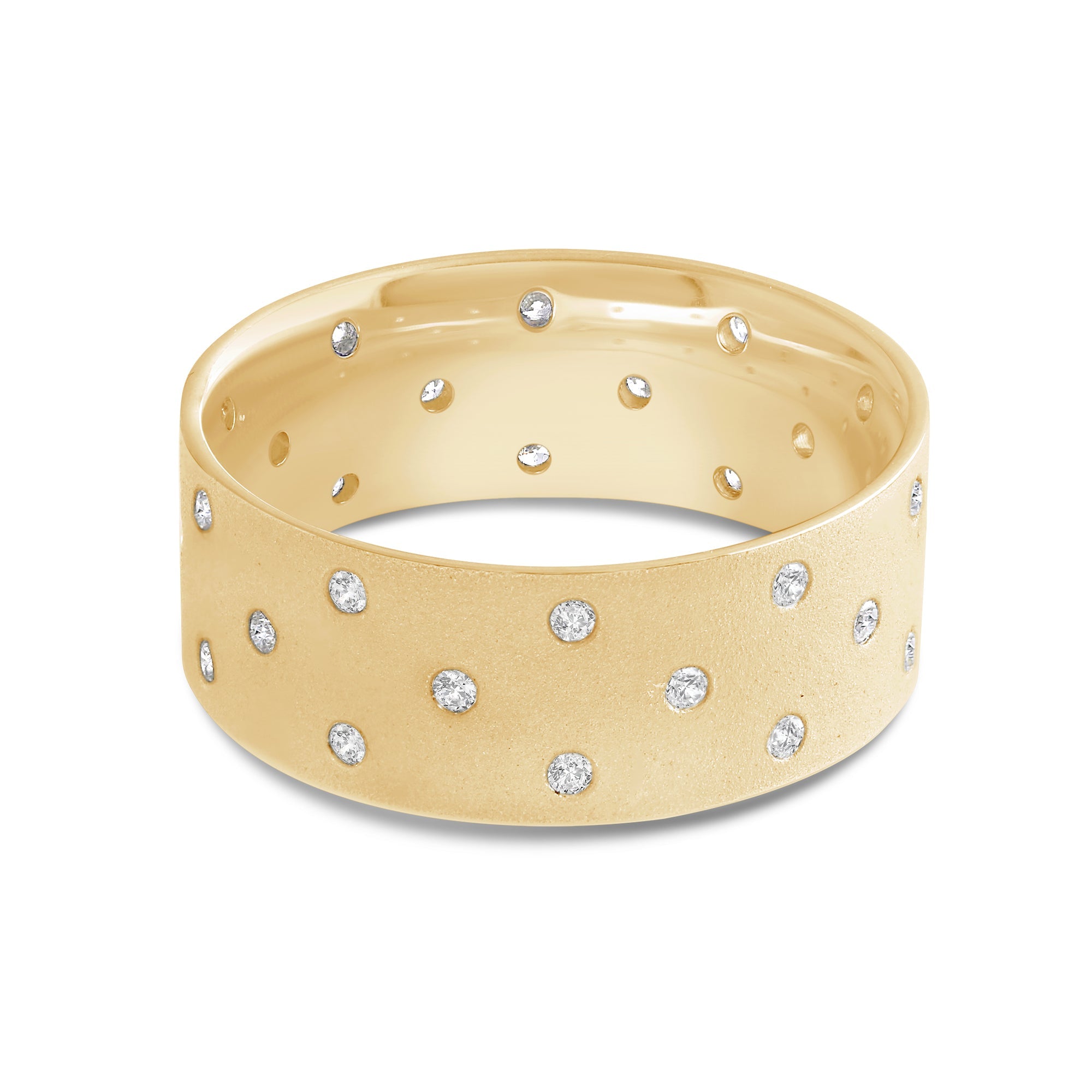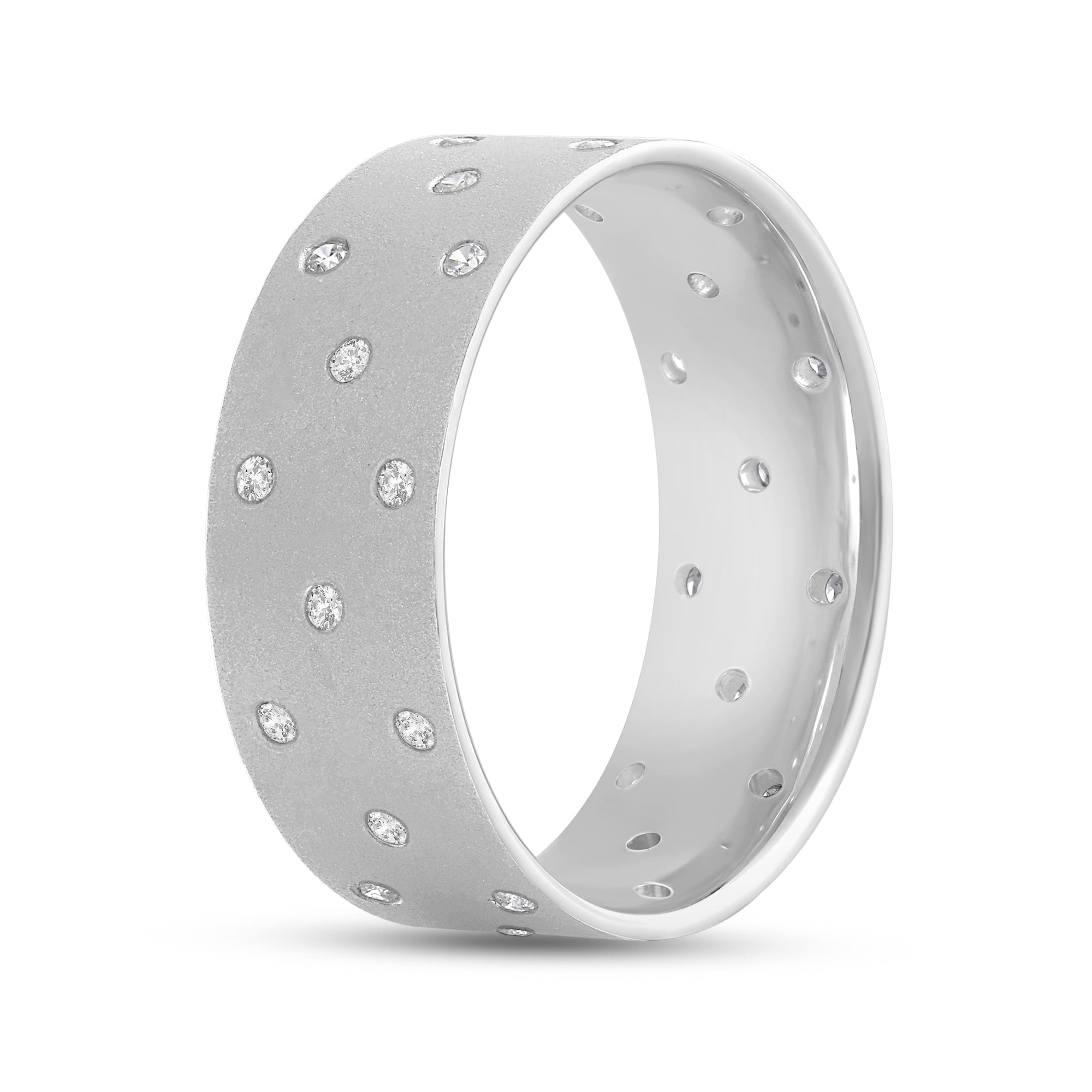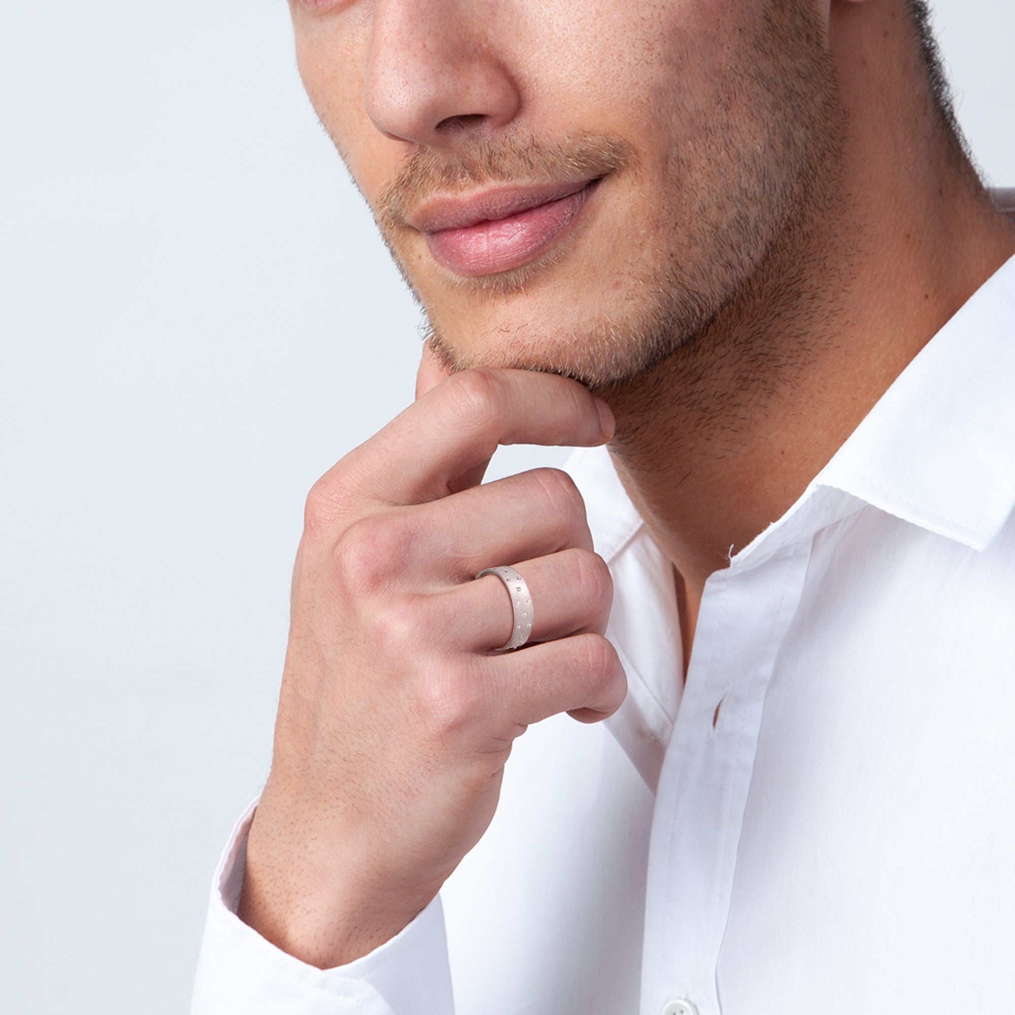This diamond ring is perfect for the one who favors discreet yet distinct accessories. It features a flat and sandblast-finished band embedded with diamonds in a gypsy setting. The securely set stones sit flush with the metal, presenting a neat look and a flat surface that's less likely to snag on clothing.