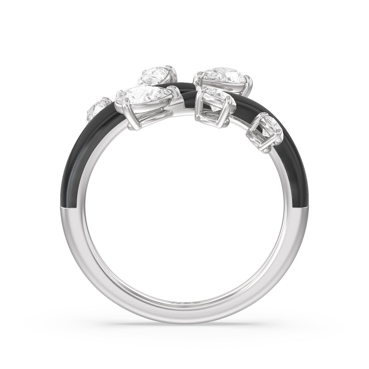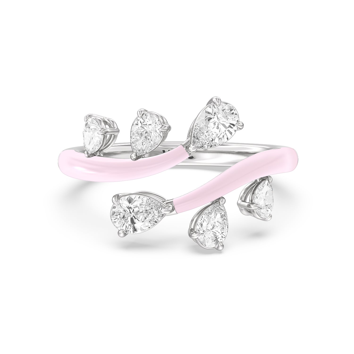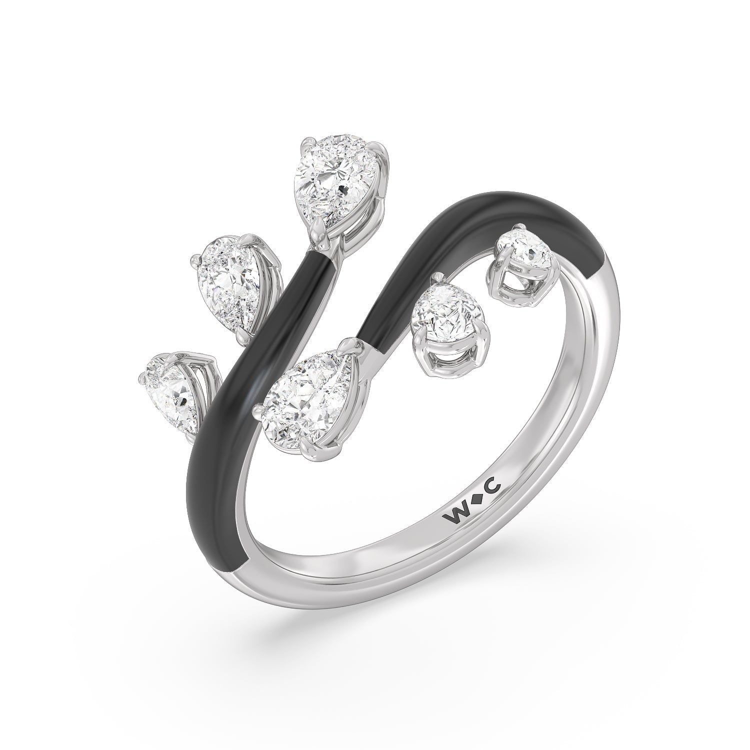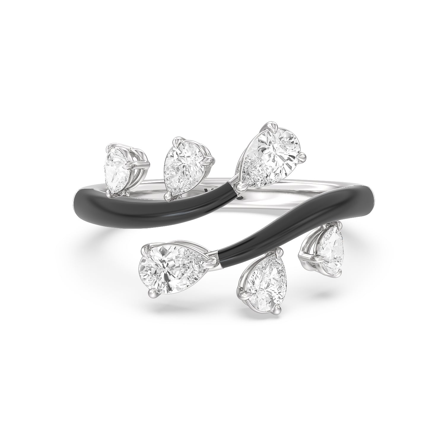 Embrace playful style with this ceramic ring embellished with diamonds. This open bypass ring features ceramic shoulders. Stemming from the split open band are diamond trios featuring pear-cut diamonds in tapering sizes.