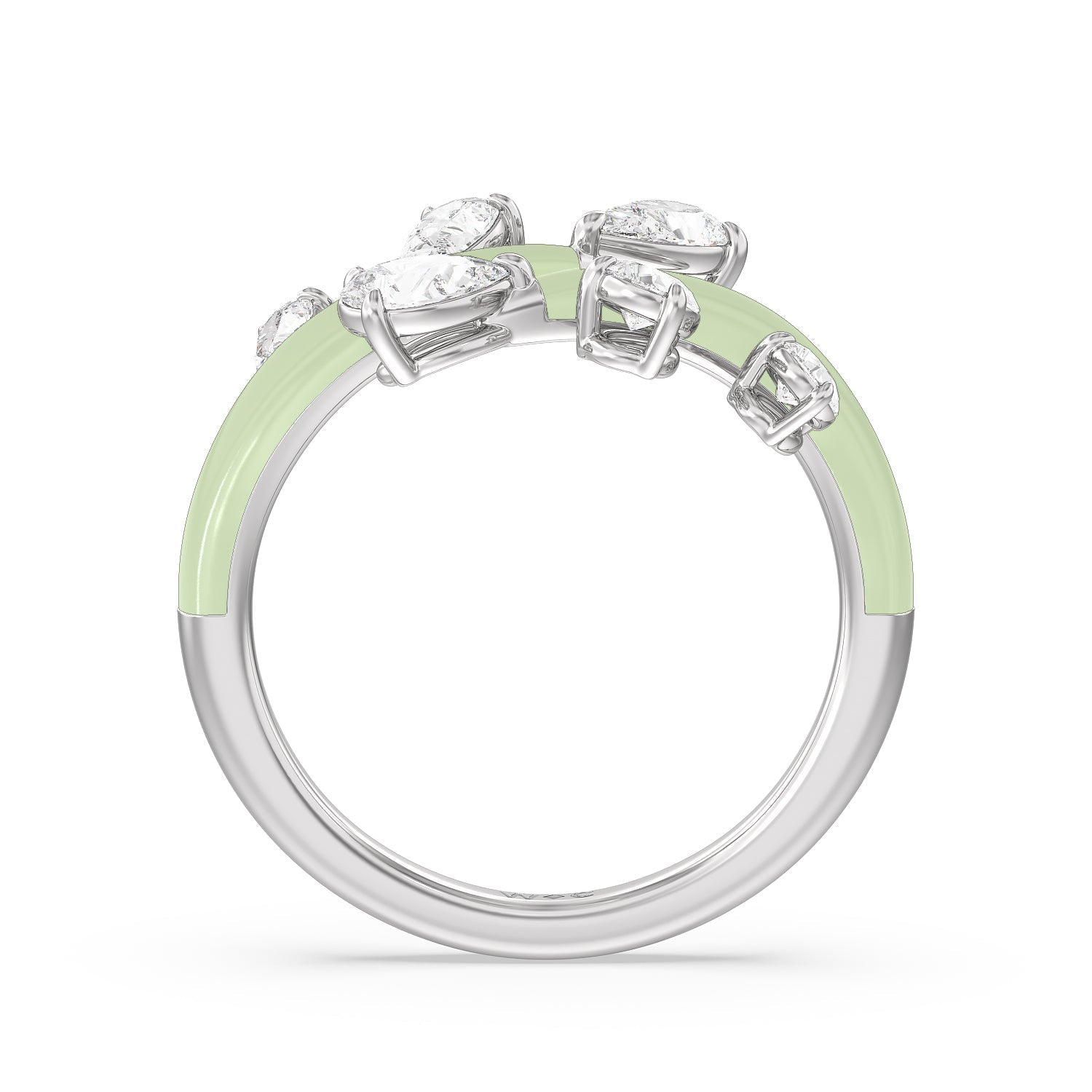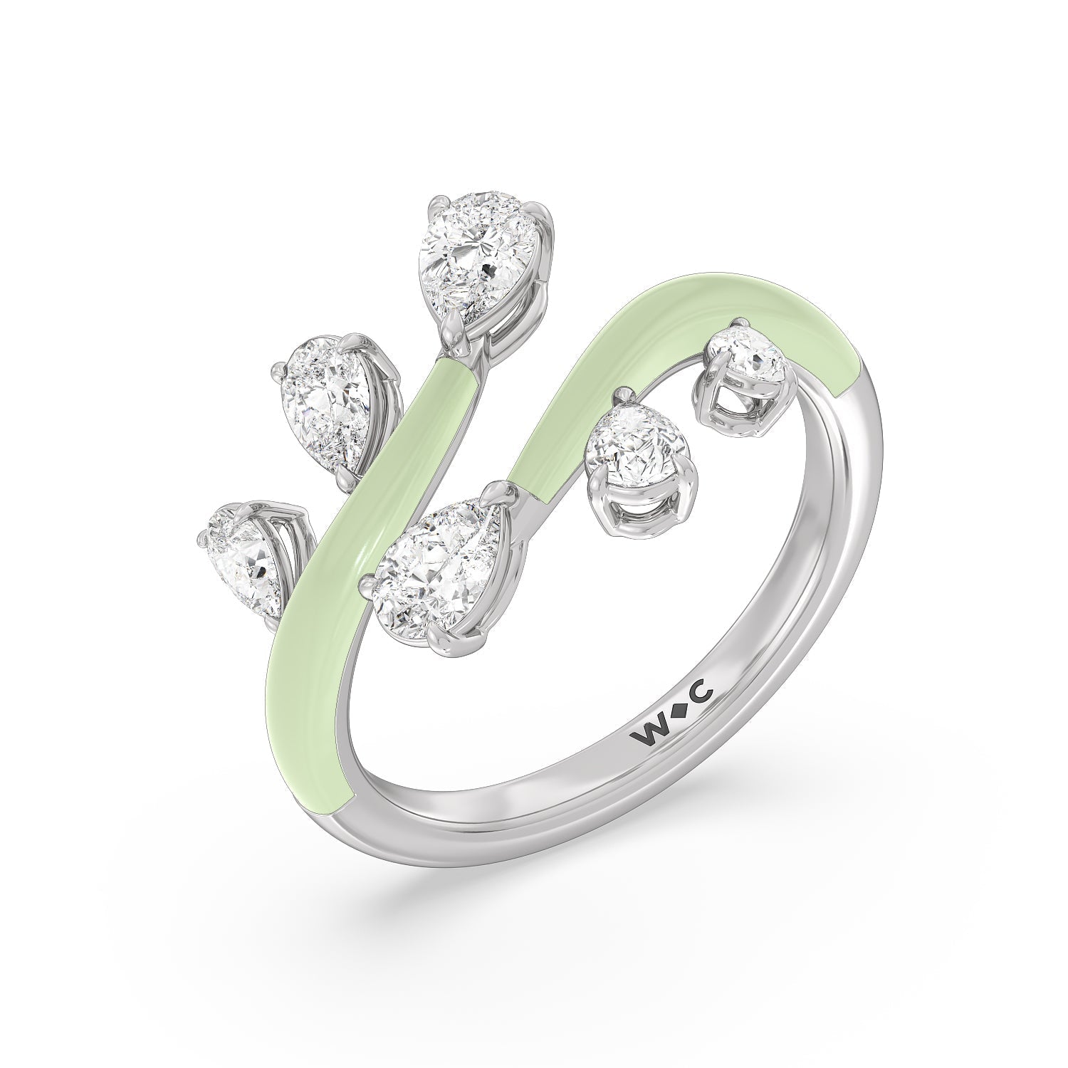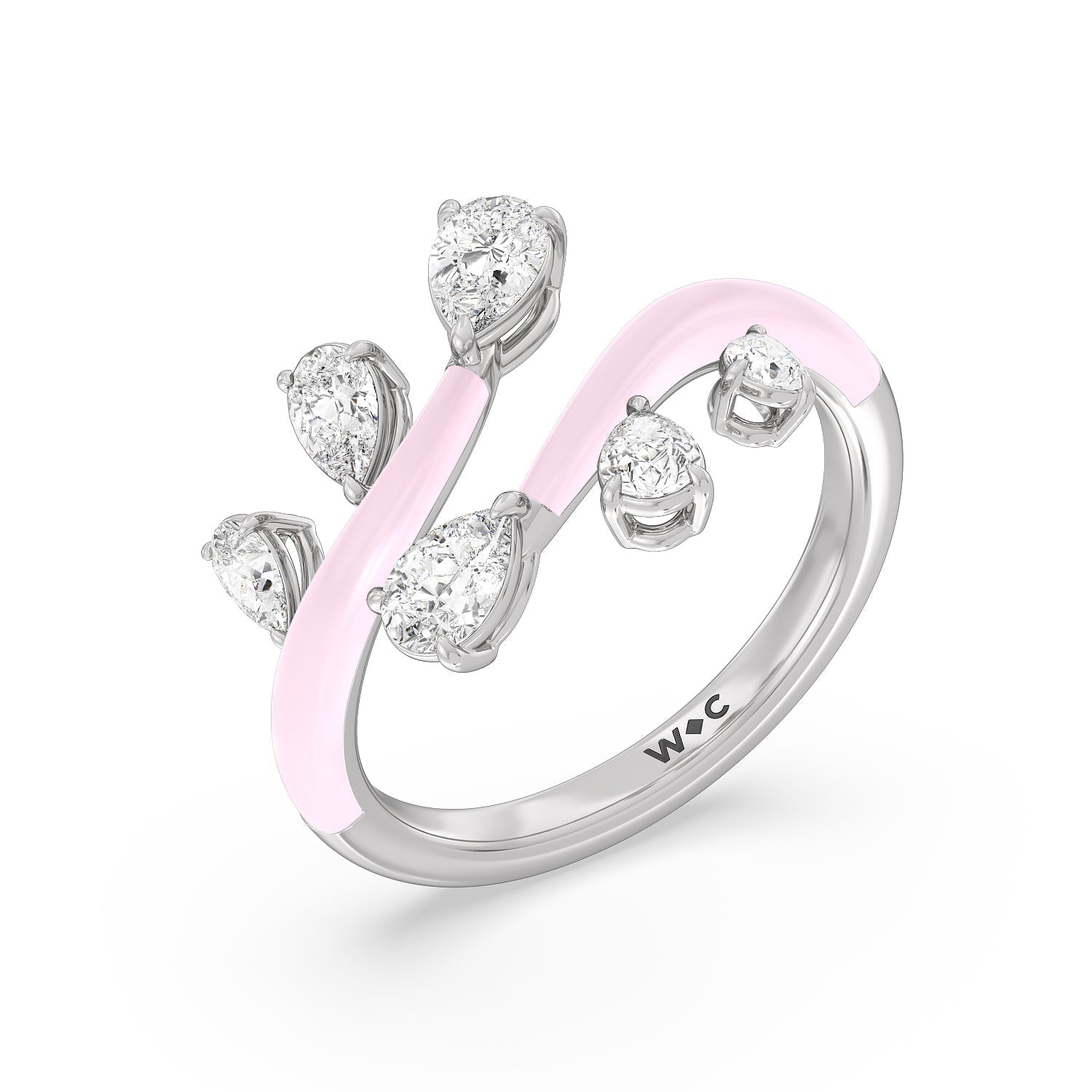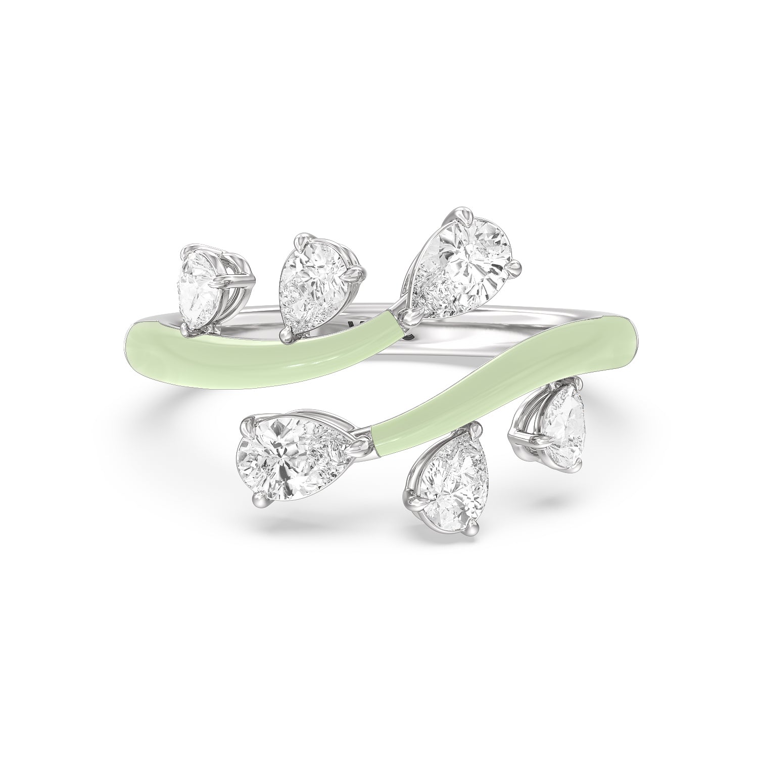 Embrace playful style with this ceramic ring embellished with diamonds. This open bypass ring features ceramic shoulders. Stemming from the split open band are diamond trios featuring pear-cut diamonds in tapering sizes.