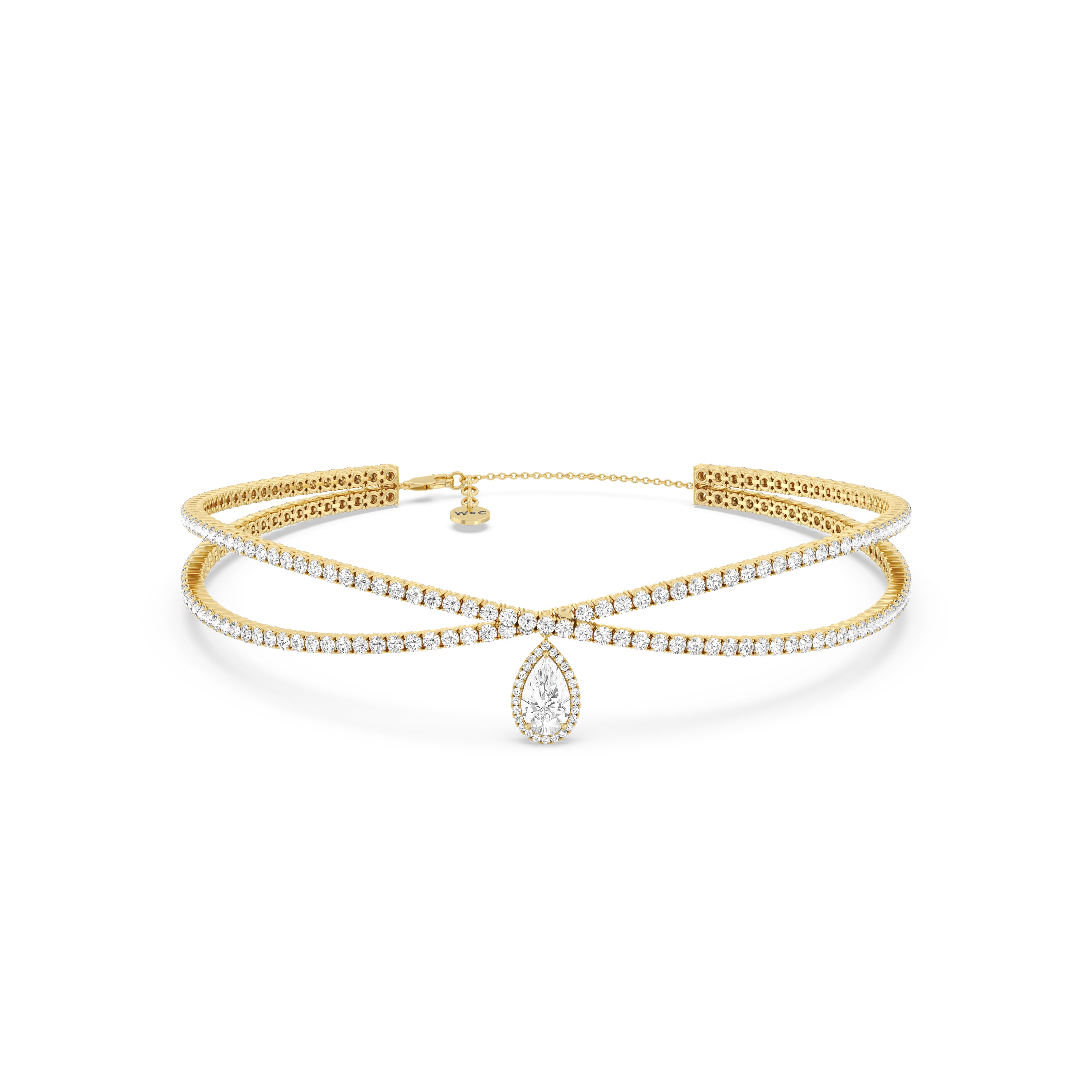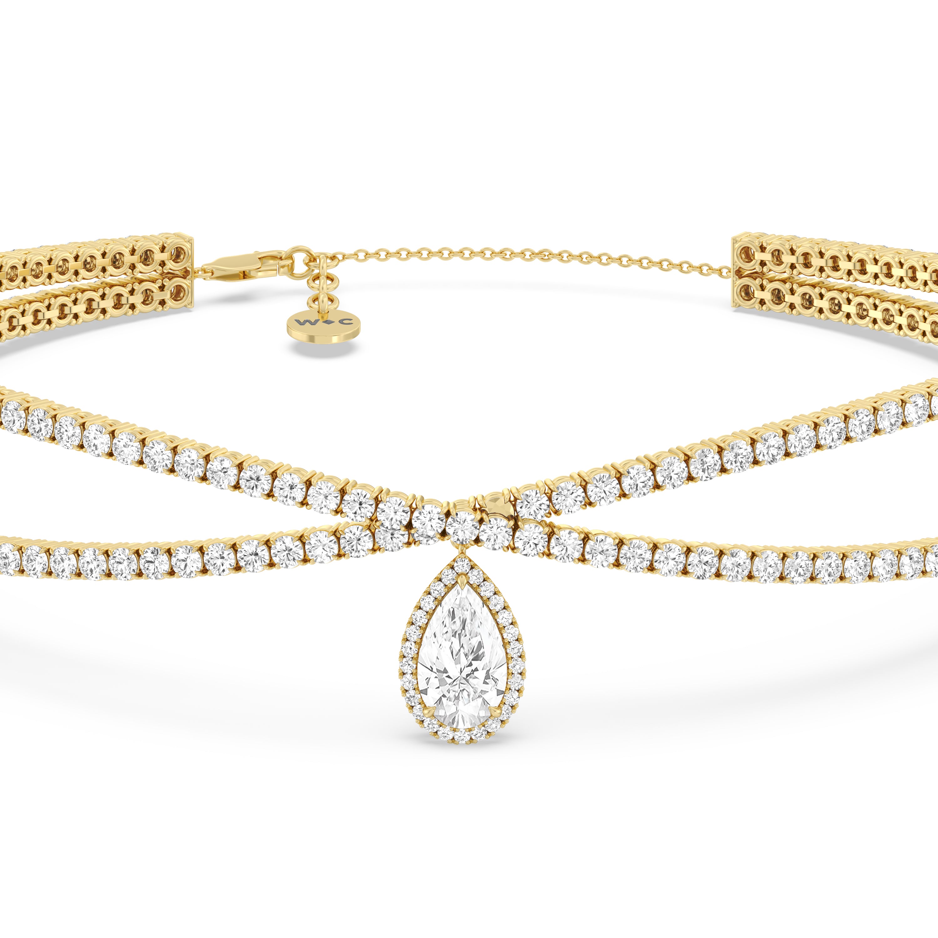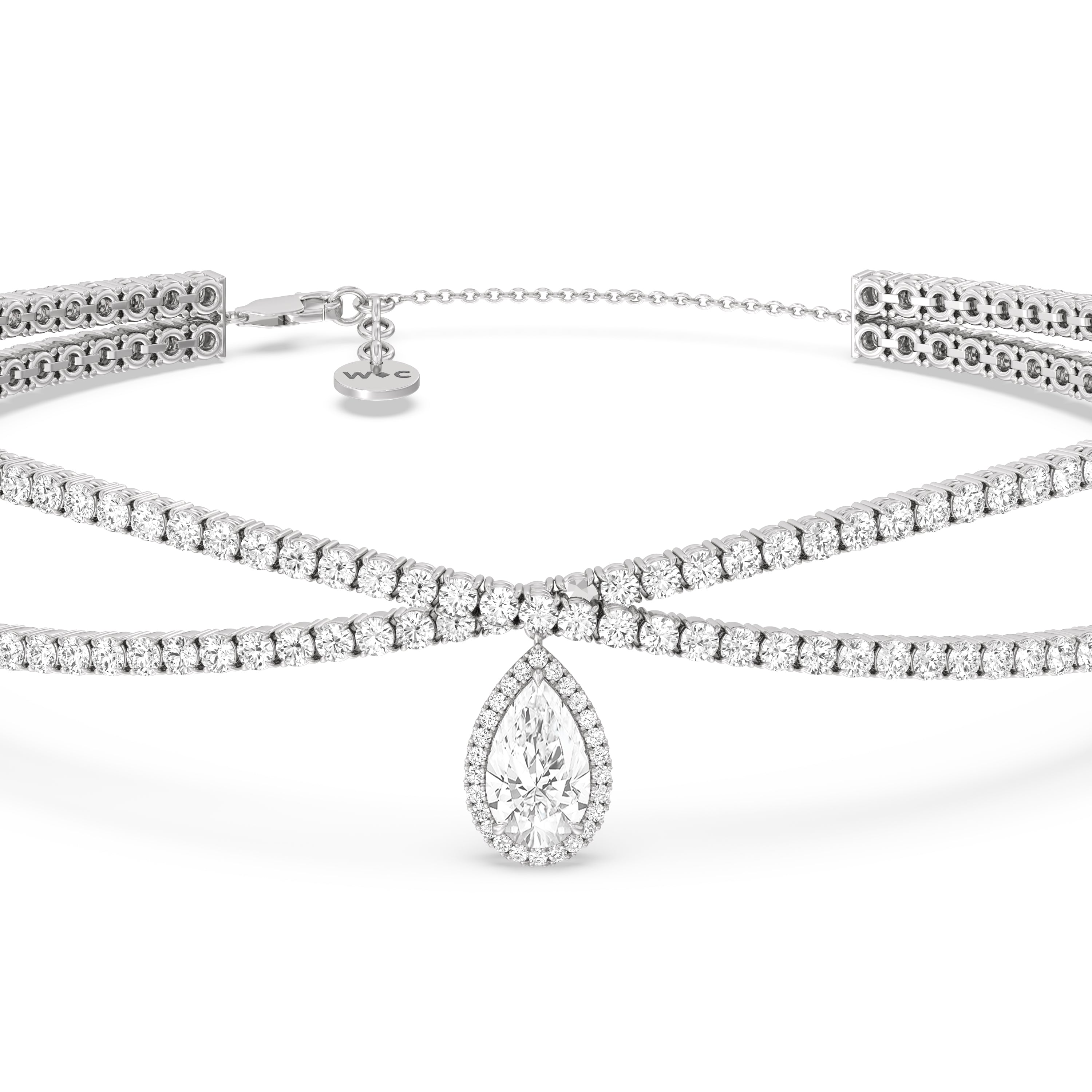 The Teardrop Crossover Diamond Choker Necklace is an exquisite piece of jewelry that exudes elegance and sophistication. Crafted with meticulous attention to detail, this necklace features a unique design that captivates the eye.