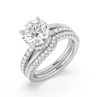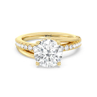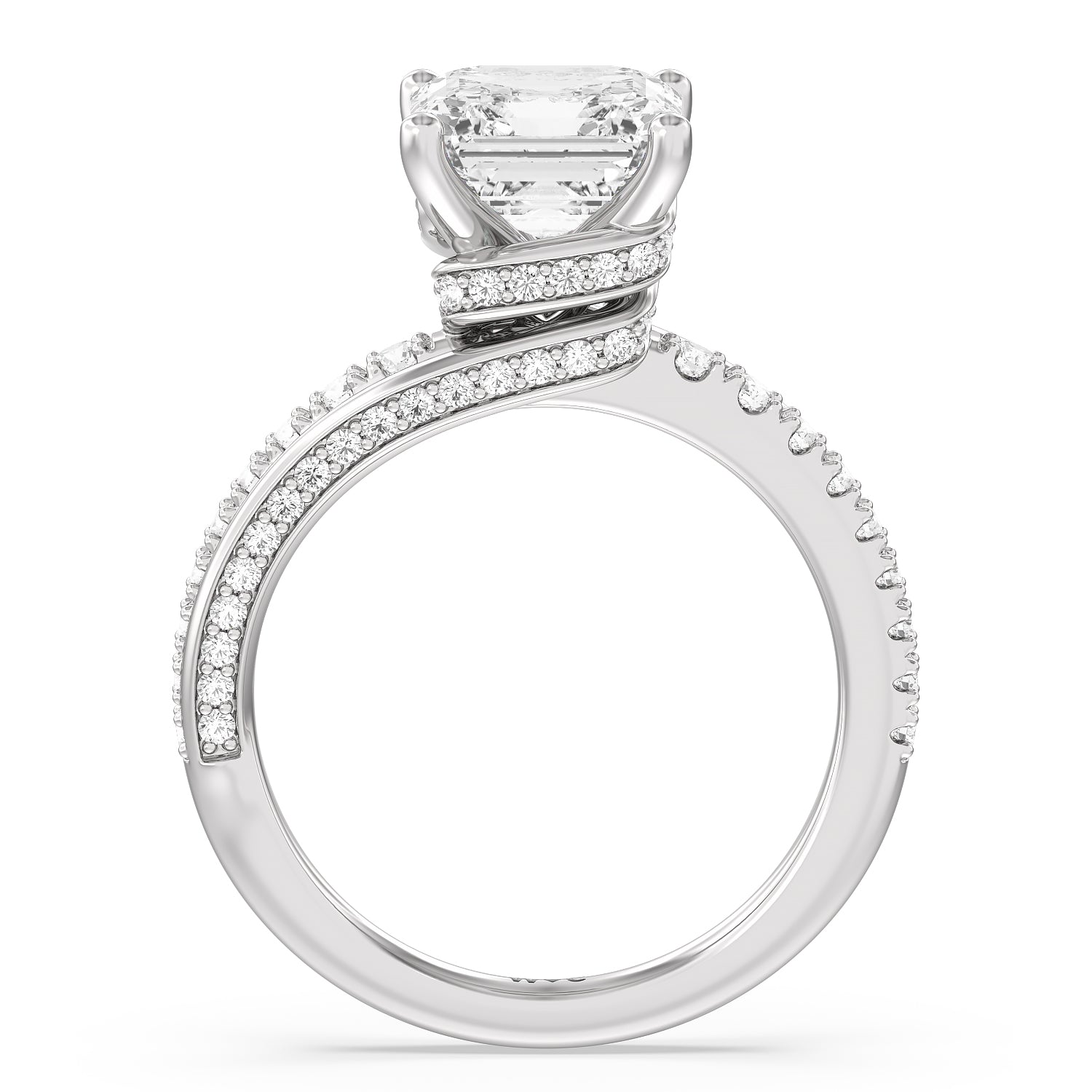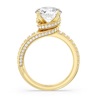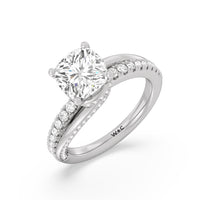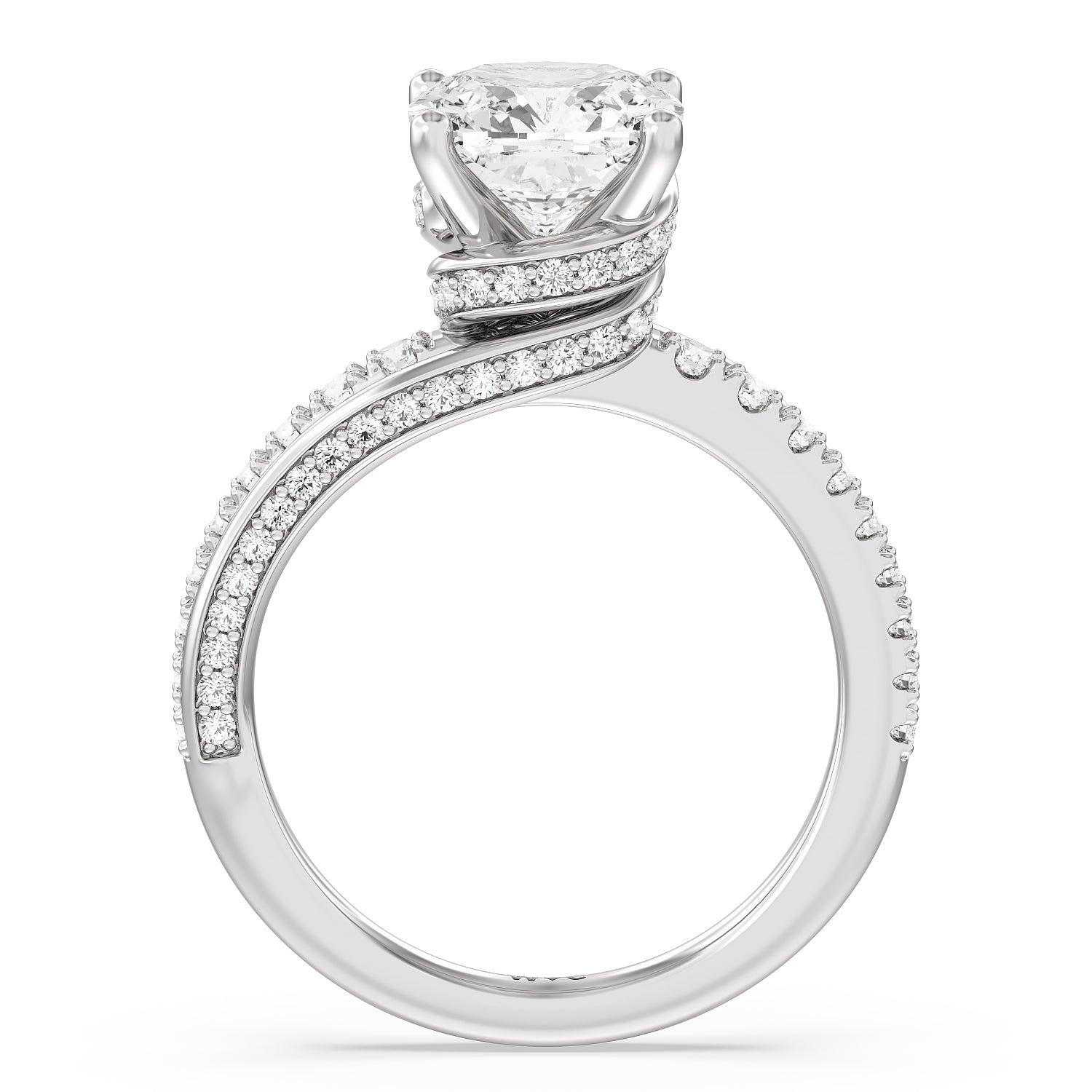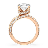 Break the mold with this bold and non-traditional diamond engagement ring. This luxe sparkler features a diamond-pavéd shank topped with a remarkable 3-carat diamond center stone. Encircling the base of the center gem is a spiraling hidden halo that gracefully concludes on opposite side edges of the band's shoulders.