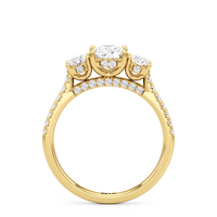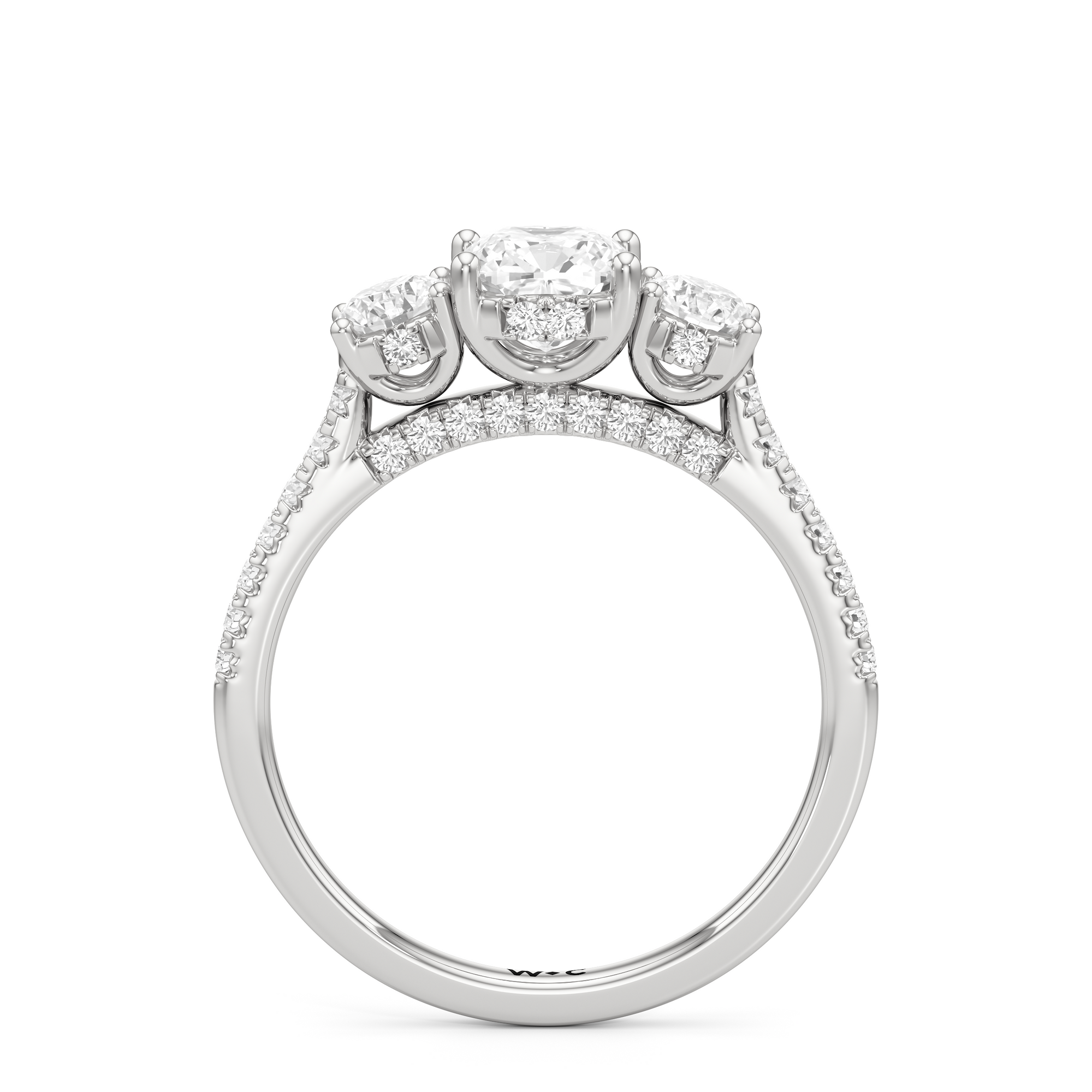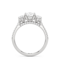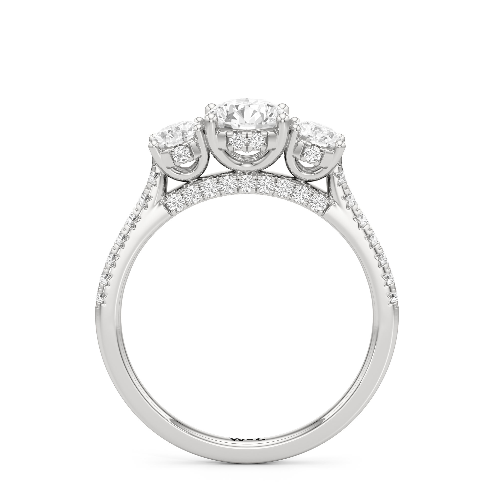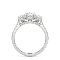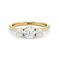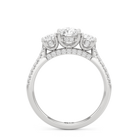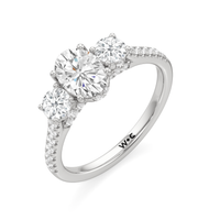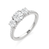 A beautiful and meaningful three-stone engagement ring made distinct by its sinuous curves and intense brilliance. Sloping shoulders with micro-pave diamonds hold the three stones high above the ring. The diamond trio comprises a diamond centre stone and a duo of round diamond side stones, with each precious gem set on U-shaped prongs and detailed with a hidden halo. The bridge is also lined with more round diamonds on micro-pave setting.