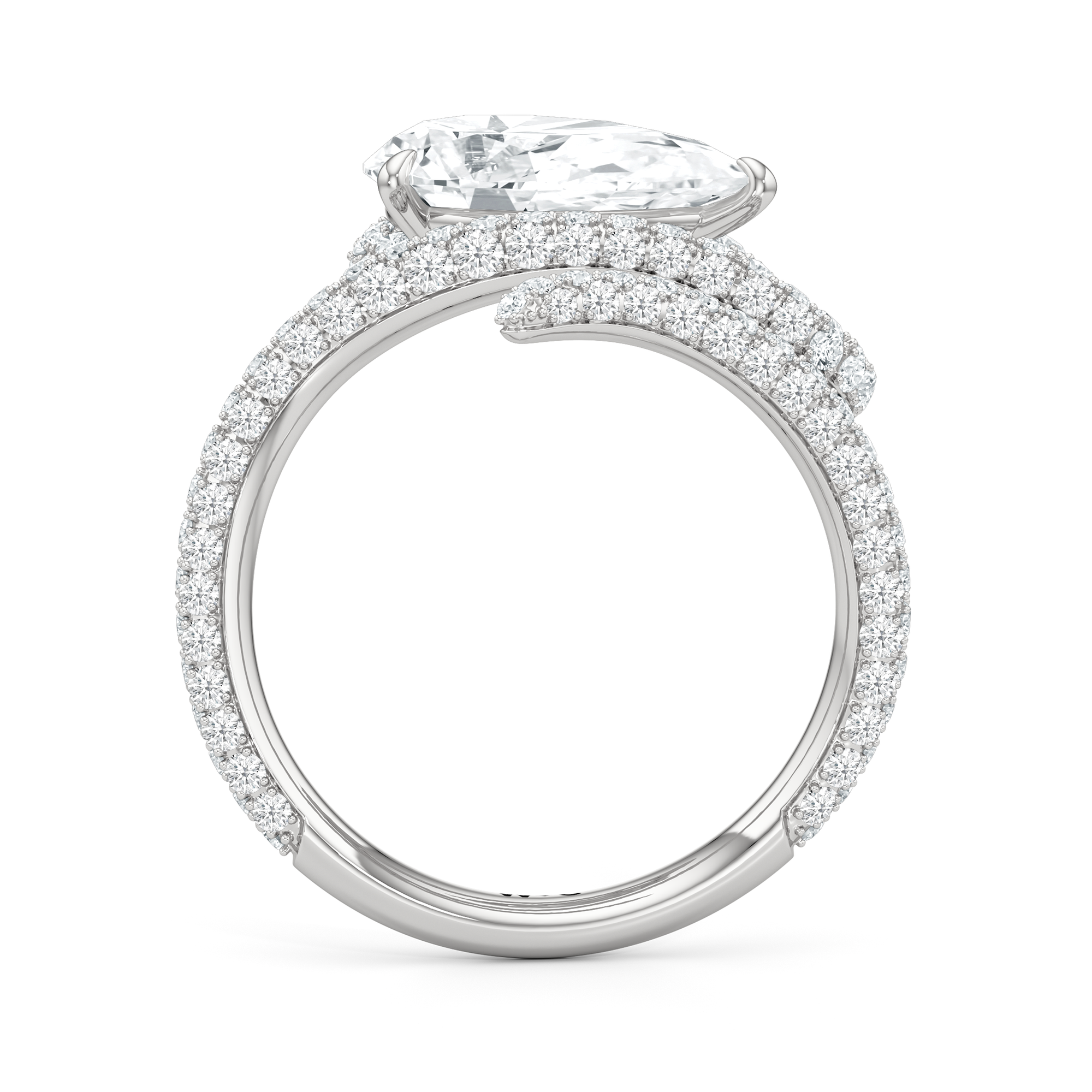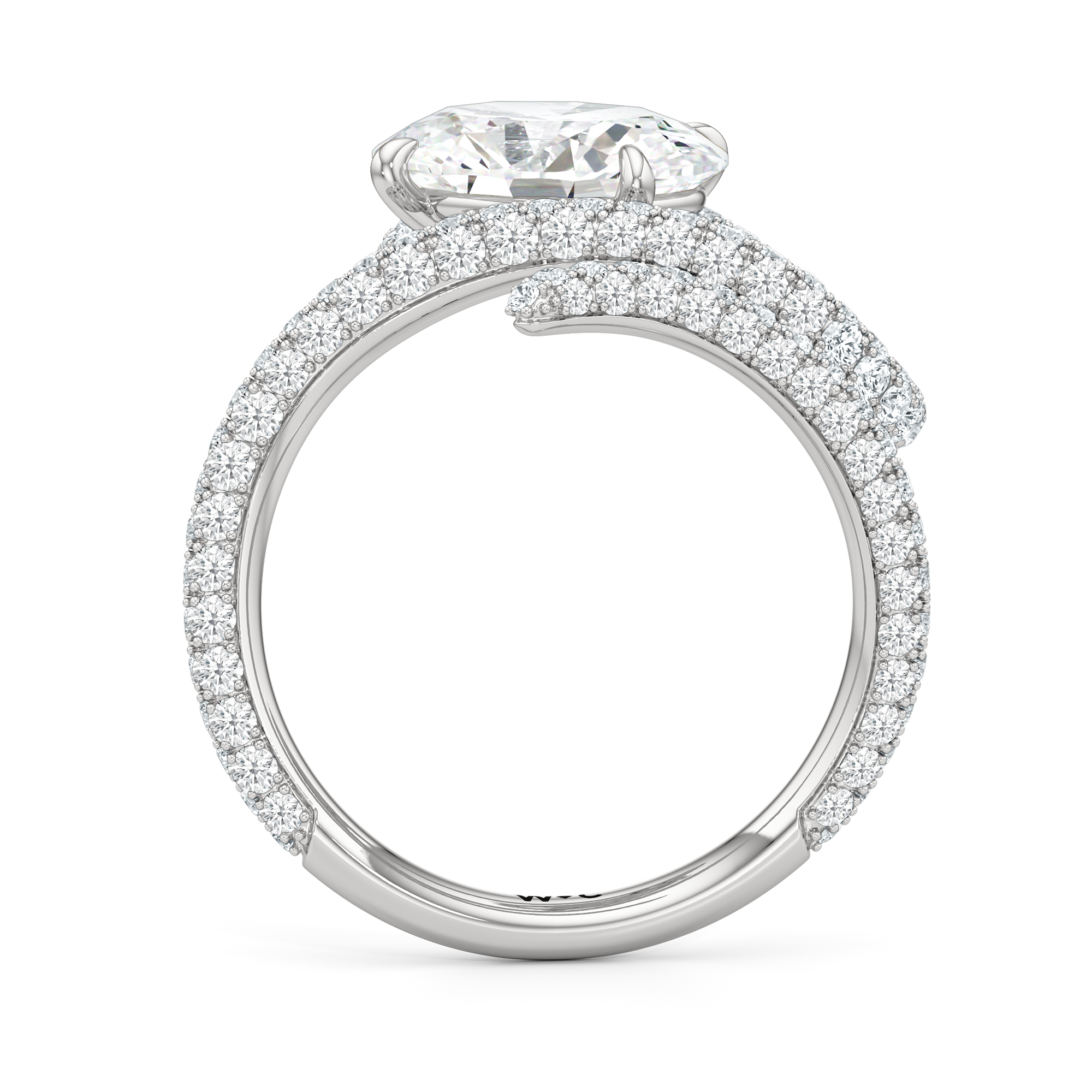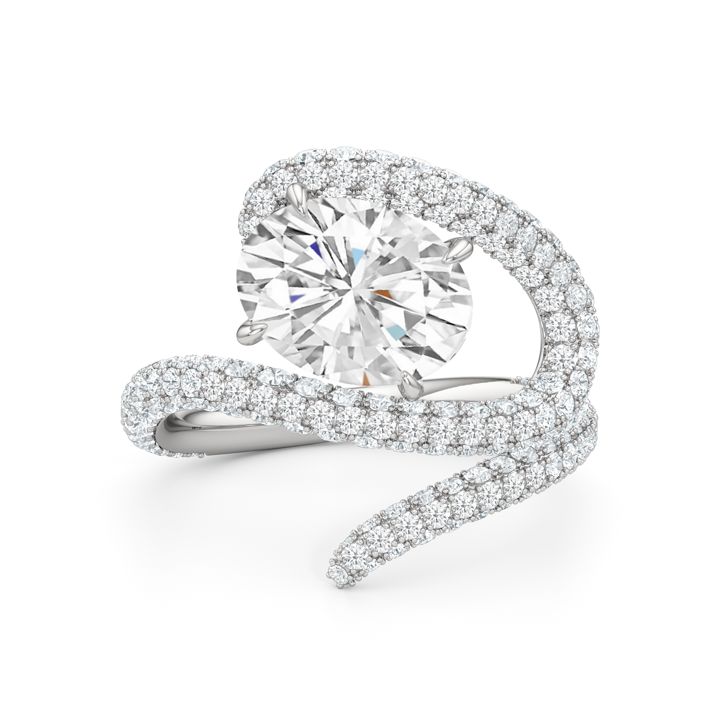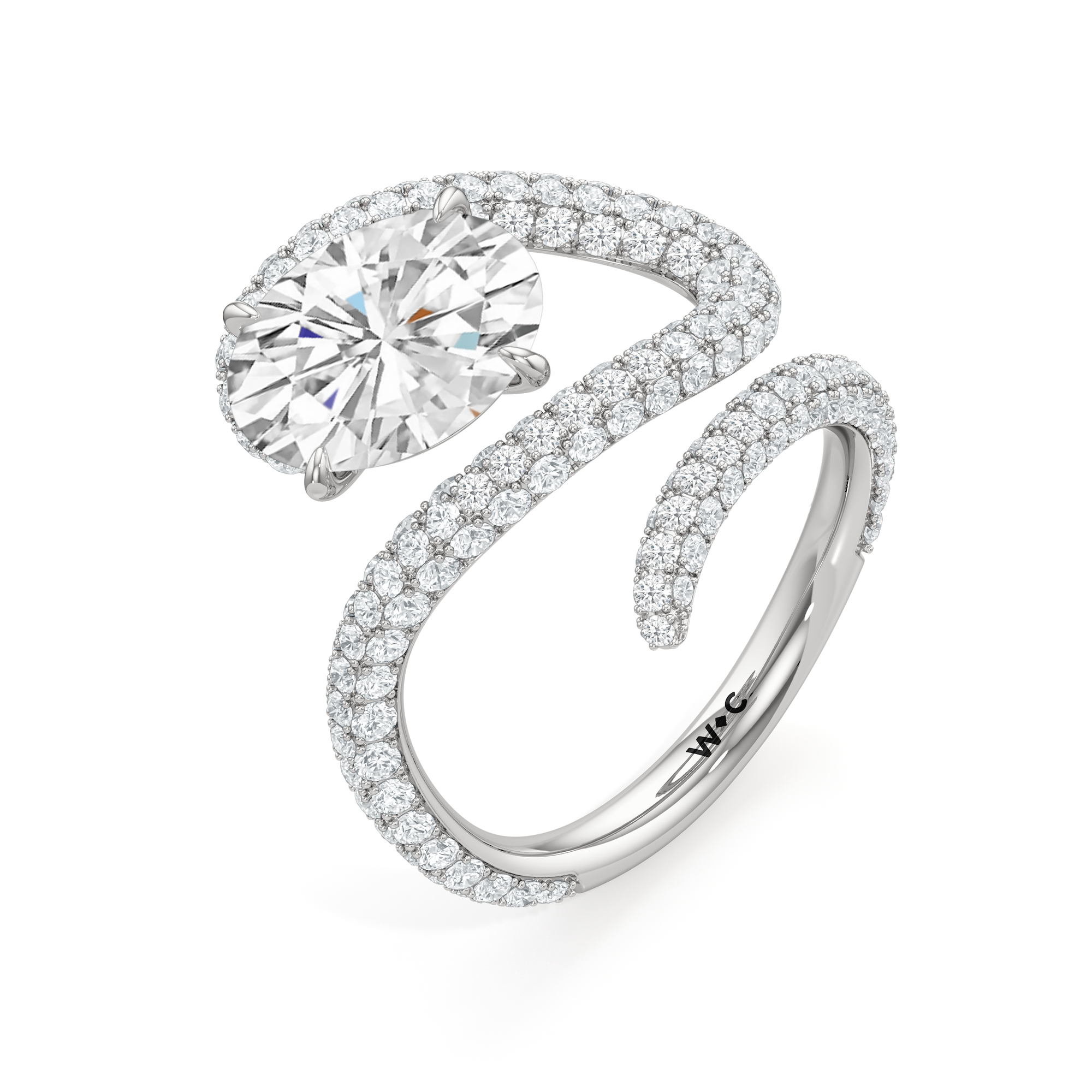 Clean lines meet graceful loops in this ring that feels both modern and grounded. A line of diamonds follows the band's swirling silhouette, drawing attention to the oval diamond center stone.