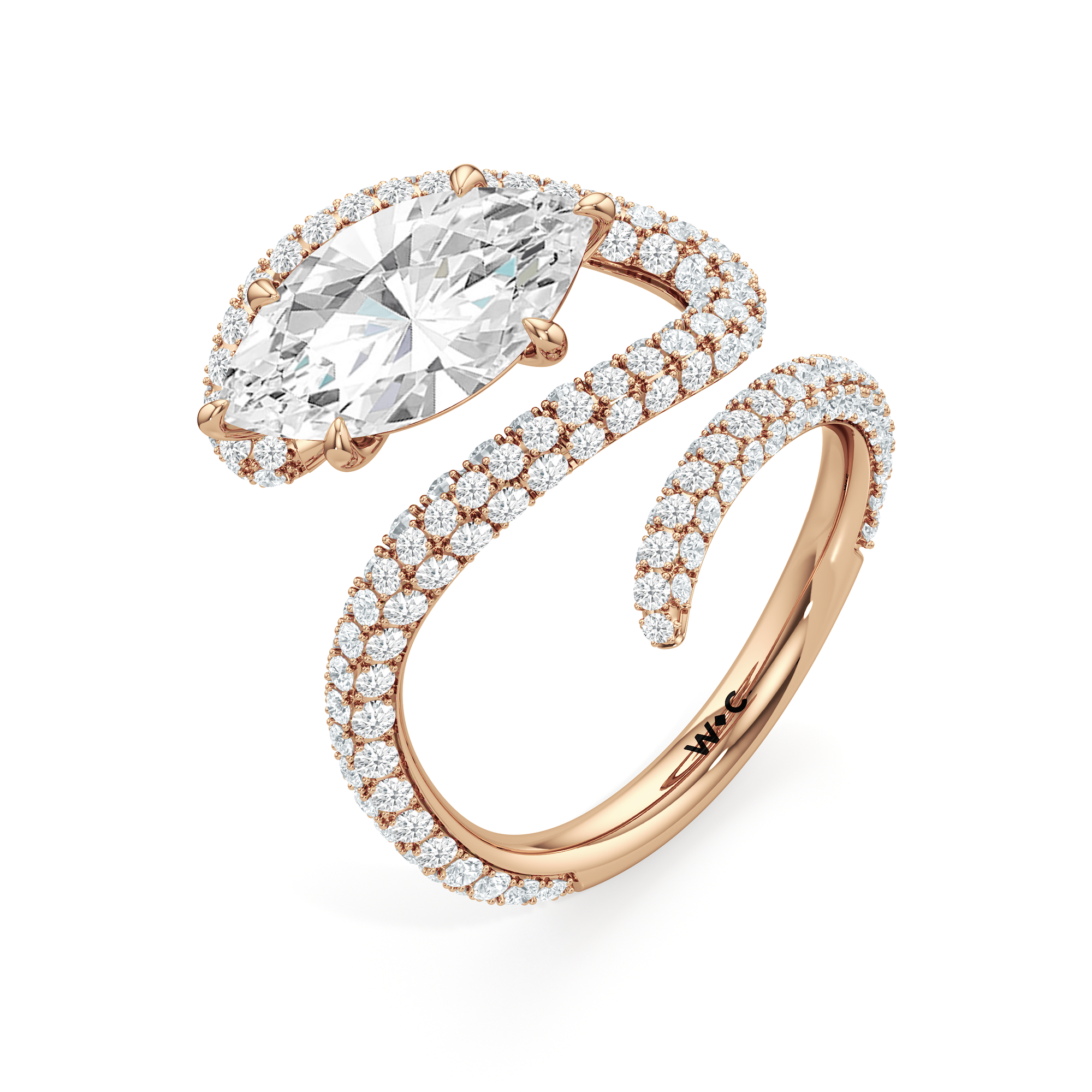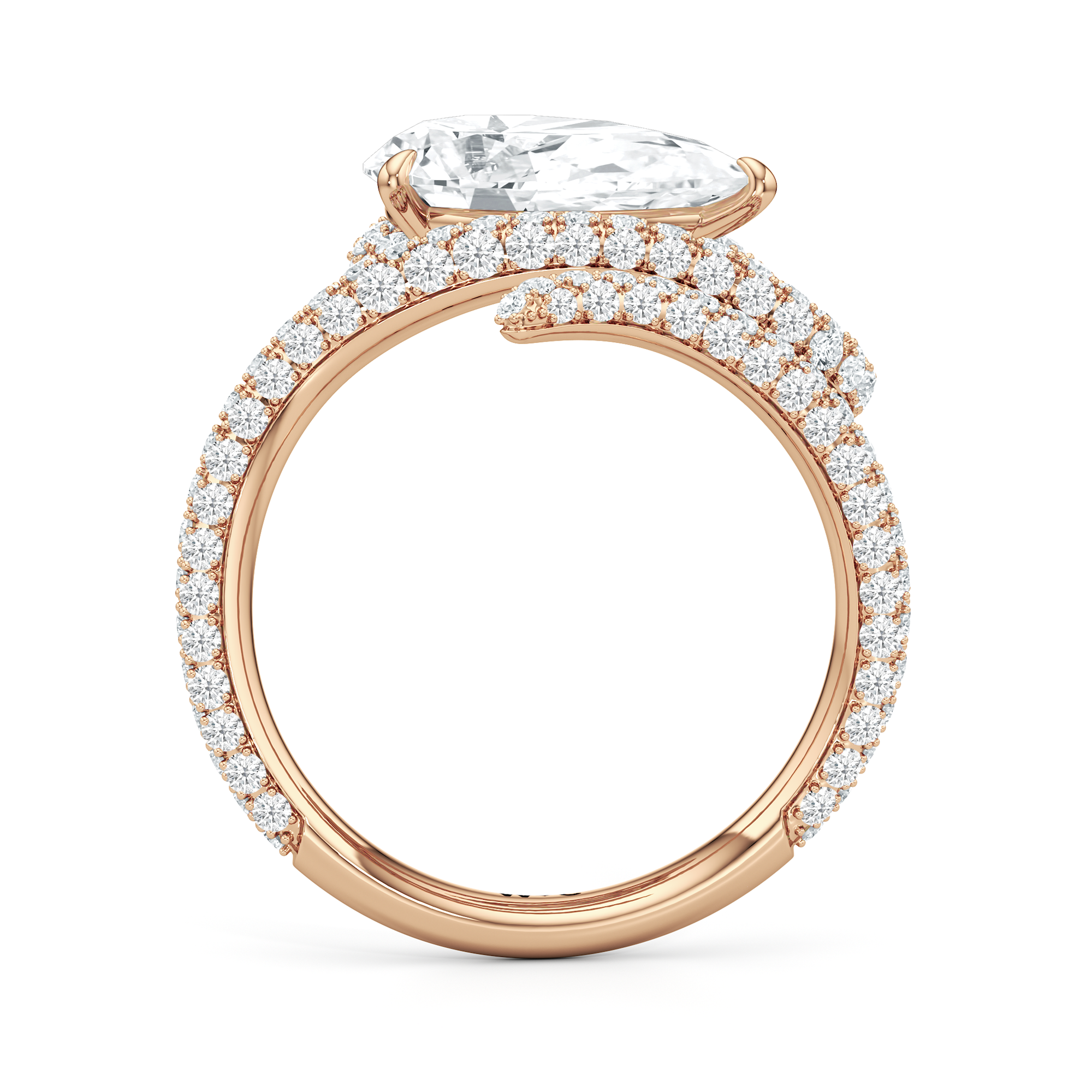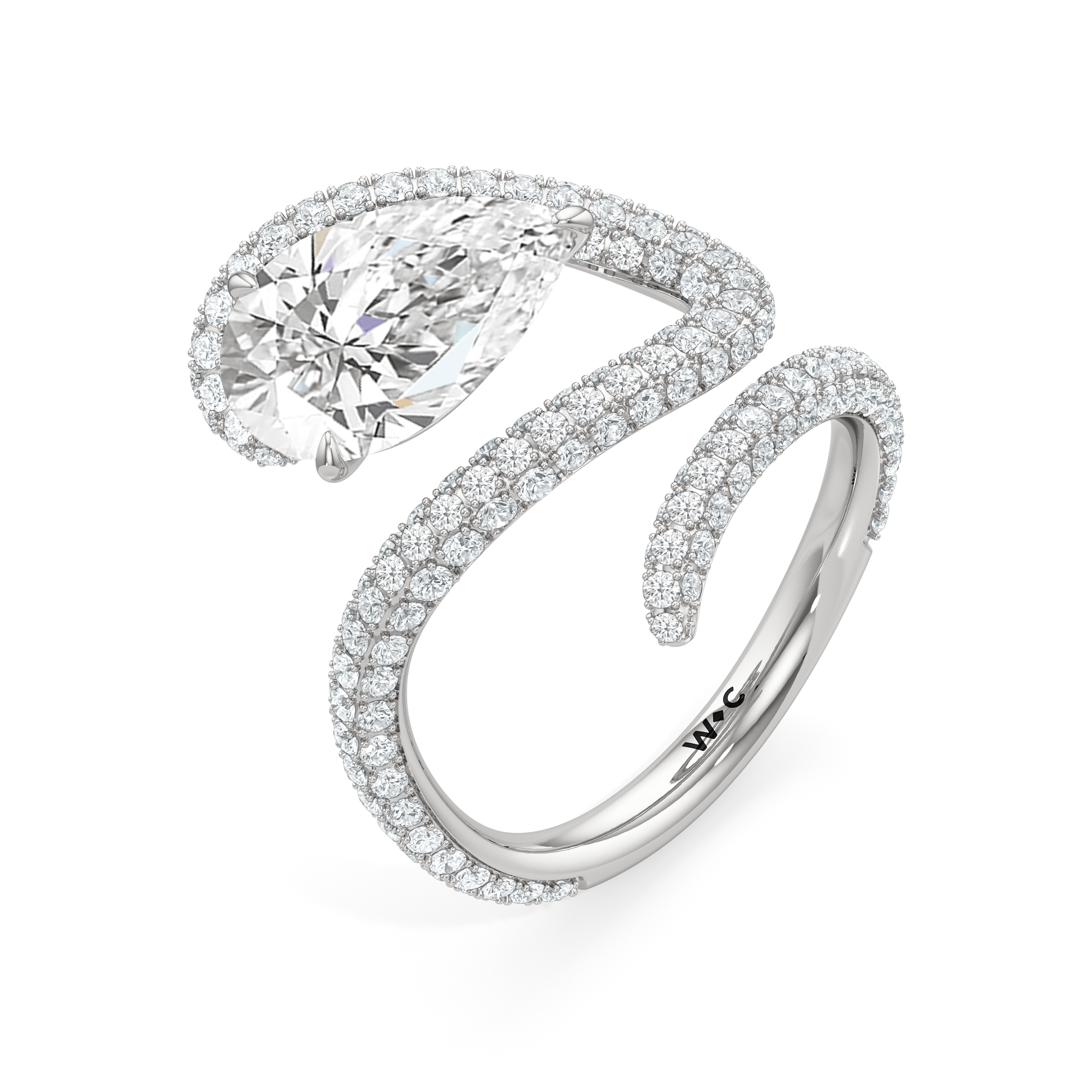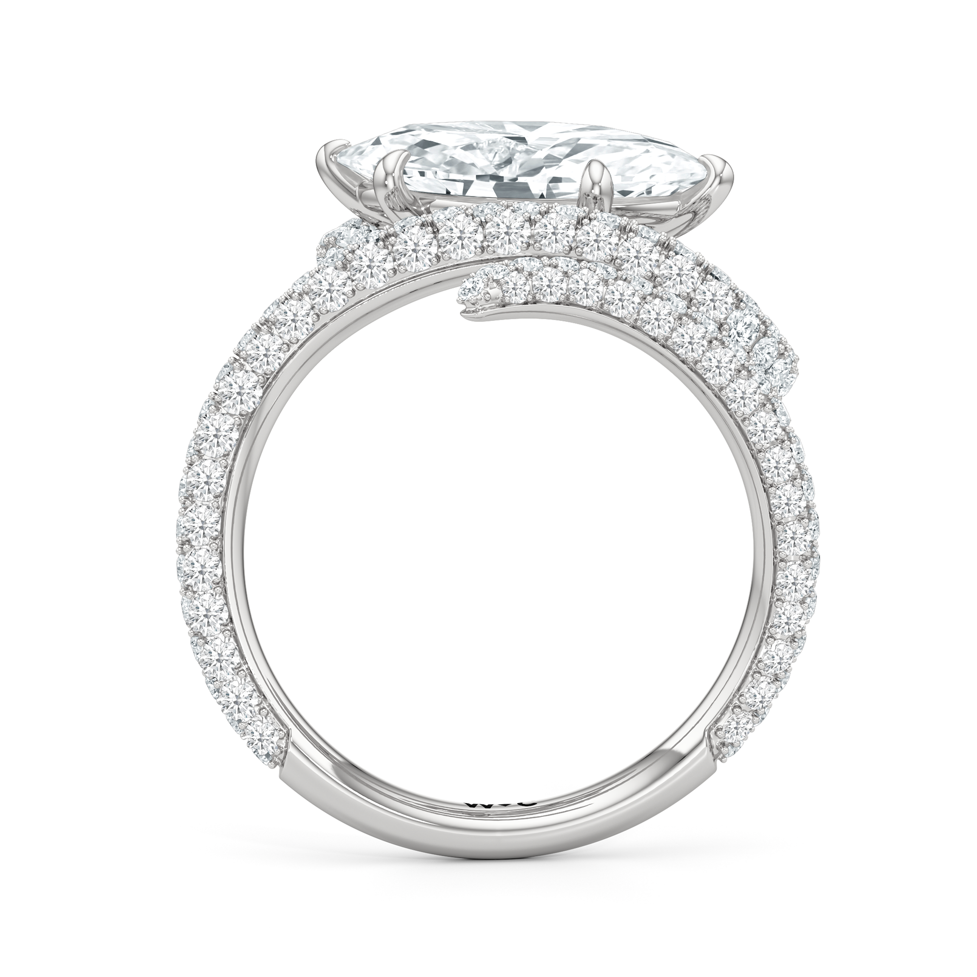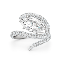 Clean lines meet graceful loops in this ring that feels both modern and grounded. A line of diamonds follows the band's swirling silhouette, drawing attention to the oval diamond center stone.