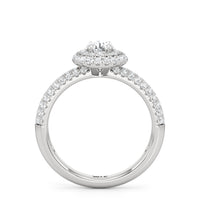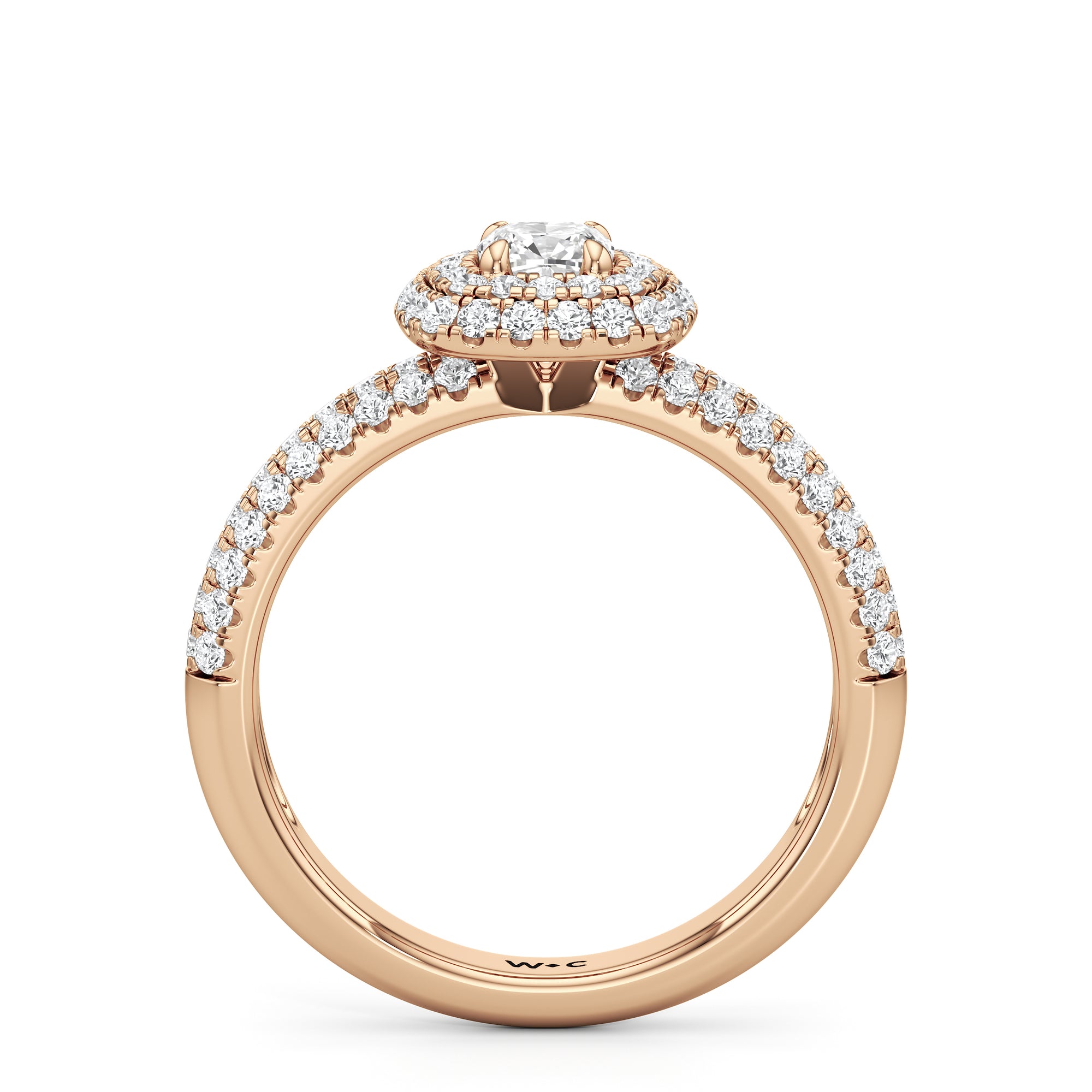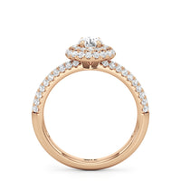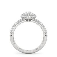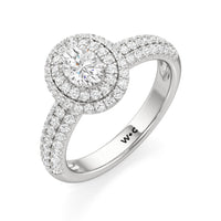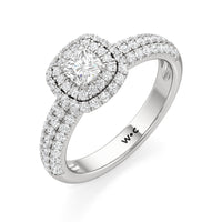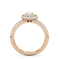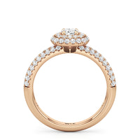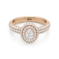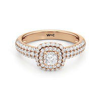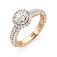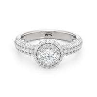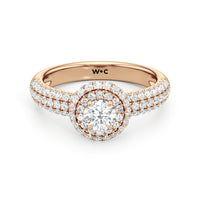 The Ainsley Engagement Ring is a show-stopper. It exudes vintage charm with its domed halo, where pavé-set petite diamonds "fall over the edge" of the hemispherical frame that embraces the diamond centre. The band also features three rows of pavé-set diamonds, ensuring a stunning display of brilliance.