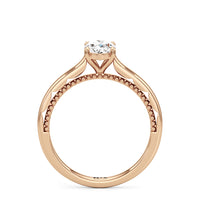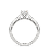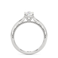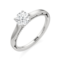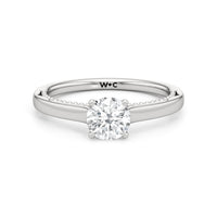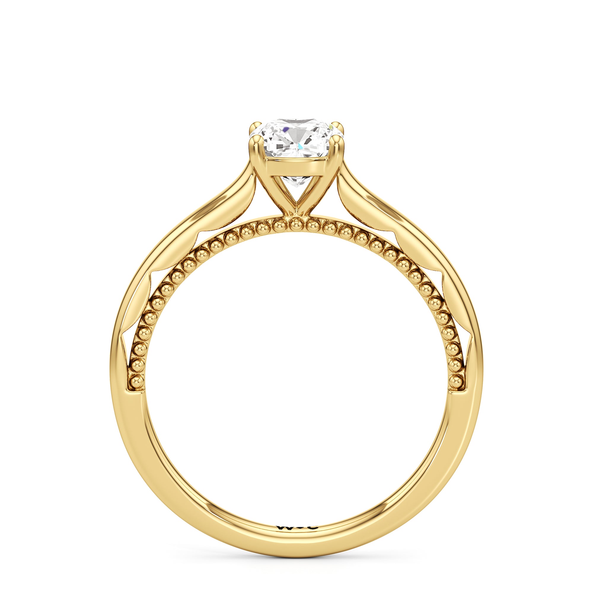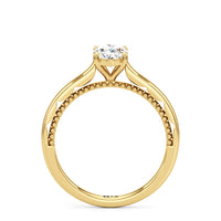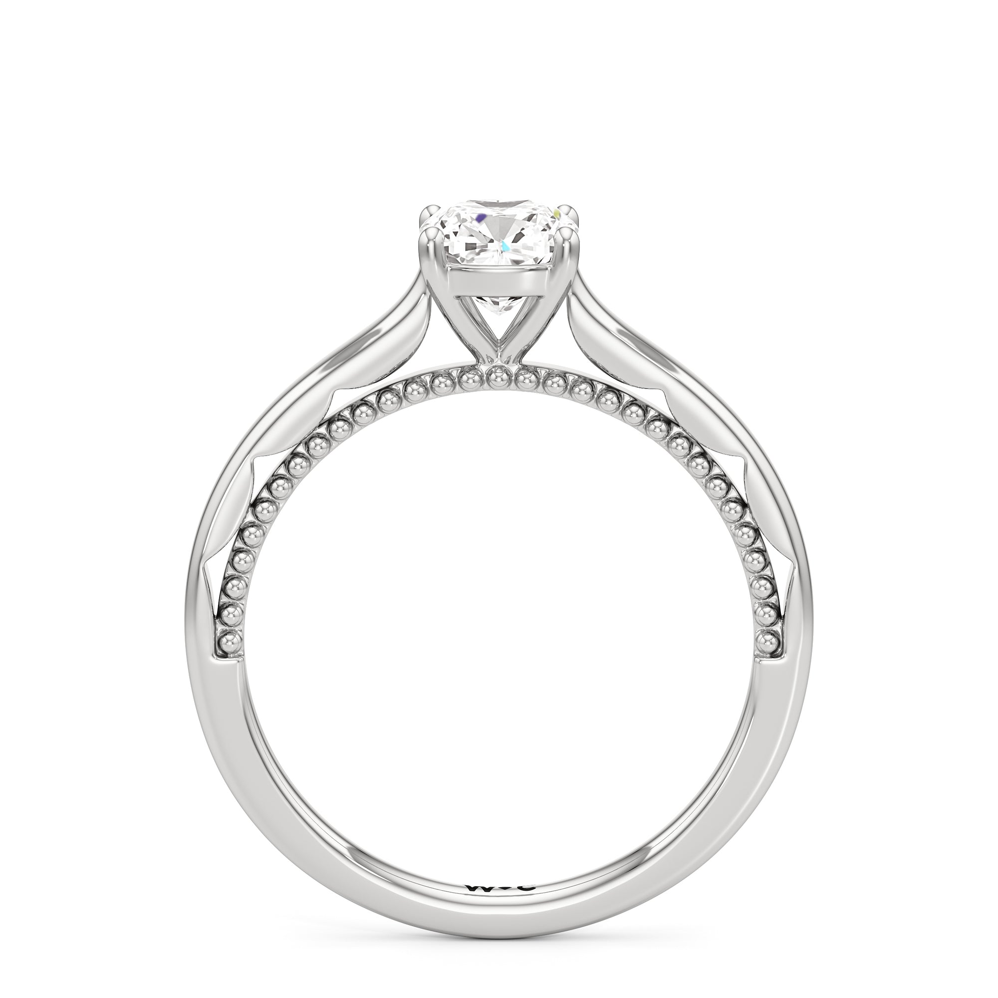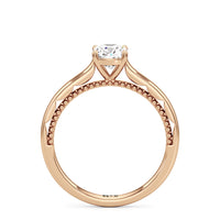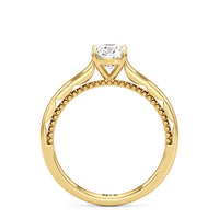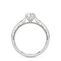 A vintage-inspired ring that will make her swoon. This artful engagement ring features a cathedral shank where the shoulders' inner surface is finished in a scalloped style. This distinctive design element is complemented by metal beads or milgrain detailing on the ring's bridge. The ring is topped with a diamond centre stone held securely by four prongs.