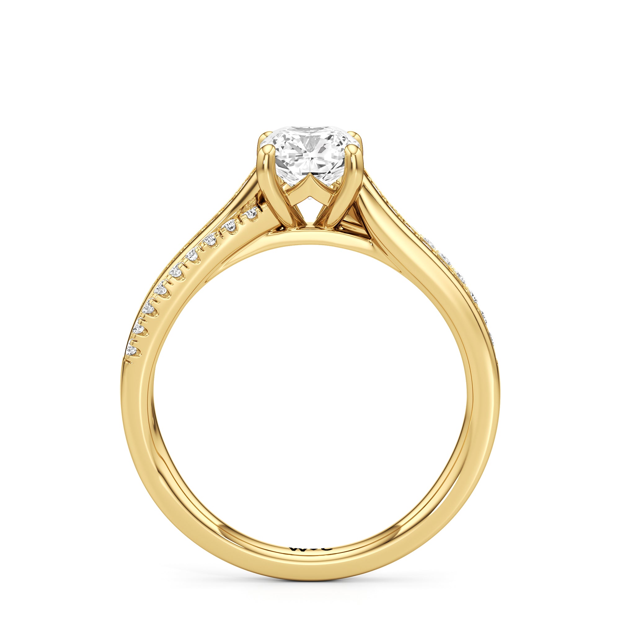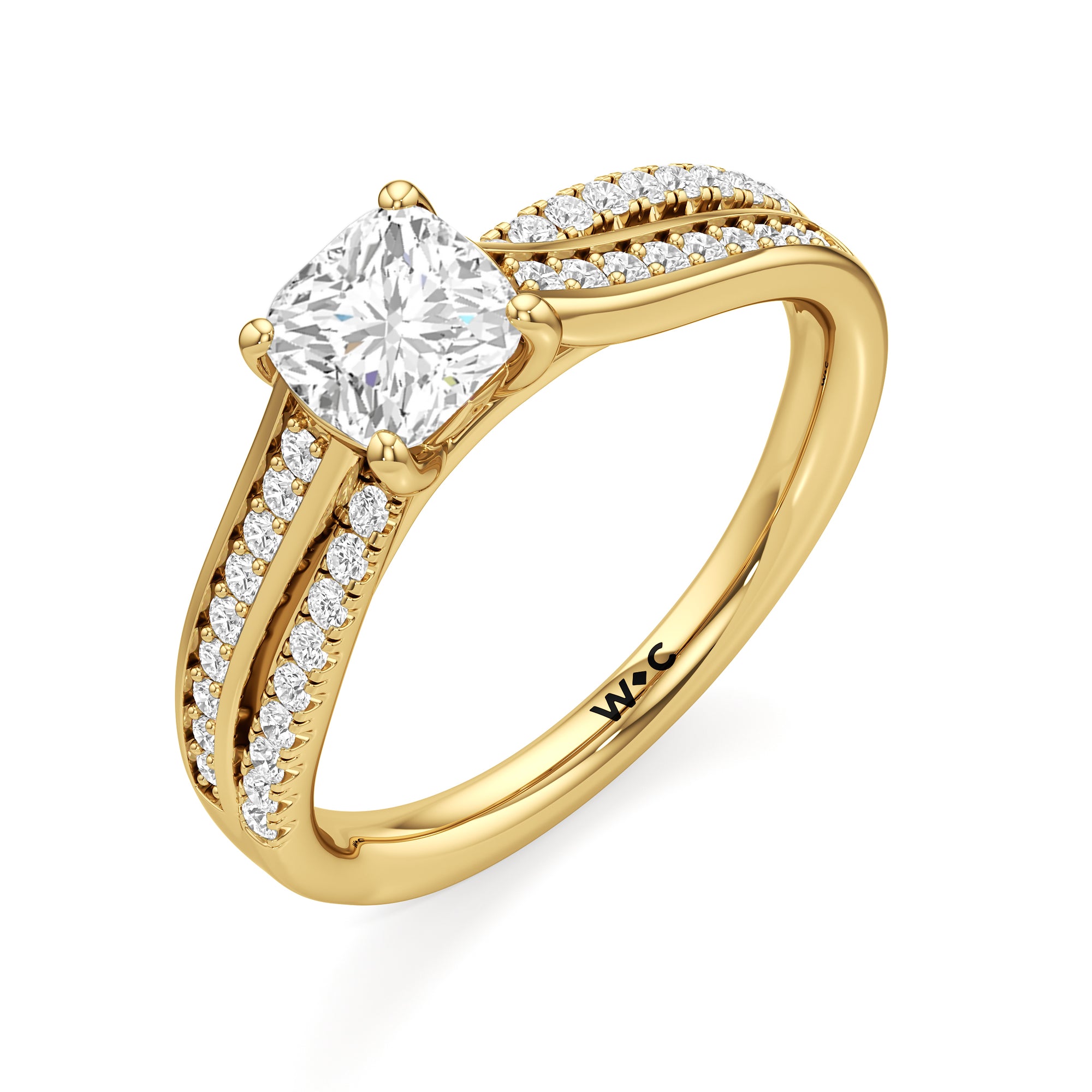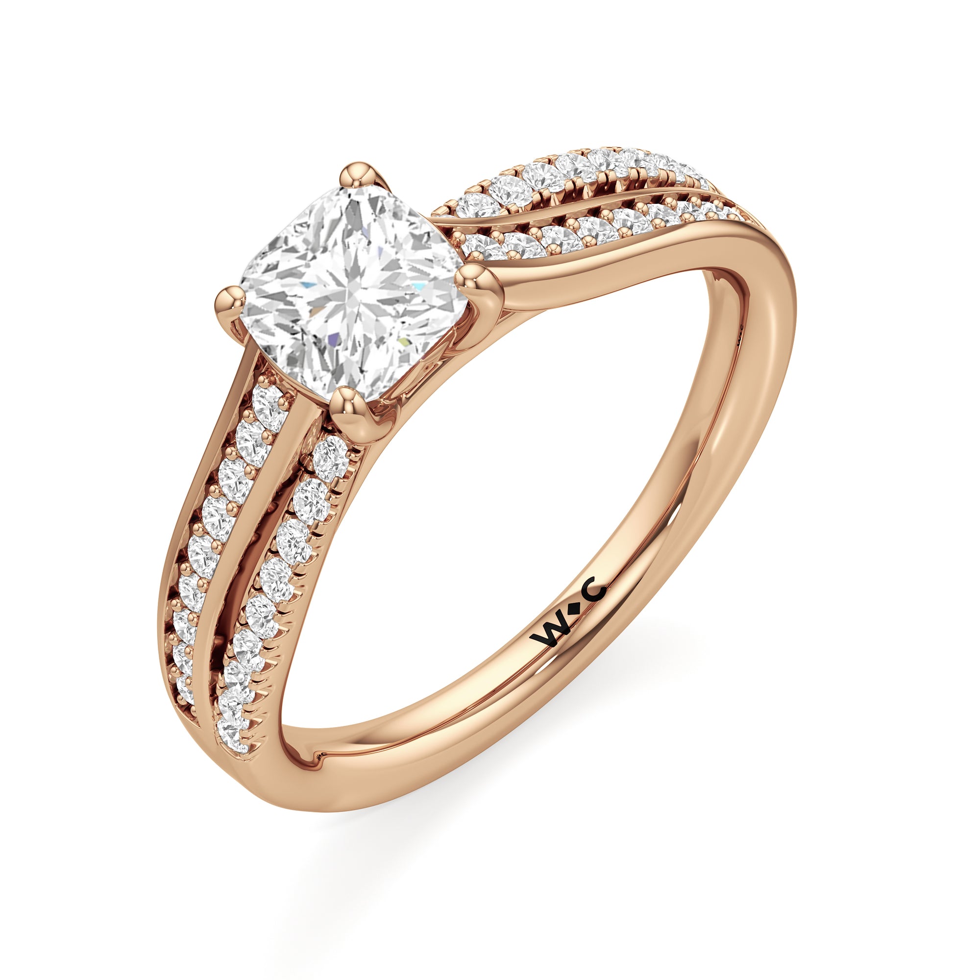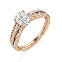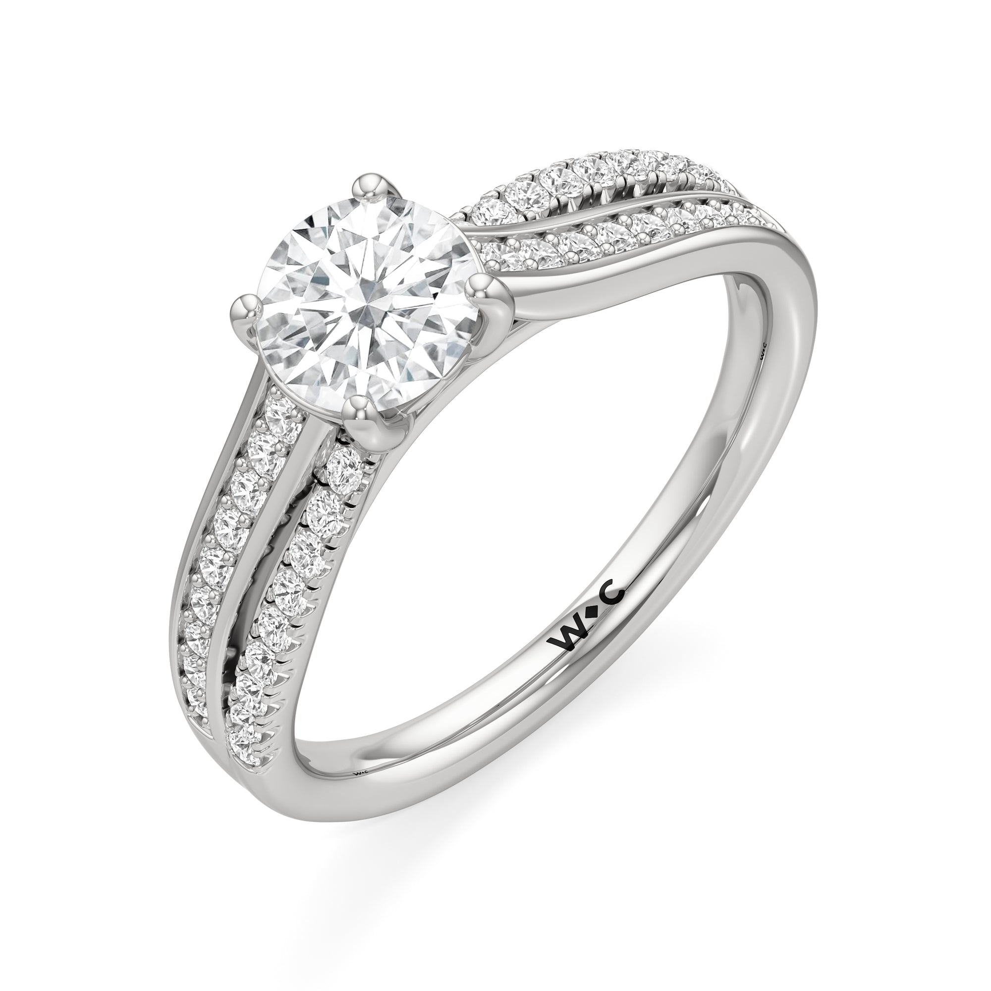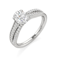 The ring features a polished band with split shoulders that cross over, evoking how two souls intertwine and create a strong bond. One of the split bands is lined with round diamonds on micro prongs, and the other has round diamonds in a pavé setting.
