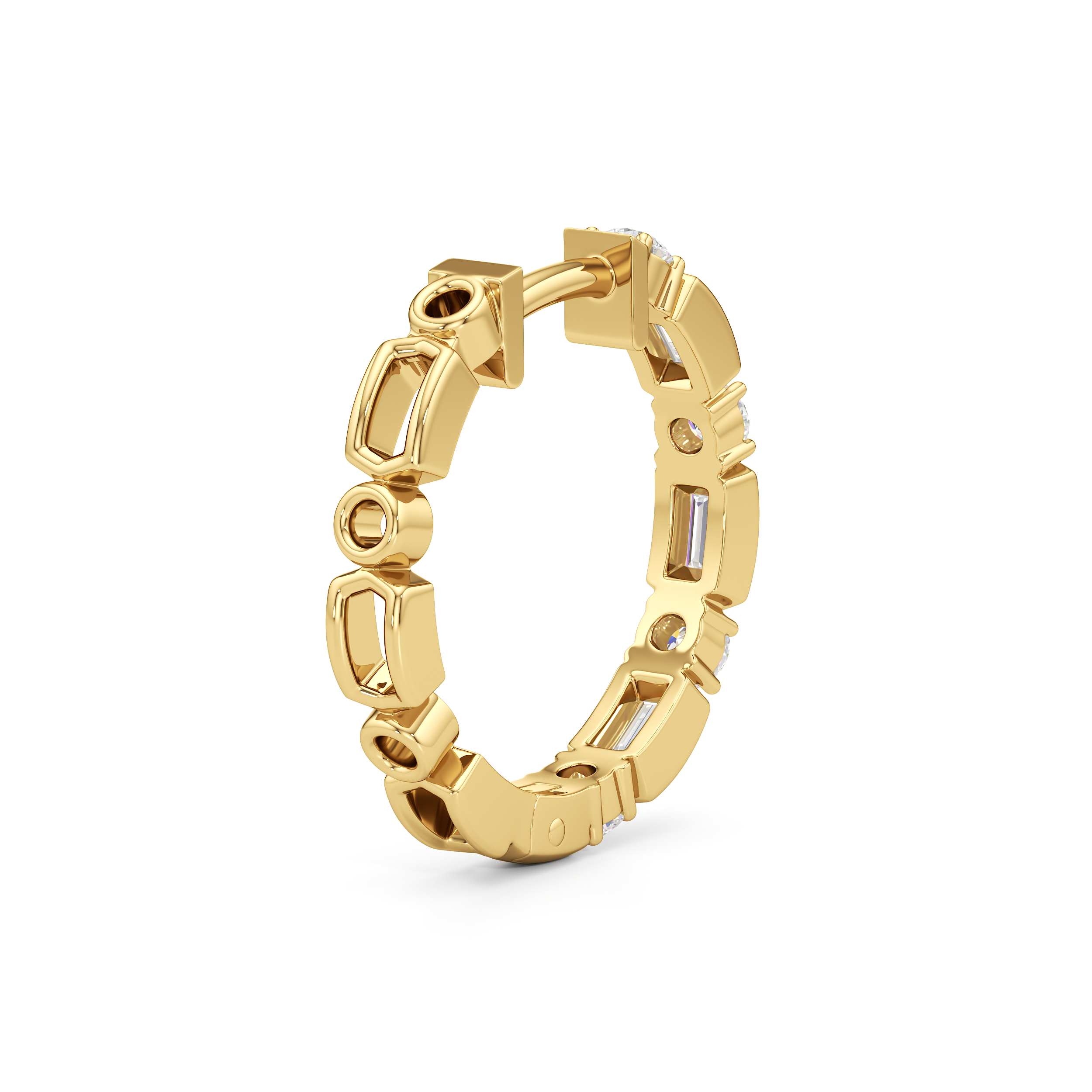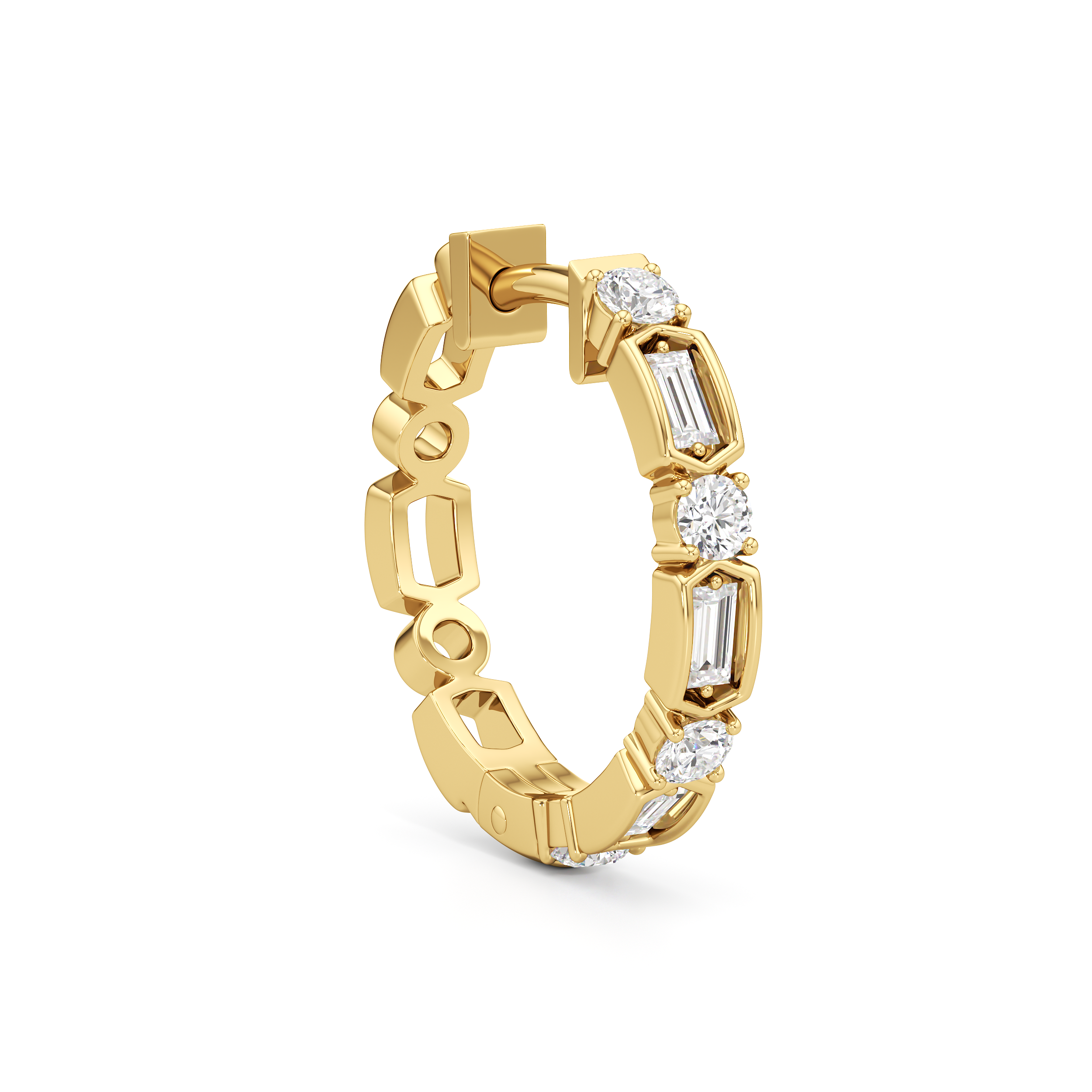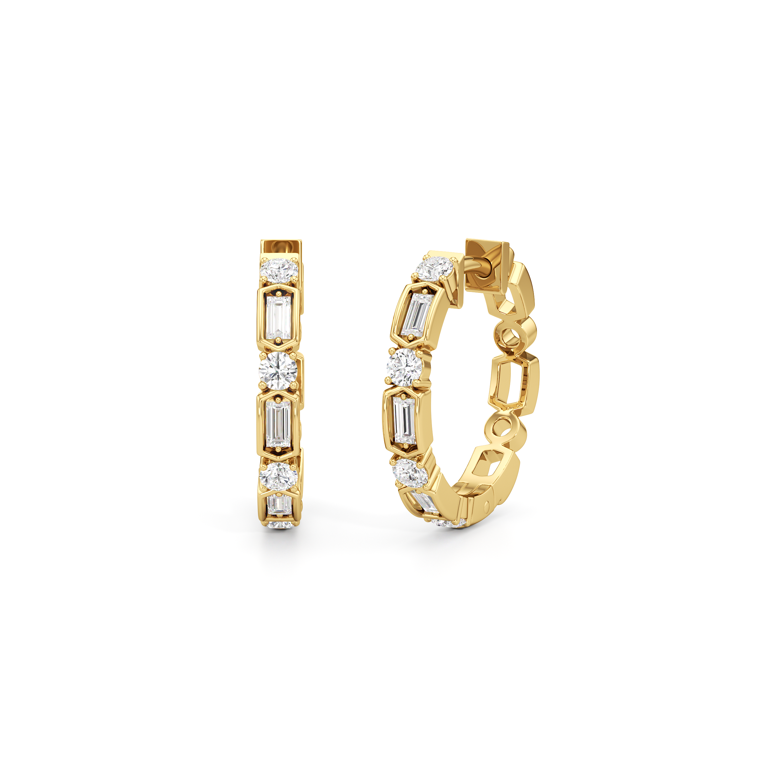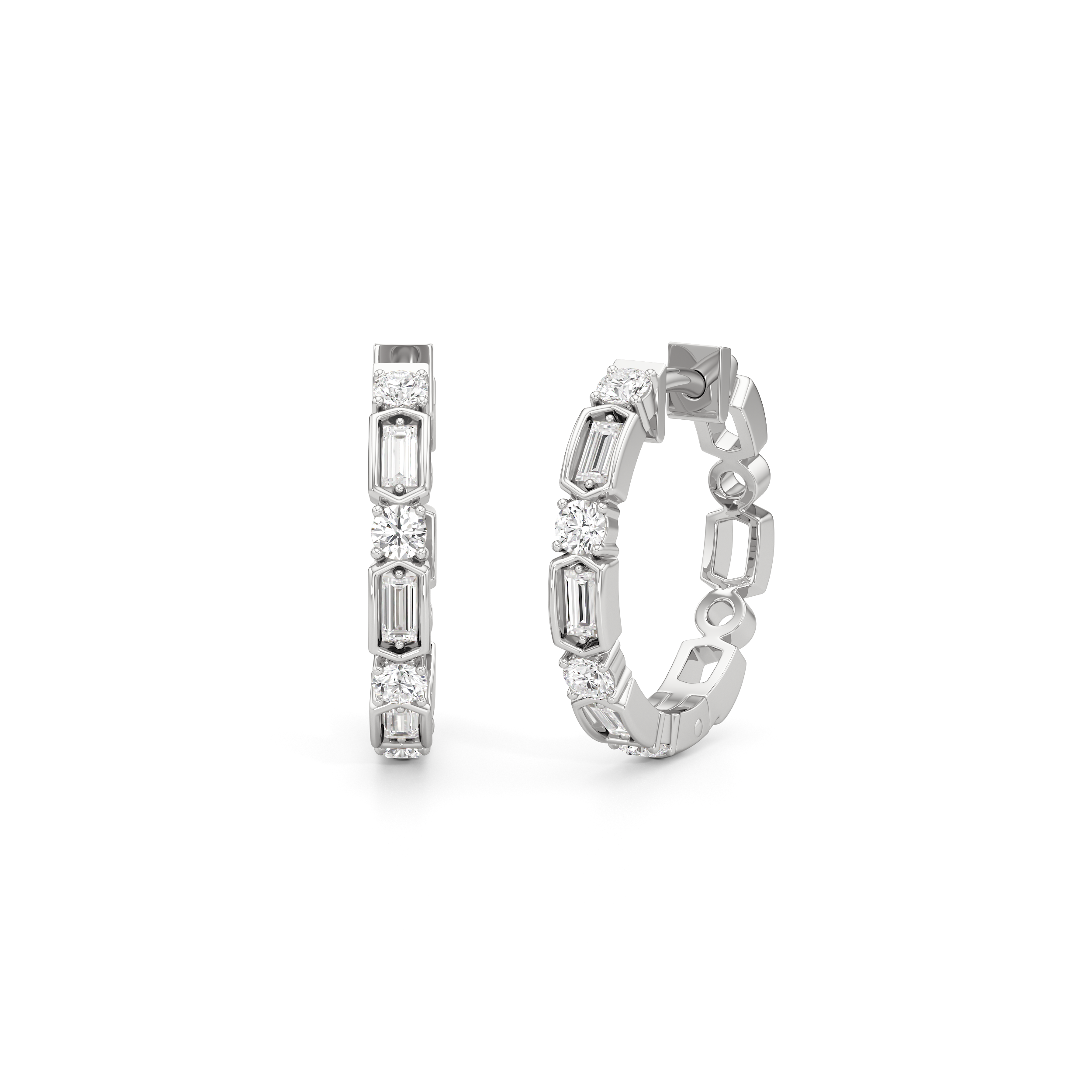 These are the hoops that will get you hooked. They feature a row of alternating round and baguette diamonds, with each step-cut stone secured by double prongs and set on a six-sided bezel. This pair is ready to update any look.