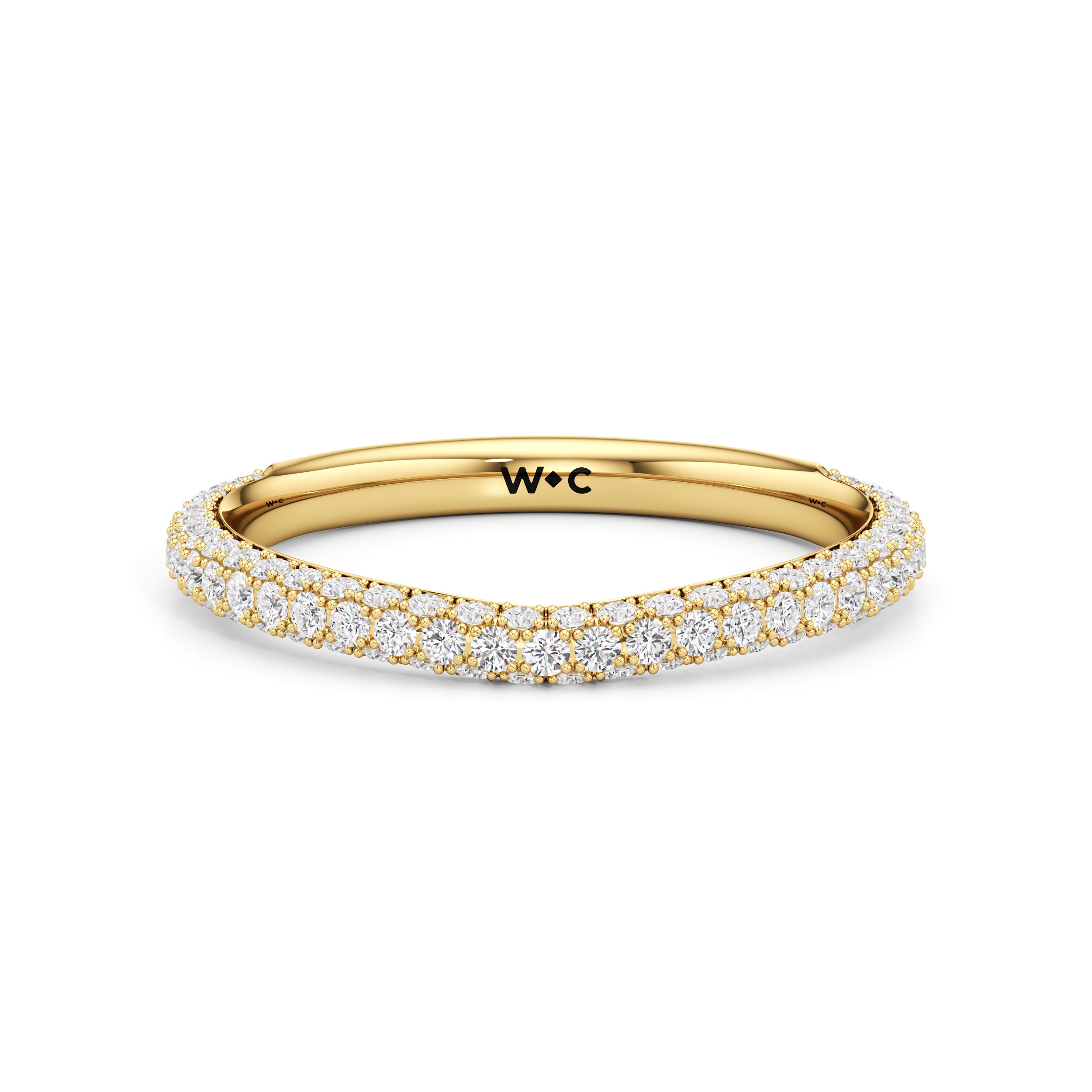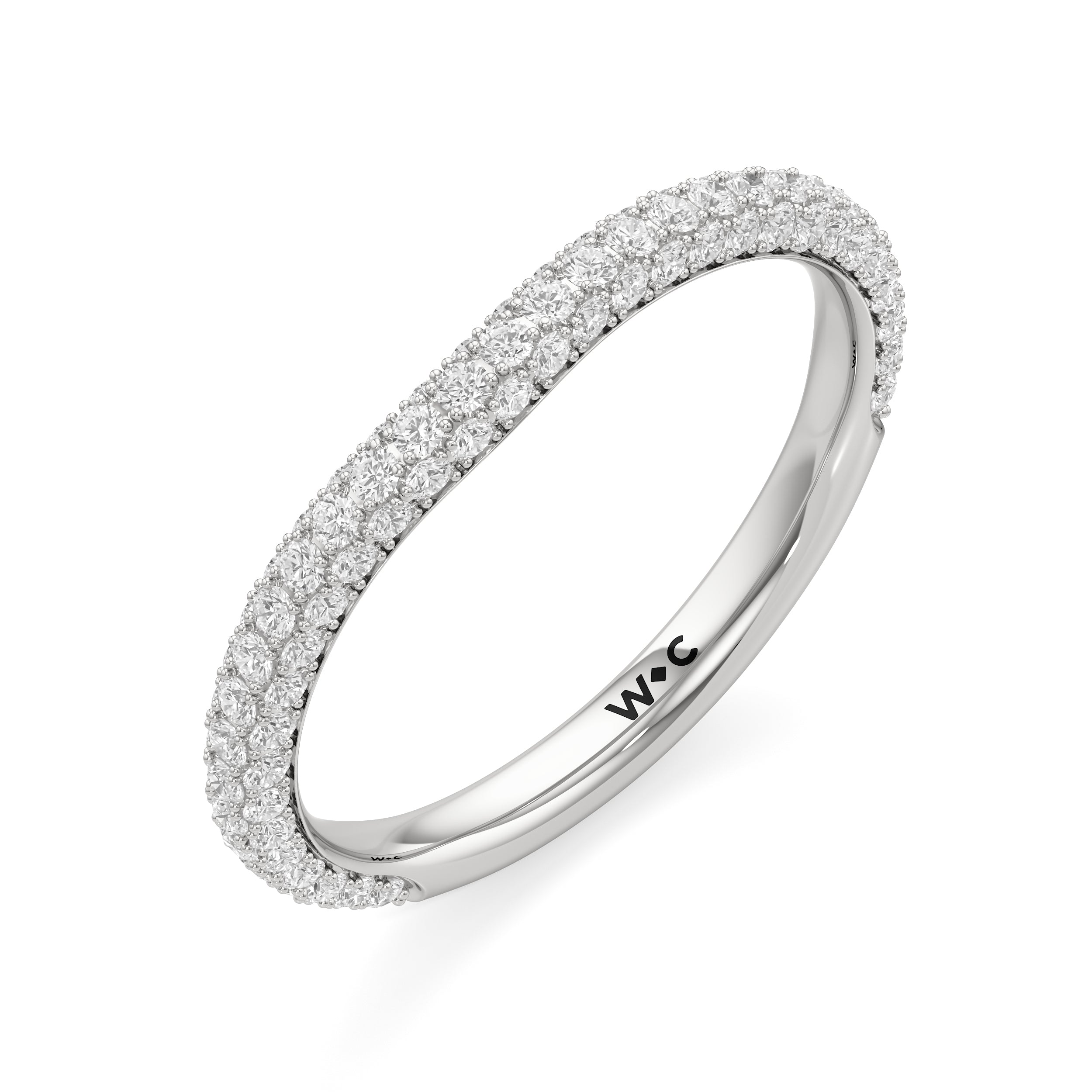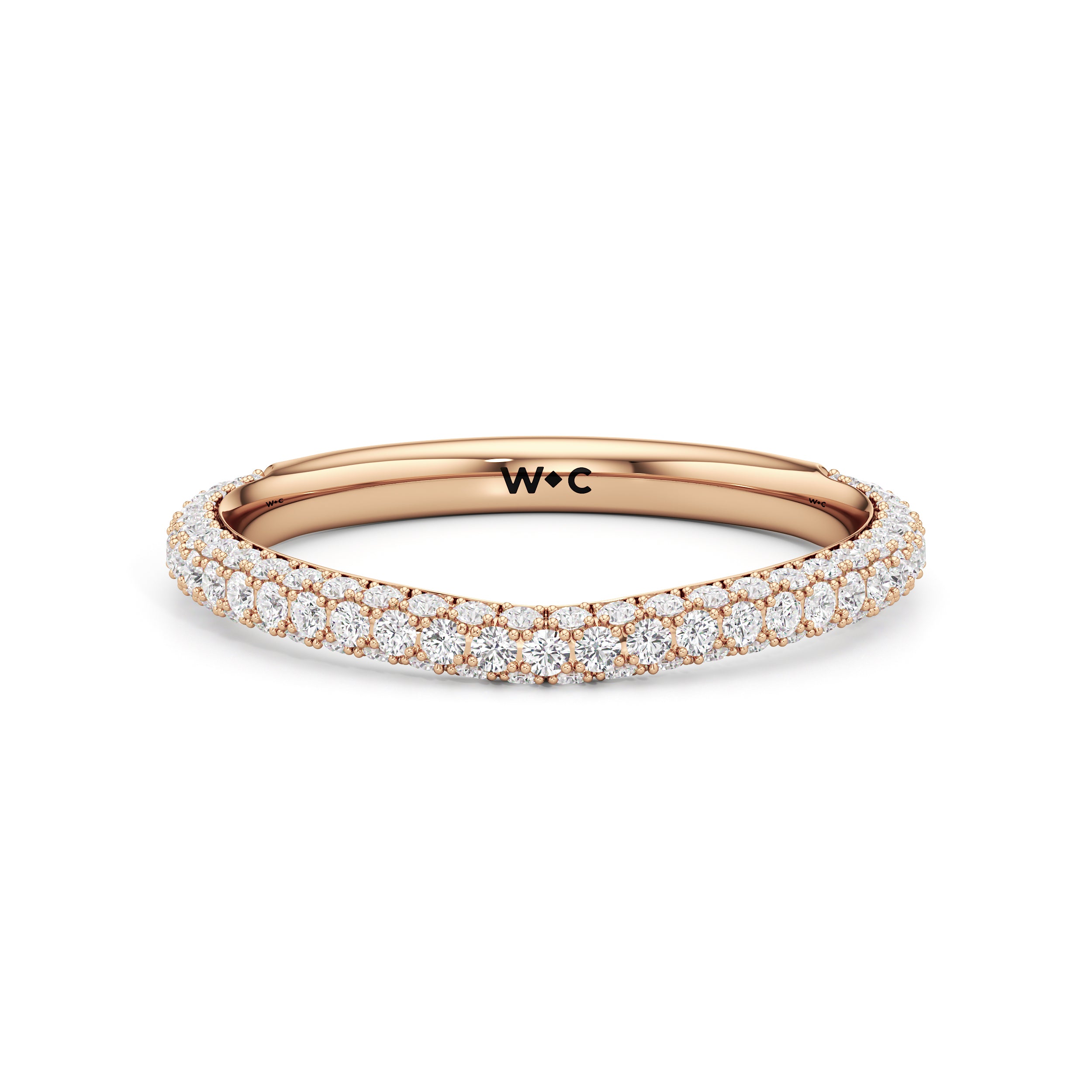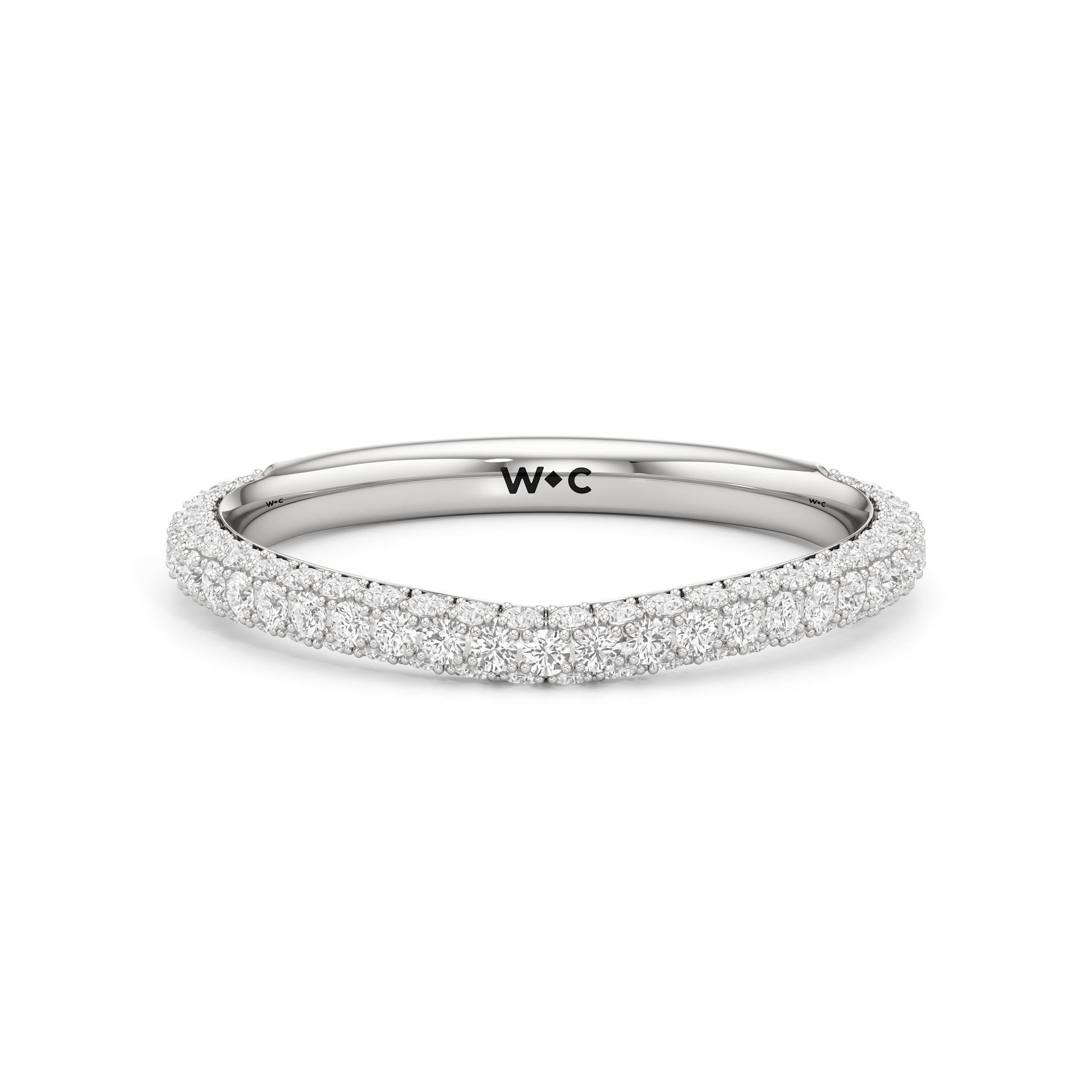 This curved diamond set wedding band is perfectly contoured to complement our the amelia three stone engagement ring for a simple and sophisticated look.