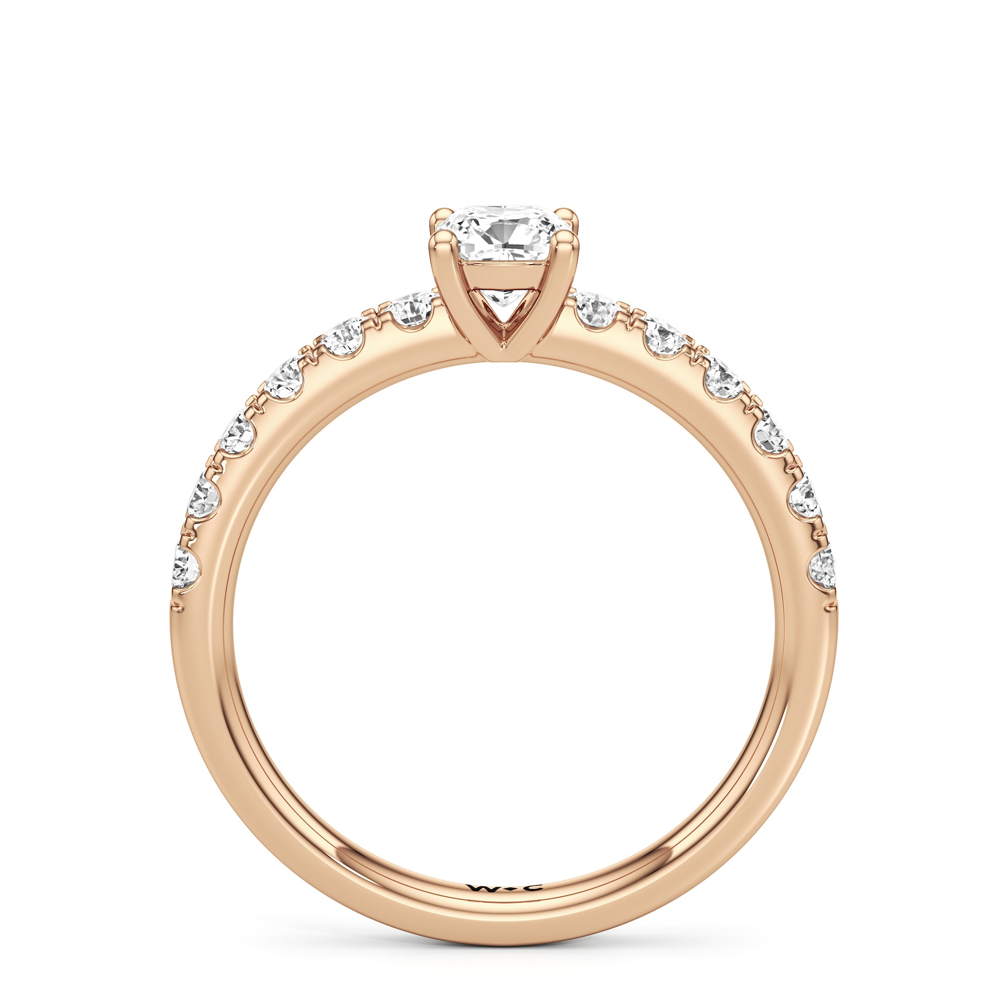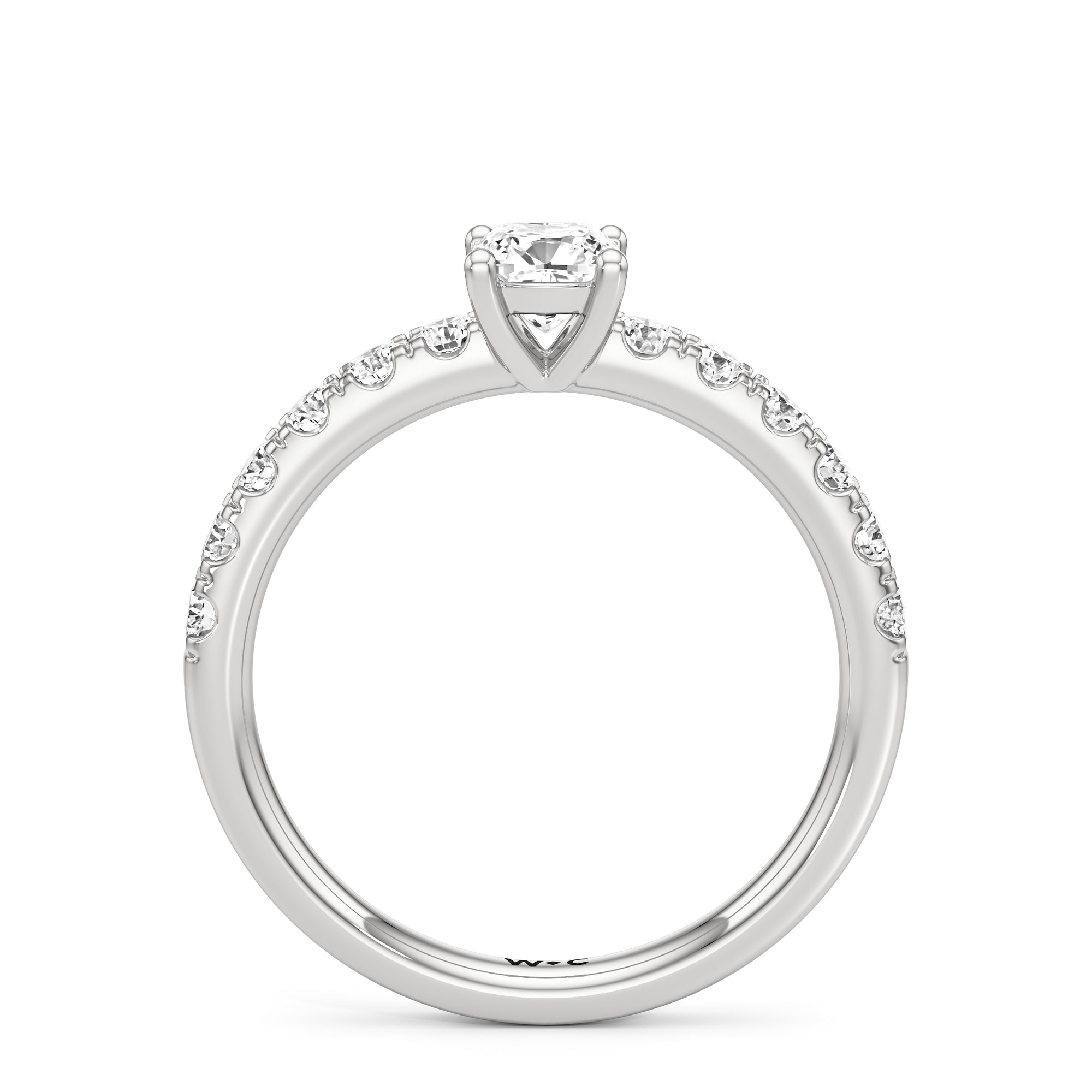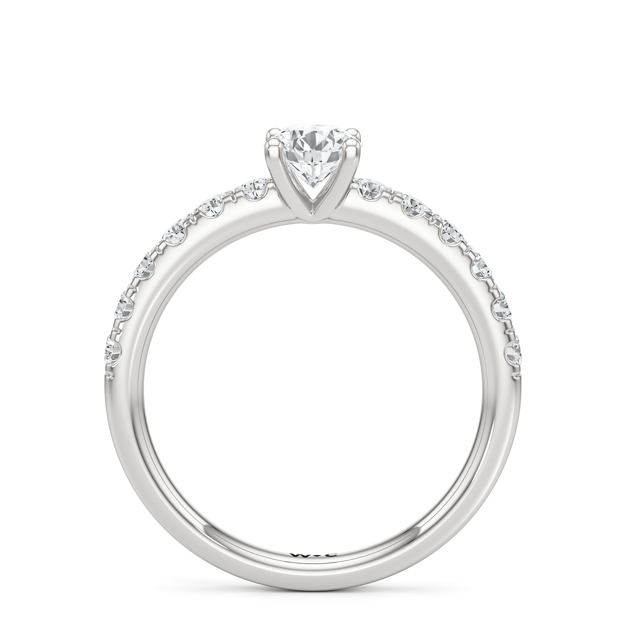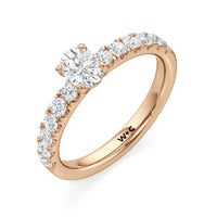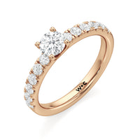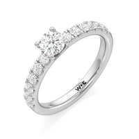 The top half of the band's circumference features a line of round diamonds in U-cut pave setting. They lead to a centre diamond nestled on a four-prong setting. When viewed from the side, the ring displays a scalloped profile that exudes elegance and romance.