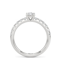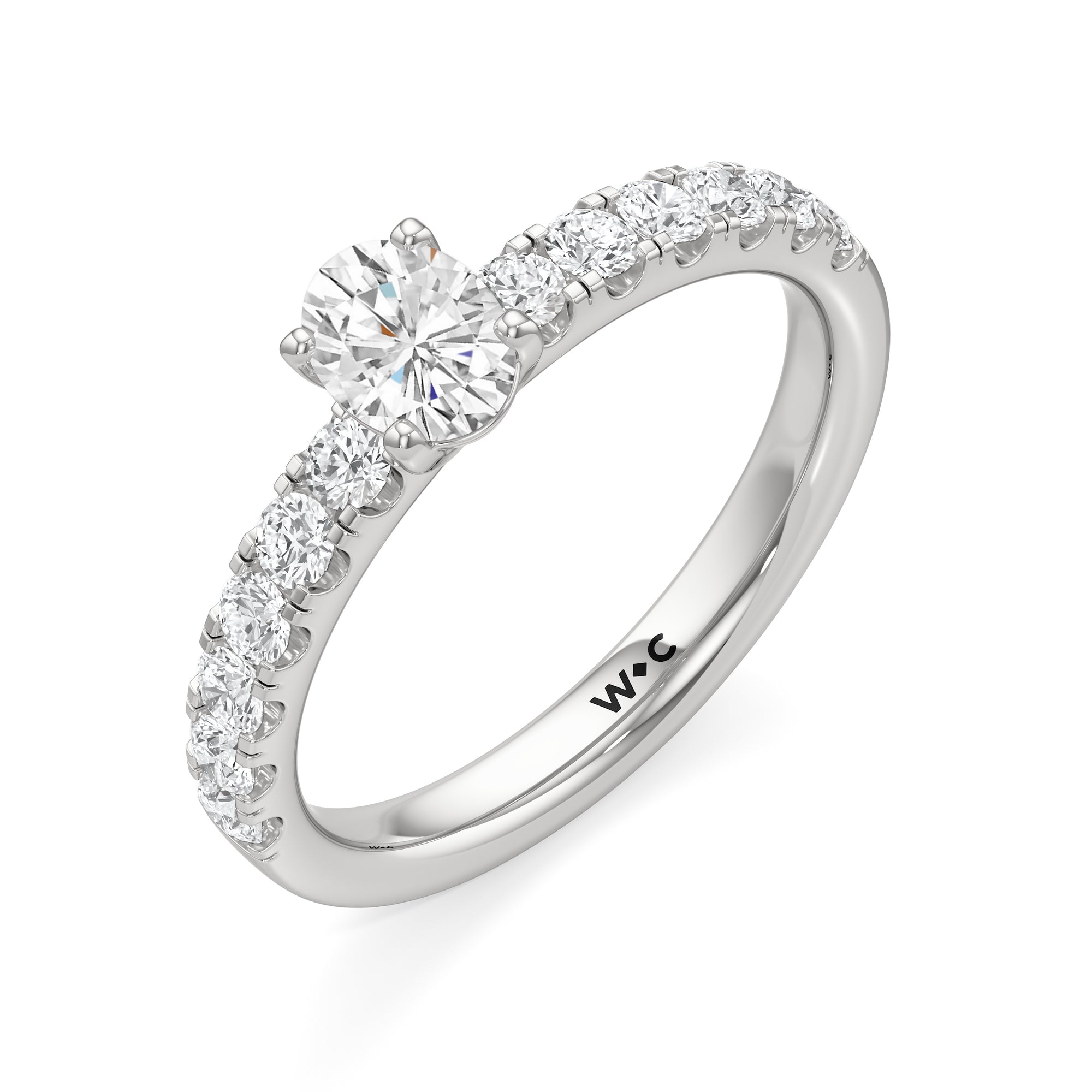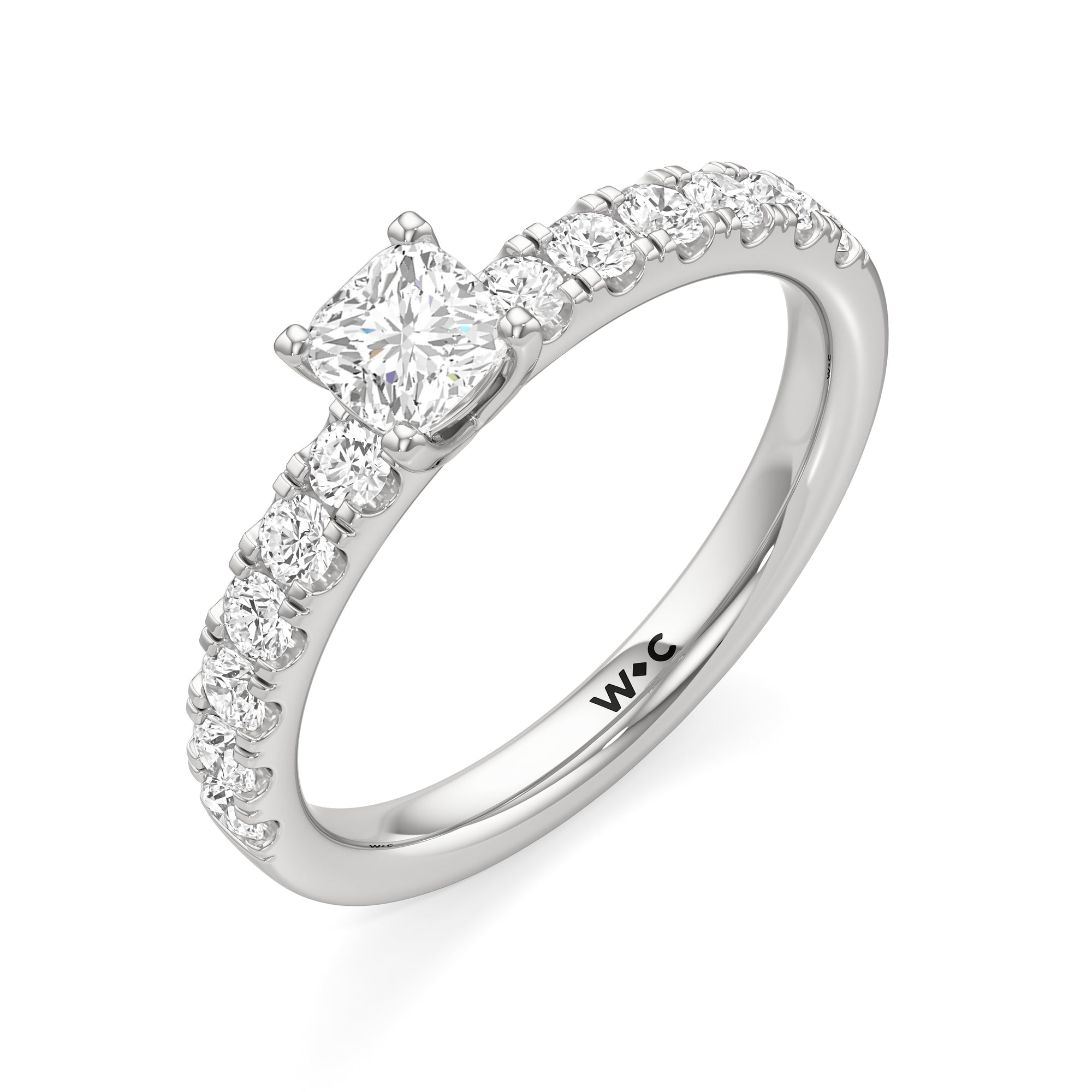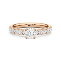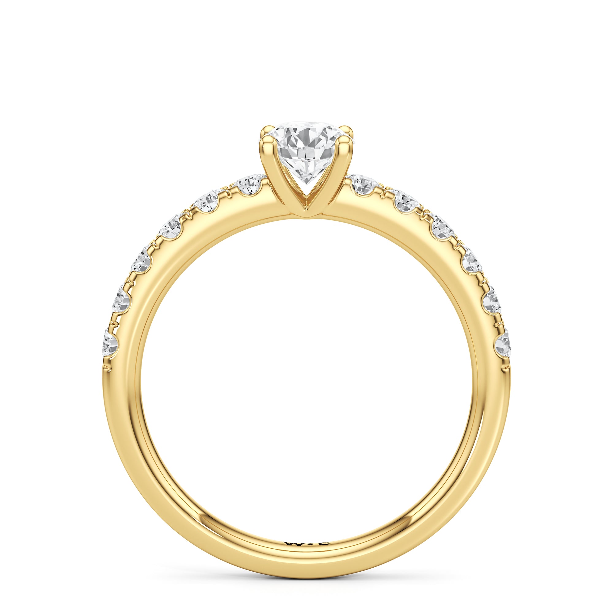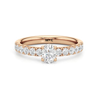 The top half of the band's circumference features a line of round diamonds in U-cut pave setting. They lead to a centre diamond nestled on a four-prong setting. When viewed from the side, the ring displays a scalloped profile that exudes elegance and romance.
