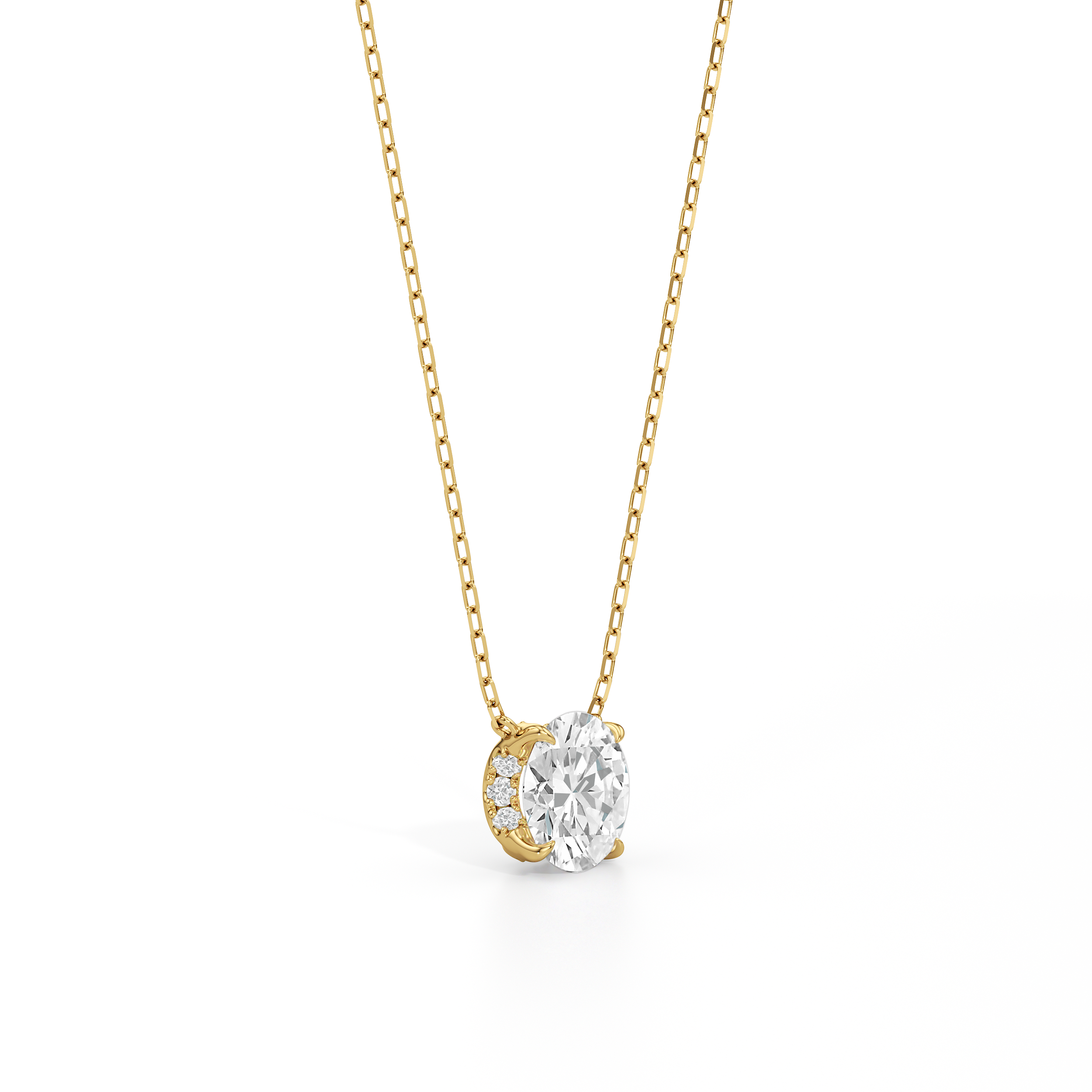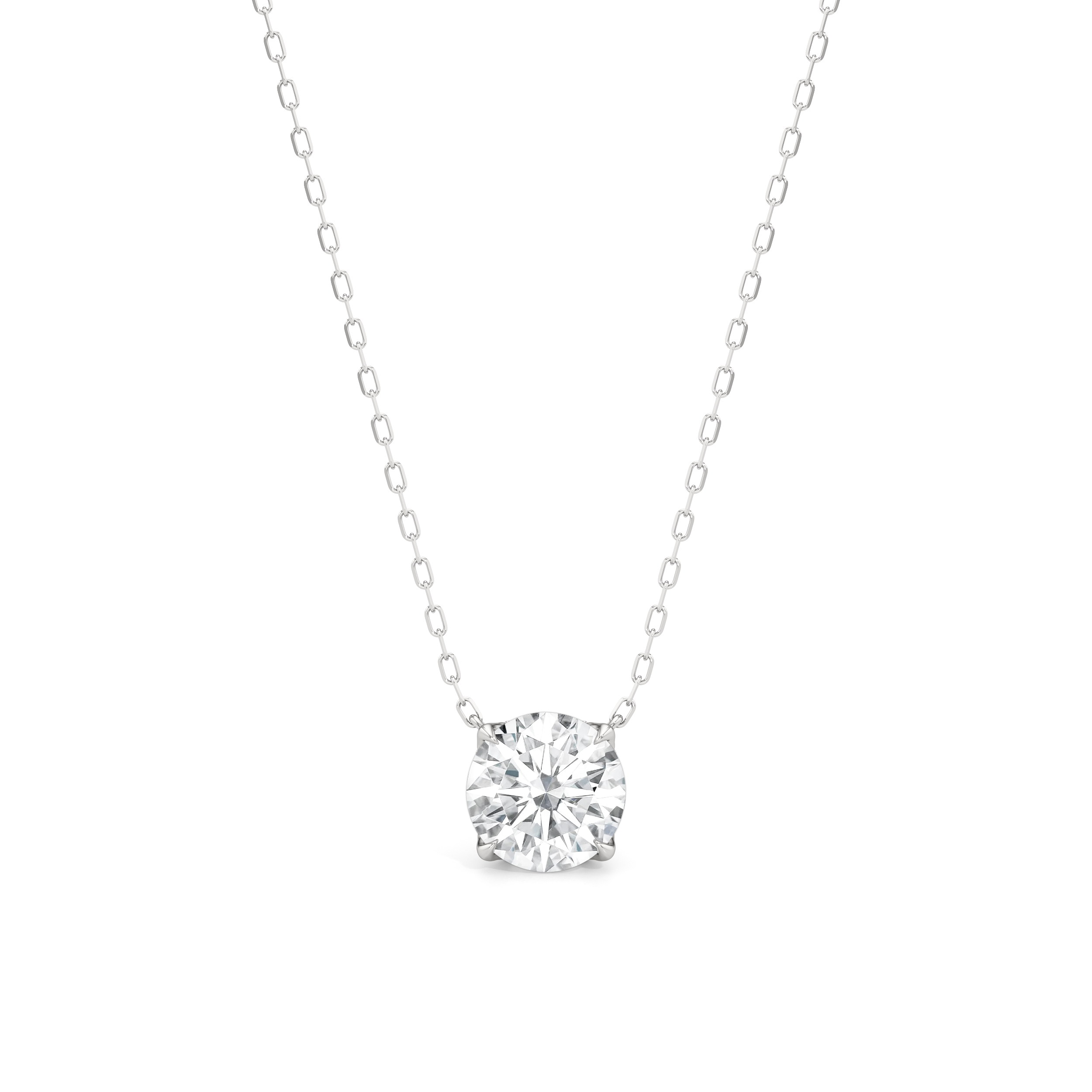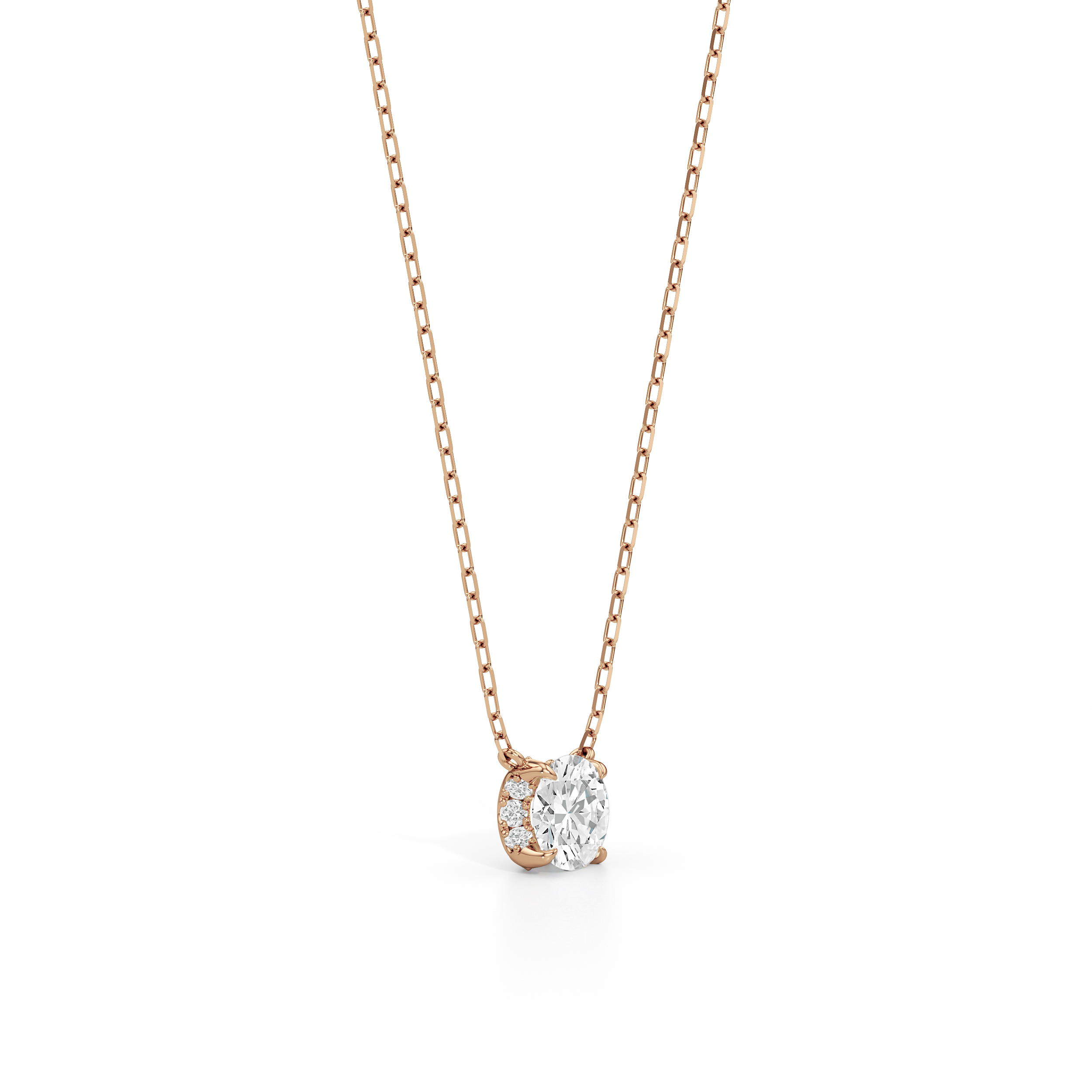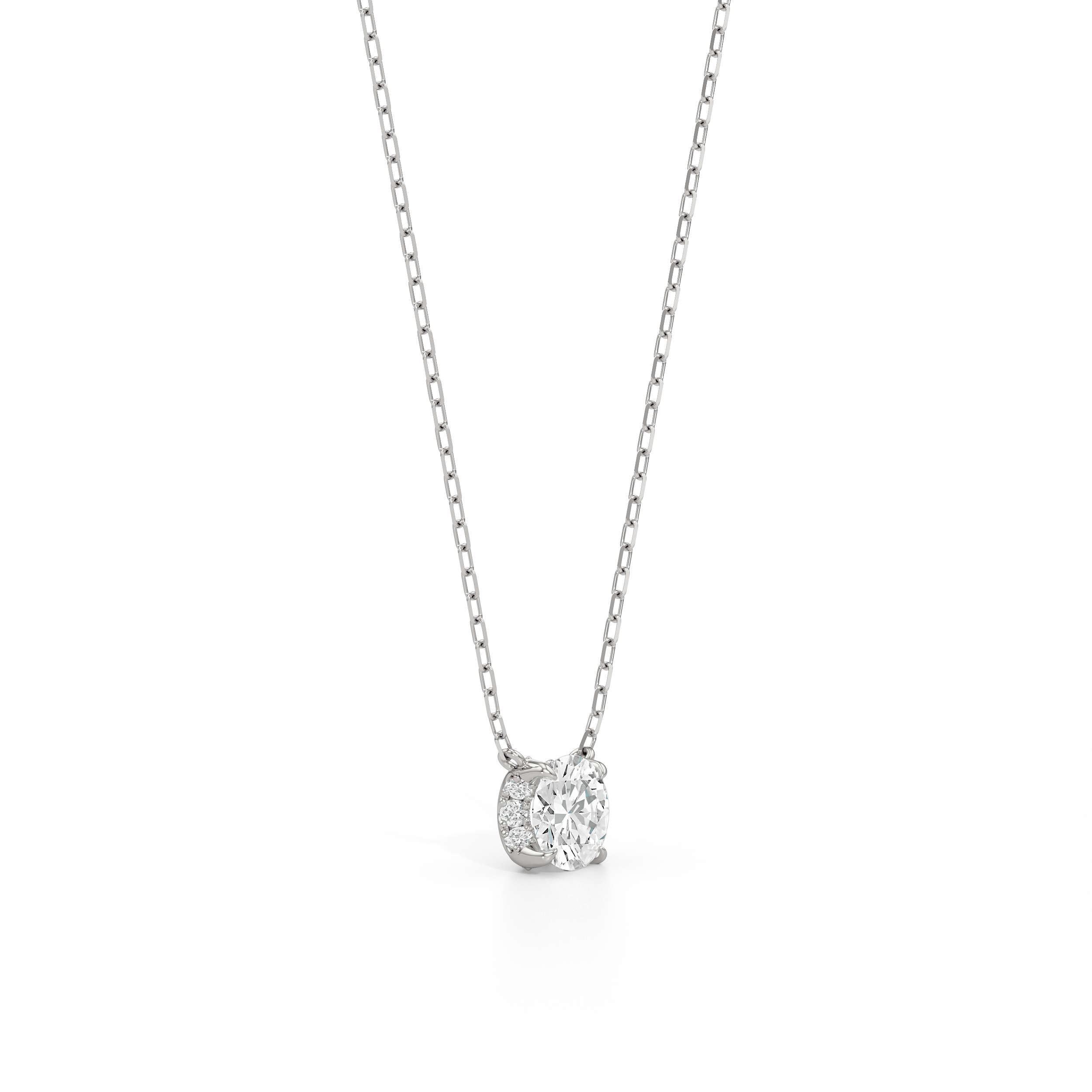 The Atrium Round Solitaire Pendant boasts a diamond-studded U-shaped setting that redefines how a diamond should shine. This necklace holds a diamond solitaire pendant secured by four claw prongs and cradled by a U-shaped frame. Additional diamonds punctuate the curved base of the setting, maximizing brilliance.