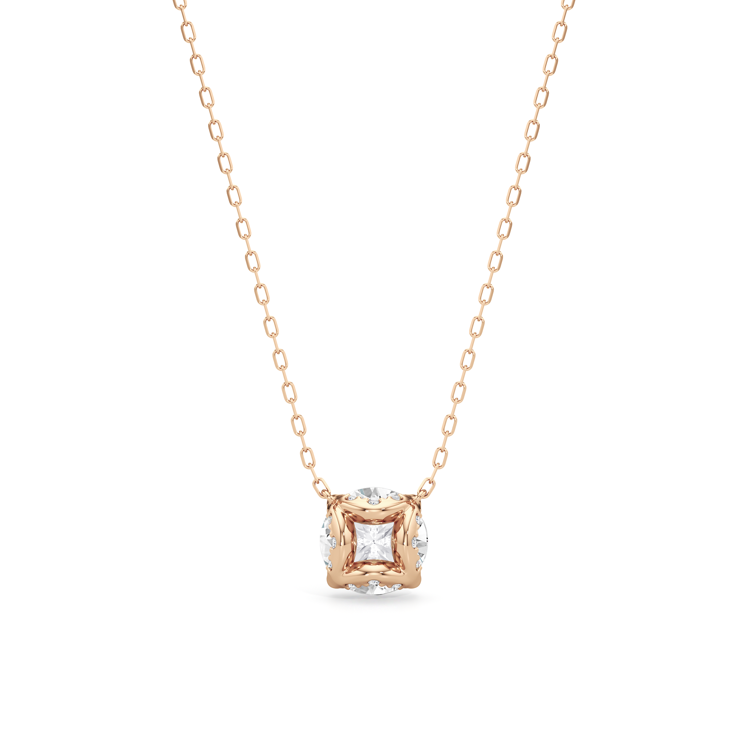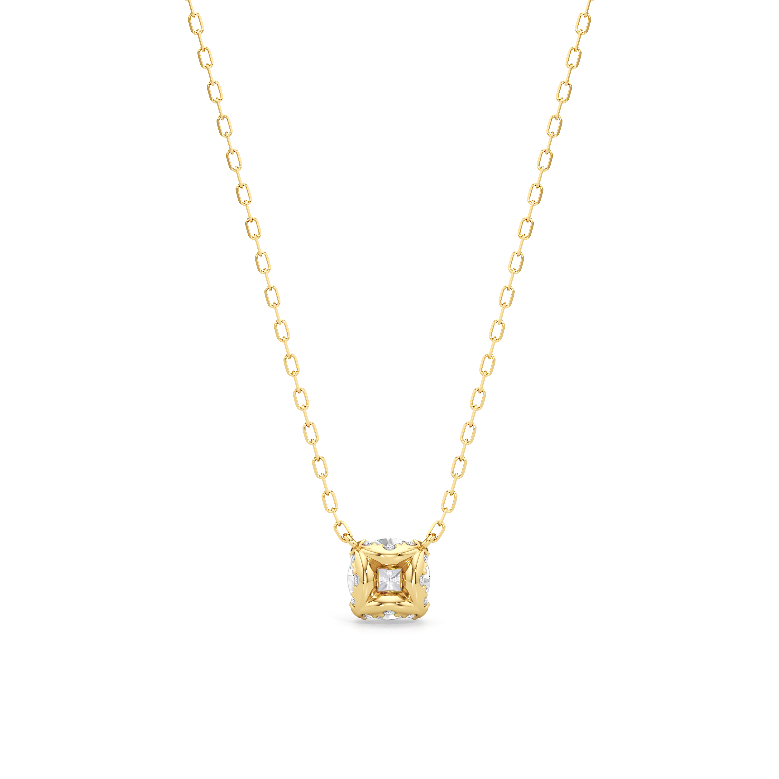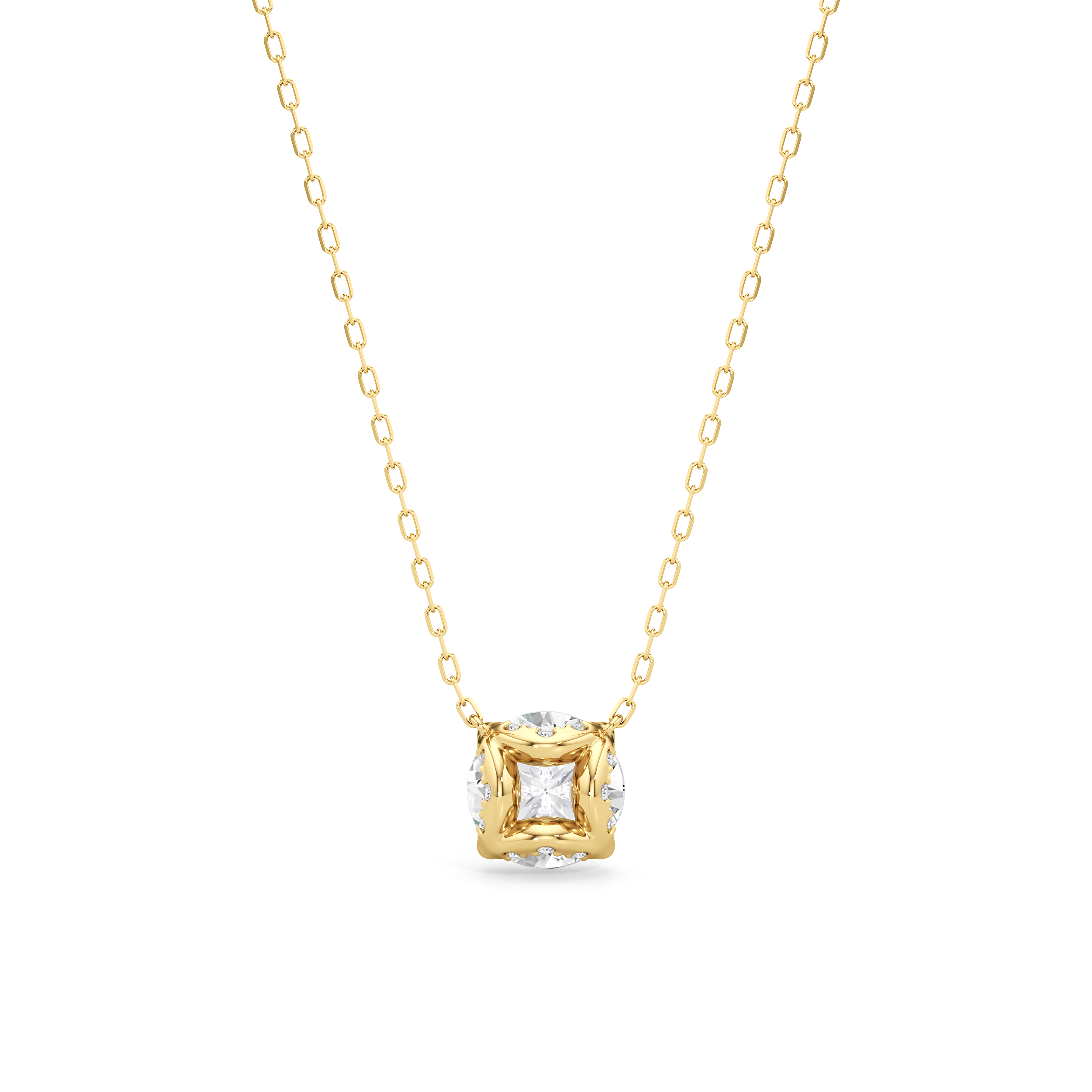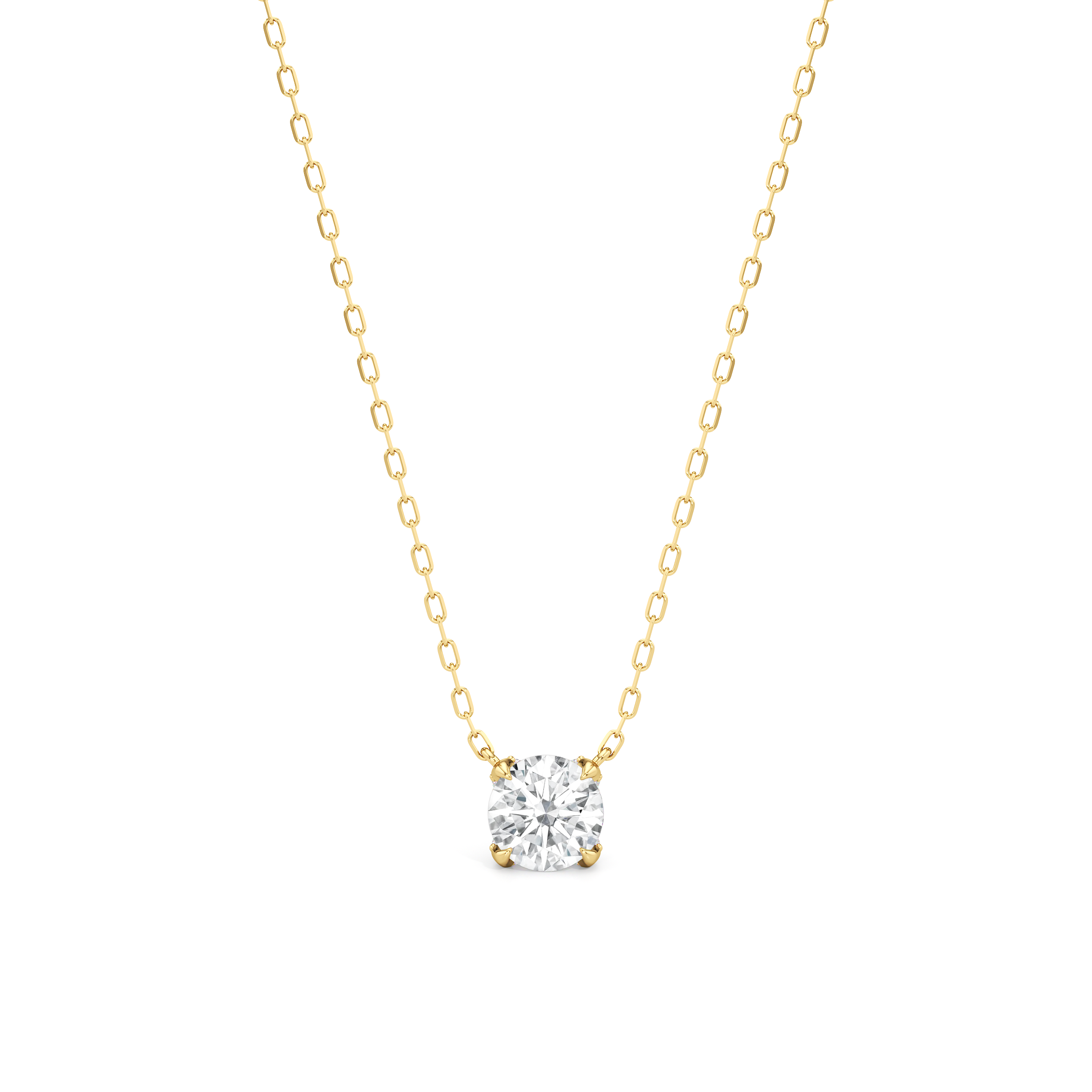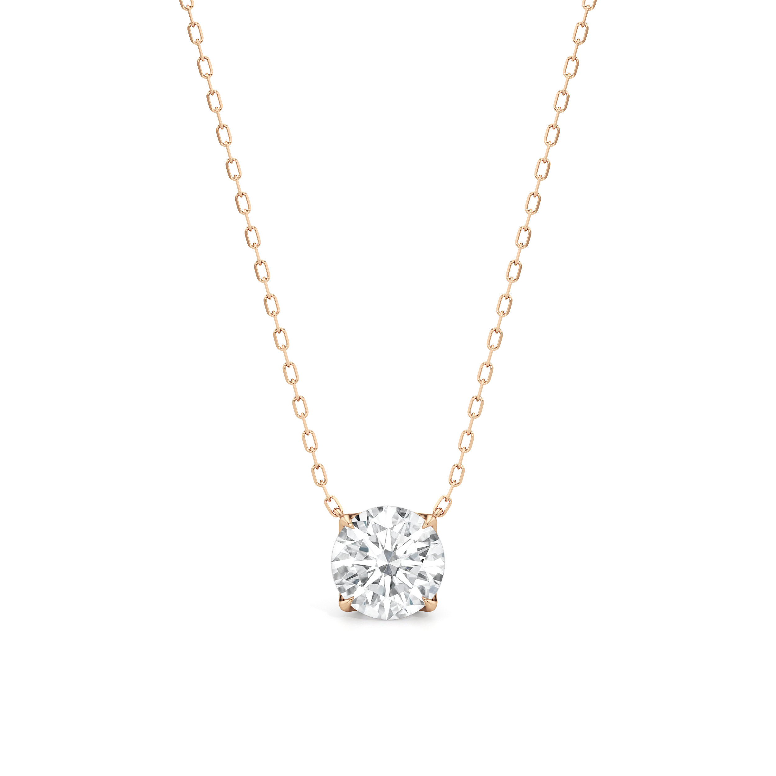 The Atrium Round Solitaire Pendant boasts a diamond-studded U-shaped setting that redefines how a diamond should shine. This necklace holds a diamond solitaire pendant secured by four claw prongs and cradled by a U-shaped frame. Additional diamonds punctuate the curved base of the setting, maximizing brilliance.