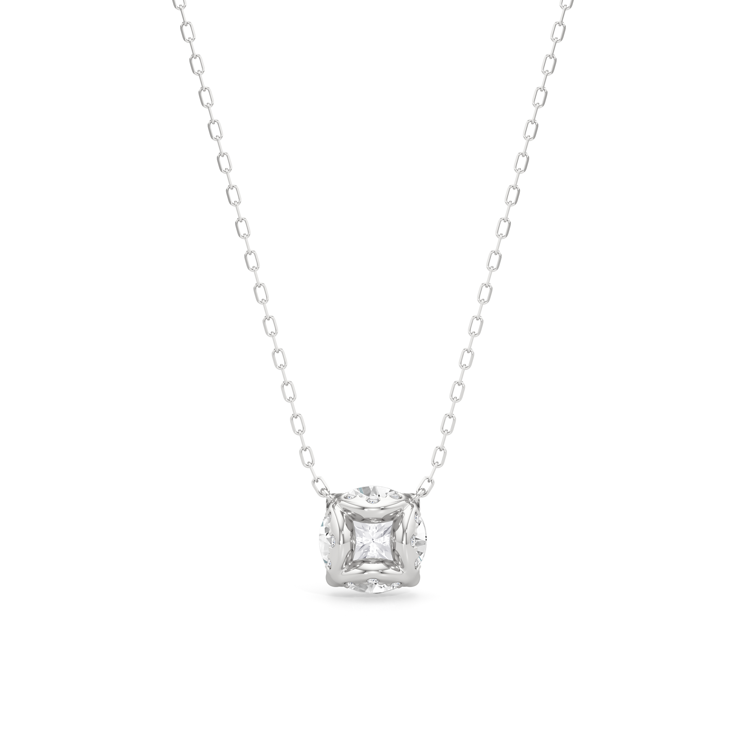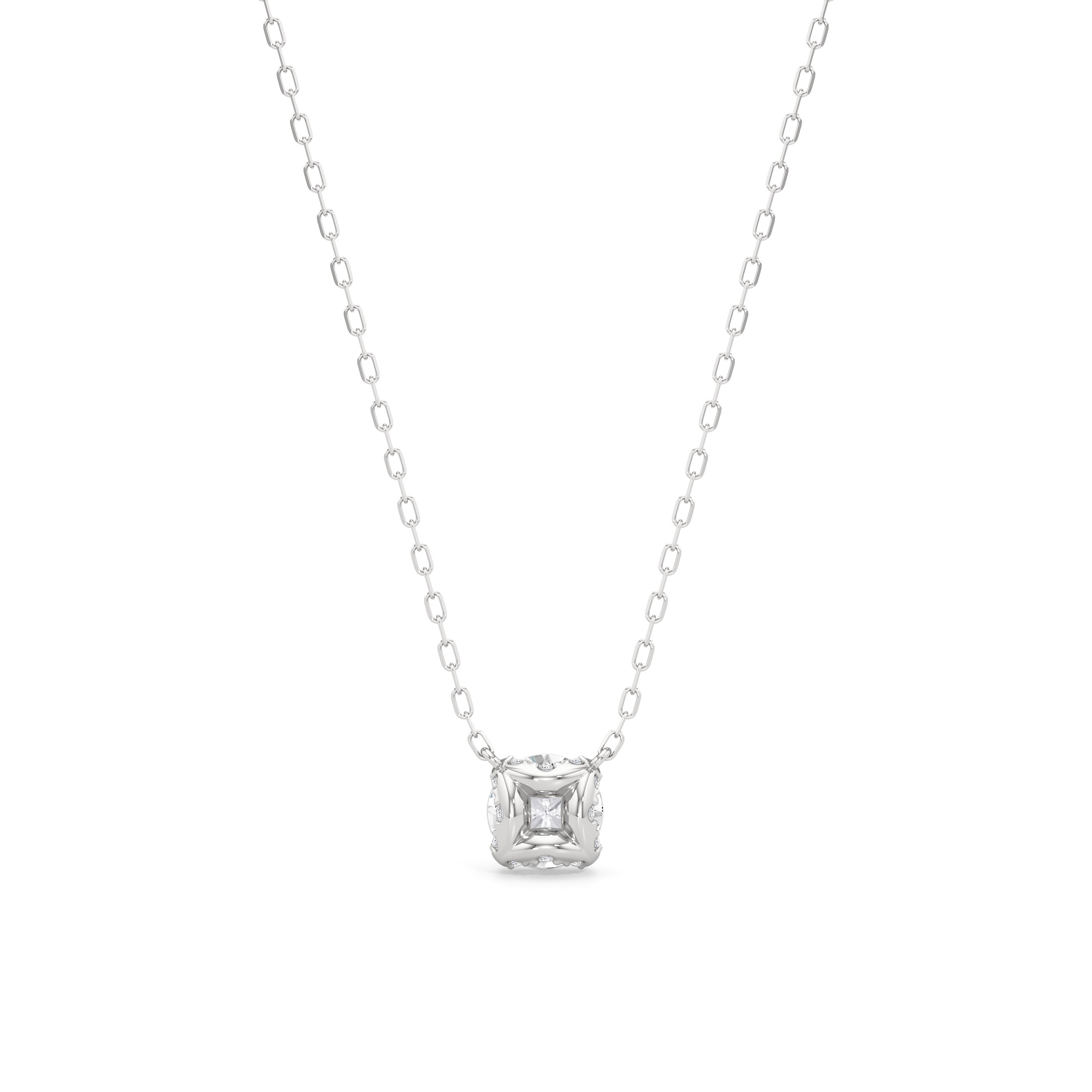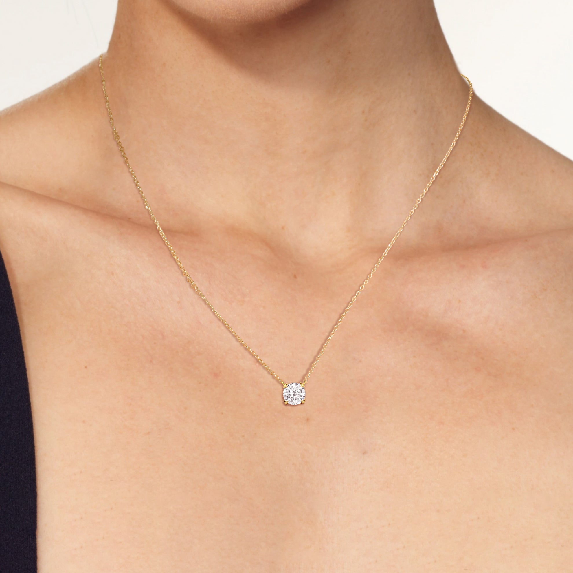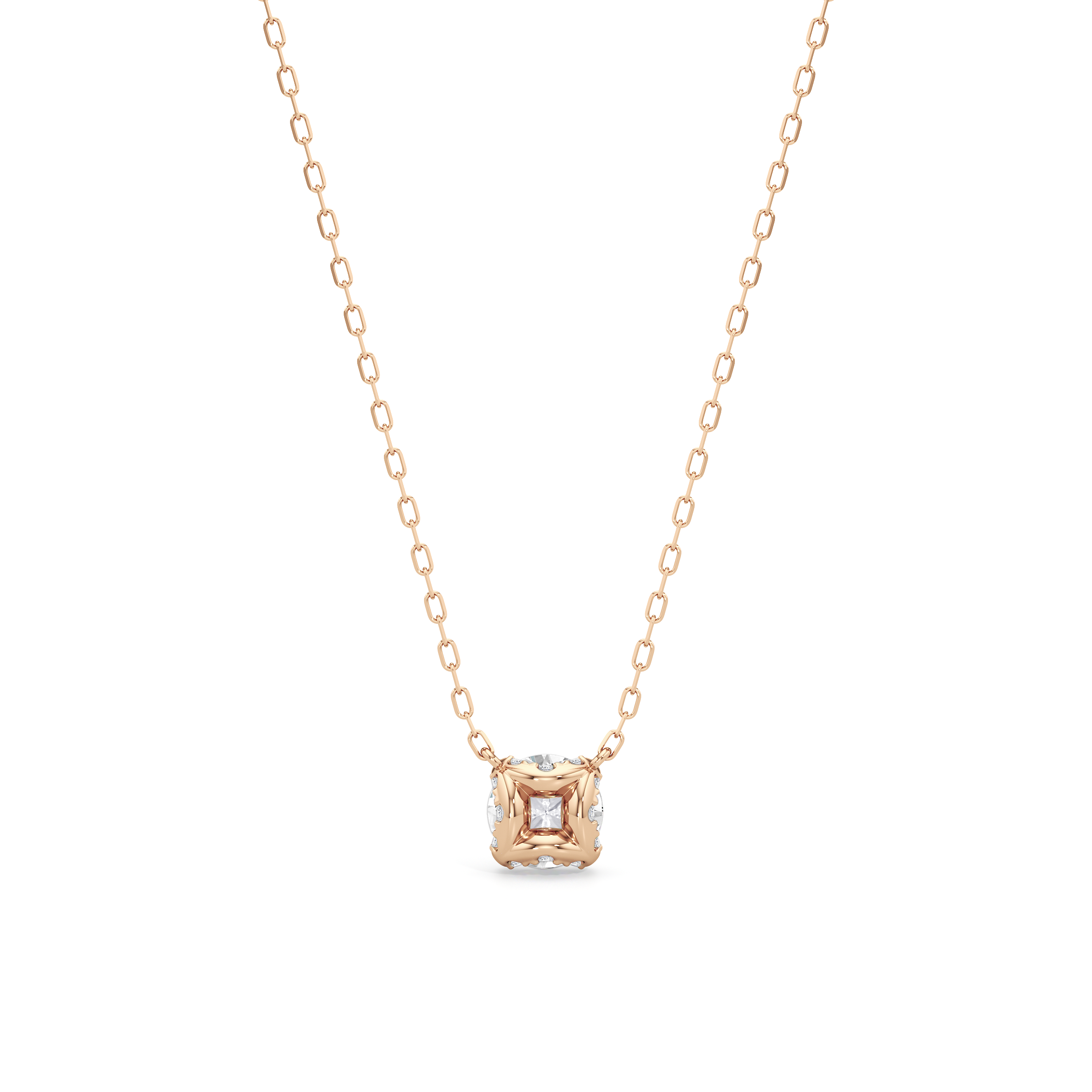 The Atrium Round Solitaire Pendant boasts a diamond-studded U-shaped setting that redefines how a diamond should shine. This necklace holds a diamond solitaire pendant secured by four claw prongs and cradled by a U-shaped frame. Additional diamonds punctuate the curved base of the setting, maximizing brilliance.