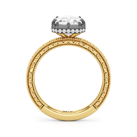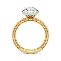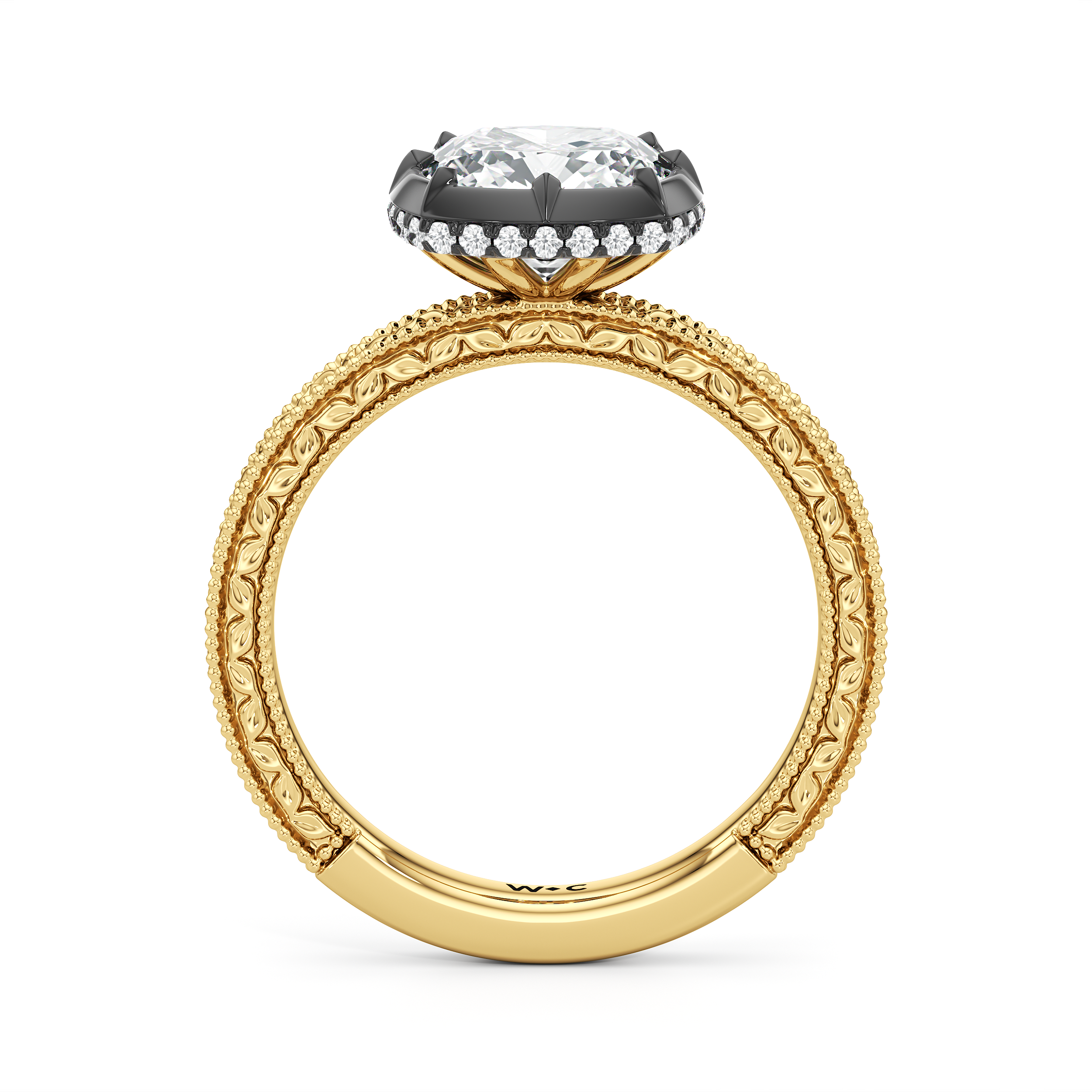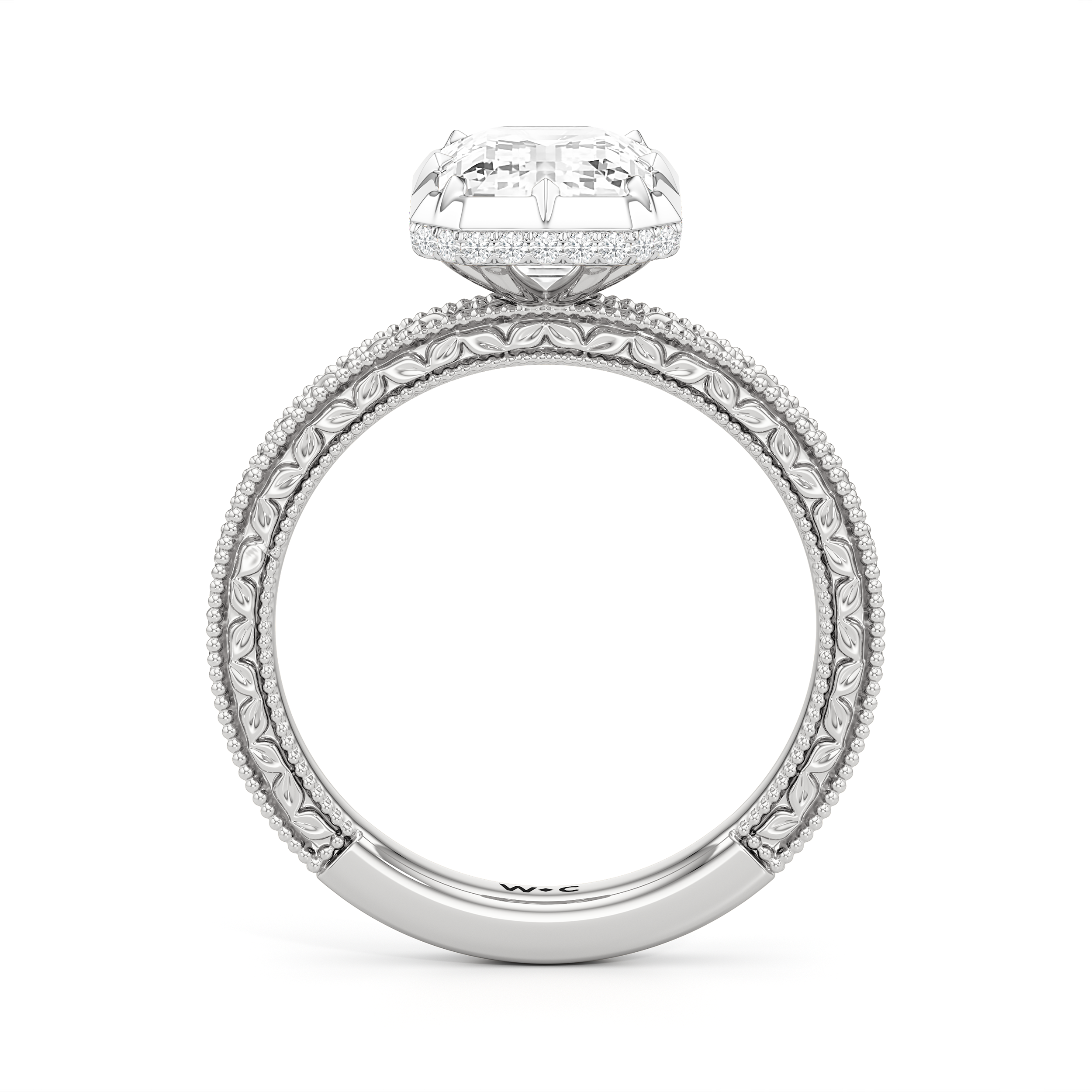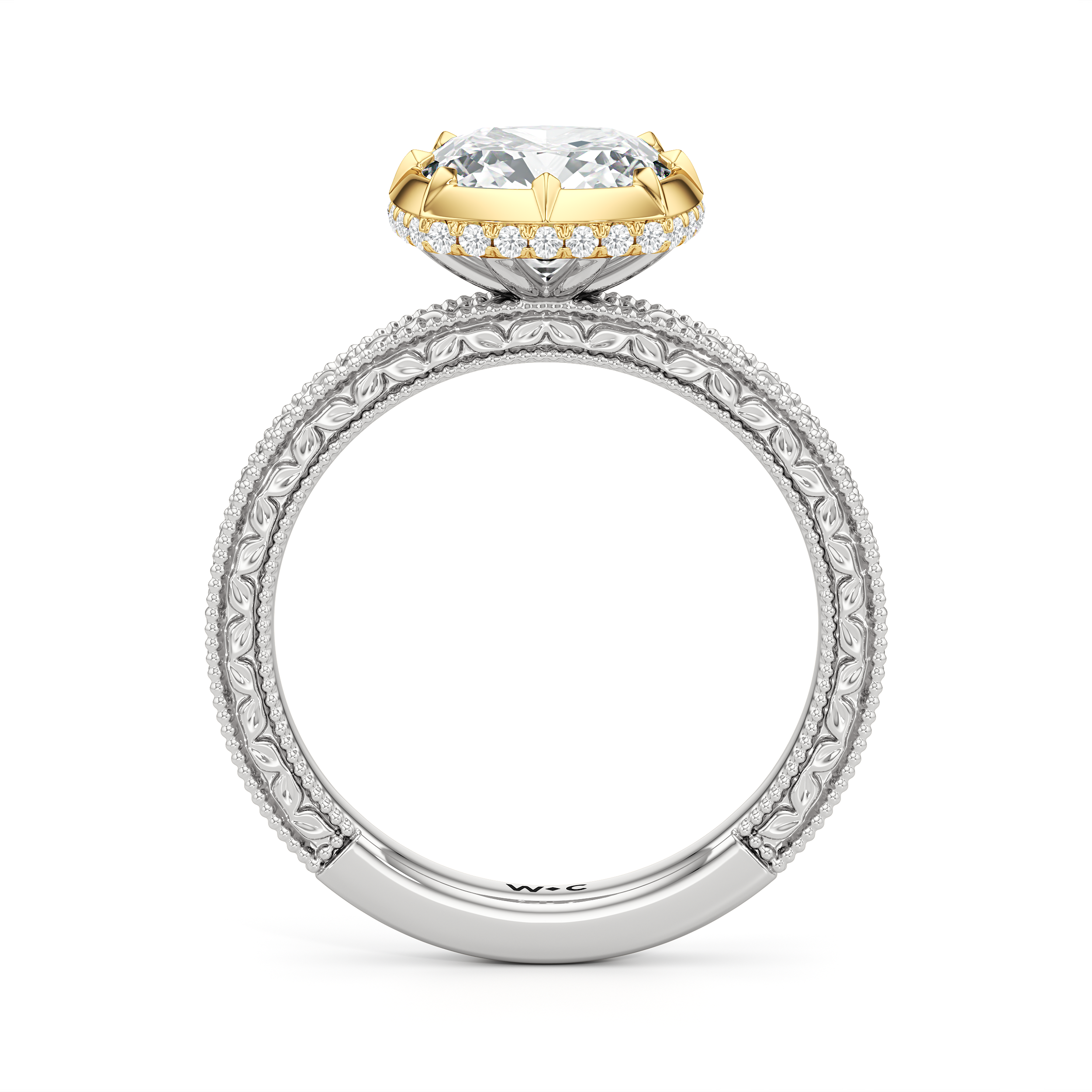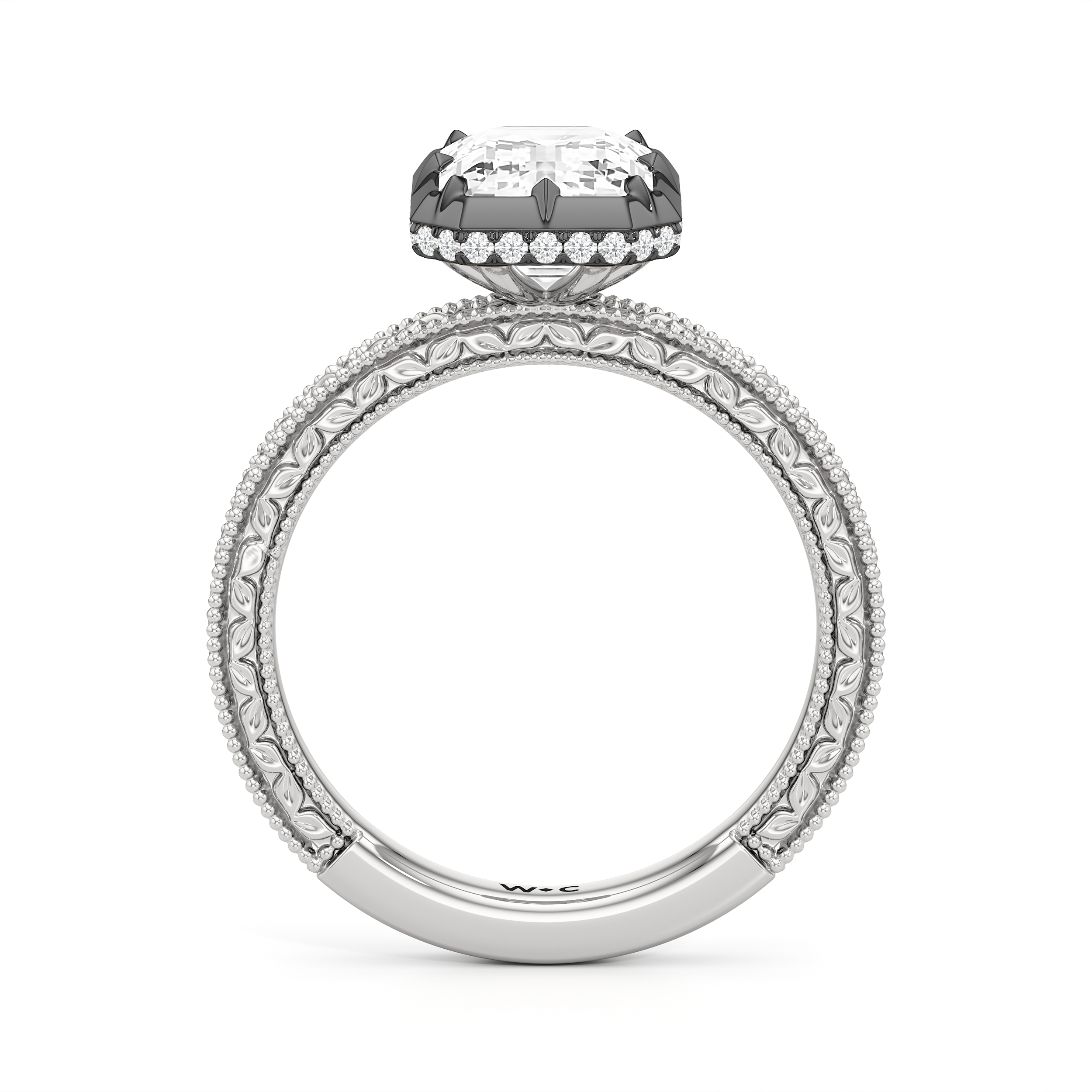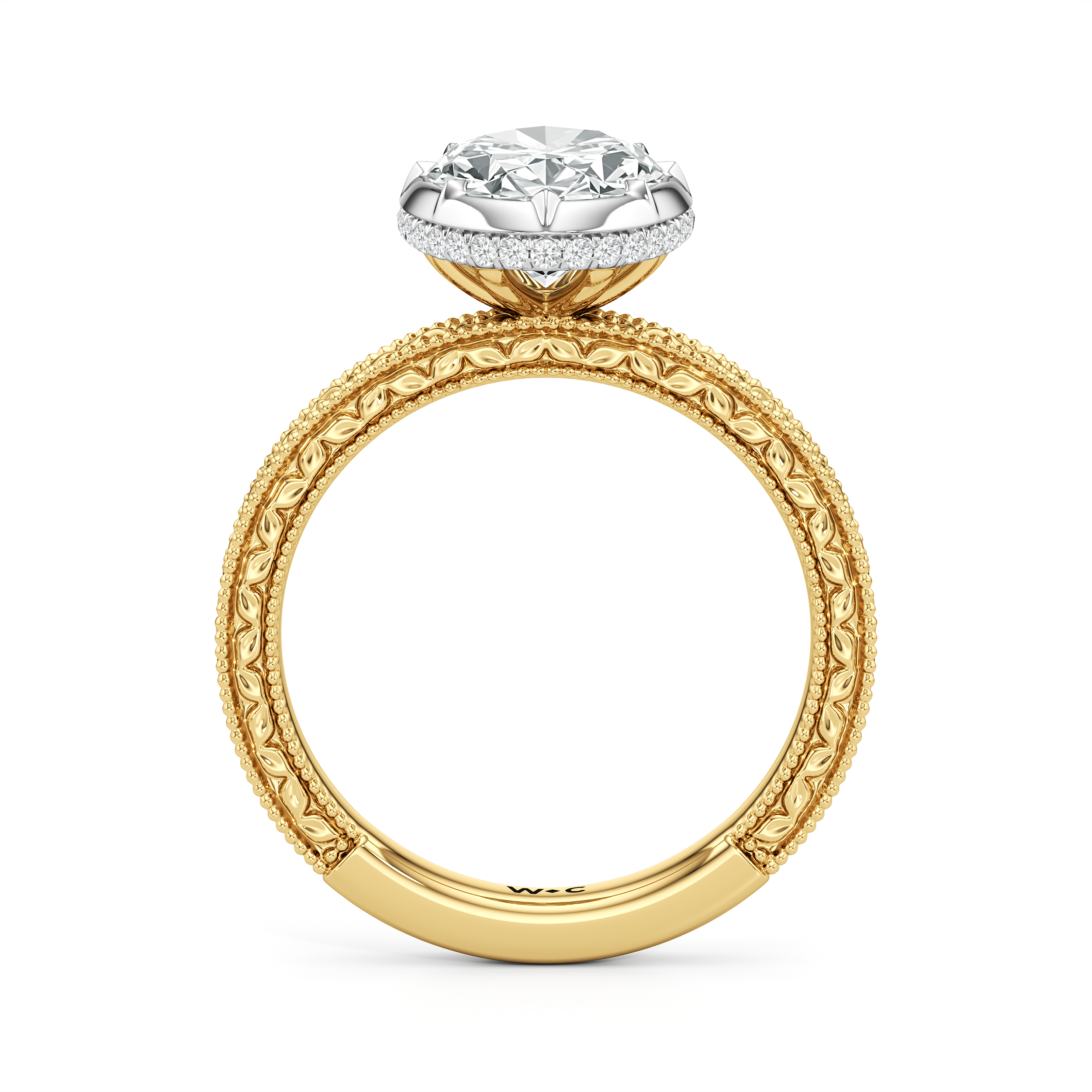 Designed with classic craftsmanship reimagined for today, Aurore captures the glow of something quietly powerful—like the connection between soulmates. Timeless, yet always beginning. The center diamond set in a hybrid serti dressé setting, is lifted with care and precision. Beneath it is a hidden halo that adds a soft brilliance from below, while the band echoes vintage detailing with its miglrained edges.