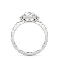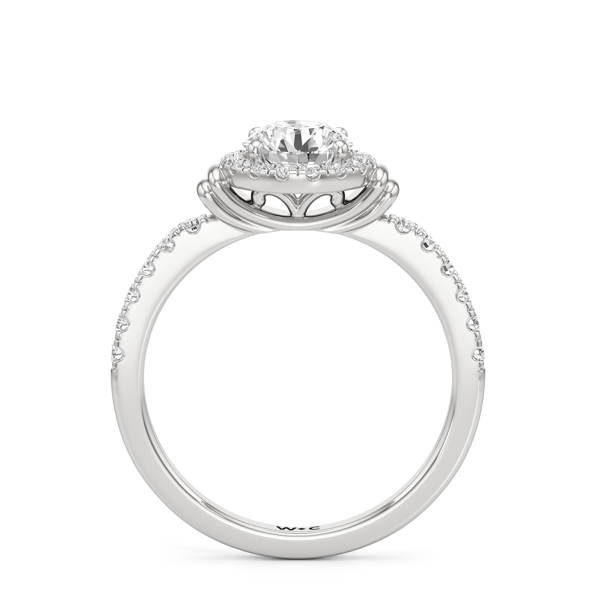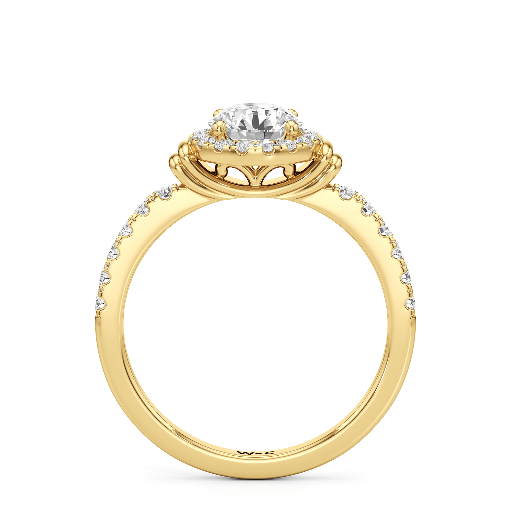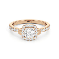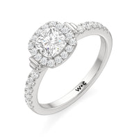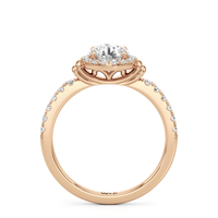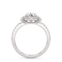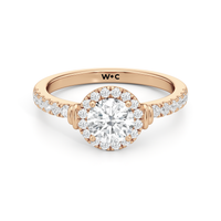This highly desirable diamond engagement ring is designed to evoke old world glamour. It features a stunning halo centerpiece with double collar accents, all set on a diamond-studded shank. The band showcases prong-set round diamonds that lead to the diamond at the center, exquisitely framed by a diamond halo. On either side of the centrepiece are polished collars or rounded and stepped metalwork that provides a hint of sculptural wonder to the ring.