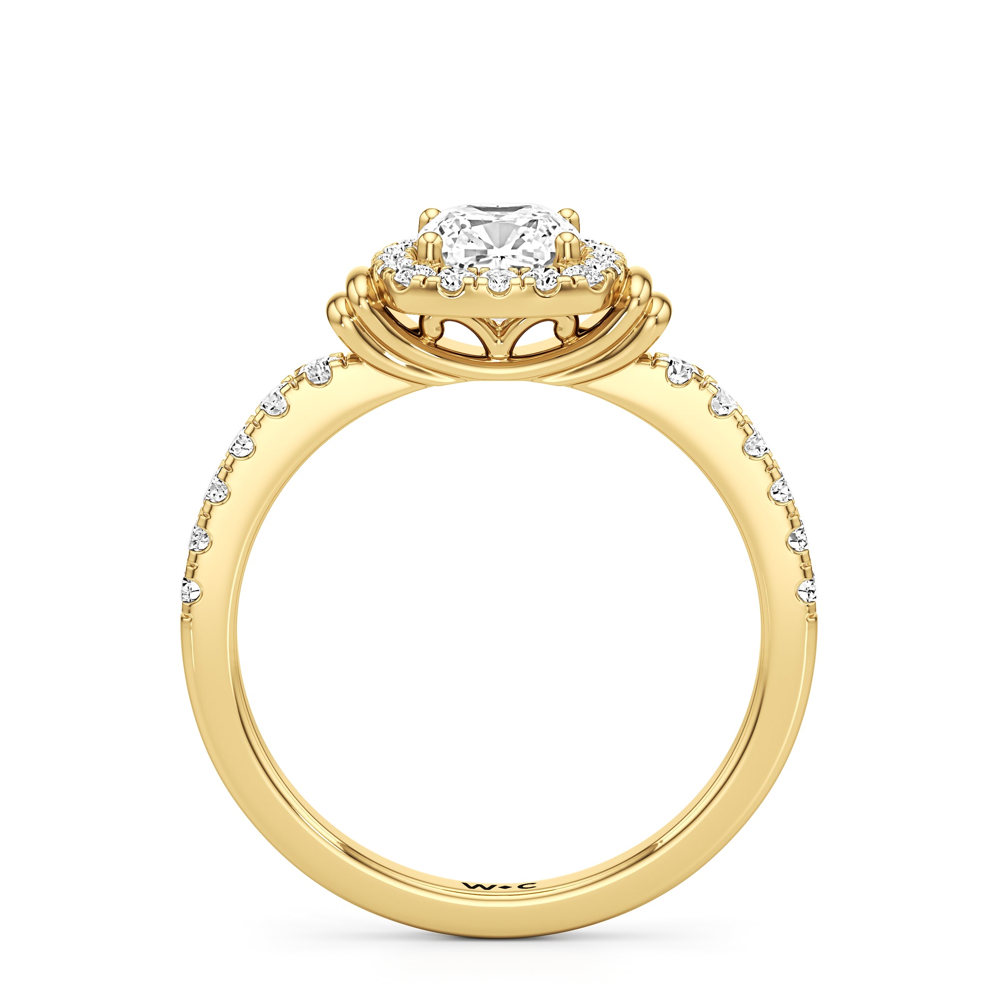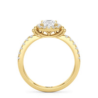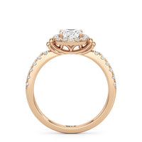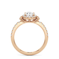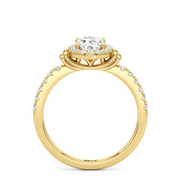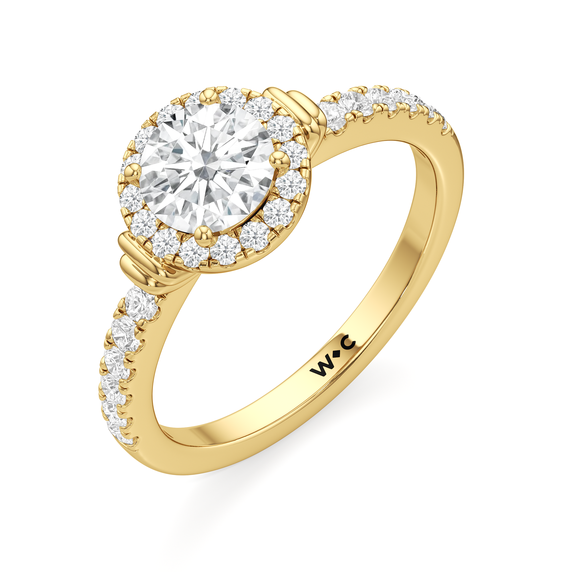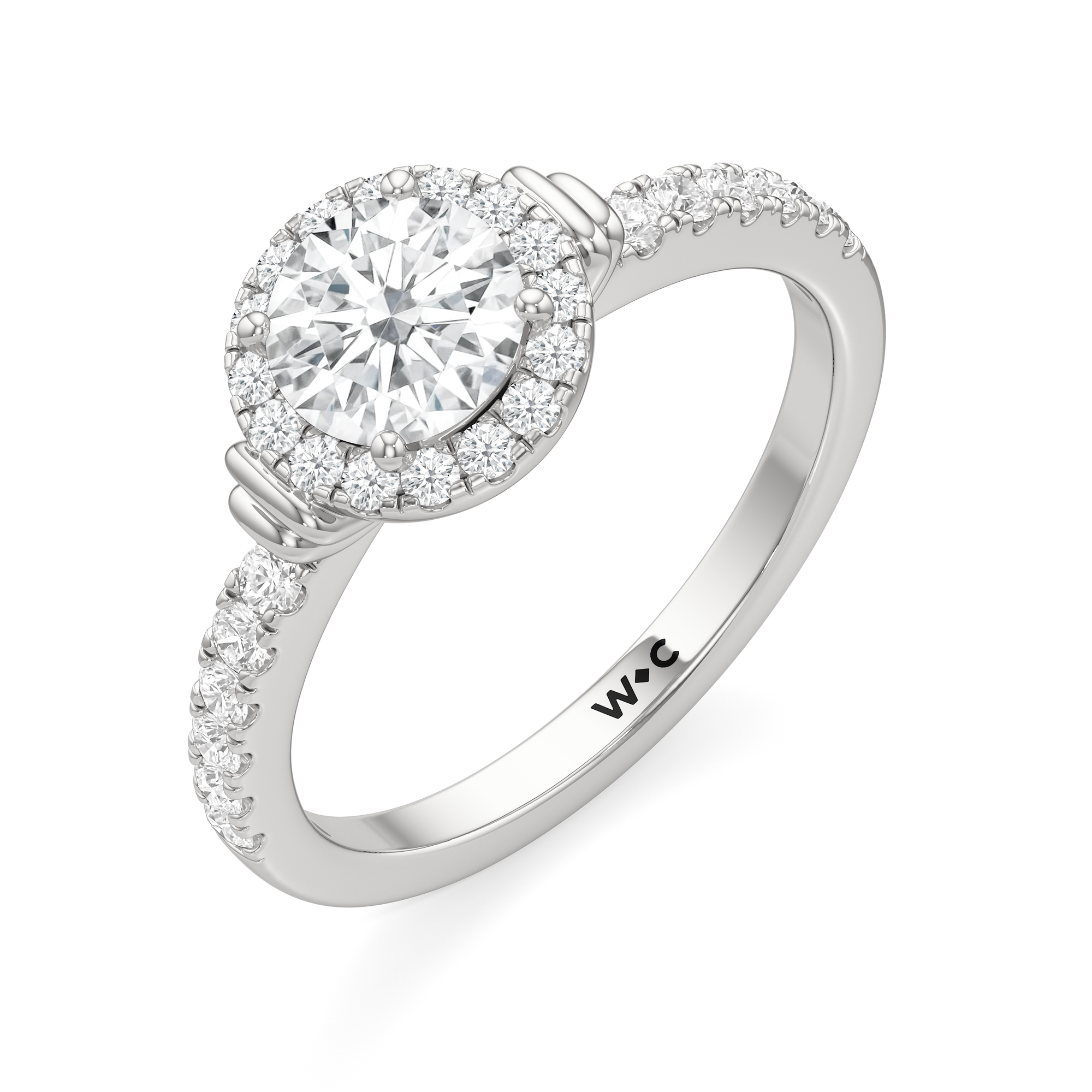 This highly desirable diamond engagement ring is designed to evoke old world glamour. It features a stunning halo centerpiece with double collar accents, all set on a diamond-studded shank. The band showcases prong-set round diamonds that lead to the diamond at the center, exquisitely framed by a diamond halo. On either side of the centrepiece are polished collars or rounded and stepped metalwork that provides a hint of sculptural wonder to the ring.