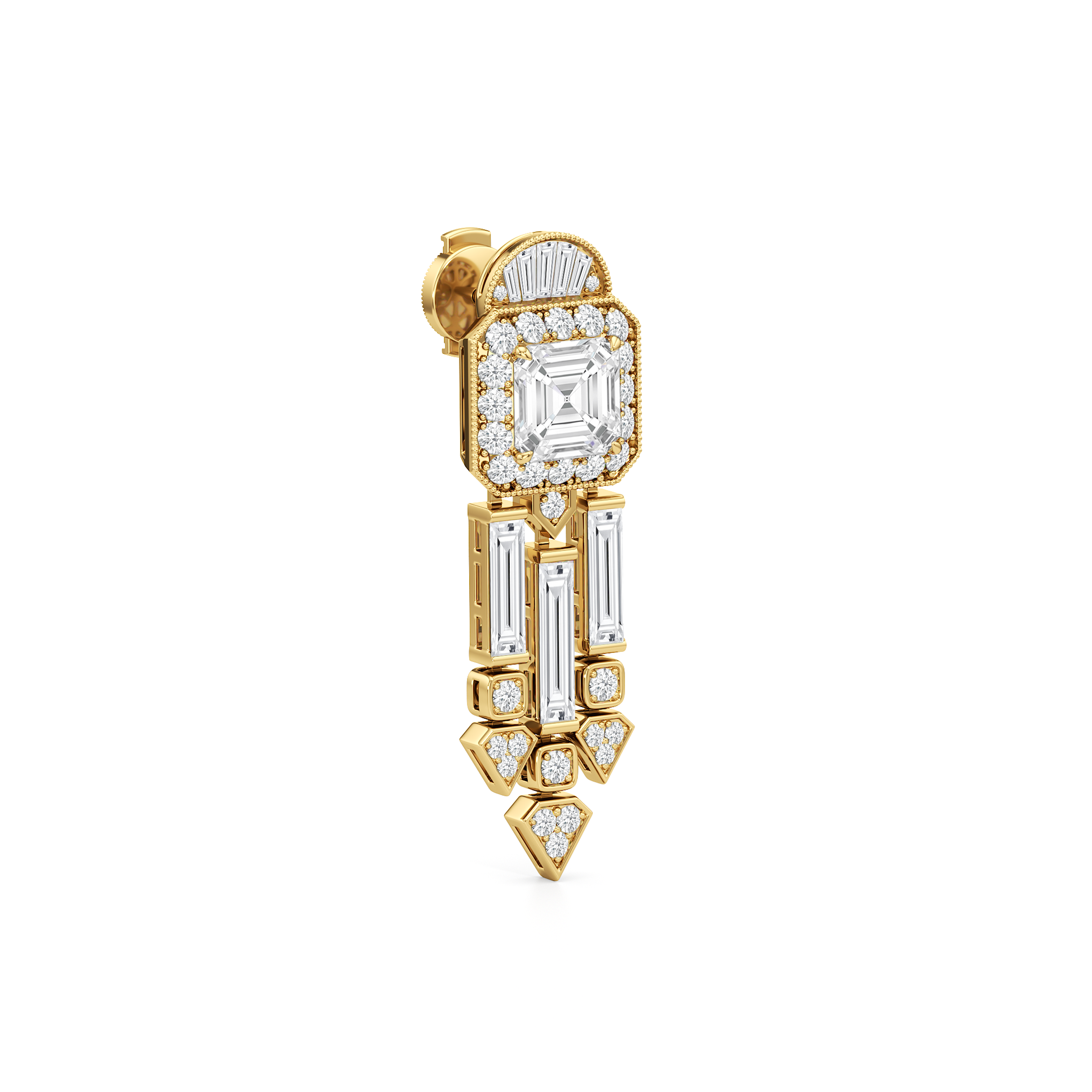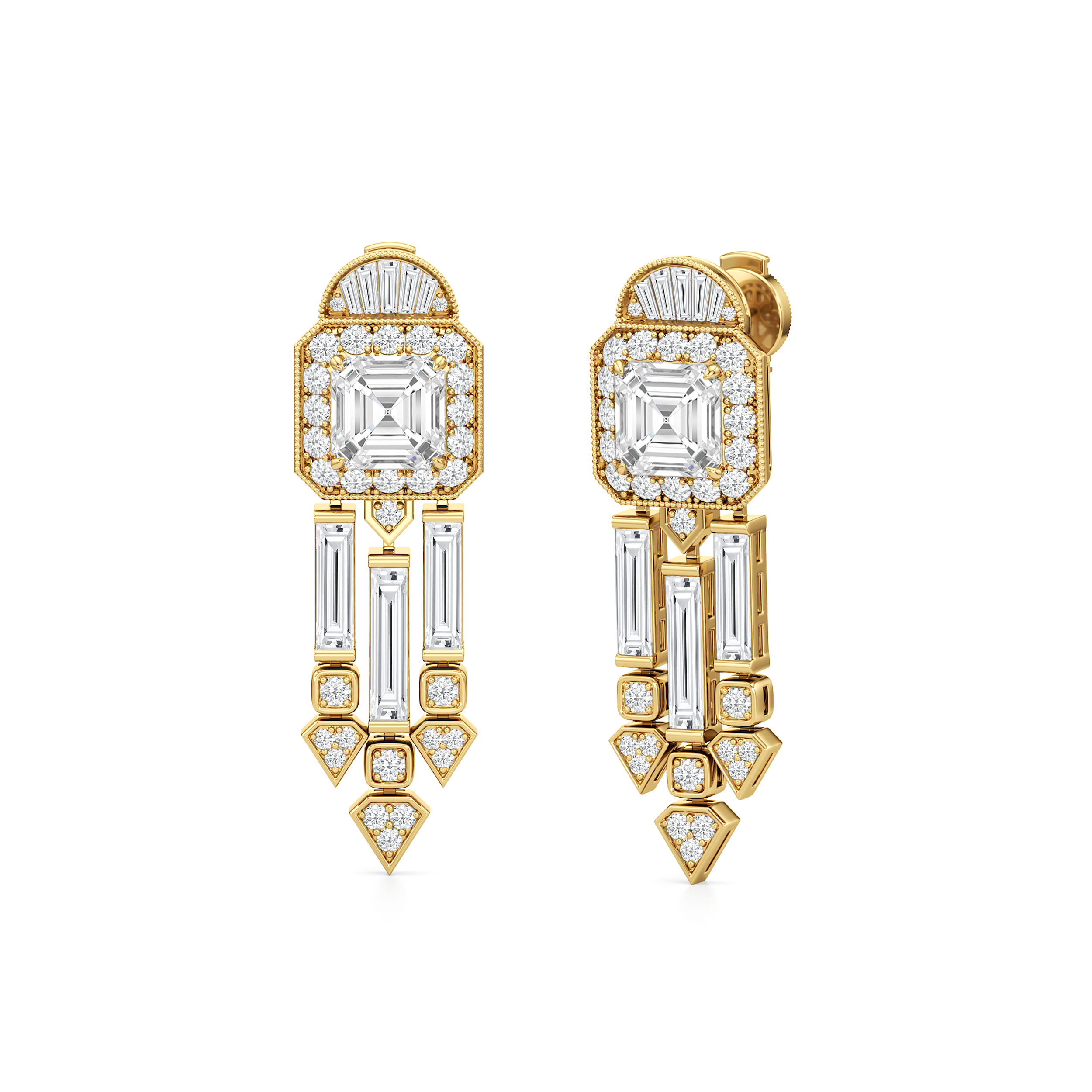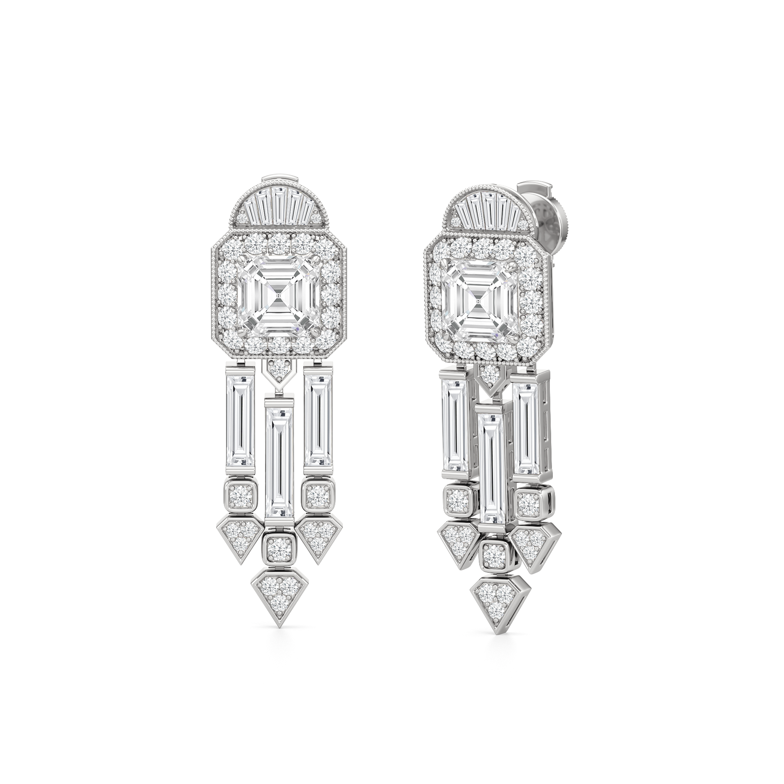 This pair of dangling earrings captures the allure and ornate sophistication of the Art Deco lobby in Havana’s iconic Bacardi Building. The pair features Asscher-cut diamonds sitting within an octagonal frame of micro-pavé diamonds. Above, a half-circle of baguette diamonds radiate like the sunburst motifs found in the building's decorative panels. Flowing from the central diamond with clipped corners are three baguette drops, each punctuated at its base by more diamonds in square and triangle-shaped frames. Fine milgrain detailing around every edge of each earring echoes the delicate grillework that trims the Bacardi's walls and windows. Like a miniature landscape of light, line, and symmetry, these dangling earrings radiate streamlined elegance and geometric drama—quintessentially Art Deco.