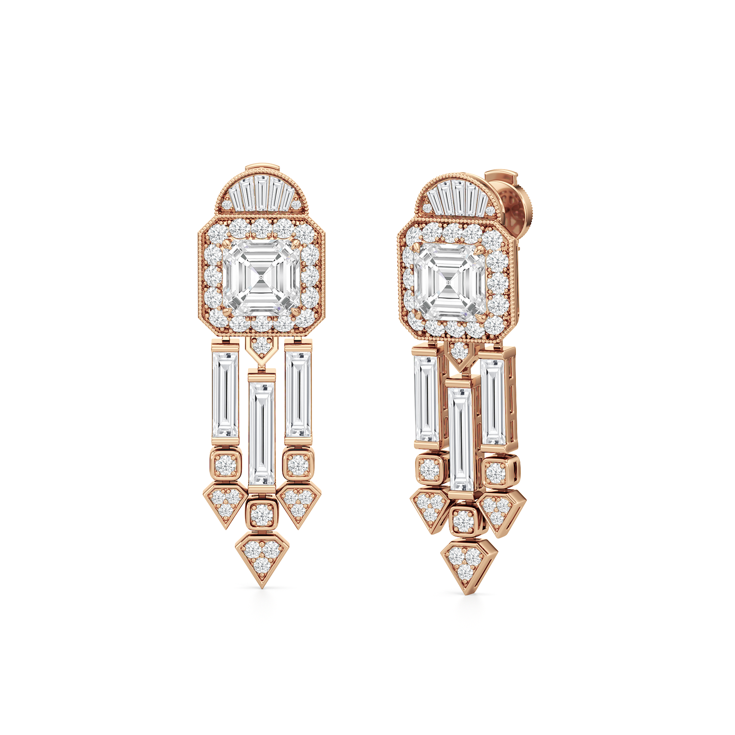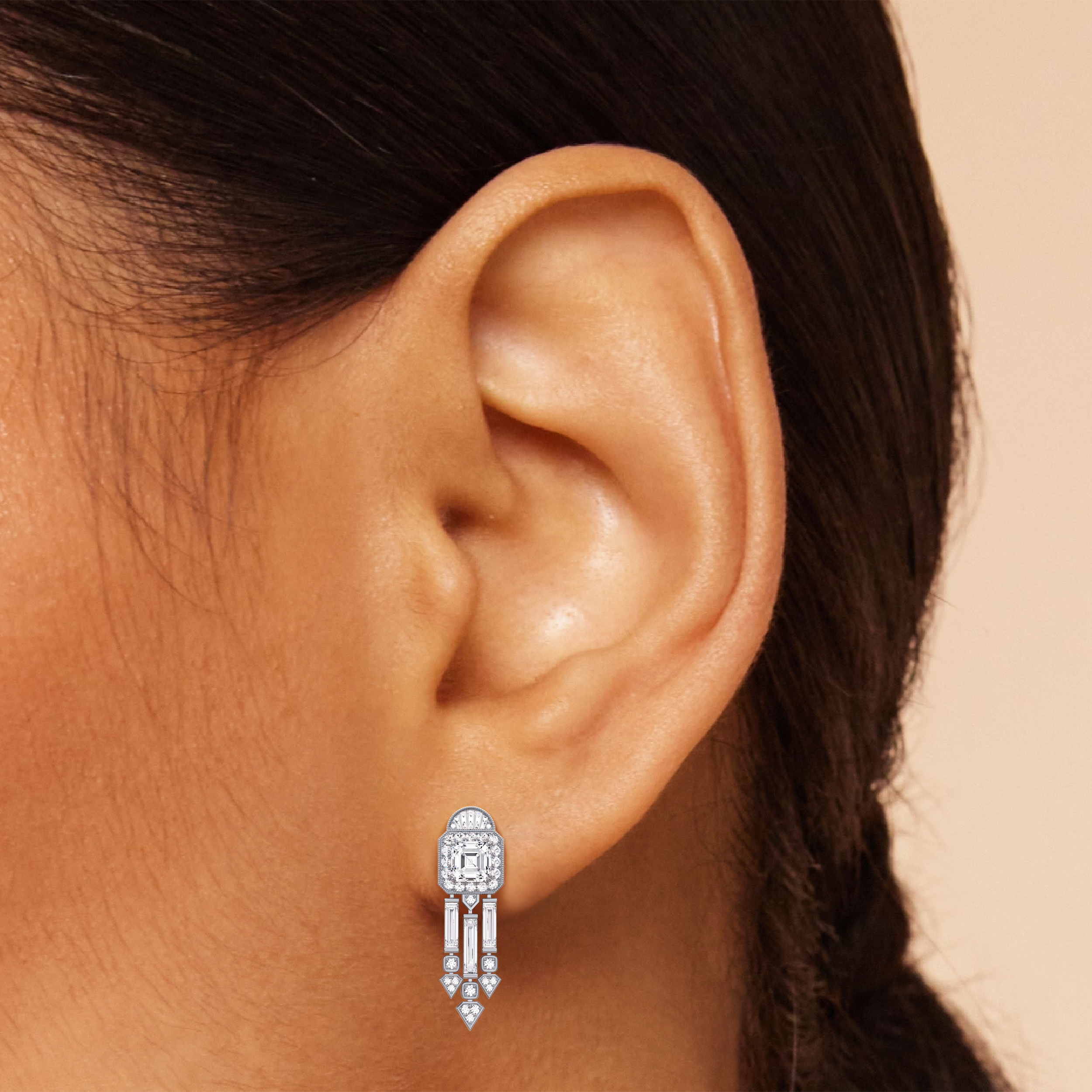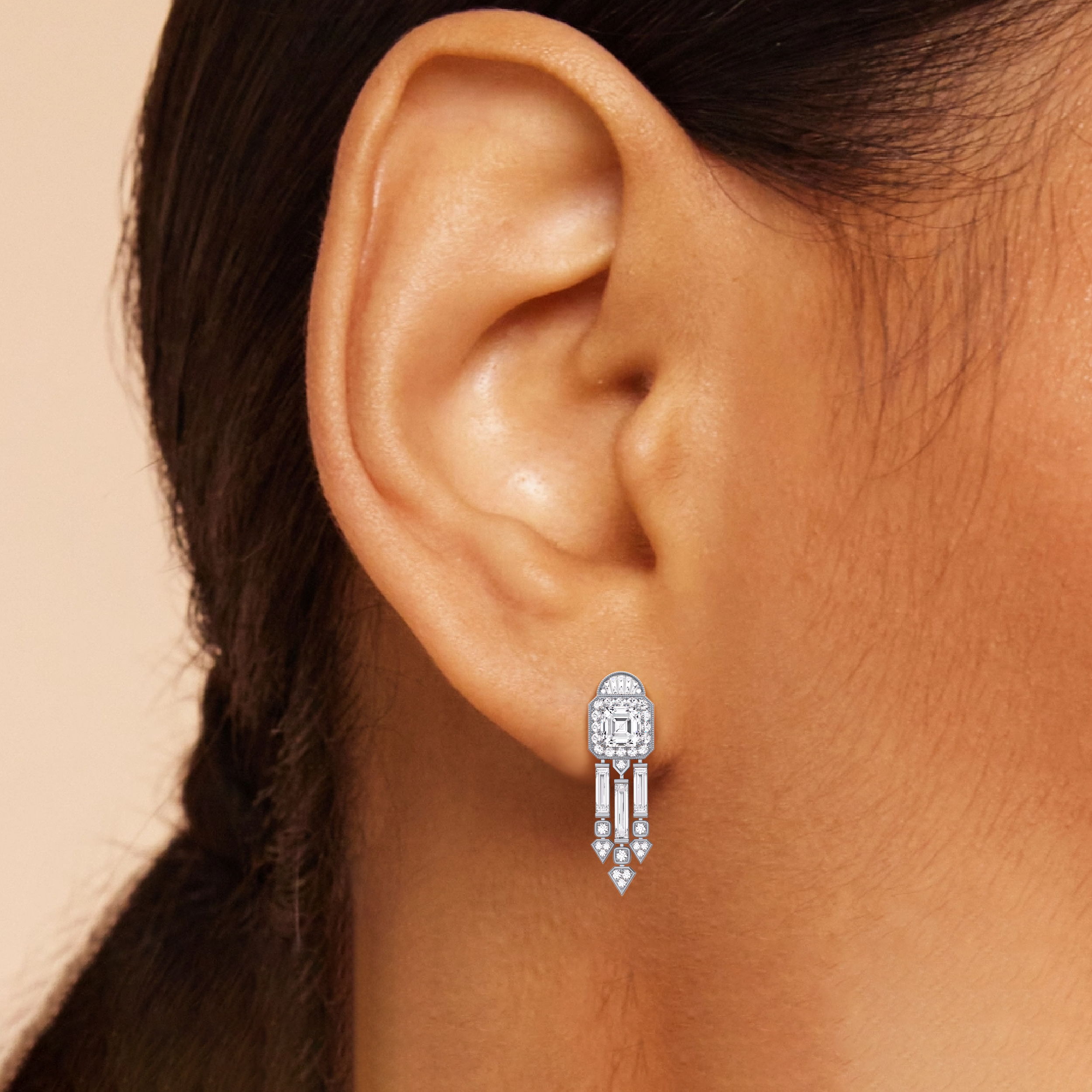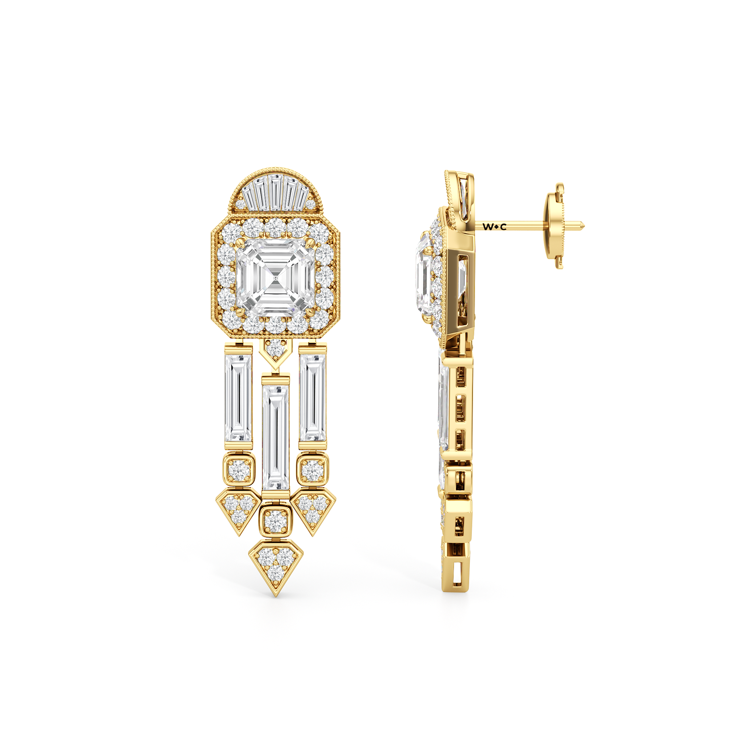 This pair of dangling earrings captures the allure and ornate sophistication of the Art Deco lobby in Havana’s iconic Bacardi Building. The pair features Asscher-cut diamonds sitting within an octagonal frame of micro-pavé diamonds. Above, a half-circle of baguette diamonds radiate like the sunburst motifs found in the building's decorative panels. Flowing from the central diamond with clipped corners are three baguette drops, each punctuated at its base by more diamonds in square and triangle-shaped frames. Fine milgrain detailing around every edge of each earring echoes the delicate grillework that trims the Bacardi's walls and windows. Like a miniature landscape of light, line, and symmetry, these dangling earrings radiate streamlined elegance and geometric drama—quintessentially Art Deco.