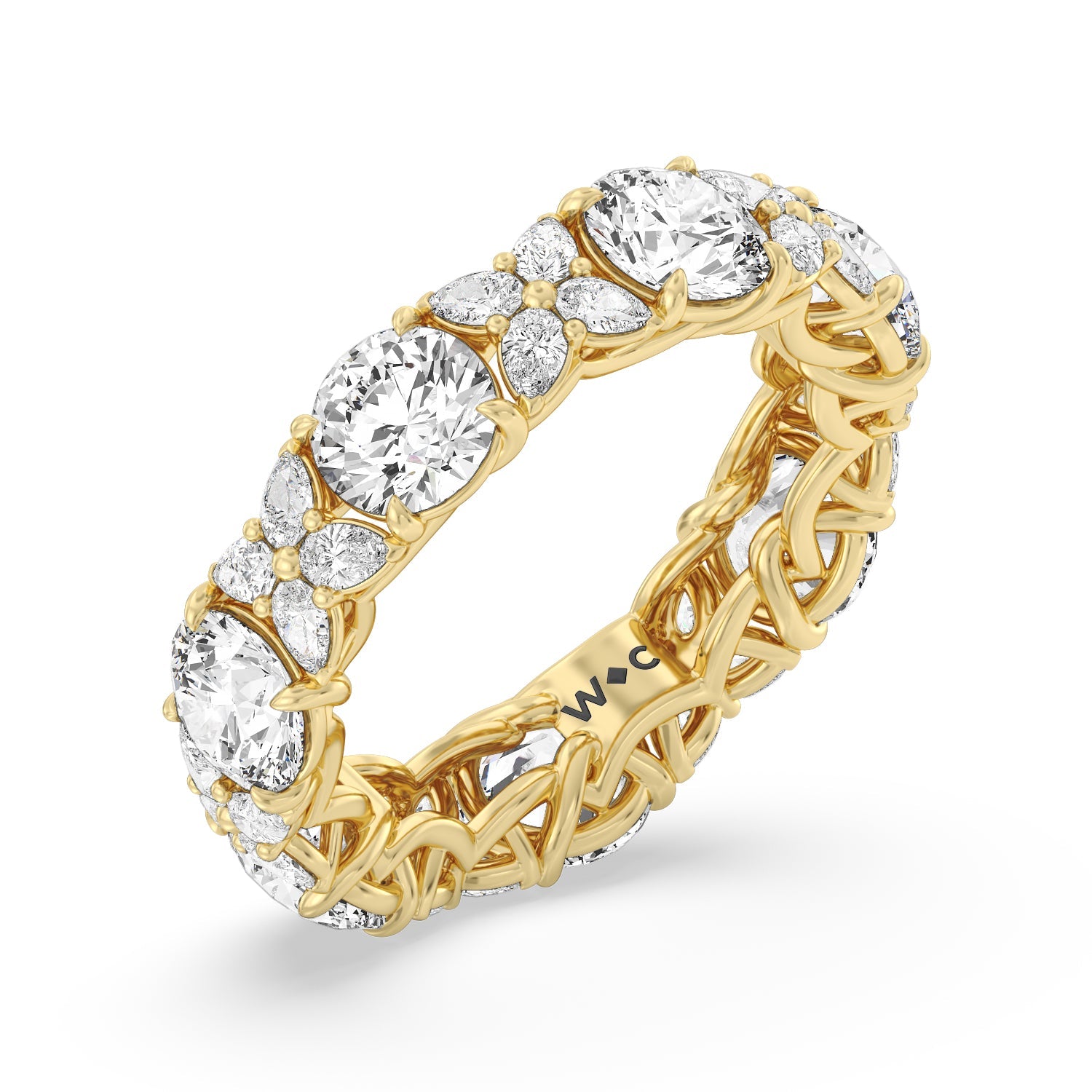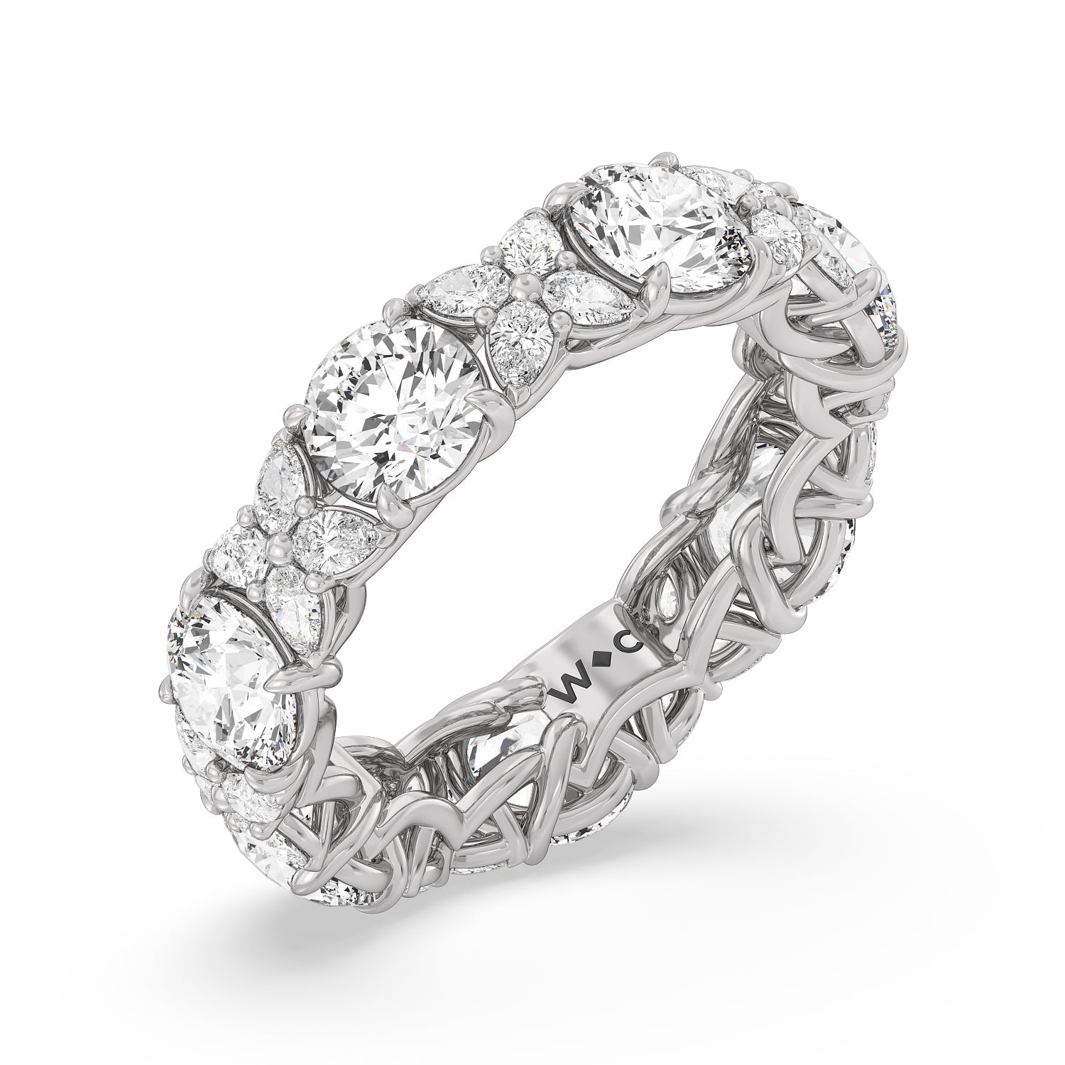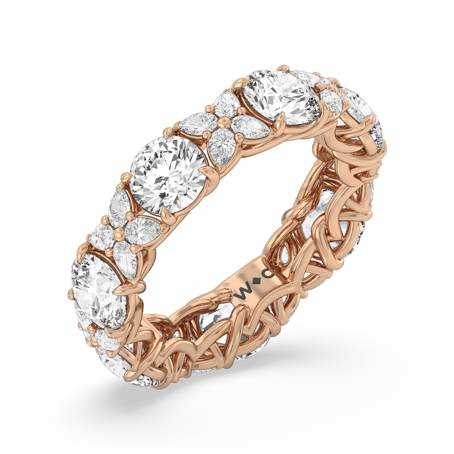 Indulge in the allure of the Botanical Eternity Ring. It features a tactile yet streamlined floral pattern of meticulously selected diamonds, each securely mounted on a cross-over prong basket that mimic the look of vines in a garden. Inspired by the delicacy of a flourishing garden, this eternity ring carries serene beauty.