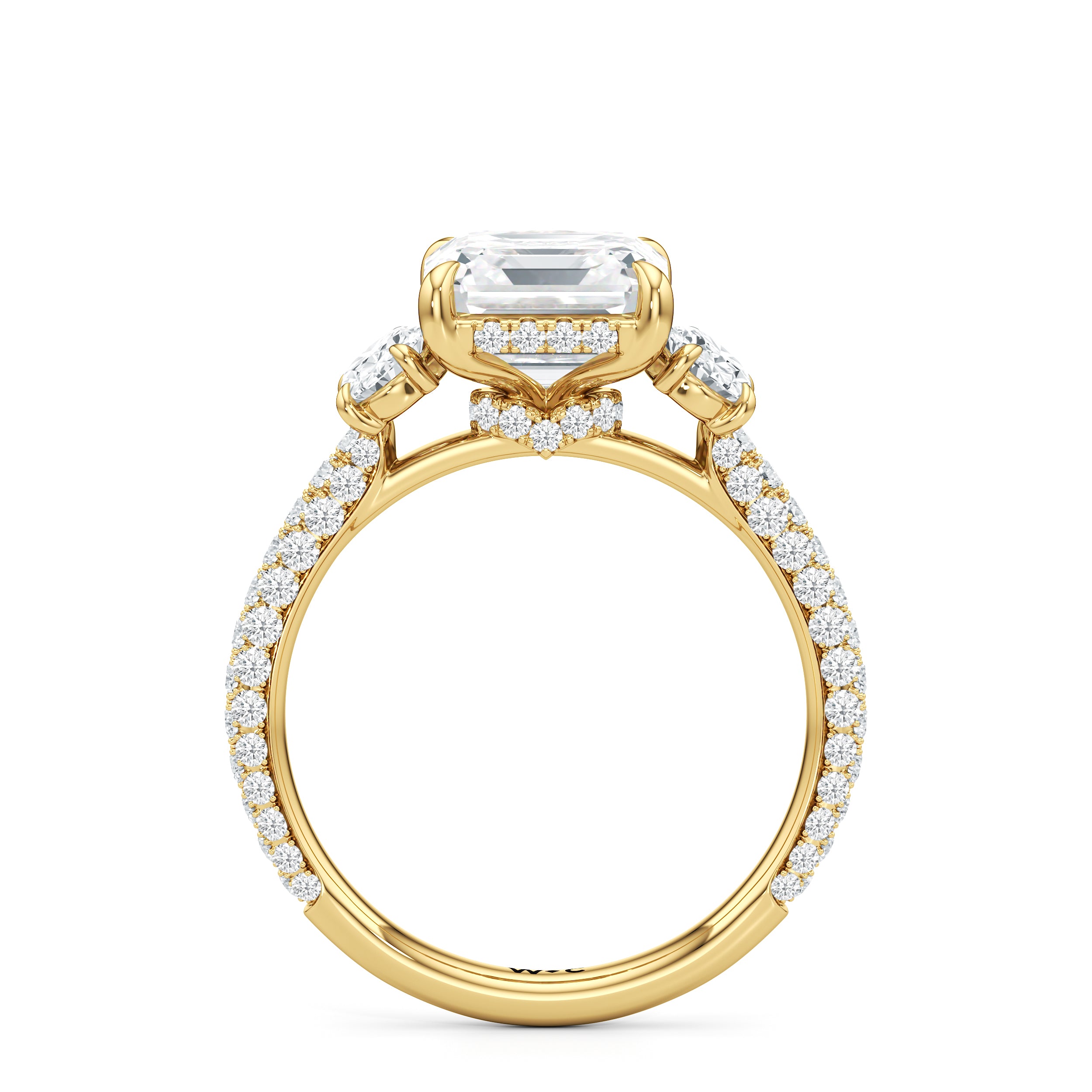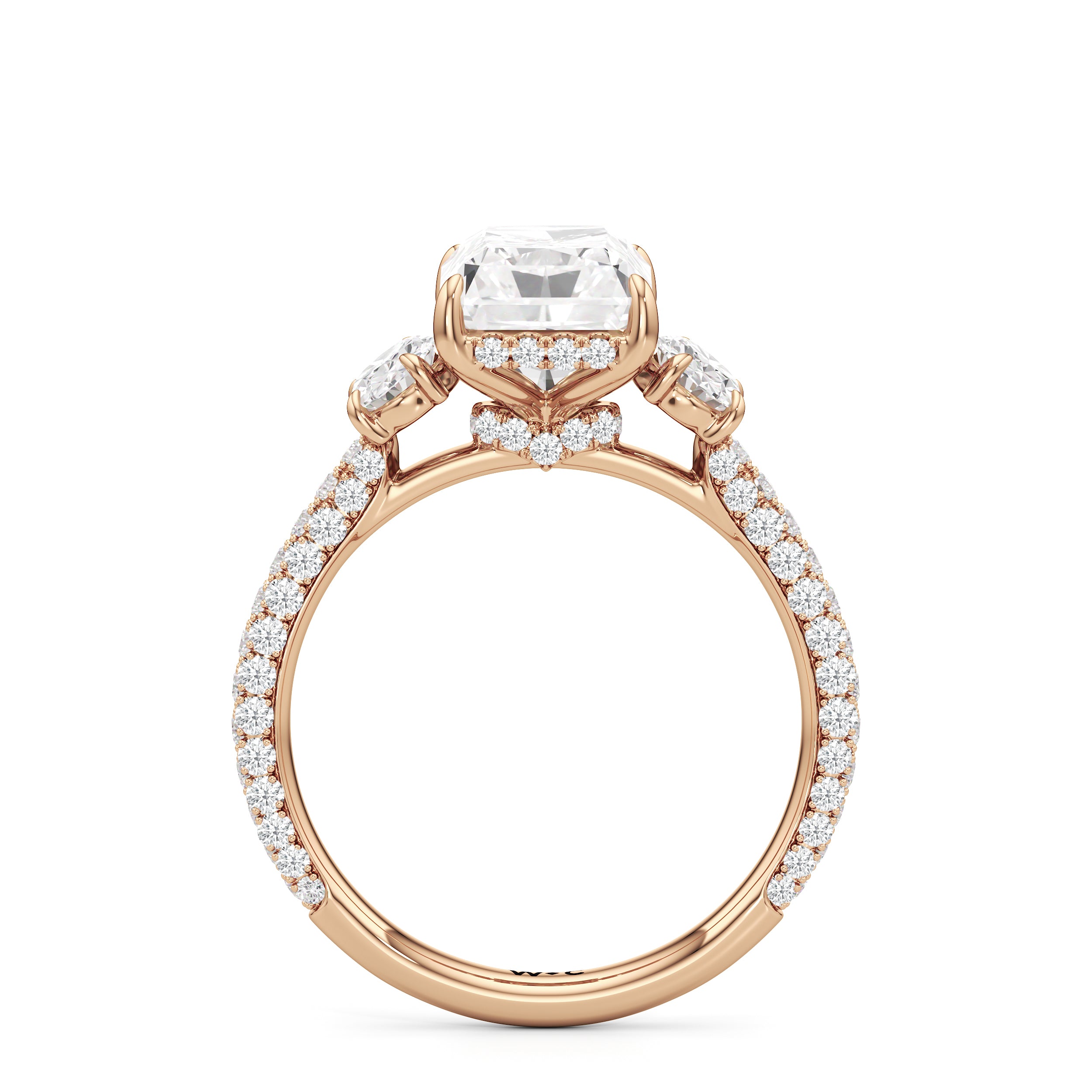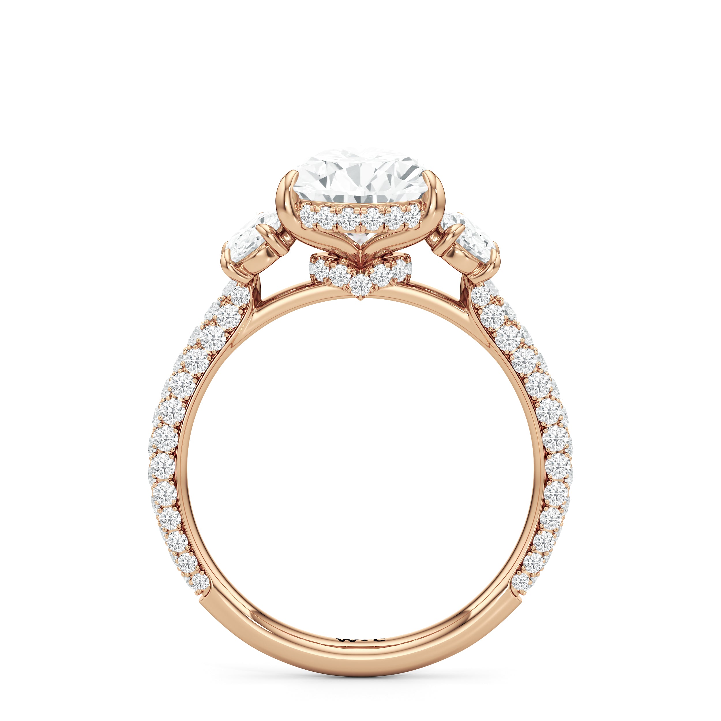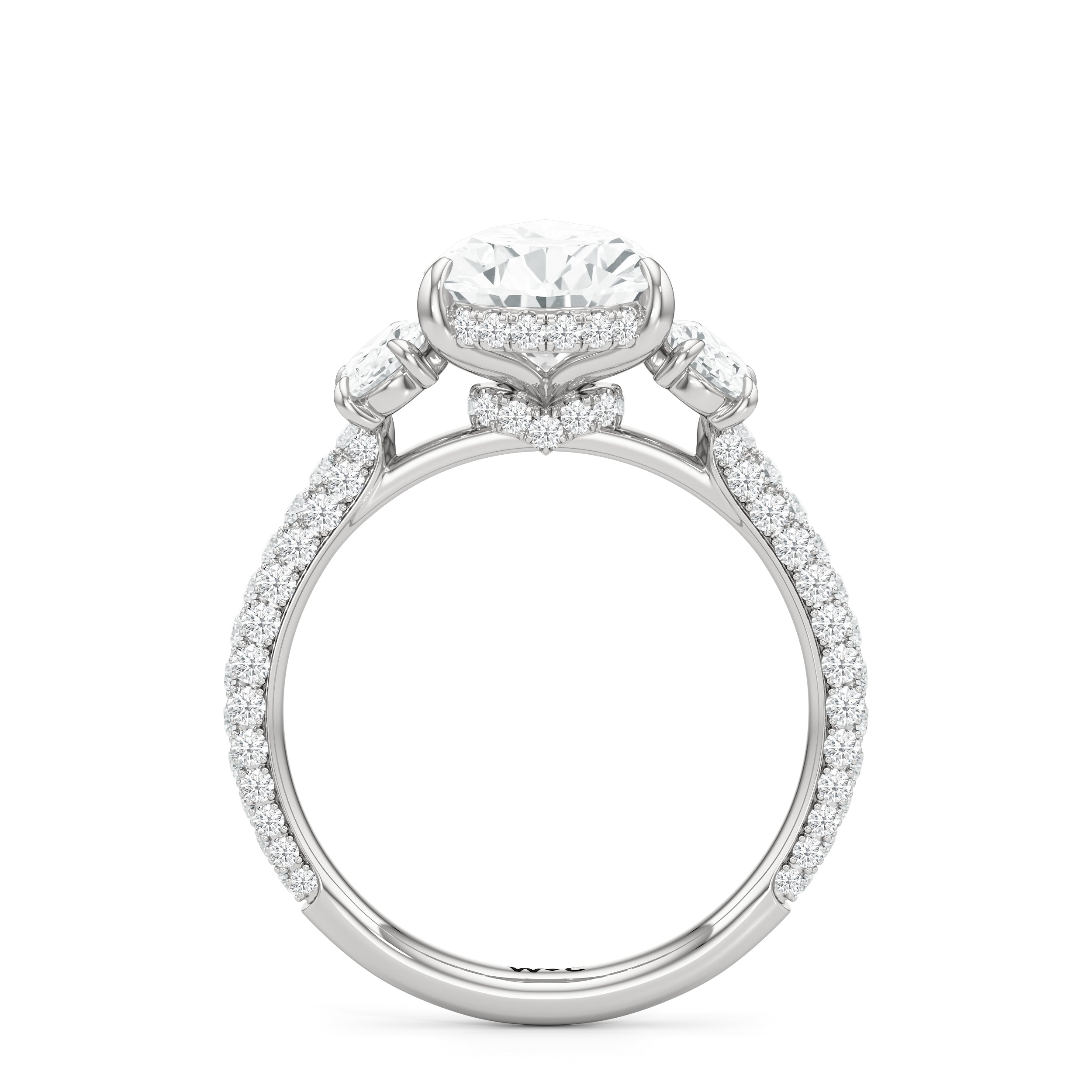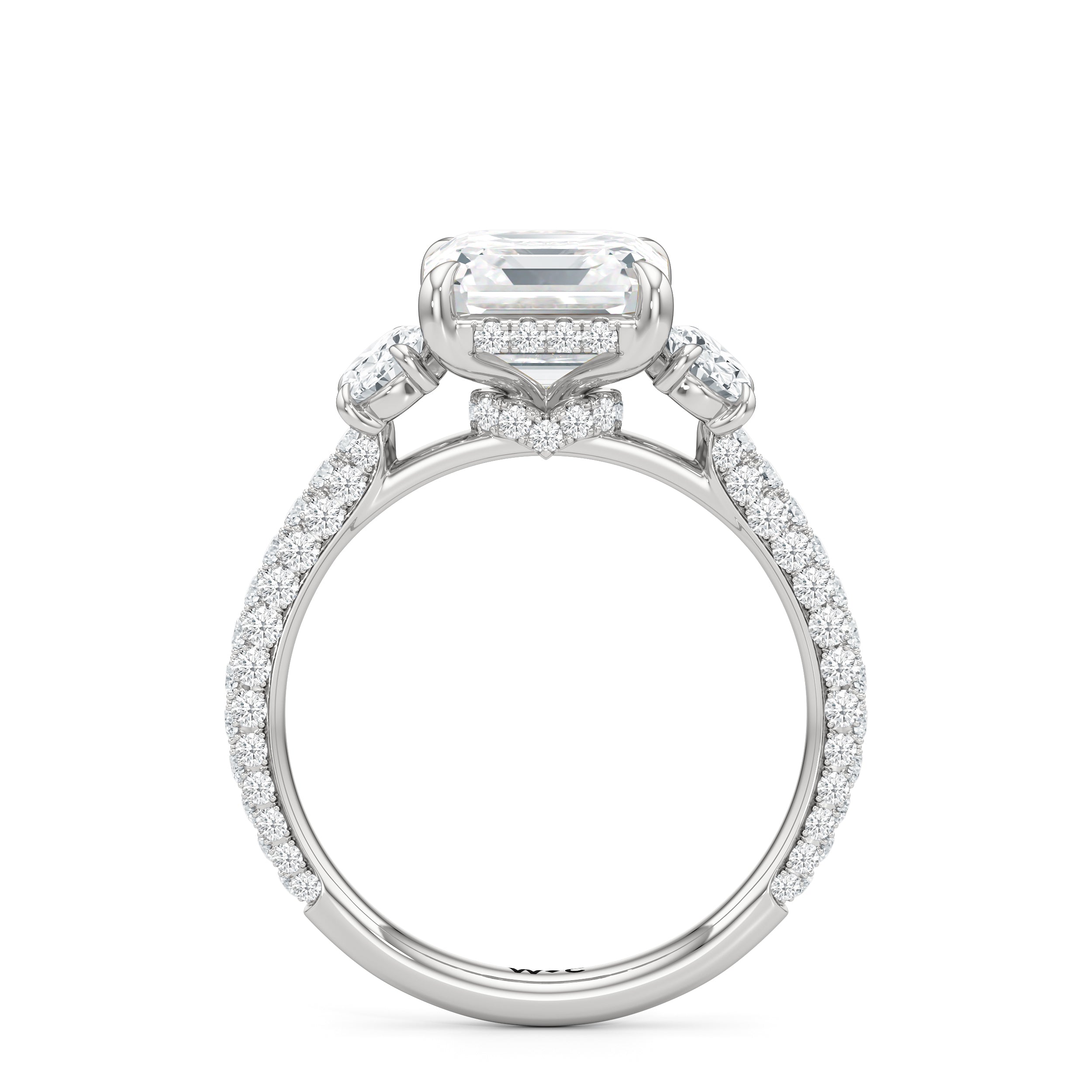 Striking the perfect balance between opulence and refinement, this three-stone ring is simply irresistible. Petite round diamonds cover nearly the entire circumference of the ring. The main stone is cradled by claw prongs and adorned with a diamond-studded rail and hidden halo. Oval side stones sit on either side of the focal gem, complementing the main diamond and creating a harmonious design.