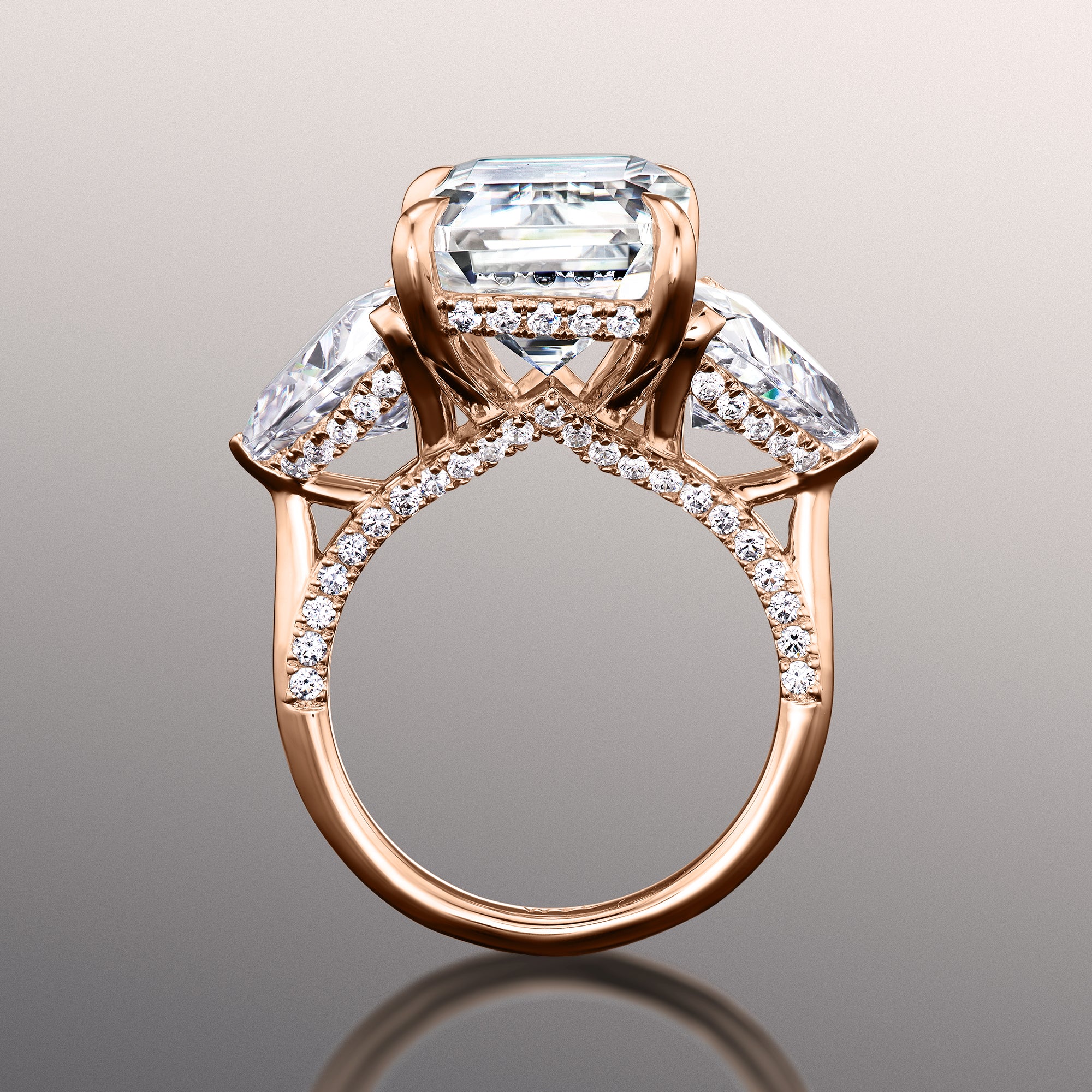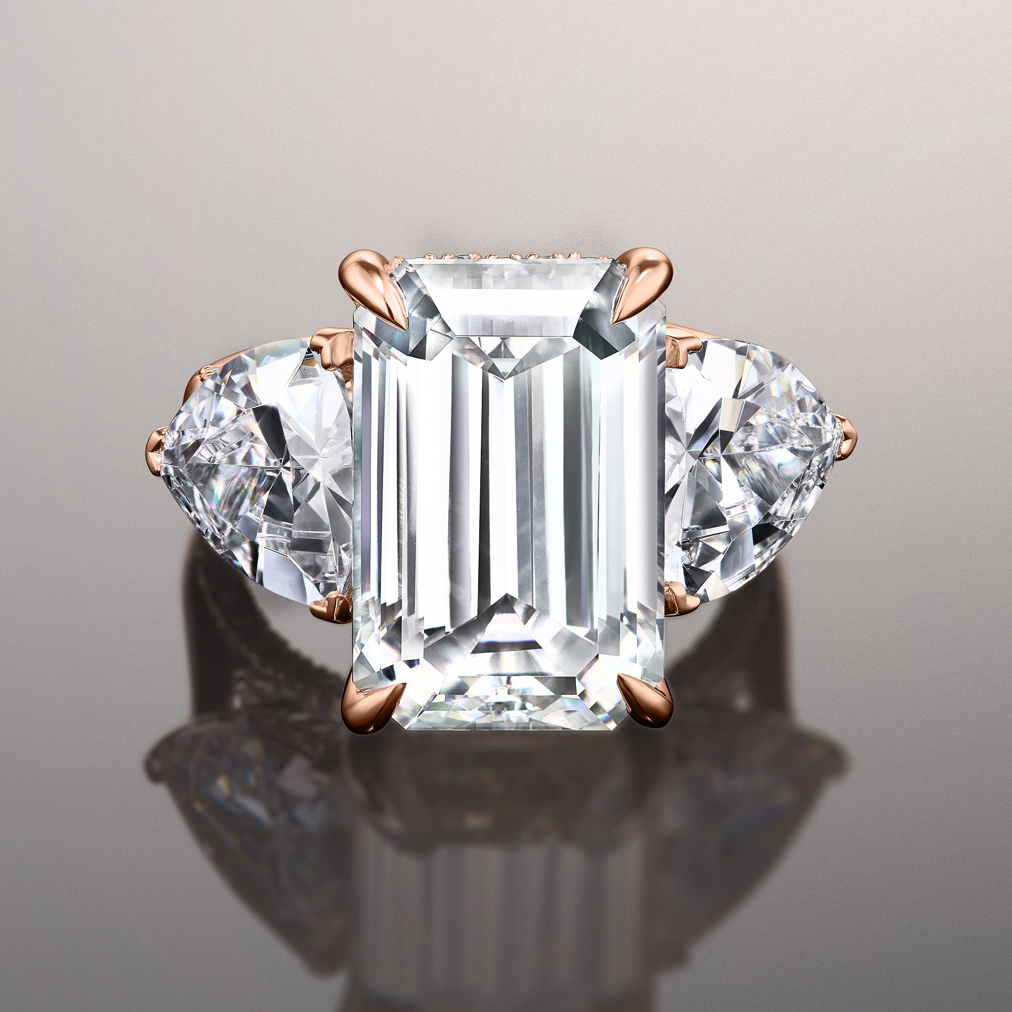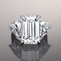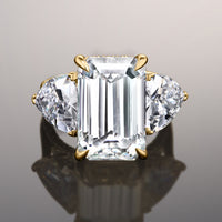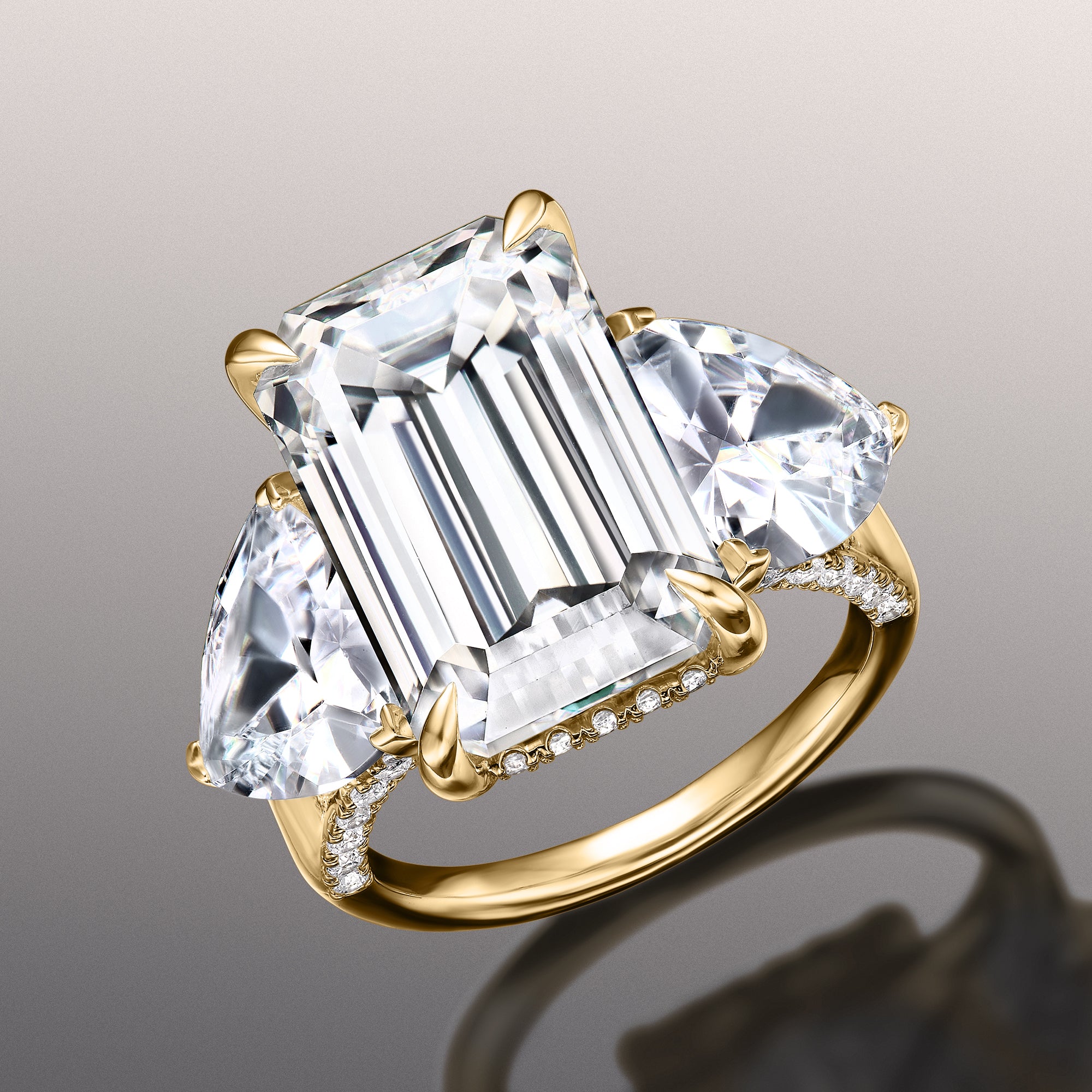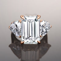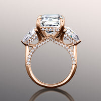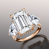 The Bierstadt is a three-stone engagement ring made to turn heads. It oozes class and confidence with its dramatic silhouette. The ring boasts an imposing 12.0 ct emerald-cut diamond with distinctive mirror-like facets. The step-cut center stone is flanked by two 2.0 ct trillion-cut side diamonds on V-shaped prongs. Petite round diamonds trace the rail on each prong setting. More round diamonds adorn the gallery, allowing the ring to exhibit a beautiful symphony of glitter and shine.