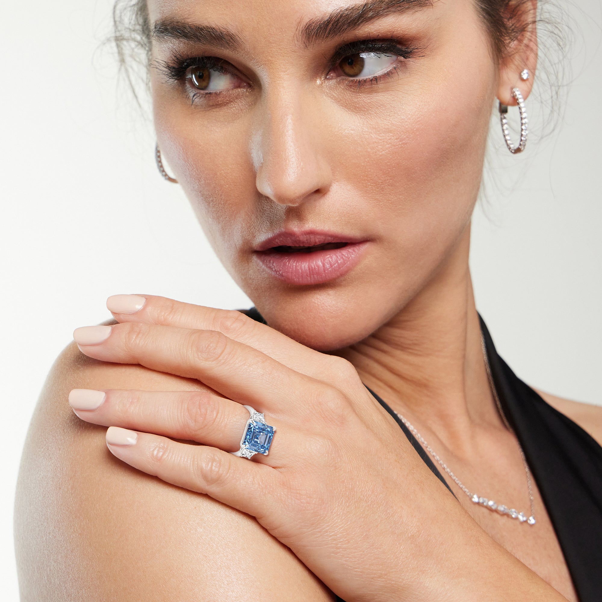 This three stone ring features an icy blue center diamond. The deep aqua hues make for the perfect conversation starter. The contrast complements your unique love story and style, making for an incomparable choice.