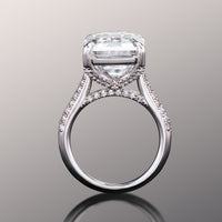 The Braque ring will immediately catch one's attention. It boasts a bodacious 15.0 ct emerald-cut diamond center stone on a shapely cathedral shank. Two rows of glittering round diamonds line the shank's arching shoulders to complement the mirror-like shine of the elongated and chiseled step-cut center diamond. Further supplementing the richness of the ring are petite round diamonds tracing the four-prong setting and the band's bridge.