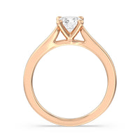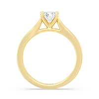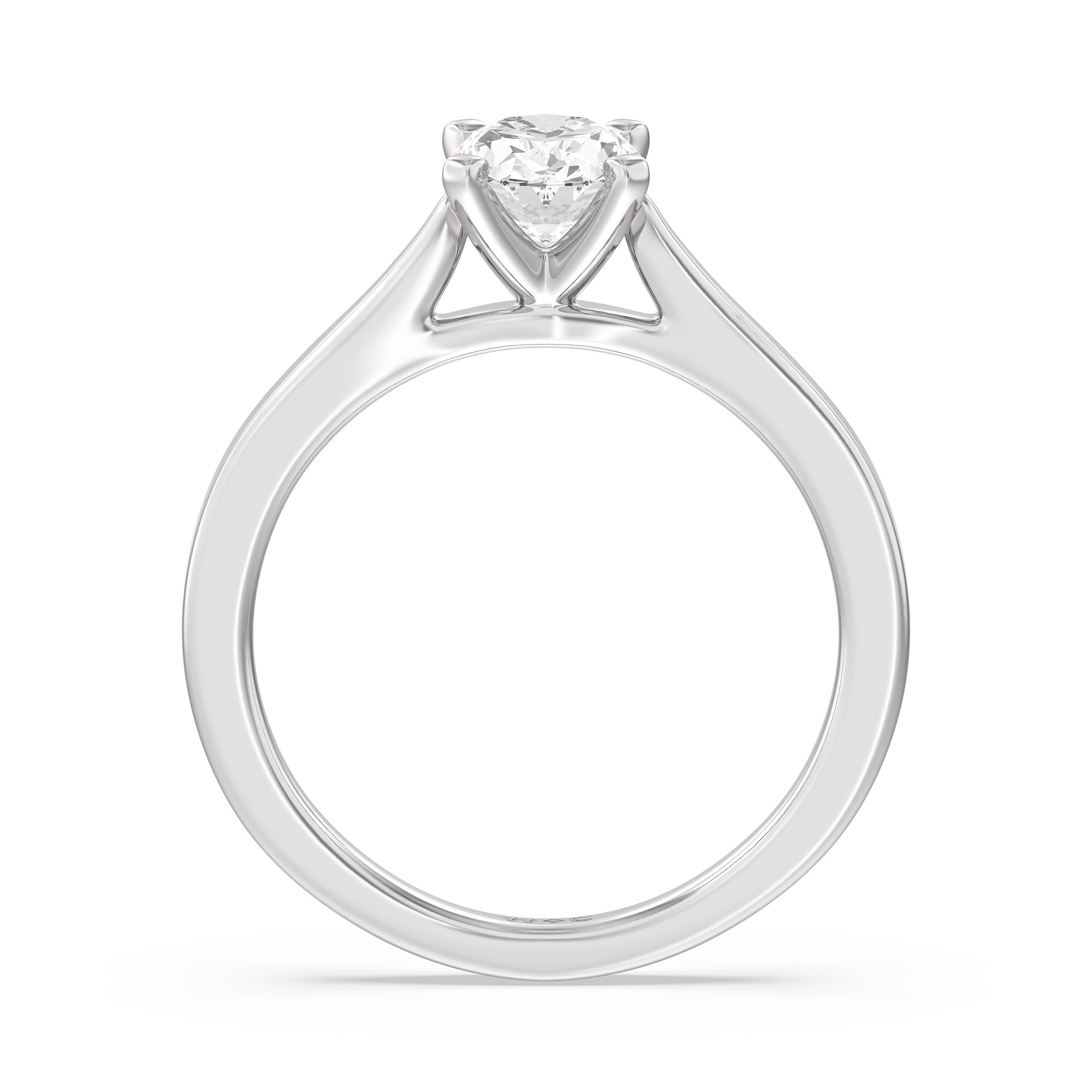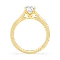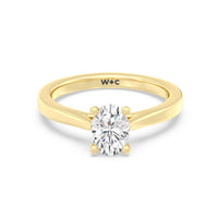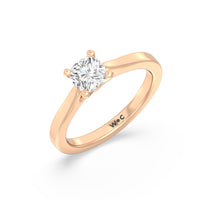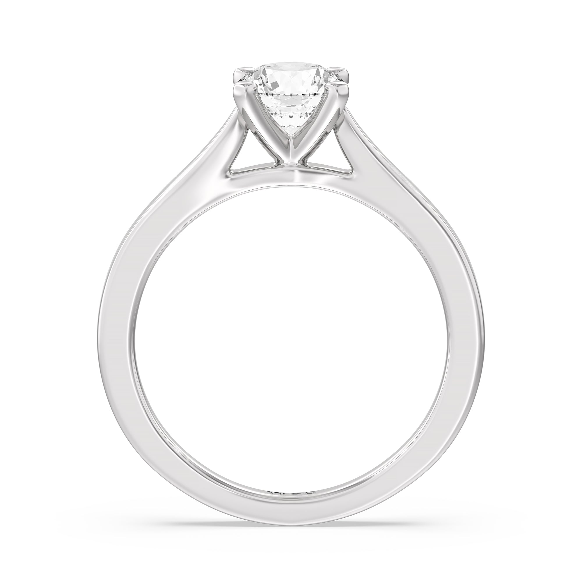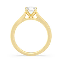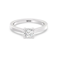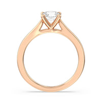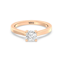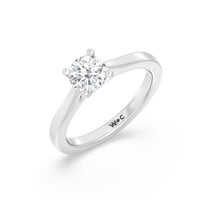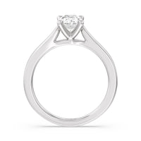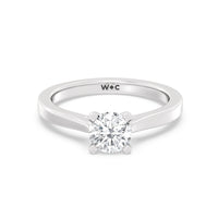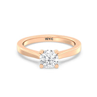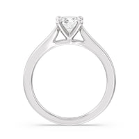 The Bridget Engagement Ring is a classic solitaire with a broad cathedral shank. It has a round diamond centre stone mounted on a four-prong square head setting.