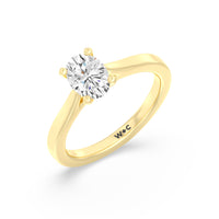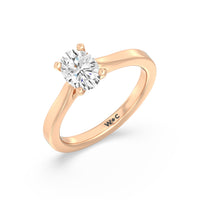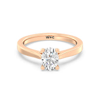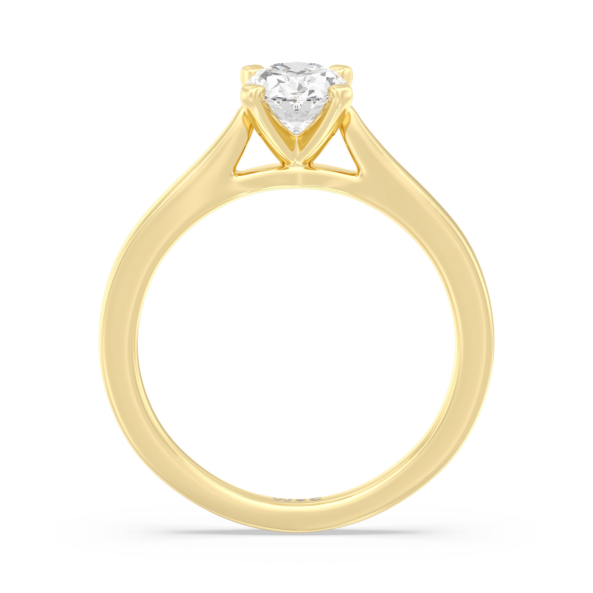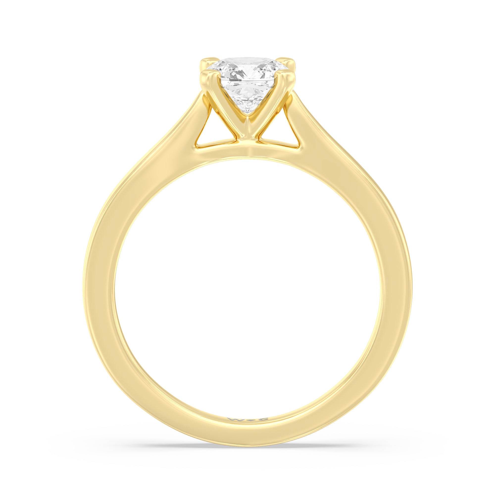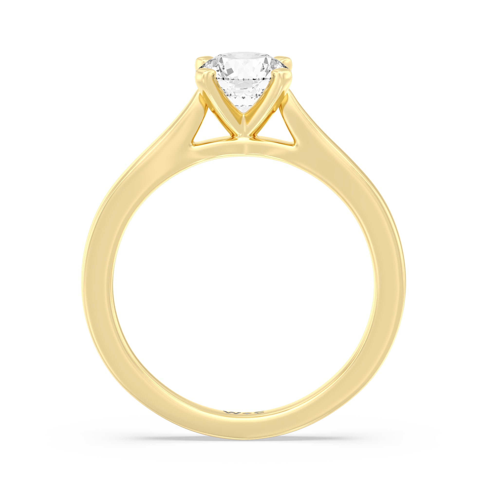 The Bridget Engagement Ring is a classic solitaire with a broad cathedral shank. It has a round diamond centre stone mounted on a four-prong square head setting.
