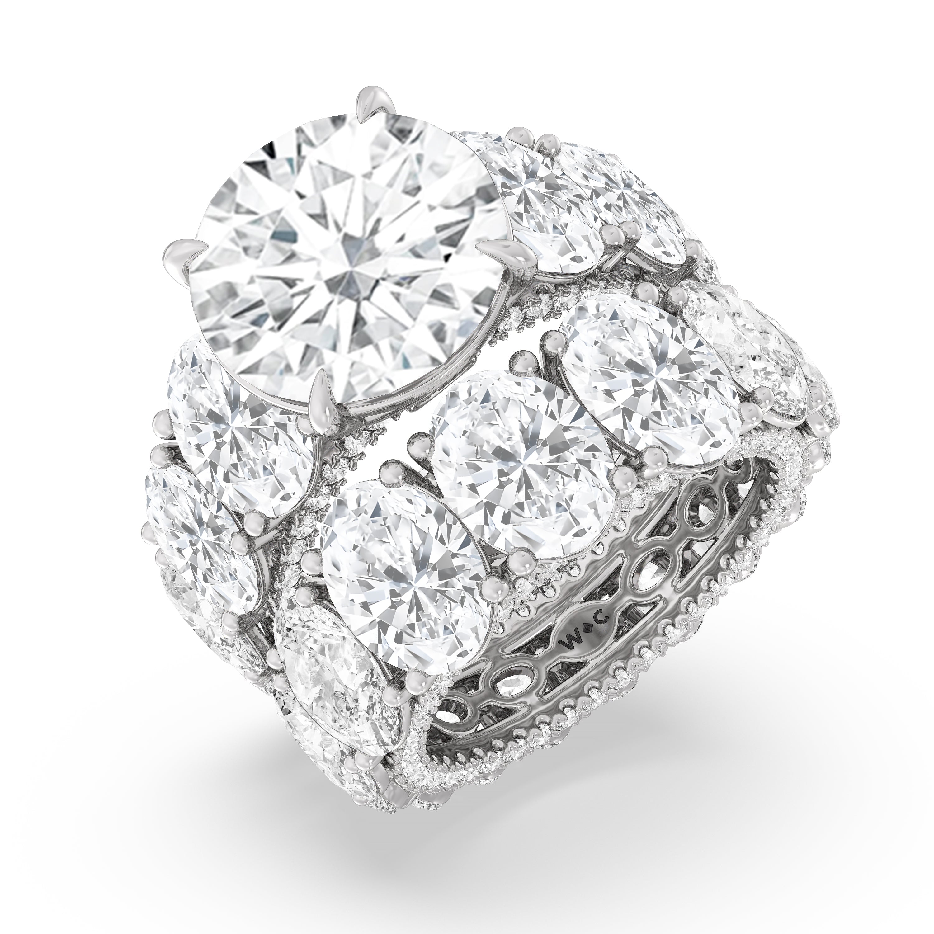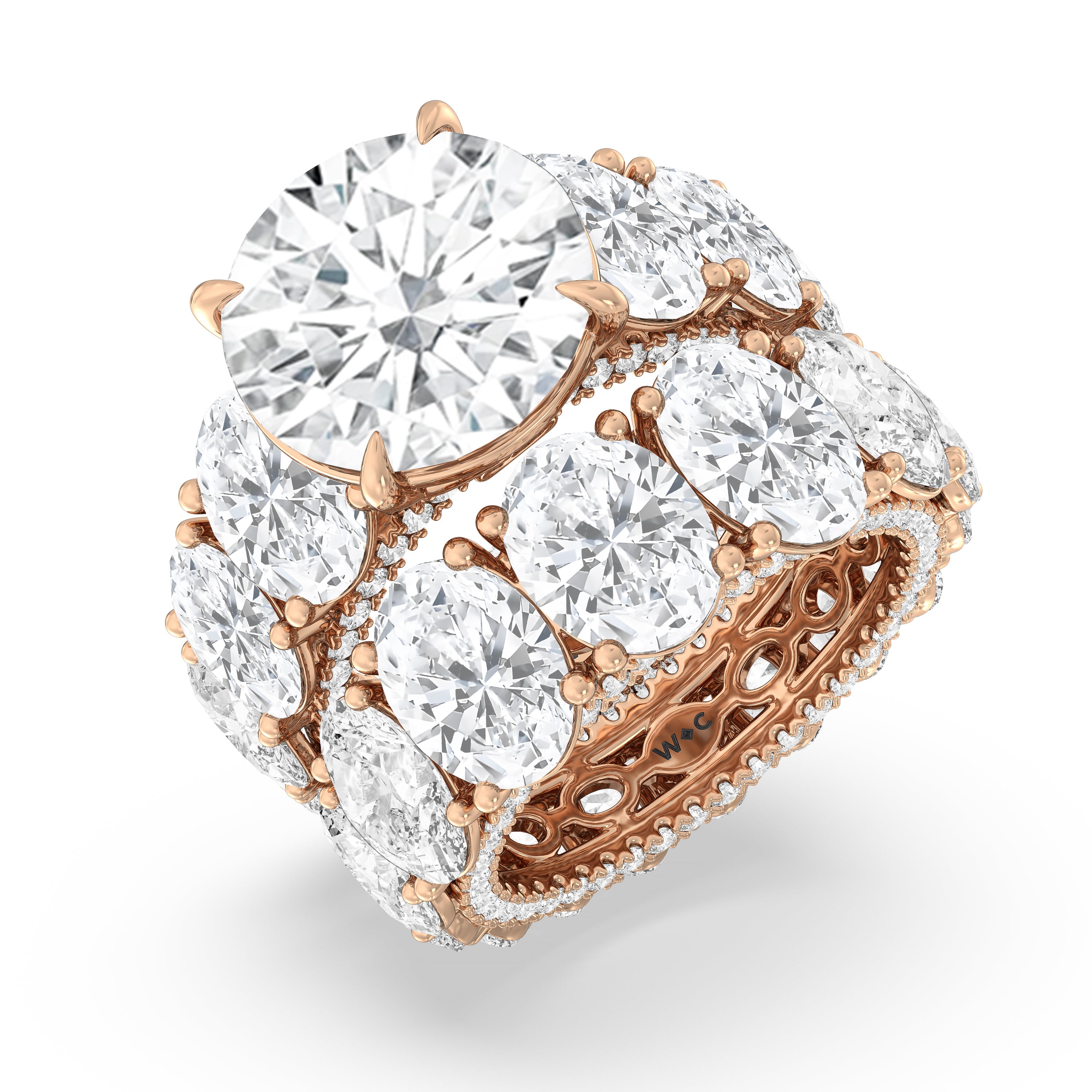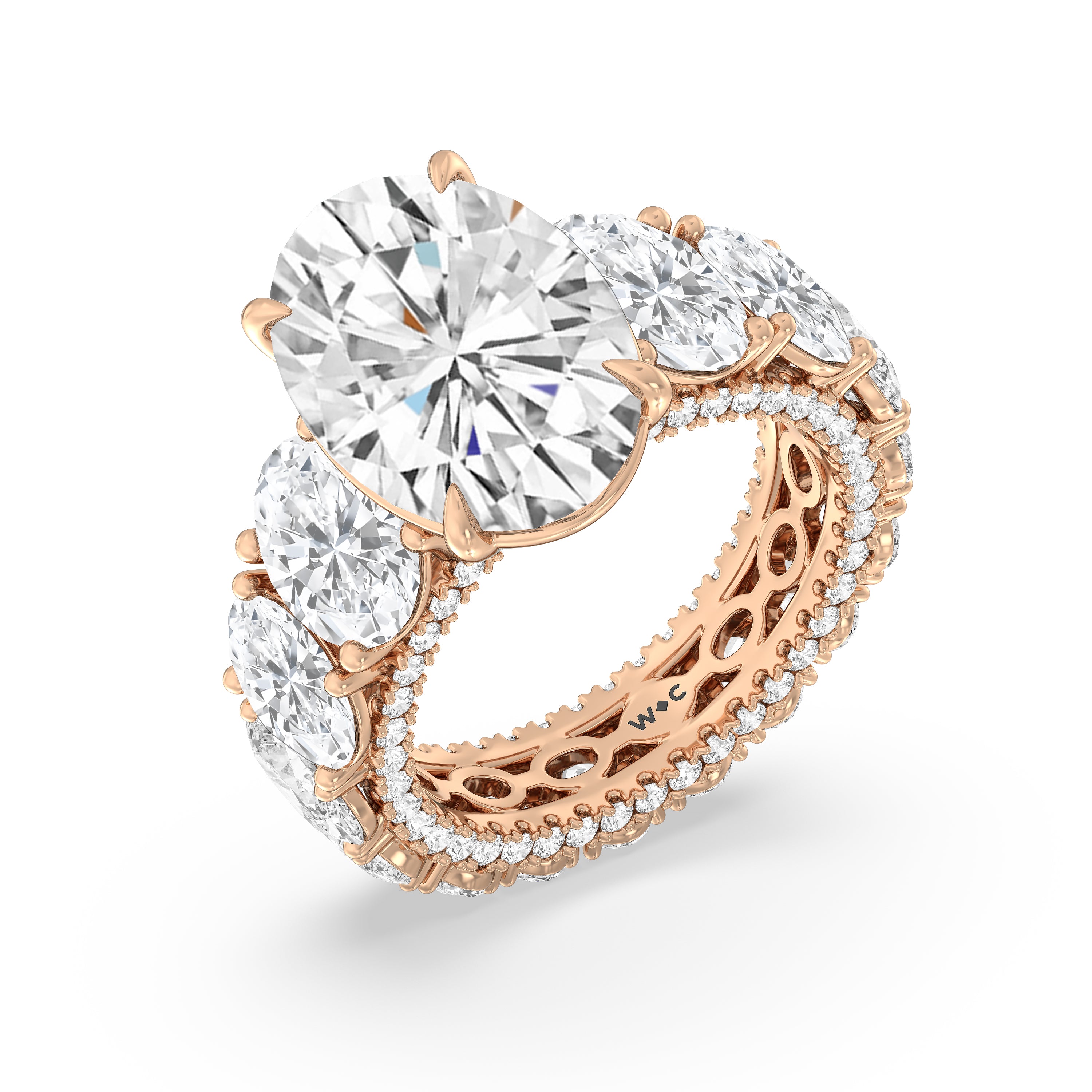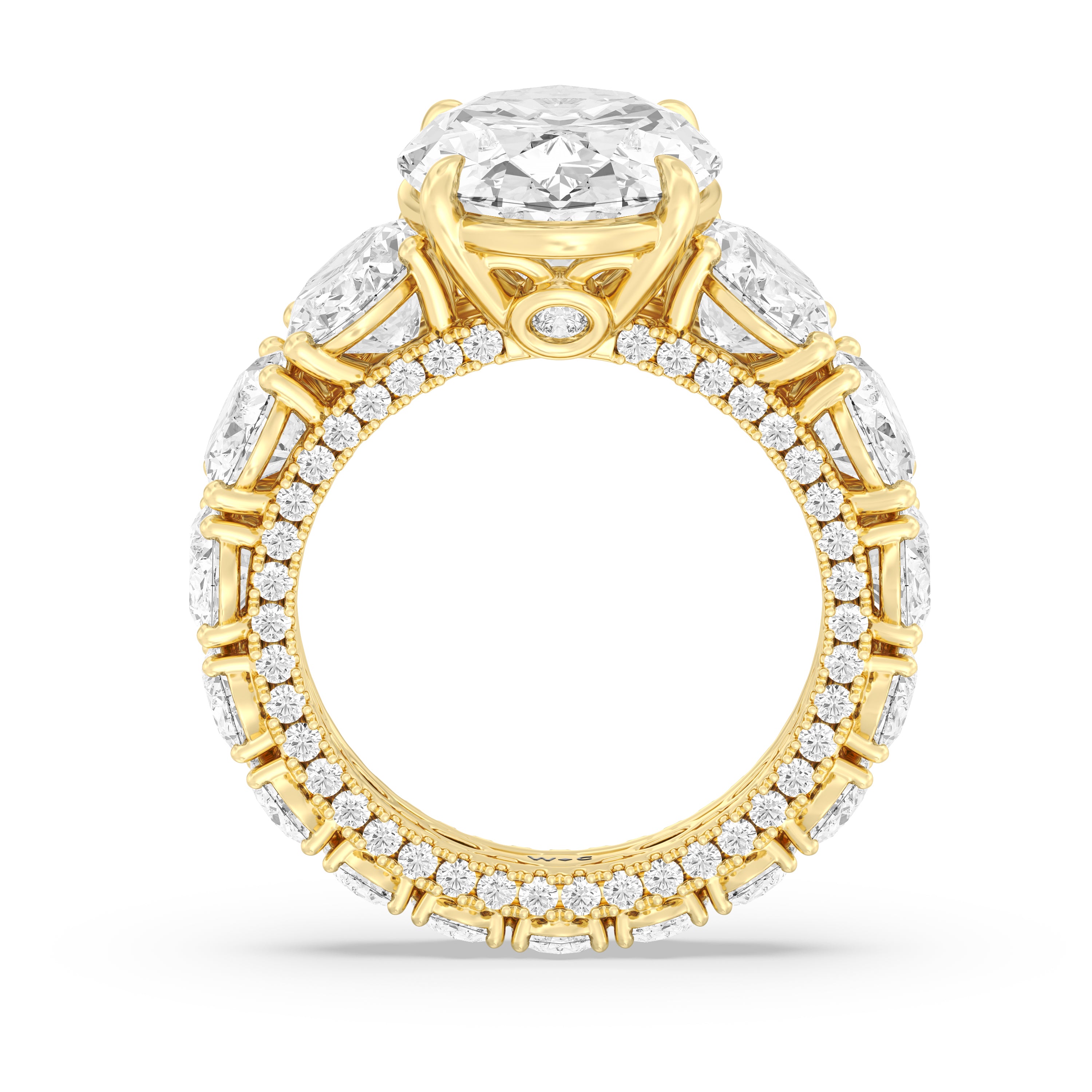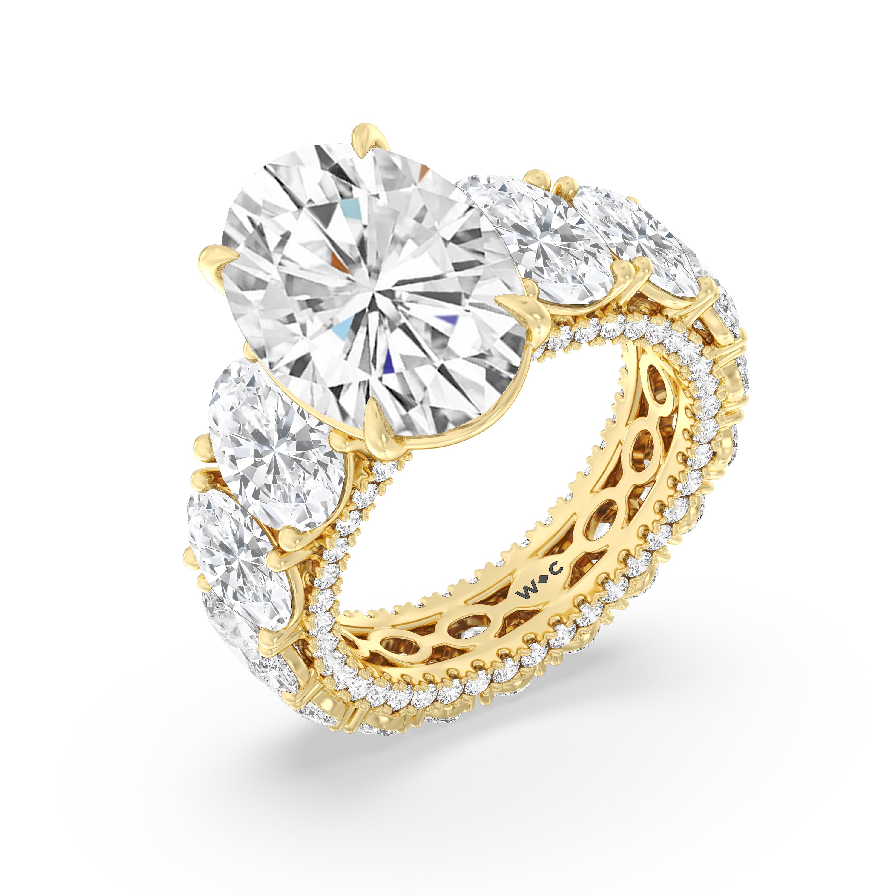 This engagement ring encapsulates the richness of your love story. It boasts a stunning diamond center stone, in a round, oval, or emerald cut. Boosting the sparkle of the central gem are 14 oval diamonds in tapering sizes, covering the entire circumference of the band. A bezel-set peek-a-boo round diamond dot the base of the claw prong setting that raises the center stone. Surrounding the ring's inner perimeter are prong-set round diamonds for a remarkable glow.