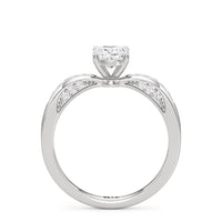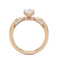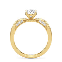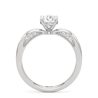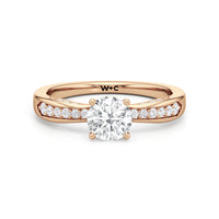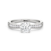 This classic solitaire presents an interesting detail. Its reverse tapered shank features humped shoulders pave-set with round diamonds. Taking centrestage is a diamond mounted securely on a four-prong setting. The hidden diamonds positioned on both sides of the shank maximises the ring's brilliance.