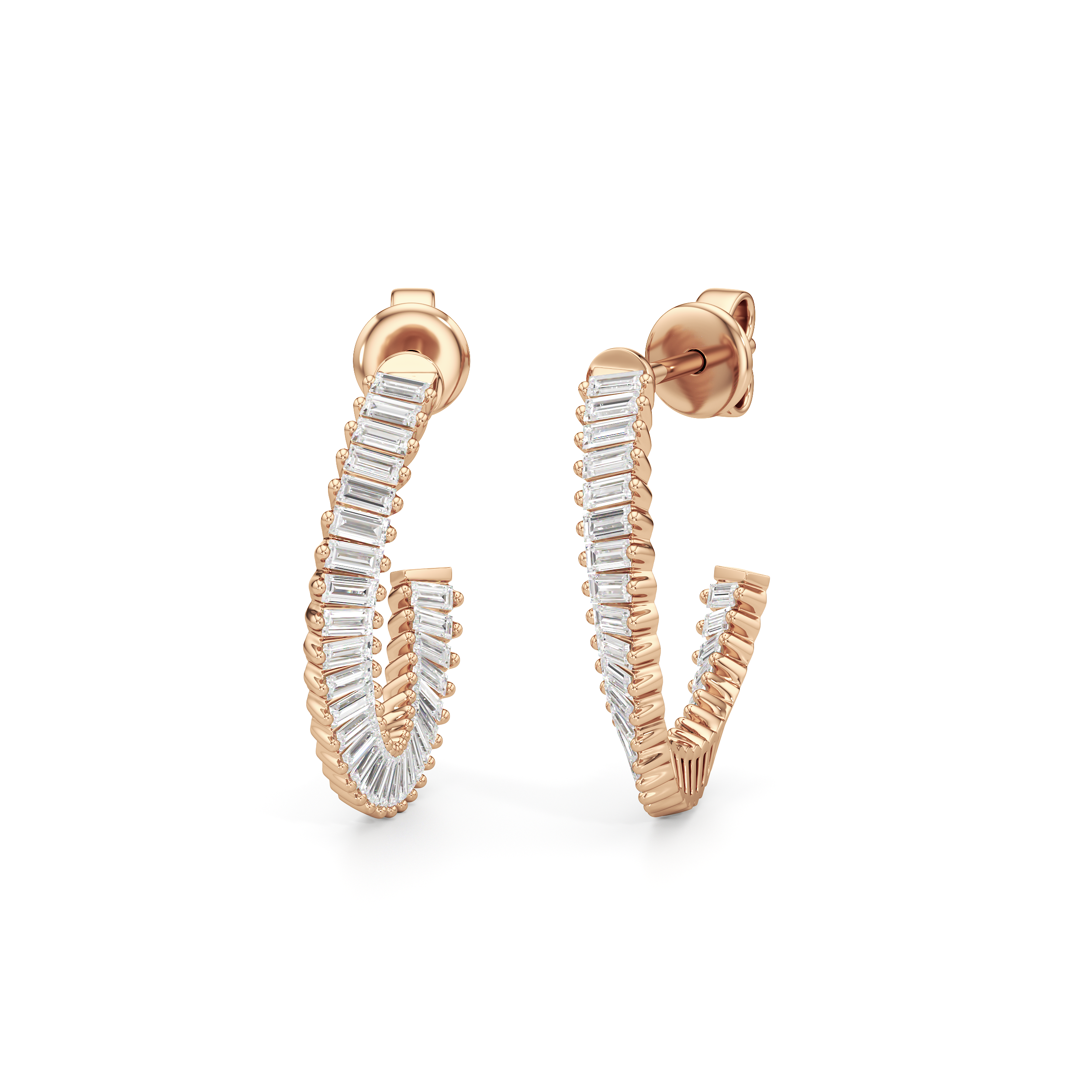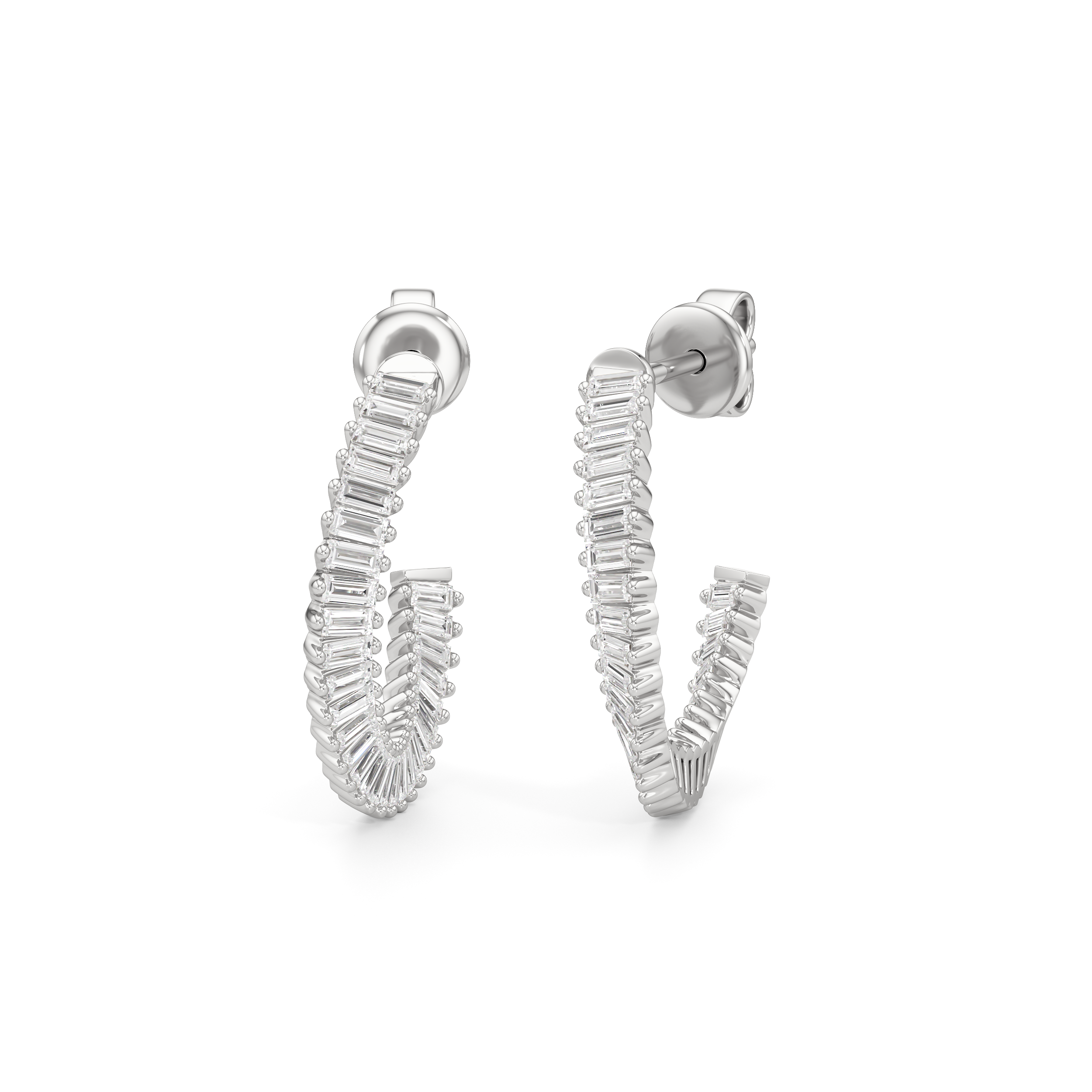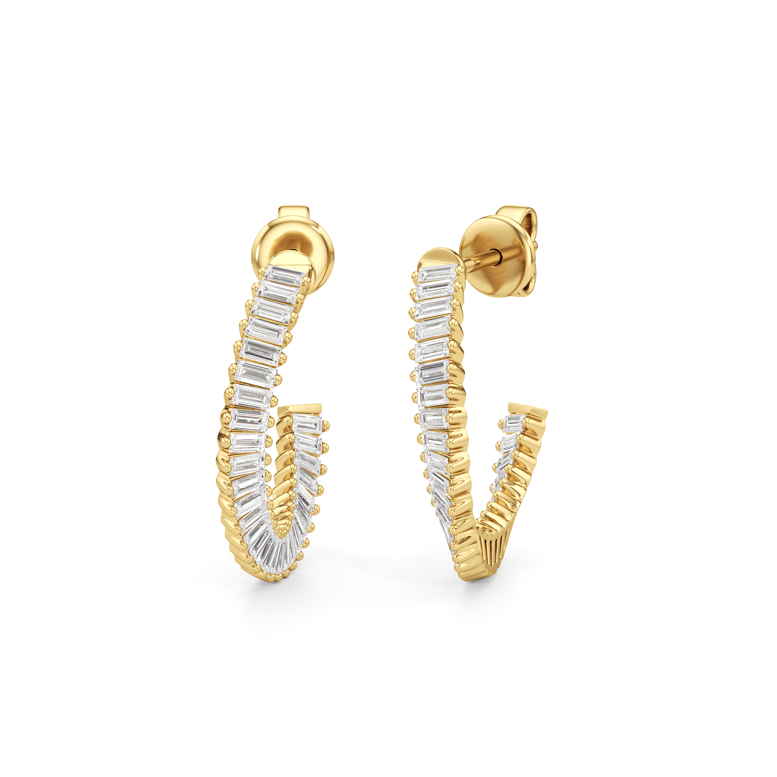 The earrings that will effortlessly infuse modern elegance into any ensemble. This pair features a series of baguette diamonds gracefully set along sleek, faceted C-hoops. The stepped facets of the elongated, rectangular-cut diamonds create a mirror-like shine, catching the light from every perspective.