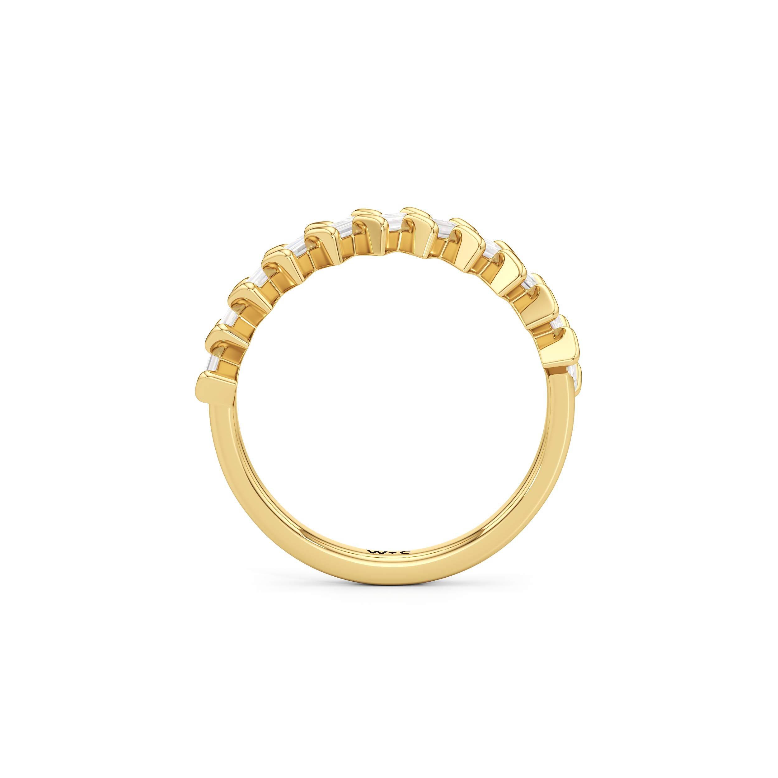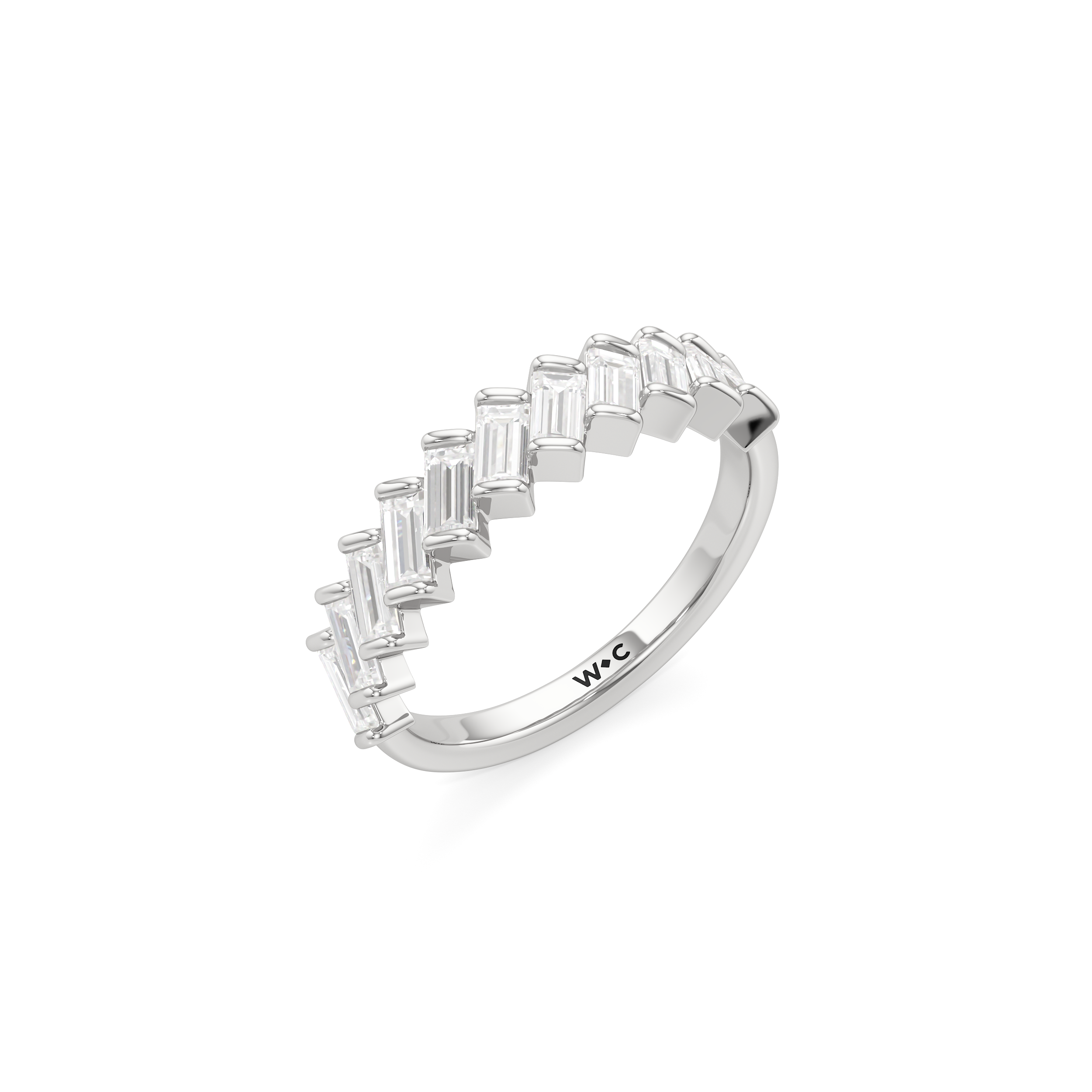 A vision of edgy elegance. This ring features a stepped row of step-cut diamonds tracing half of its circumference. The baguette diamonds are set on half bezels, allowing ample light to enter from different angles while ensuring protection against knocks and daily wear.