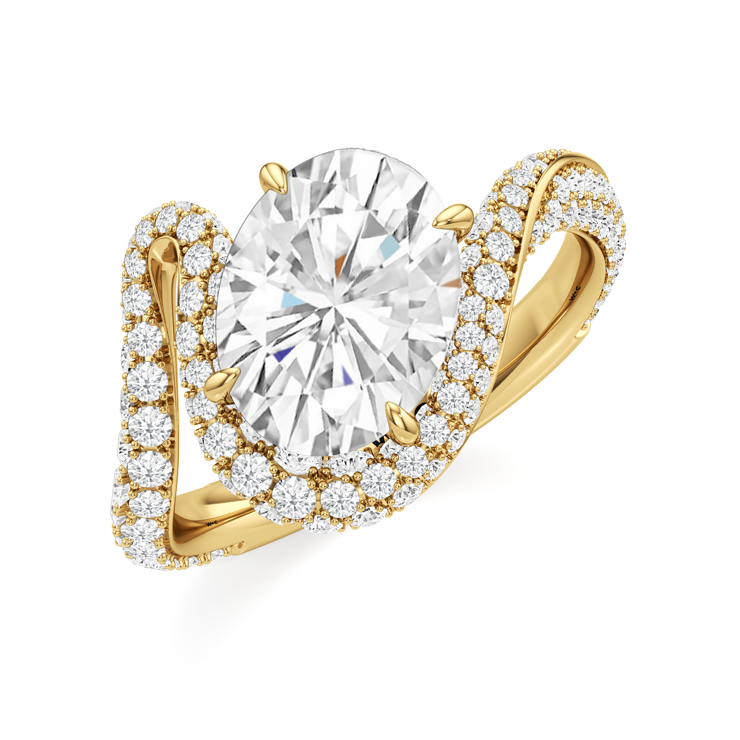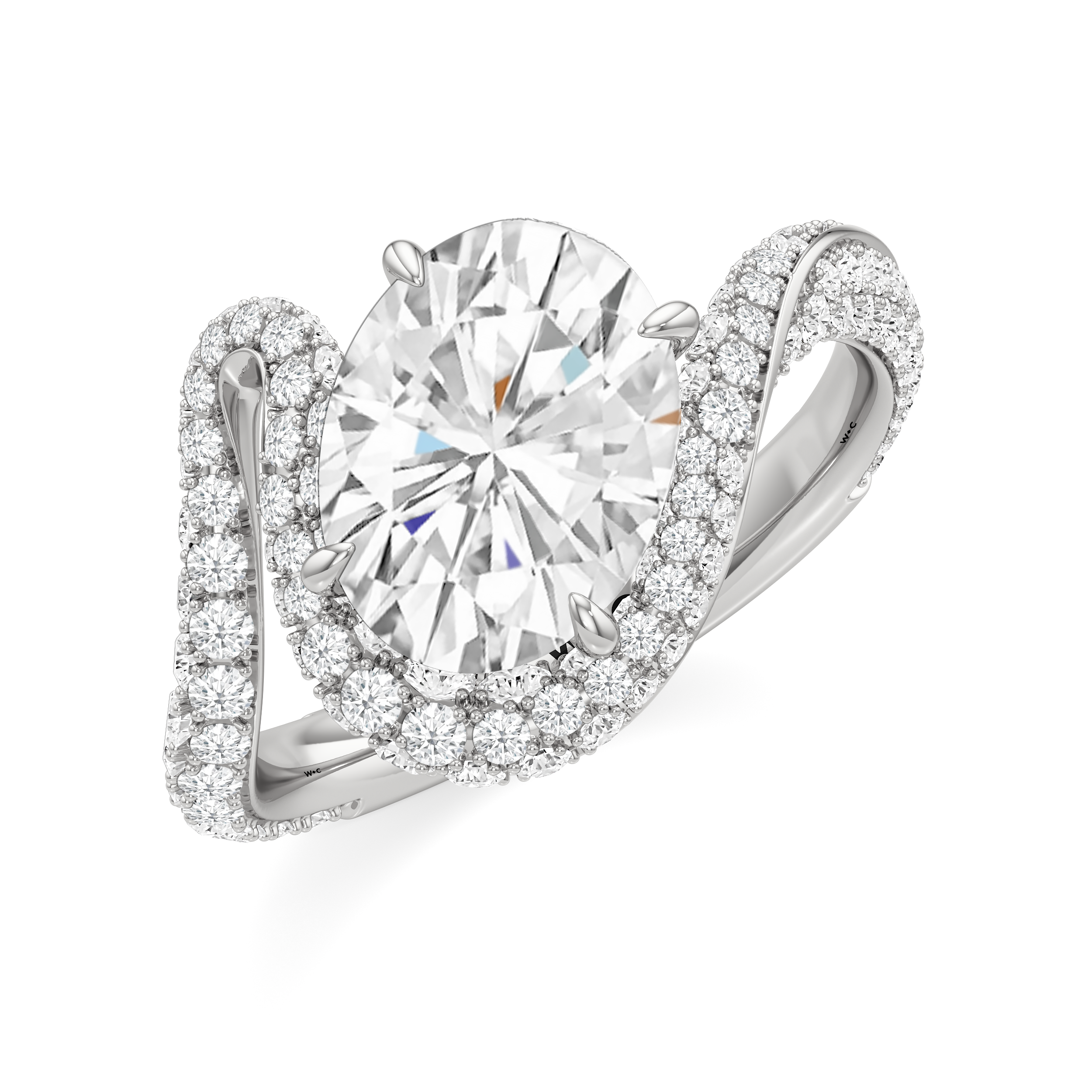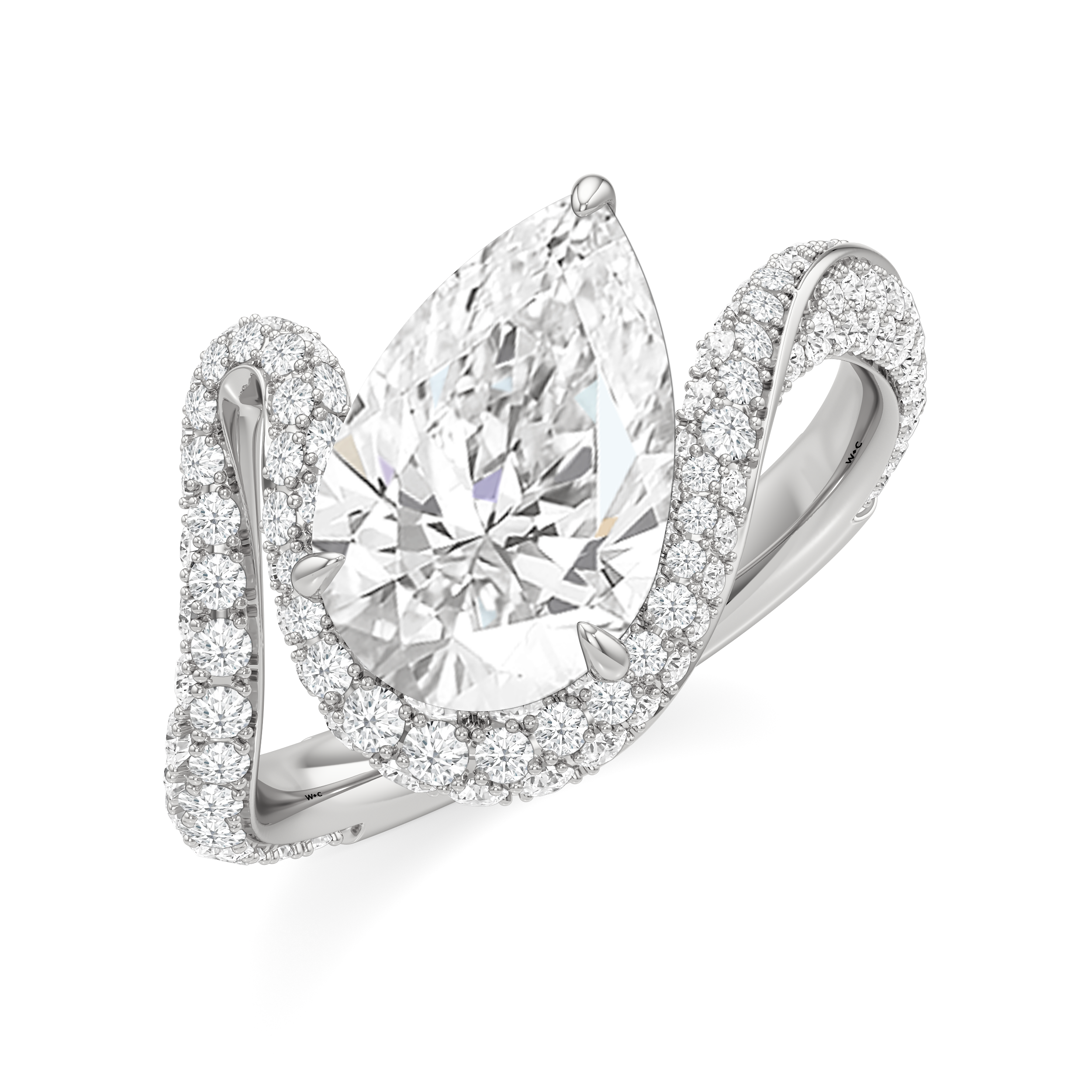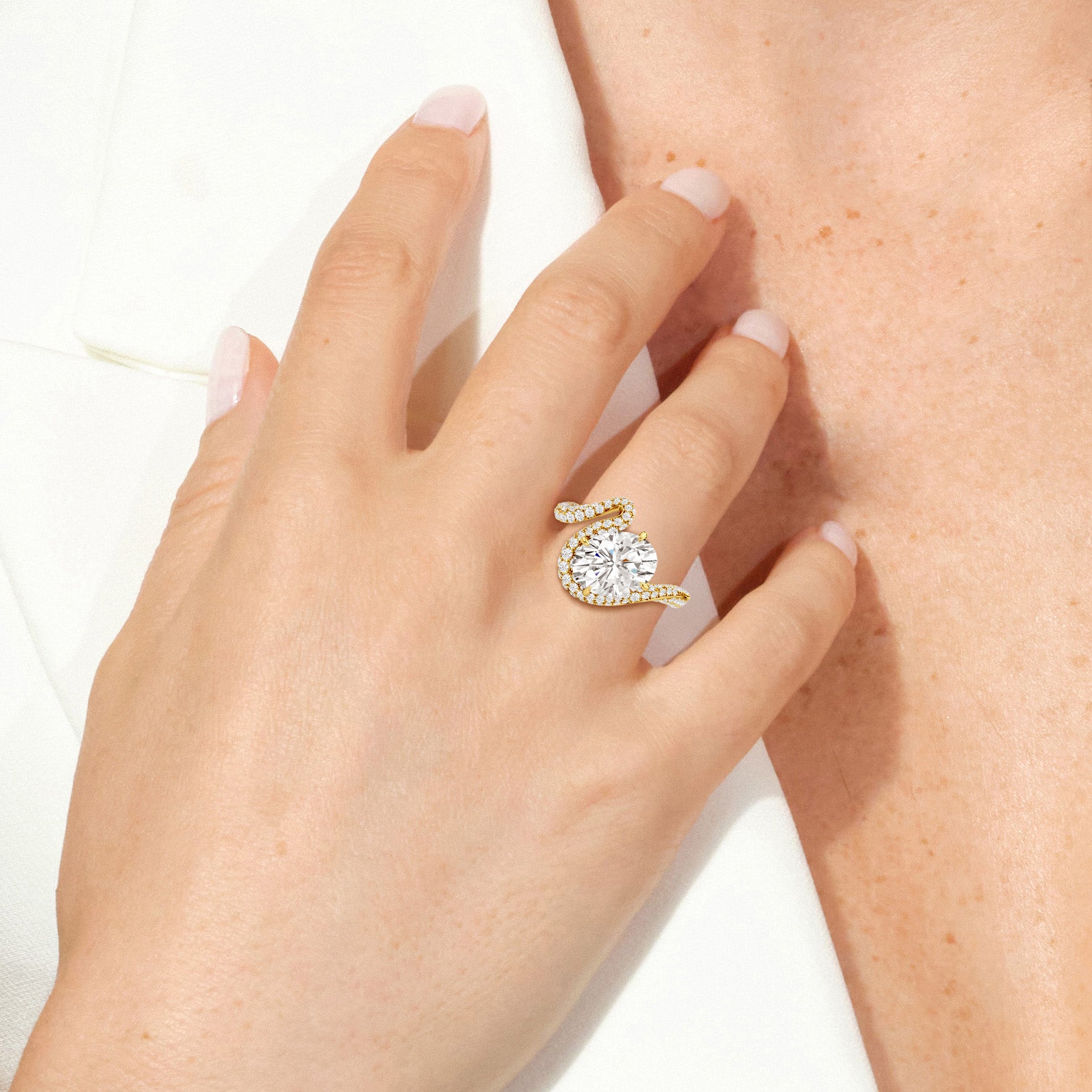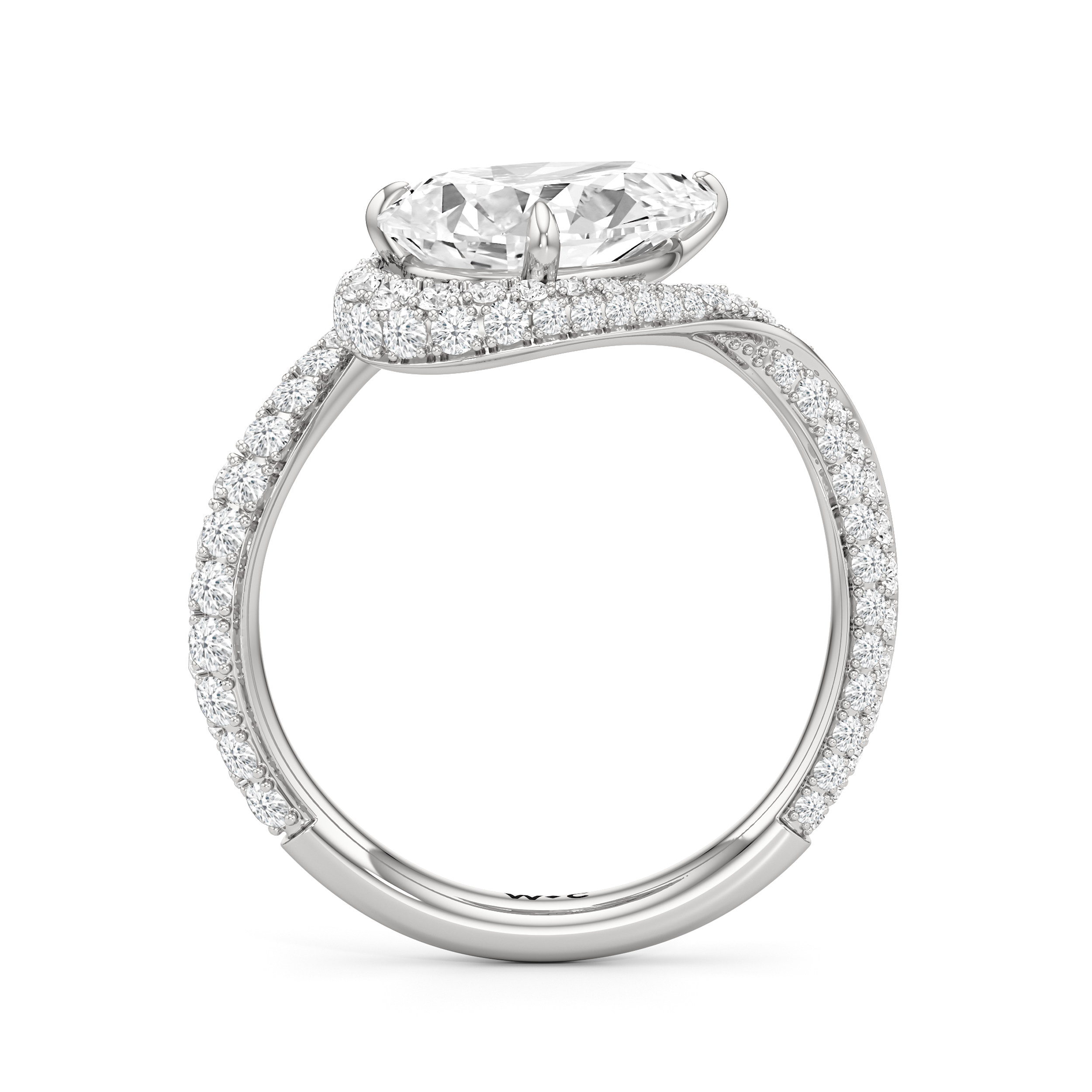 This ring’s flowing lines sweep gracefully, cradling a diamond as if caught mid-motion. Petite diamonds trace the waves of metal, ensuring every curve leads to light.