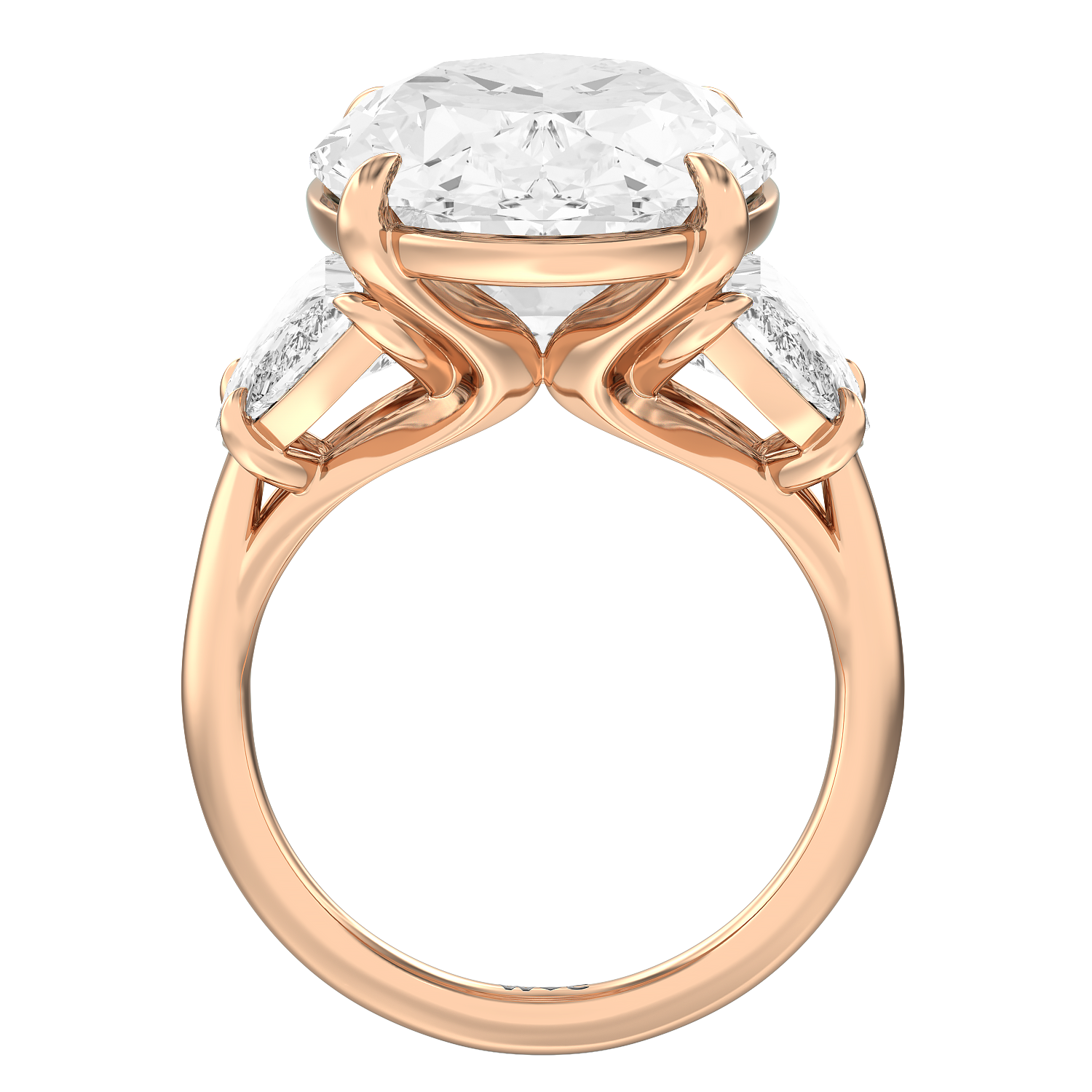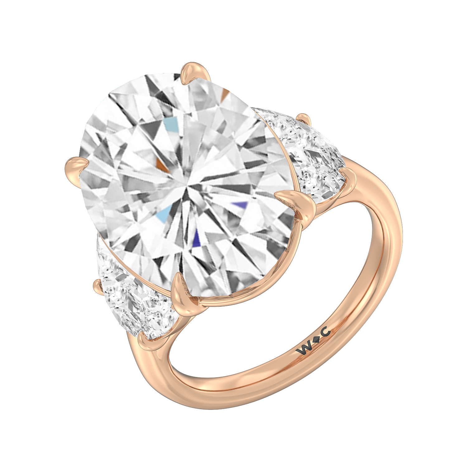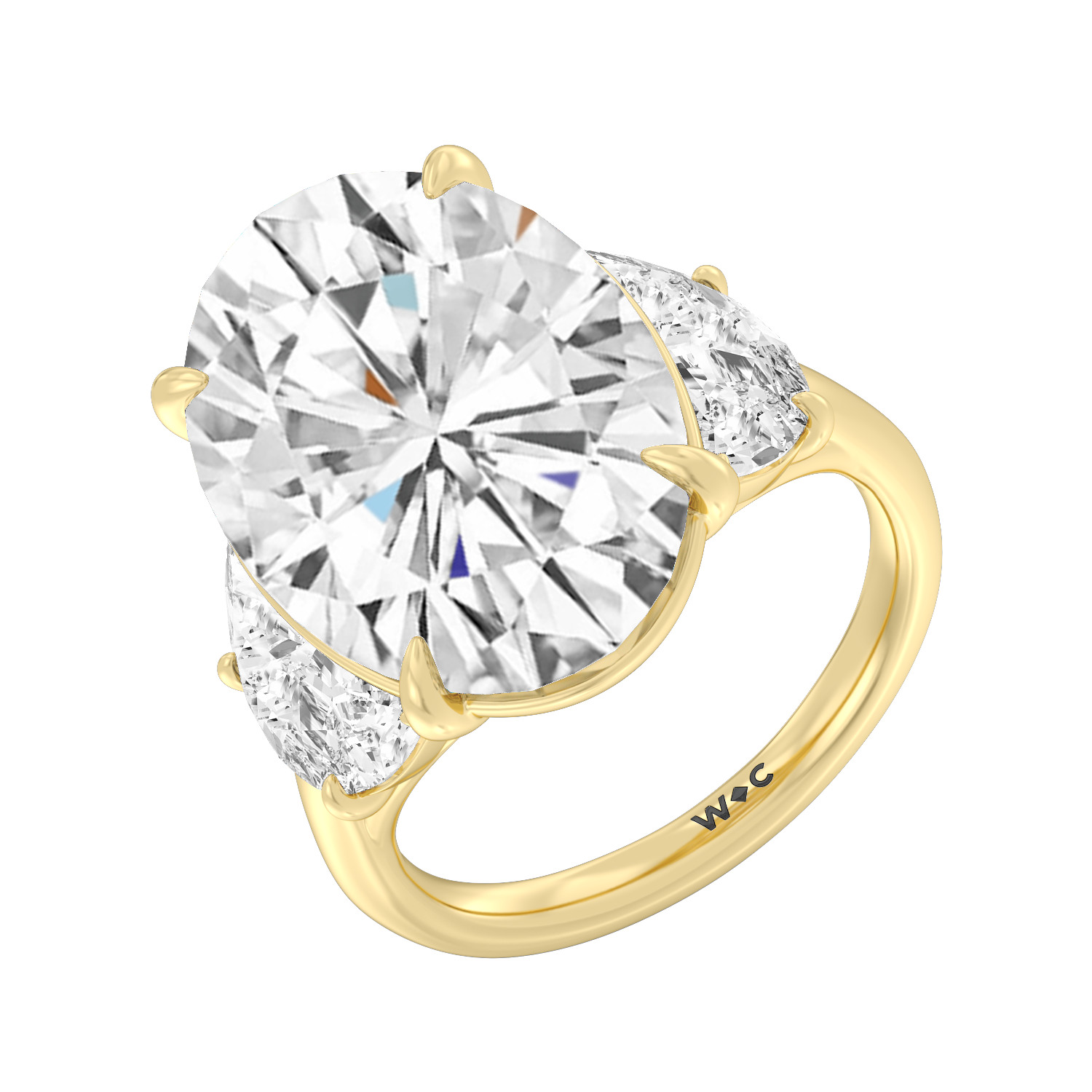 The Cézanne ring presents a clean and straightforward aesthetic that gives the impression of something solid and enduring, much like your love. It ignites envy with its curving contours, sculptural look, and show-stealing brilliance. This sophisticated three-stone engagement ring features a massive 15.0 ct oval diamond center stone flanked by two 1.5 ct half-moon diamond side stones on claw prongs. The side stones in half-moon or demilune-cut enhance the glow of the oval diamond centerpiece while giving the ring an extraordinary flair.