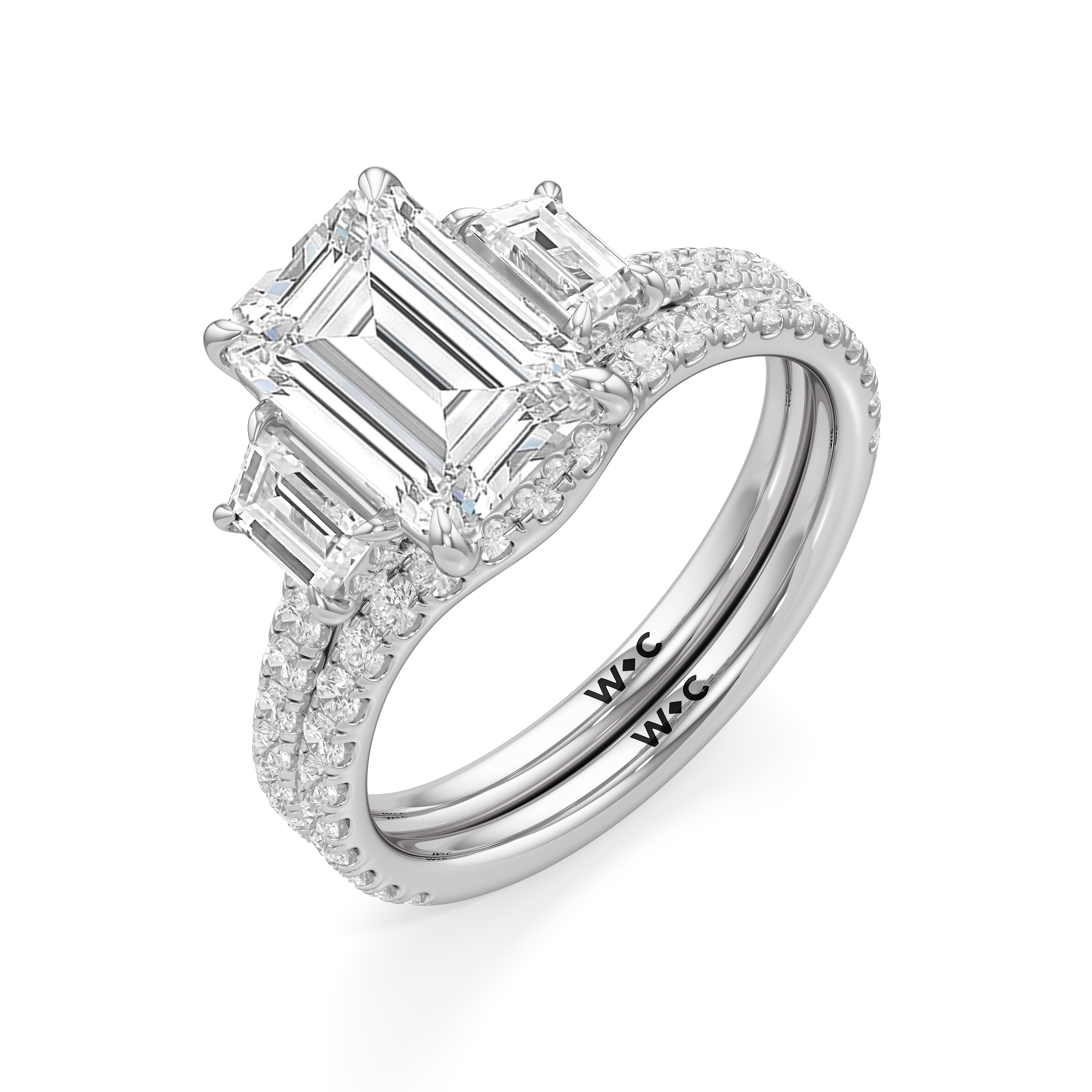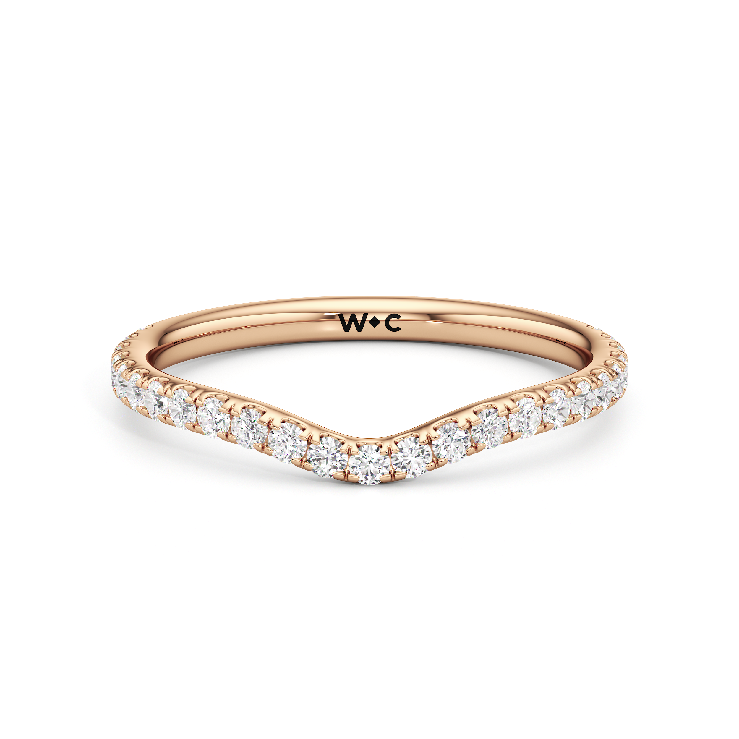 This curved diamond set wedding band is perfectly contoured to complement our the charlotte three stone engagement ring for a simple and sophisticated look.