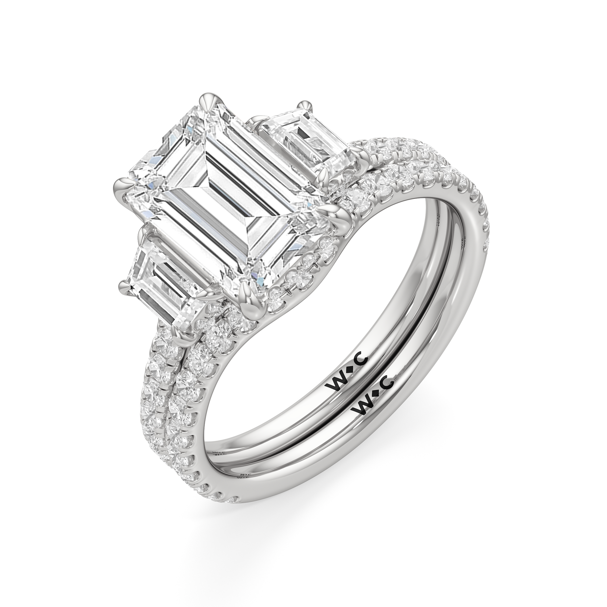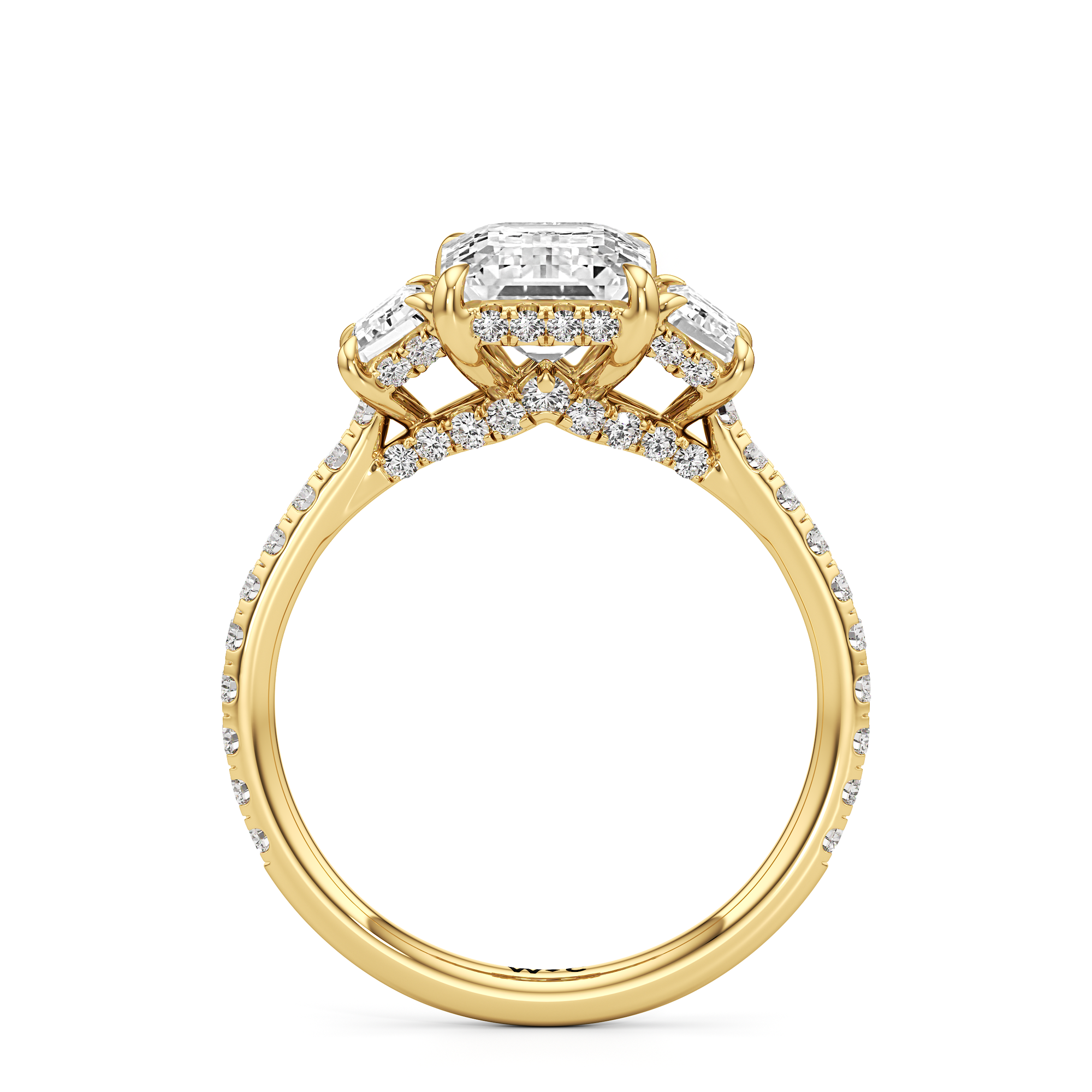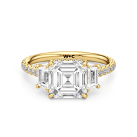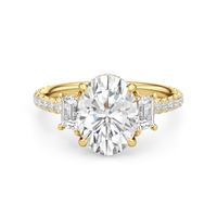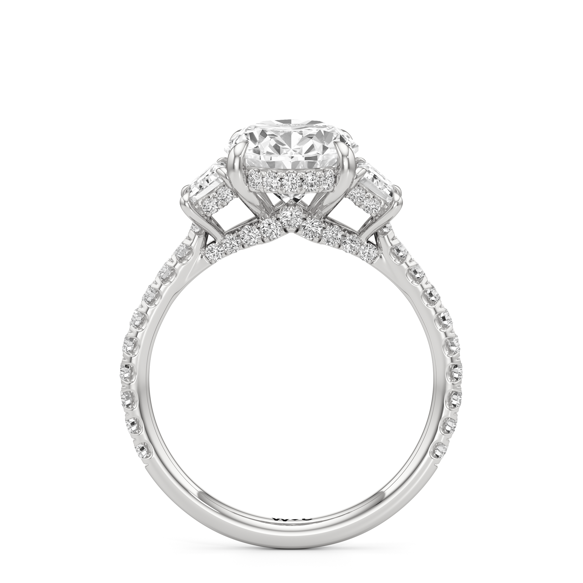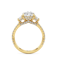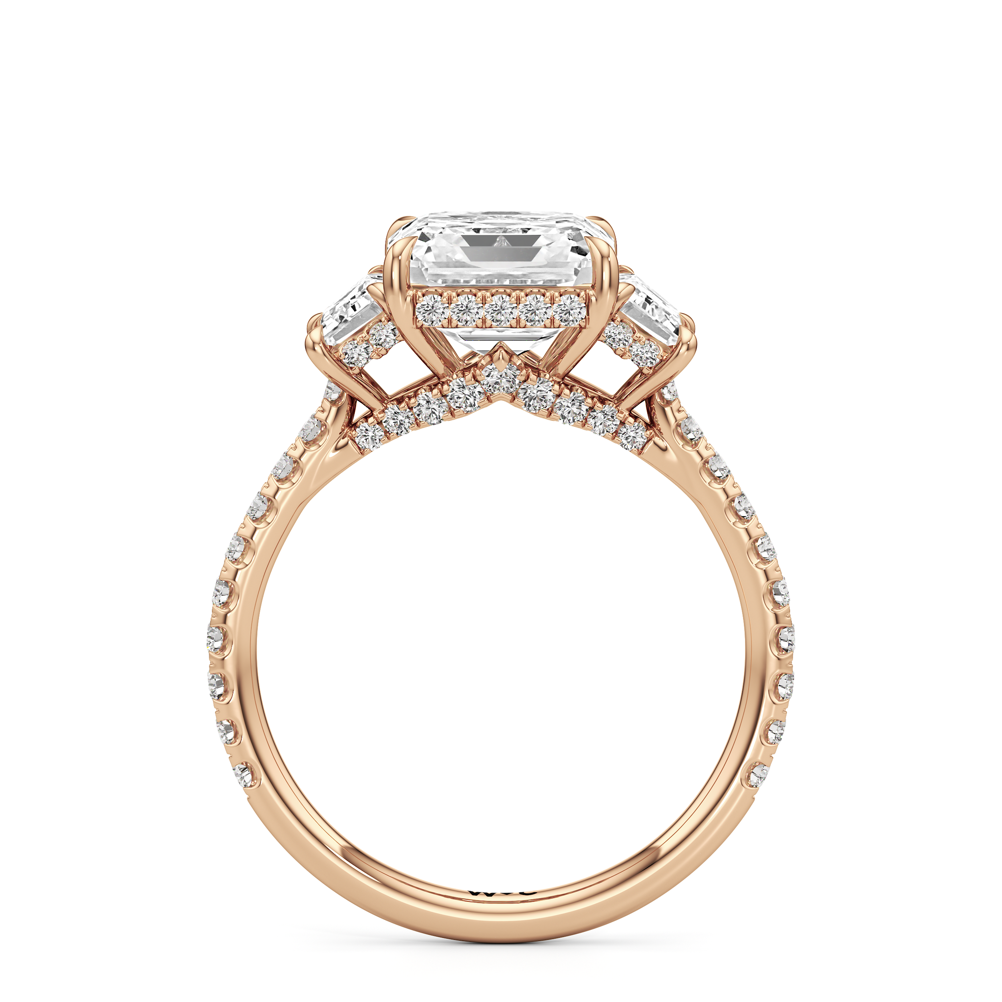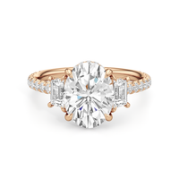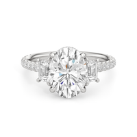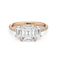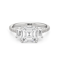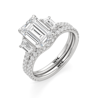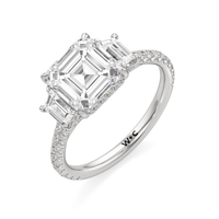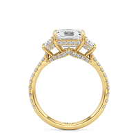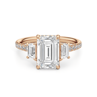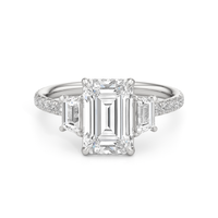A modern three-stone engagement ring for the bride-to-be. This ring with a cathedral setting boasts a duo of uncommon trapezoid-cut diamonds flanking your choice of center stone. Each of the three main gems is further adorned with petite round diamond accents set on narrow bands parallel to the diamond's girdle. Round diamonds on micro prongs also adorn the stylized bridge and the sloping shoulders of the ring.