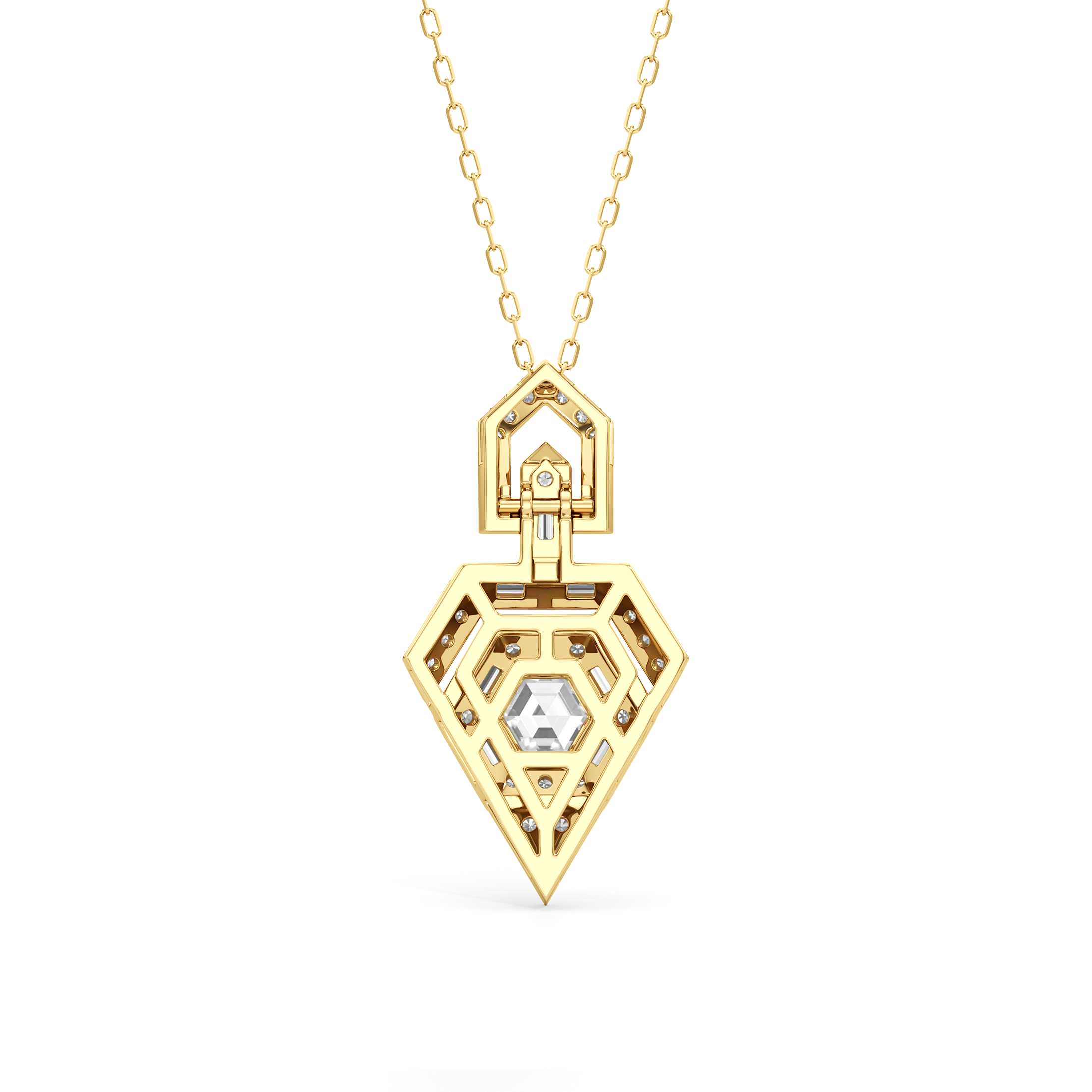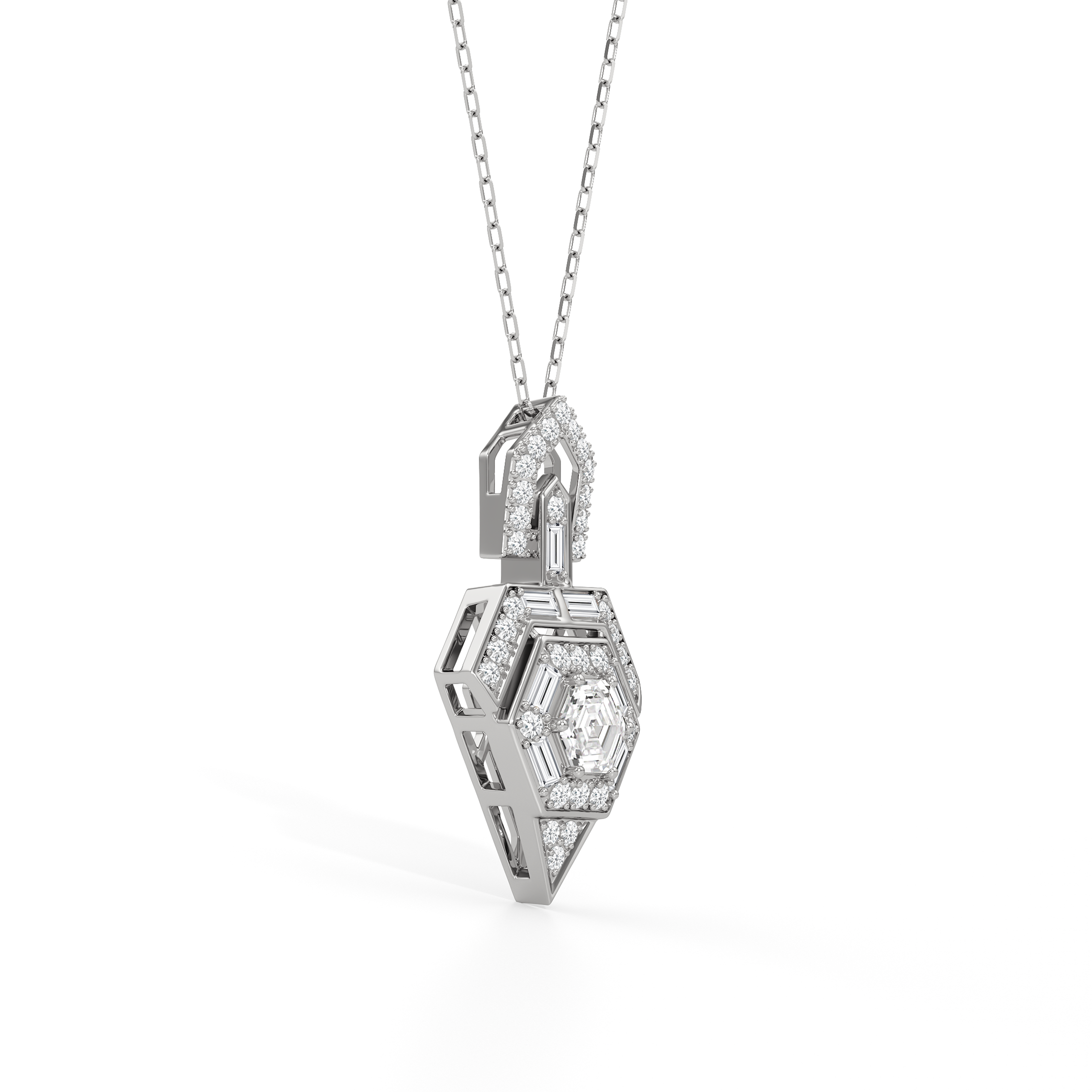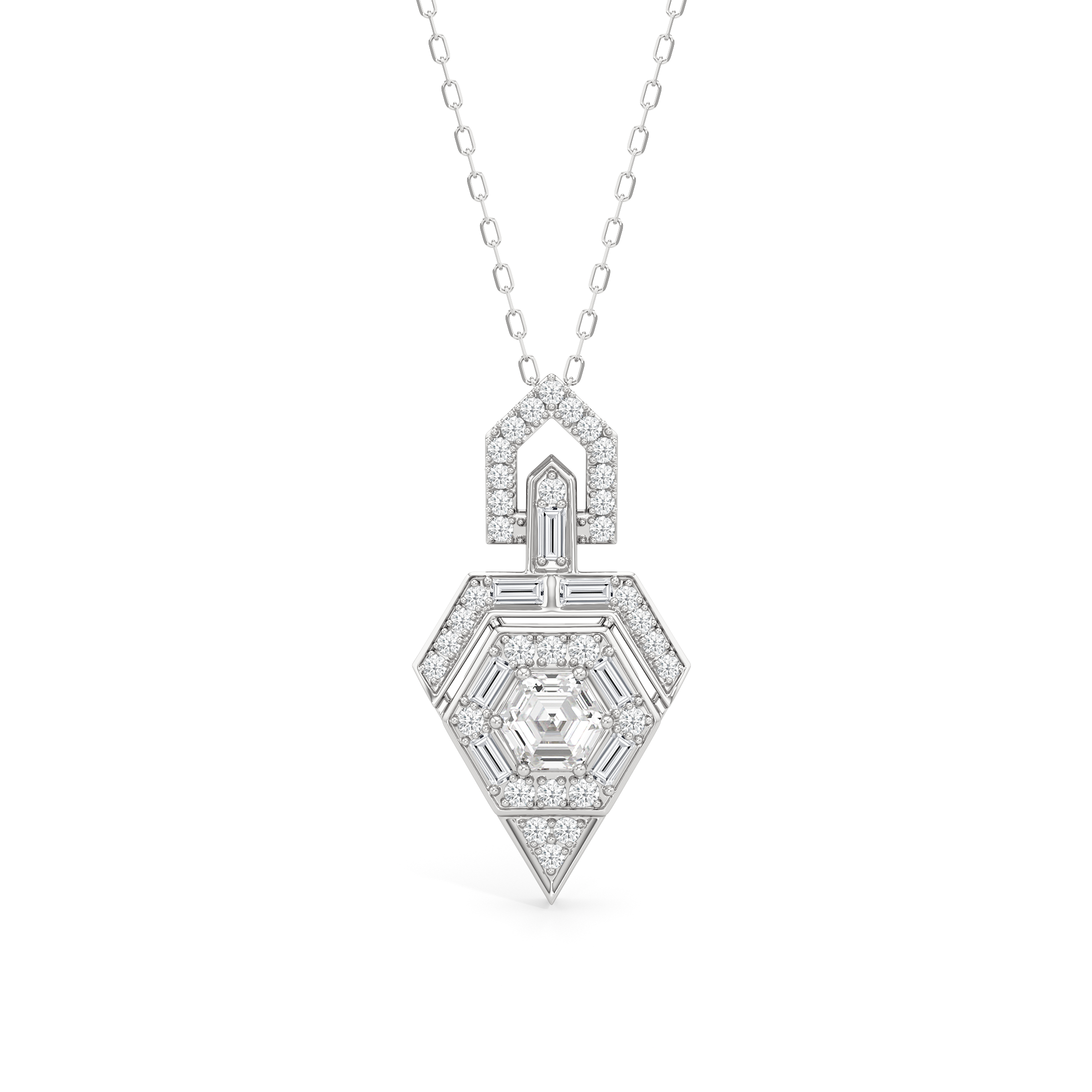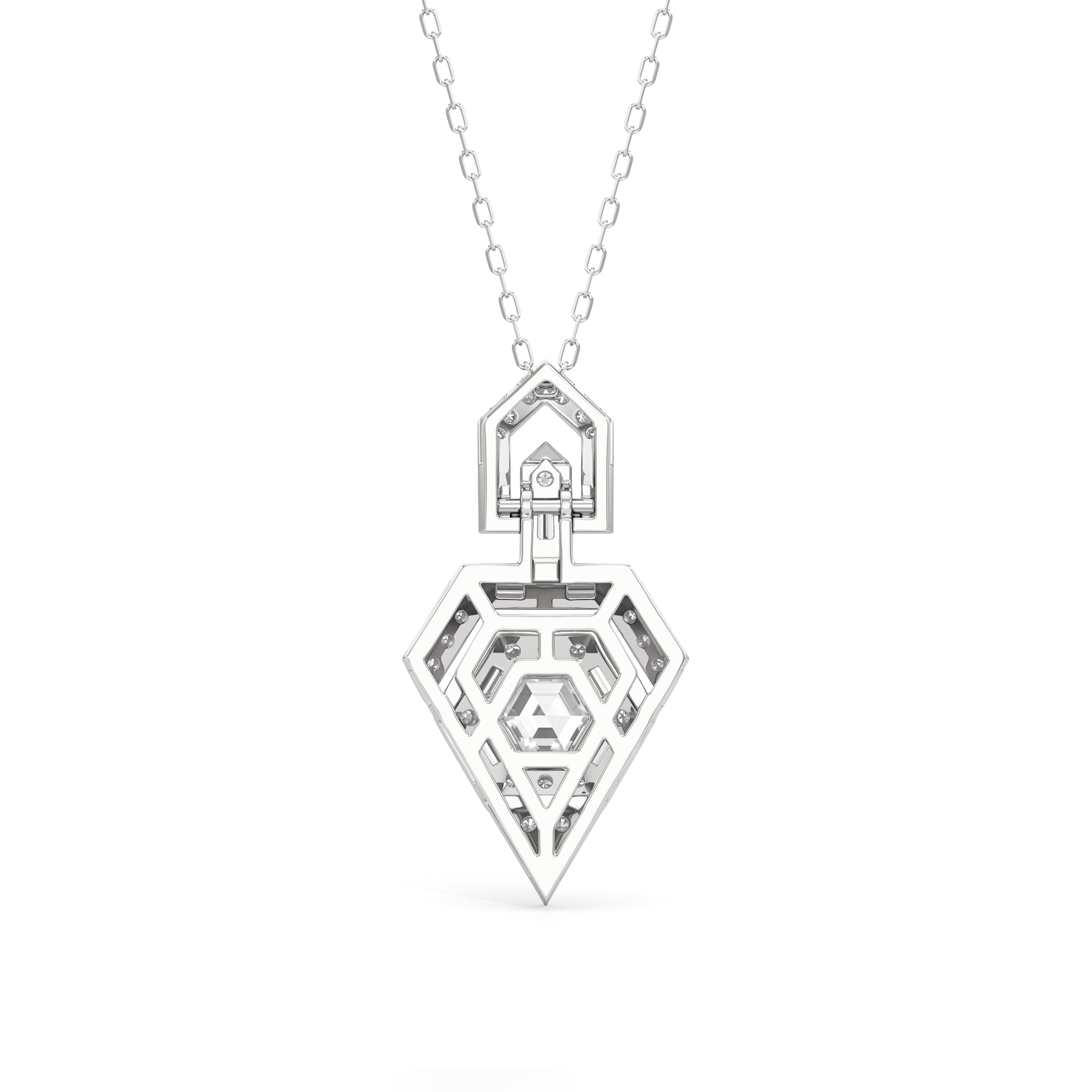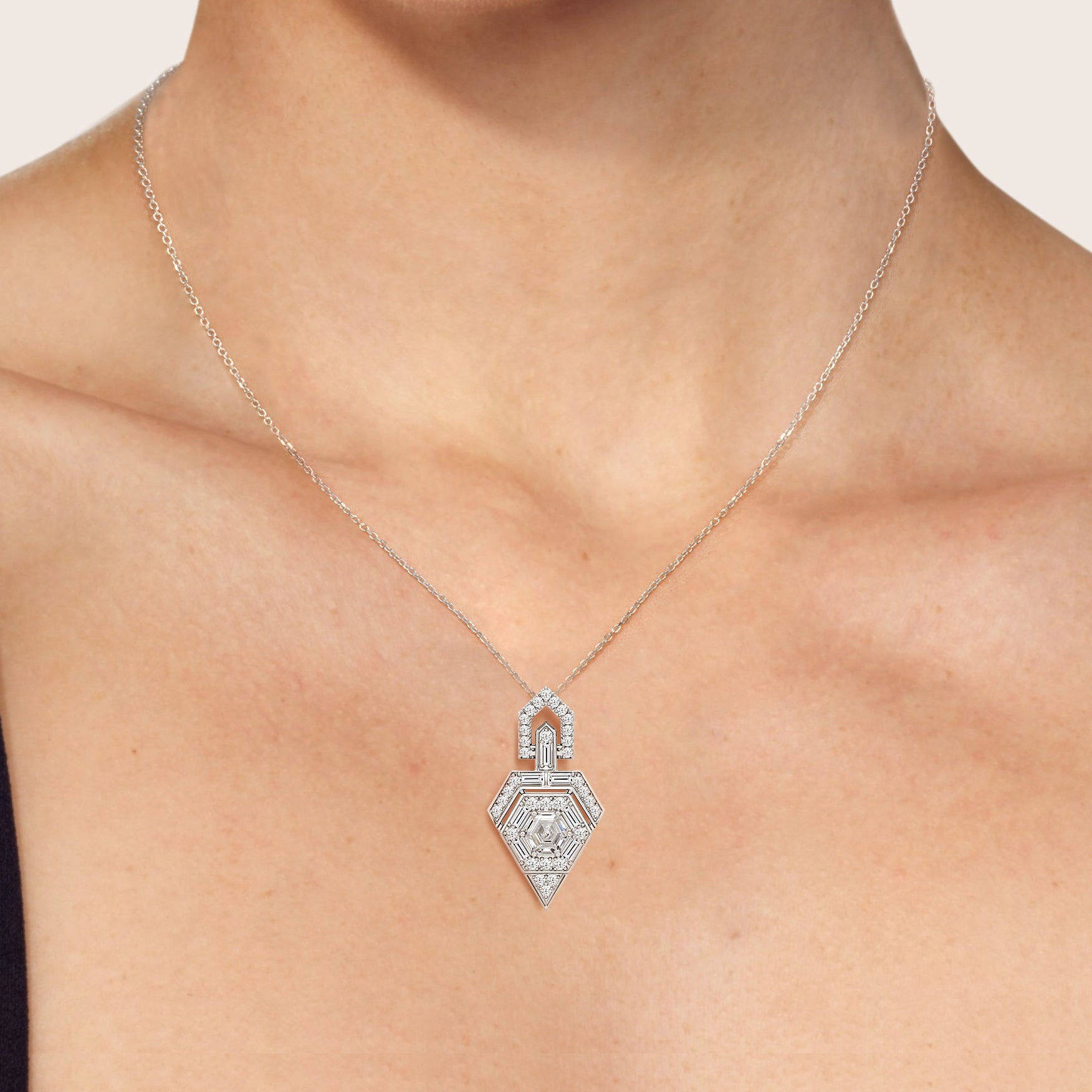 Every detail of The Chevron Necklace—from the hexagonal diamond center stone to the sharp angles and refined details— has been calibrated to reflect the exuberance and glamour of Art Deco. This piece boasts a brilliantly faceted six-sided diamond focal stone set on a downward-pointing arrowhead frame, evoking the era's passion for precision and dramatic elegance. The crisp, linear edges of the frame are embellished with a combination of round and baguette diamonds, channeling the spirit of the Jazz Age, where life is celebrated with exhilarating style. A slender, flexible link connects the descending arrowhead to a smaller, diamond-studded, upward-pointing arrowhead motif. Together, they present the union of bold geometry and refined movement.